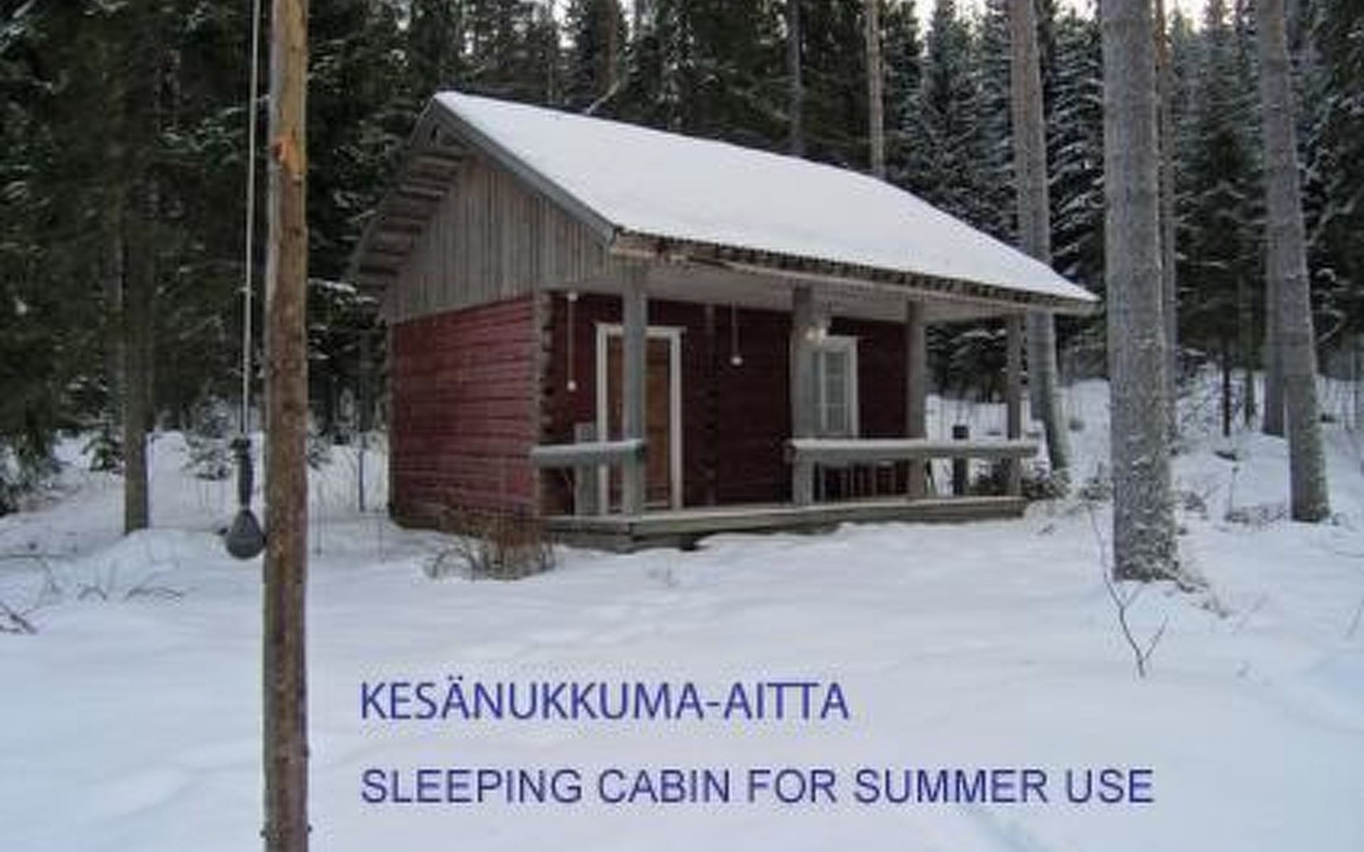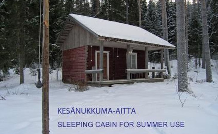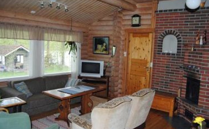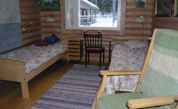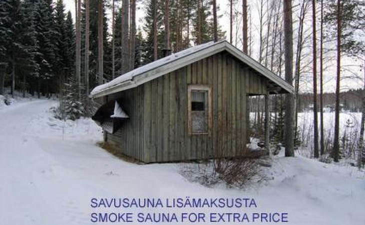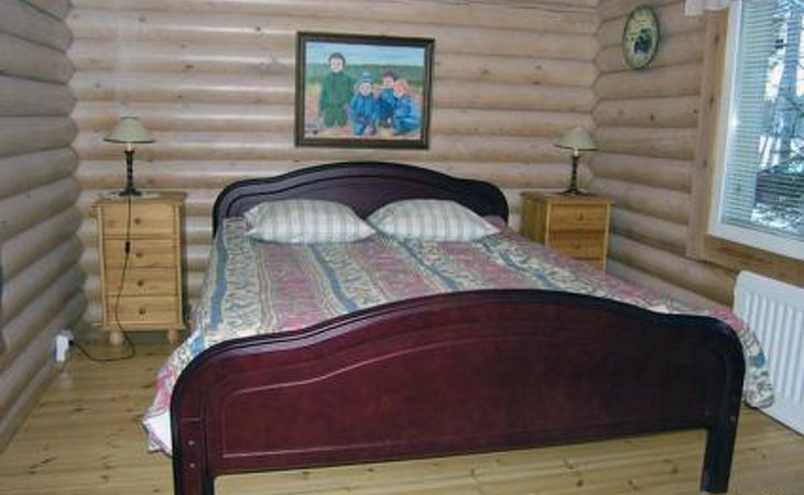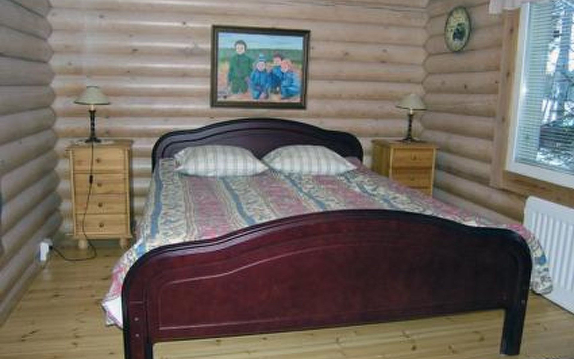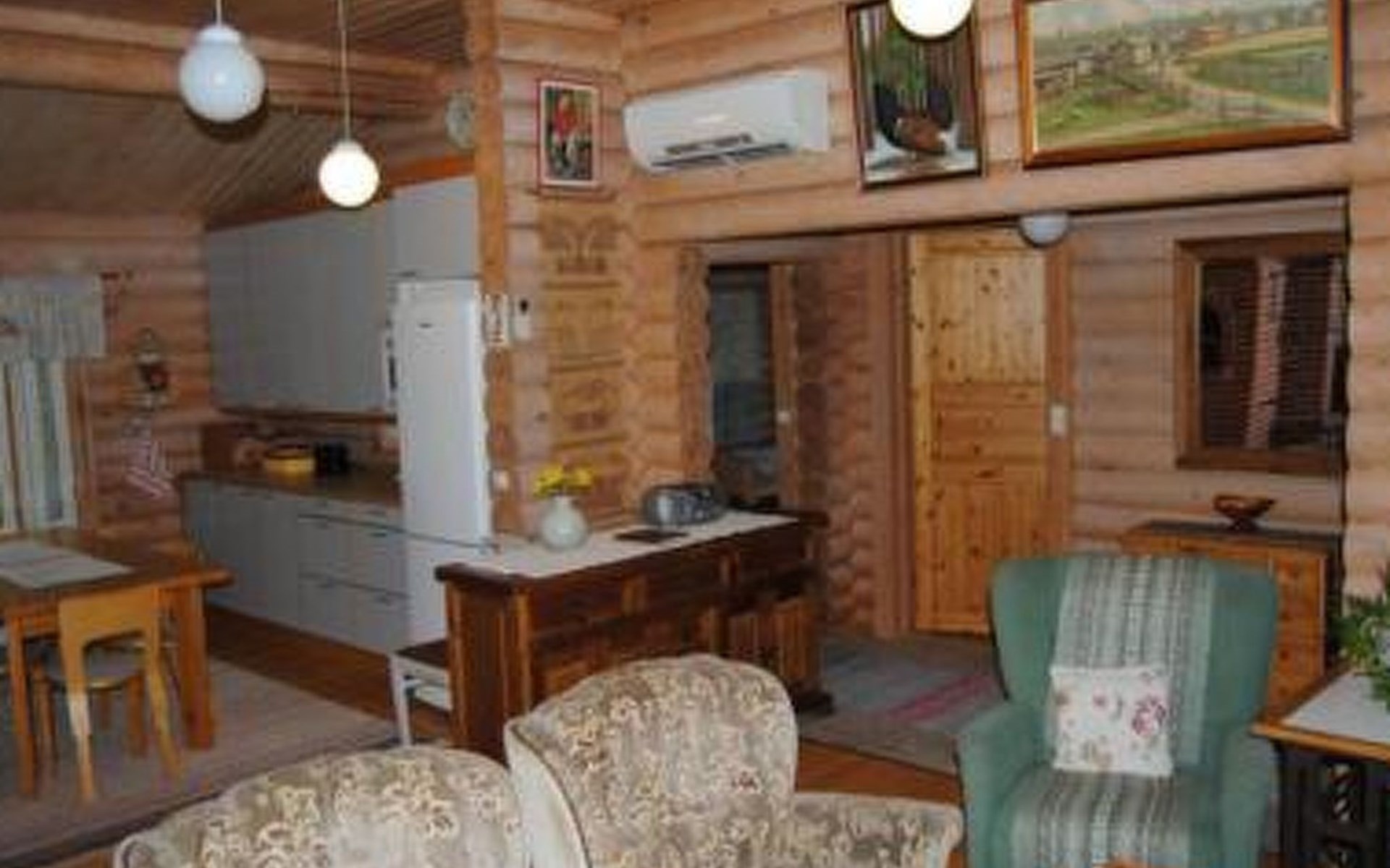 Round log cabin built in 1995, kitchen-living room with convertible sofa for two, bedroom with double bed, bedroom with two single beds, vestibule, dressing room, washroom, woodheated sauna and covered terrace.