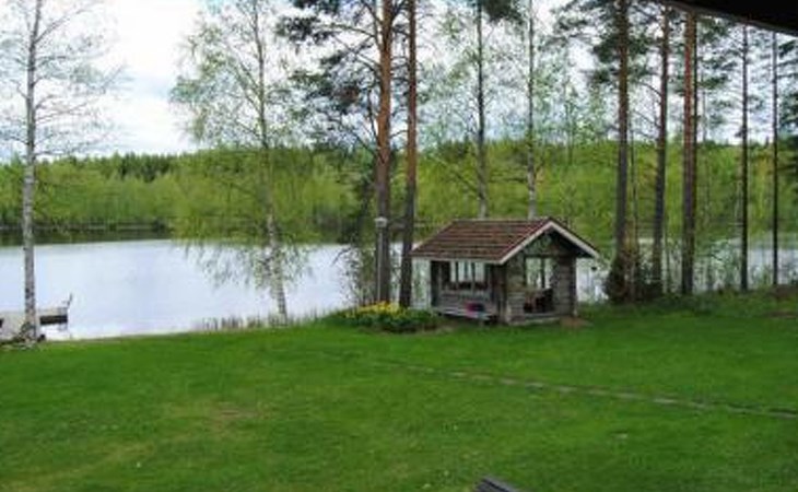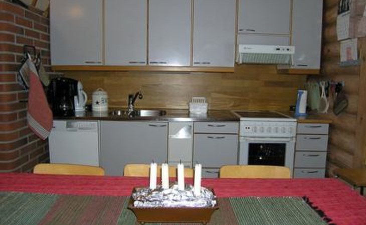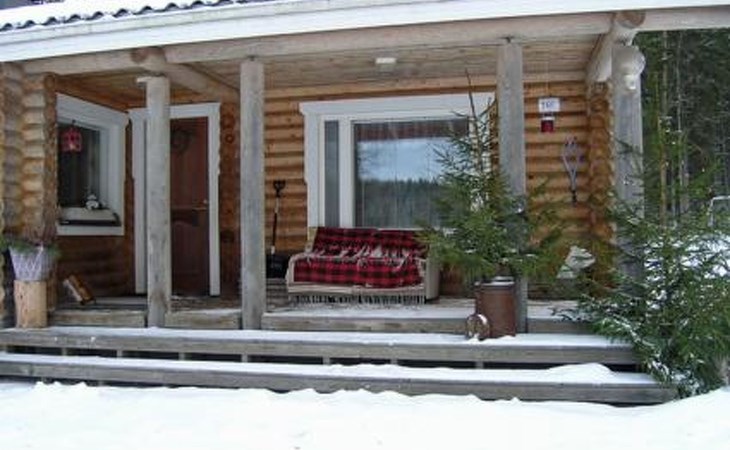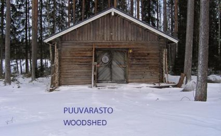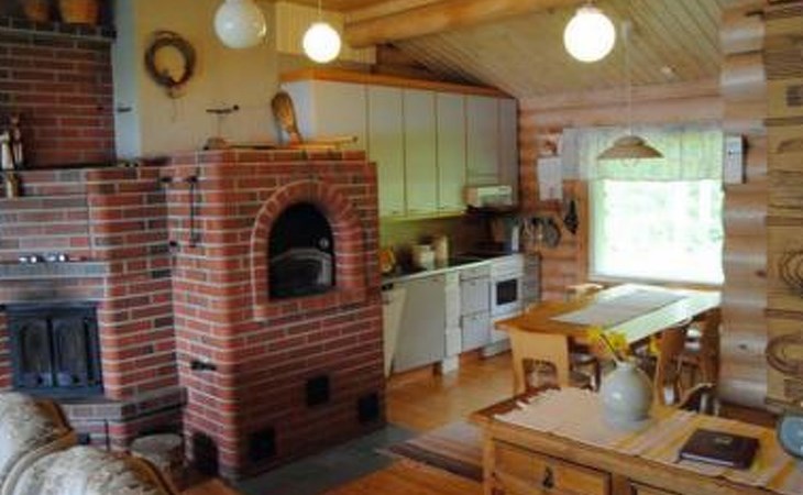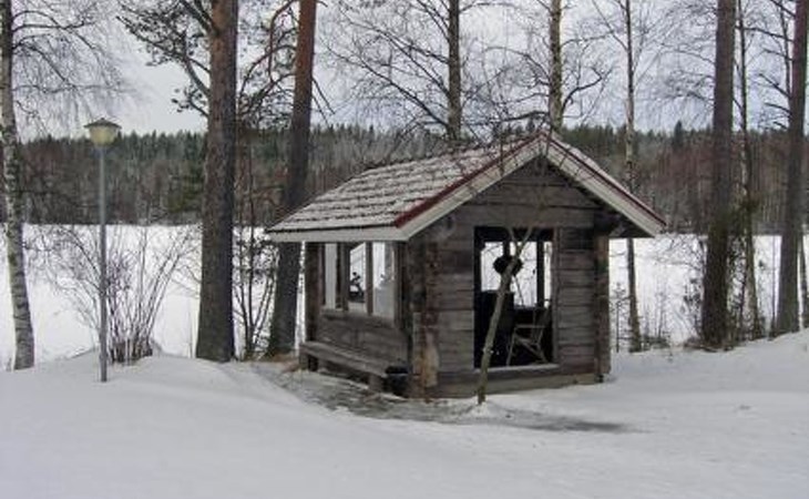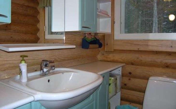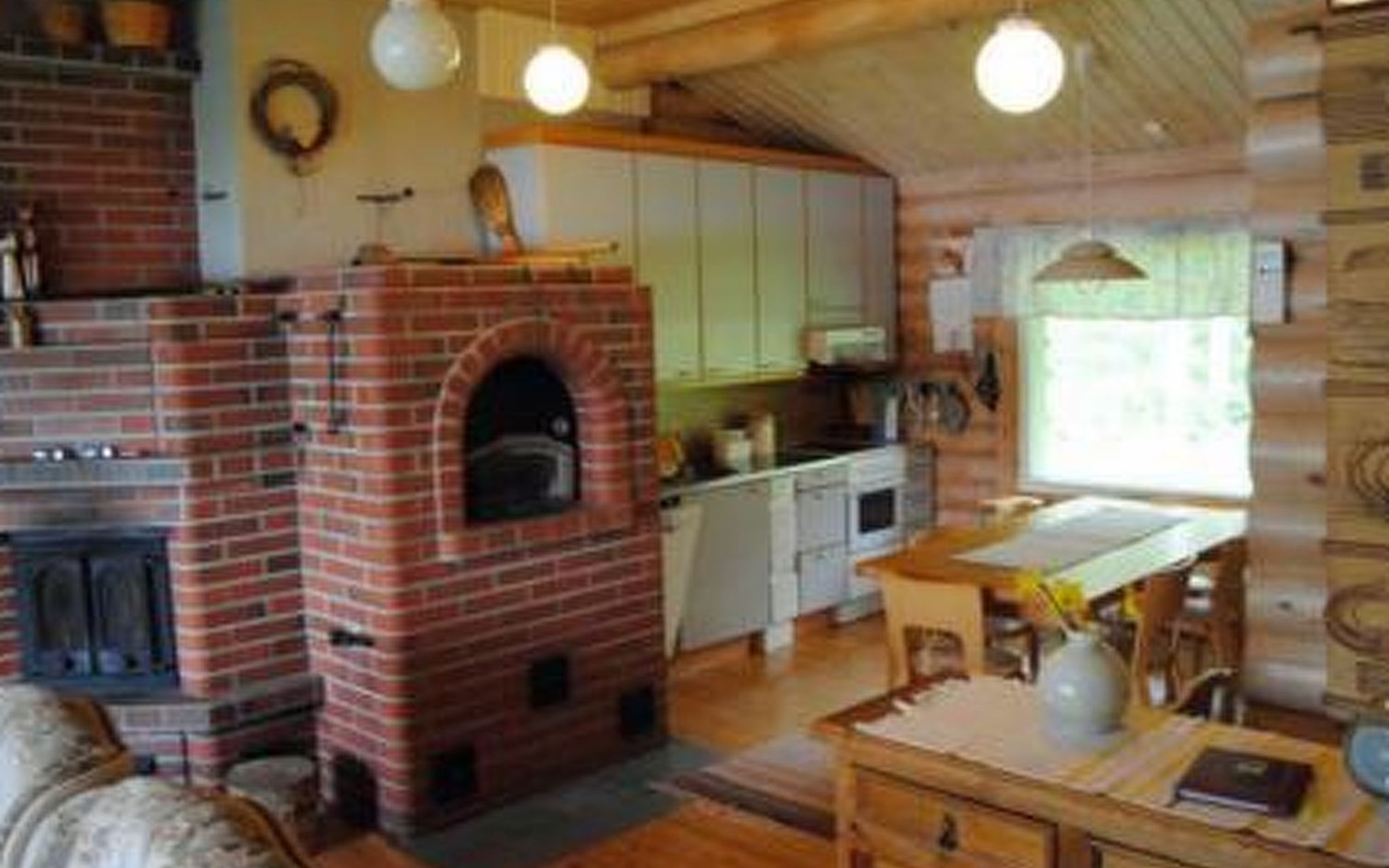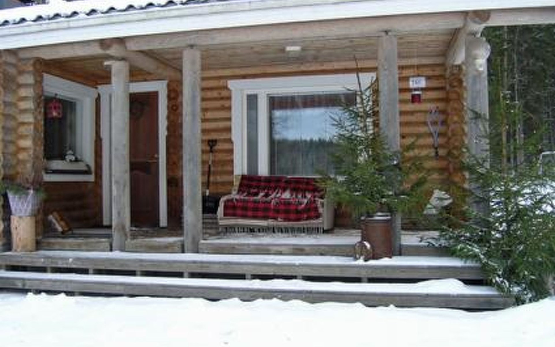 Round log cabin built in 1995, kitchen-living room with convertible sofa for two, bedroom with double bed, bedroom with two single beds, vestibule, dressing room, washroom, woodheated sauna and covered terrace.