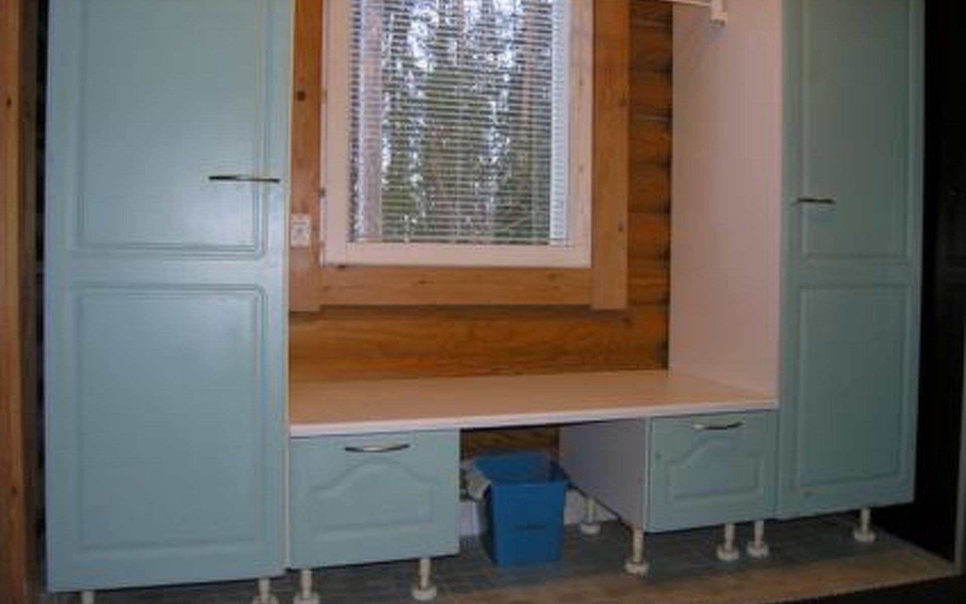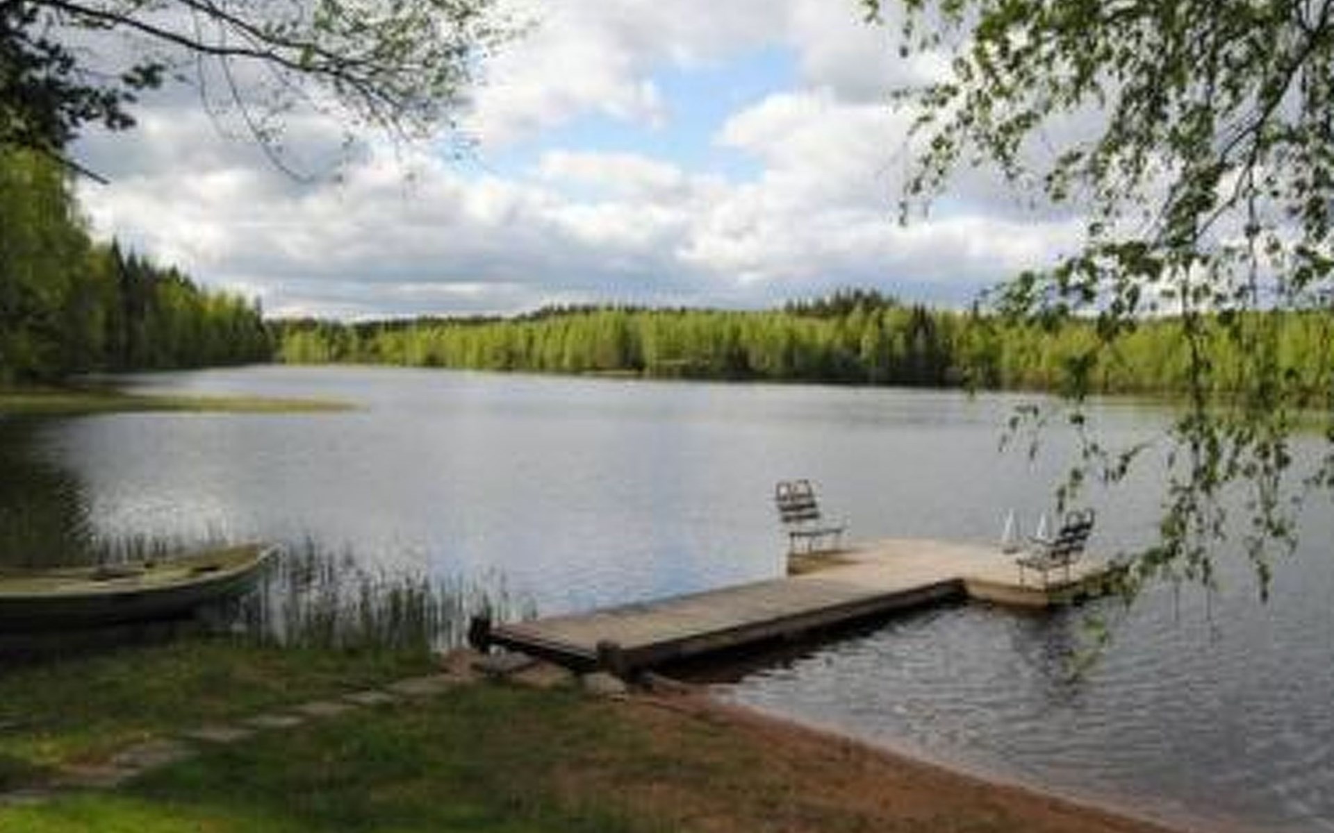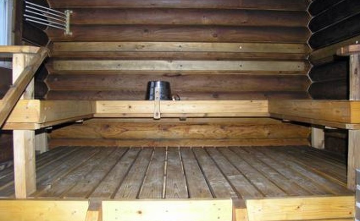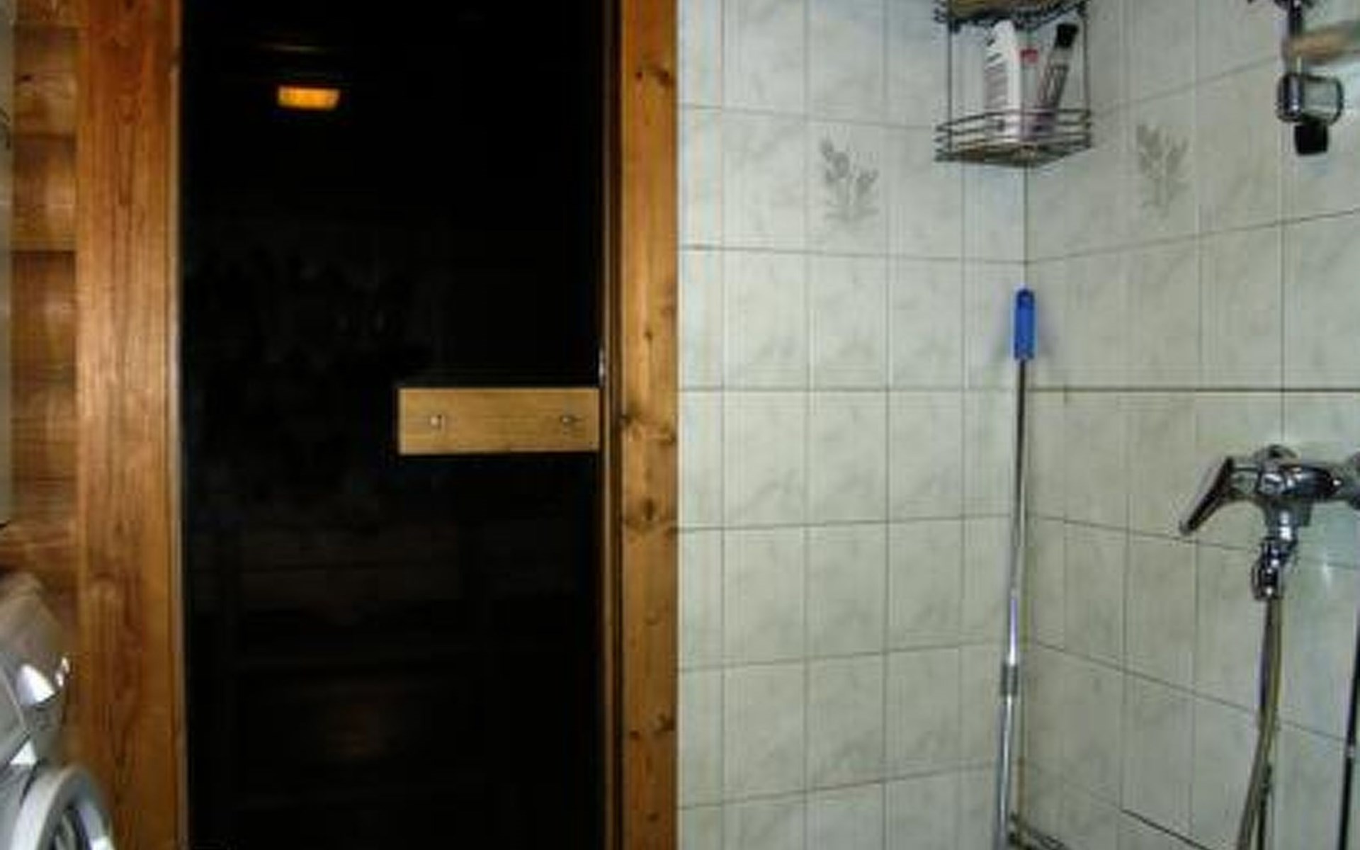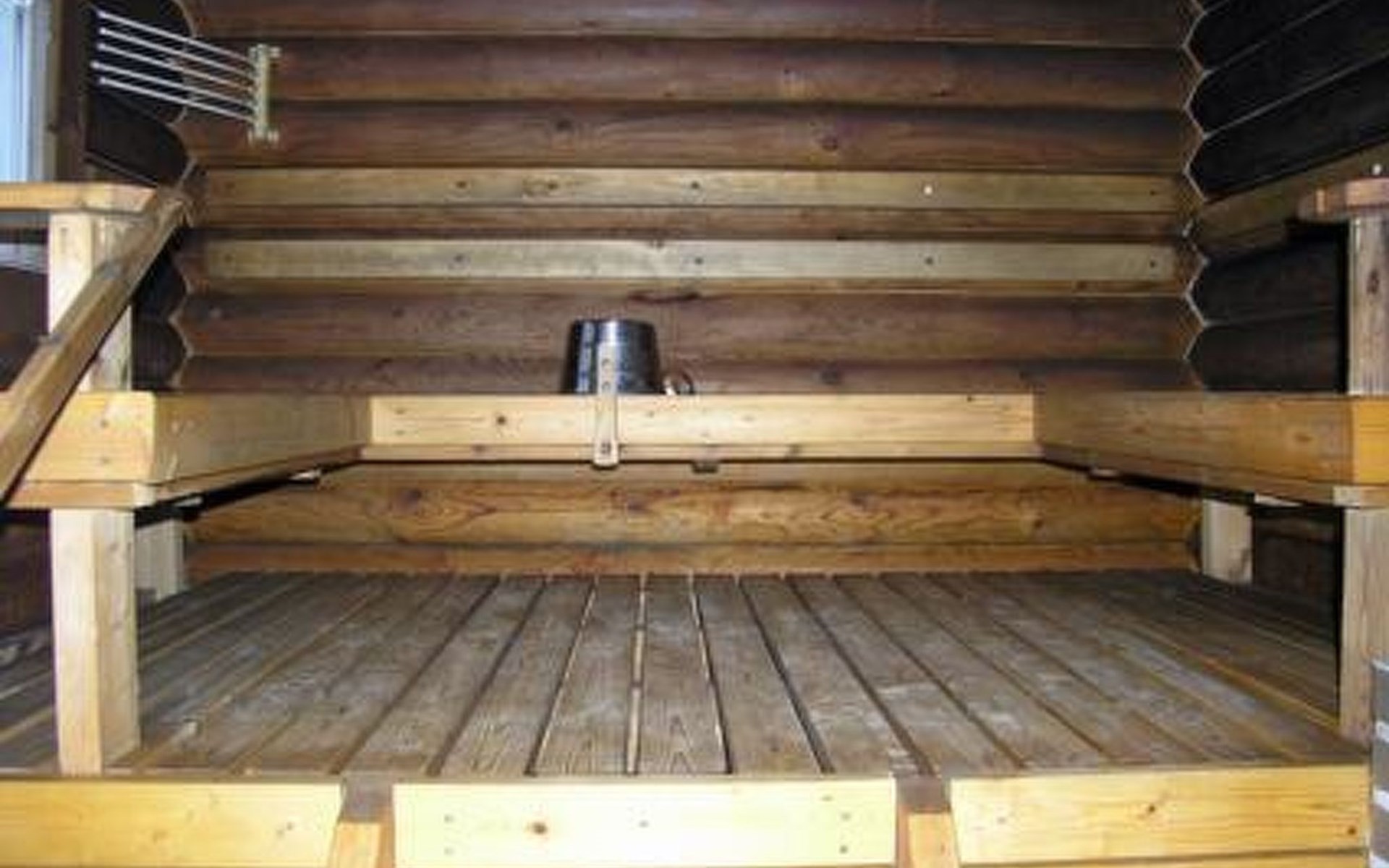 Round log cabin built in 1995, kitchen-living room with convertible sofa for two, bedroom with double bed, bedroom with two single beds, vestibule, dressing room, washroom, woodheated sauna and covered terrace.