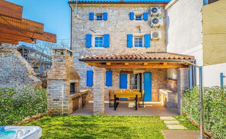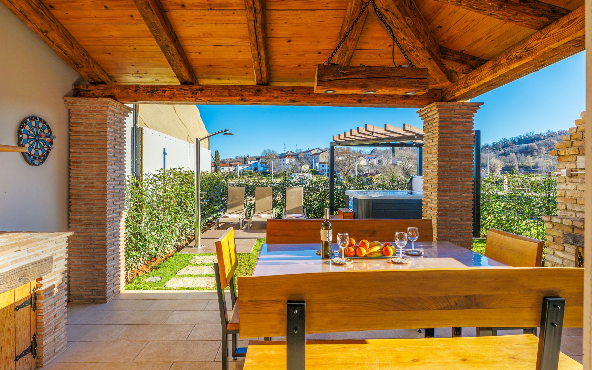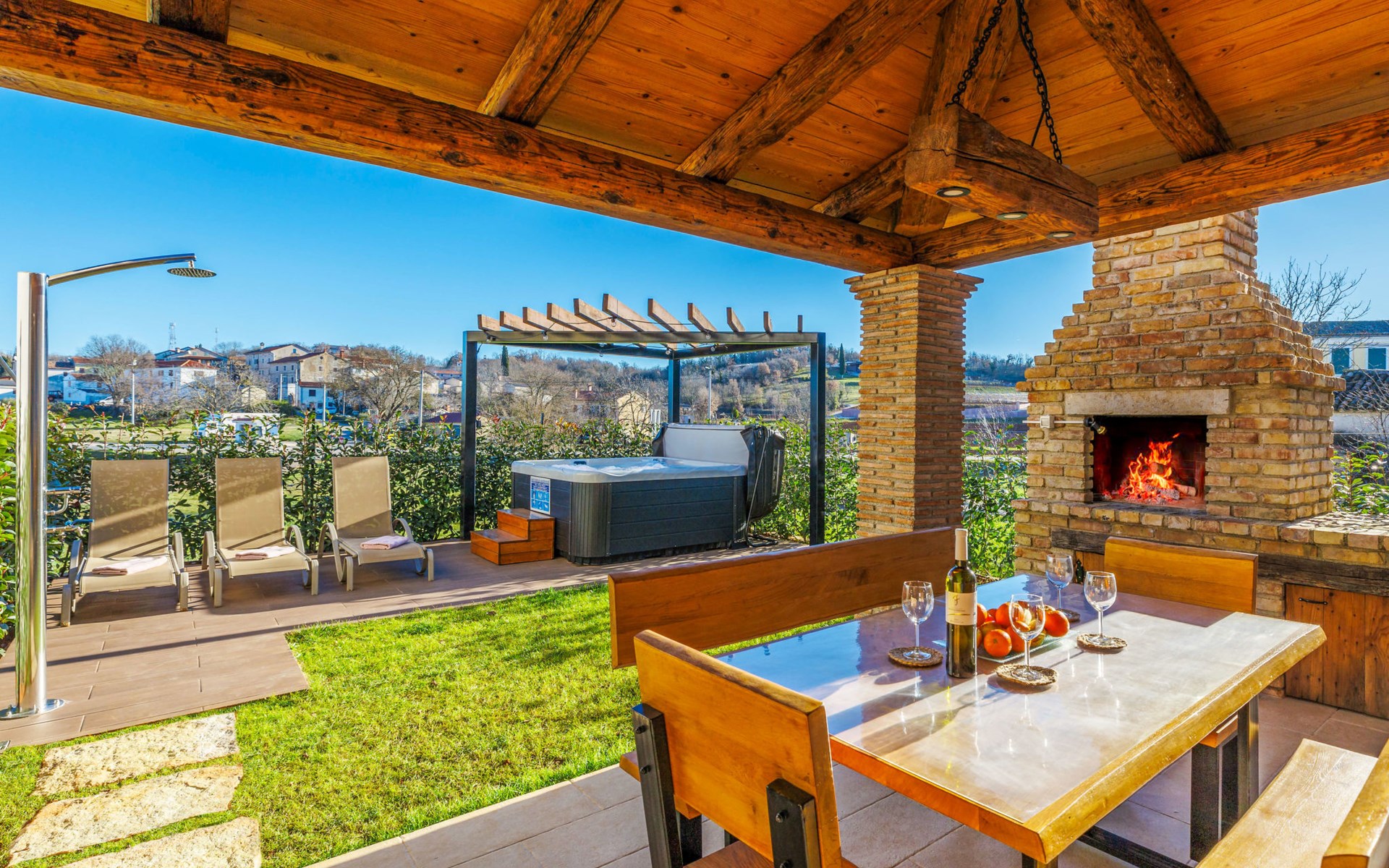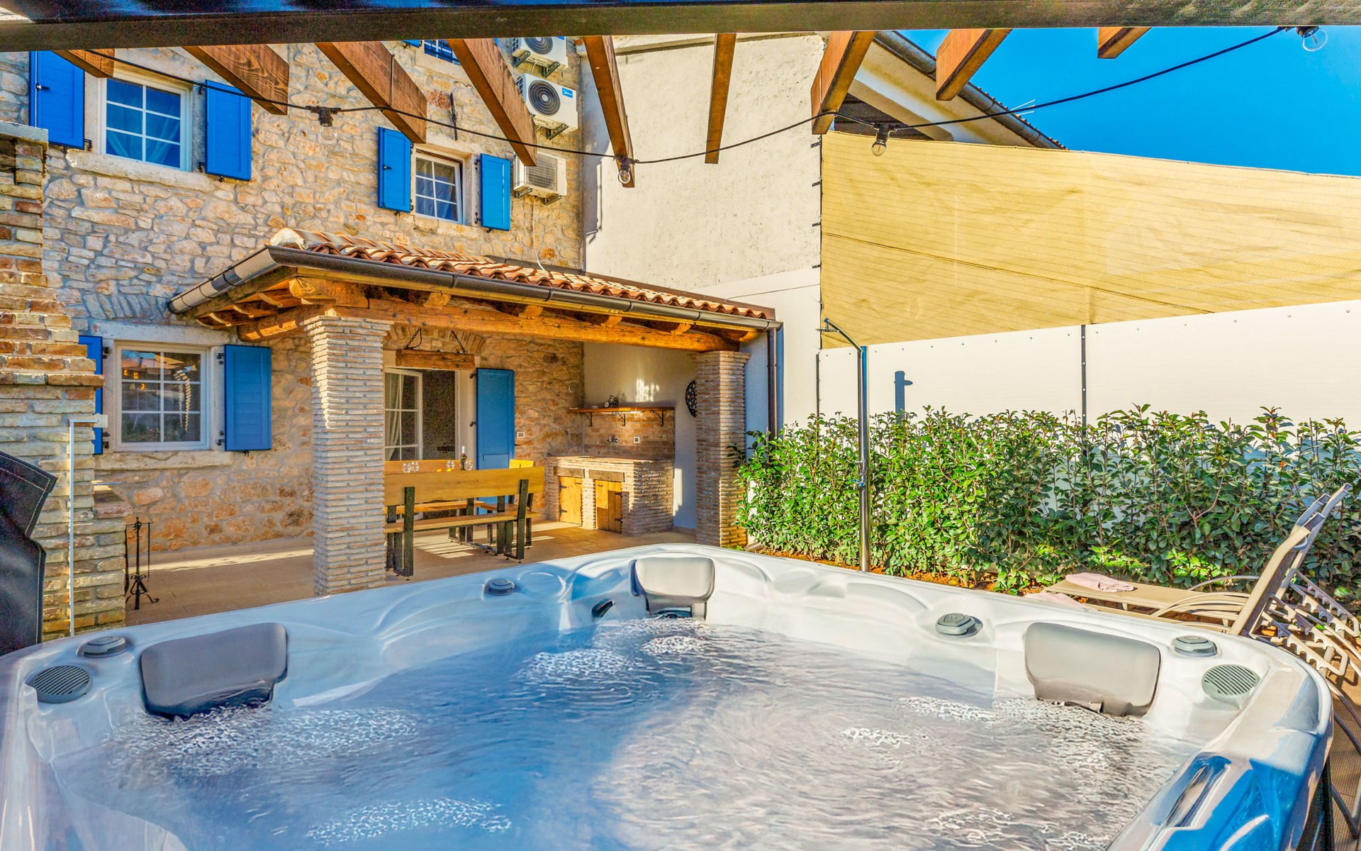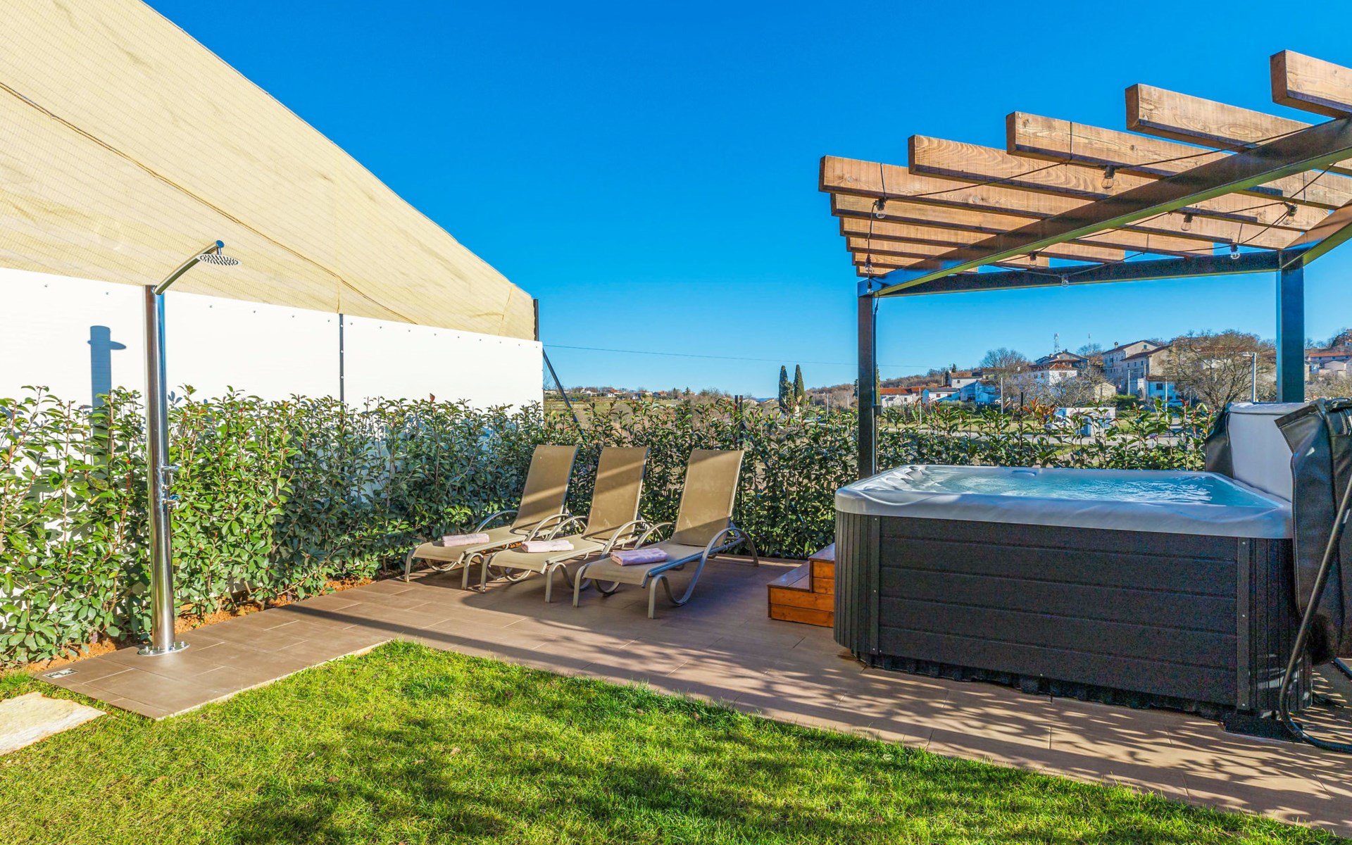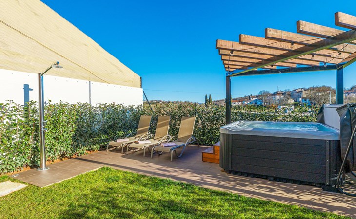 Vižinada 18 km from Poreč: Beautiful, cosy semi-detached house "Darel", 3 storeys in 2023. 2 km from the centre of Vižinada, 5 km from the centre of Višnjan, 10 km from the centre of Kaštelir, 15 km from the sea. Private: property 200 m2 (fenced) with wildlife garden. Outdoor shower, hot tub, terrace (15 m2), garden furniture, barbecue. In the house: internet access, washing machine. Parking (for 2 cars) at the house on the premises. Shop 2 km, restaurant 800 m, café 2 km, bus stop 2.3 km, pebble beach 15 km, rocky beach 15 km. Walking paths from the house, cycle lane 100 m. Nearby attractions: Winery 4 km, Aquapark 20 km. Please note: airfield 55 km from the property.
