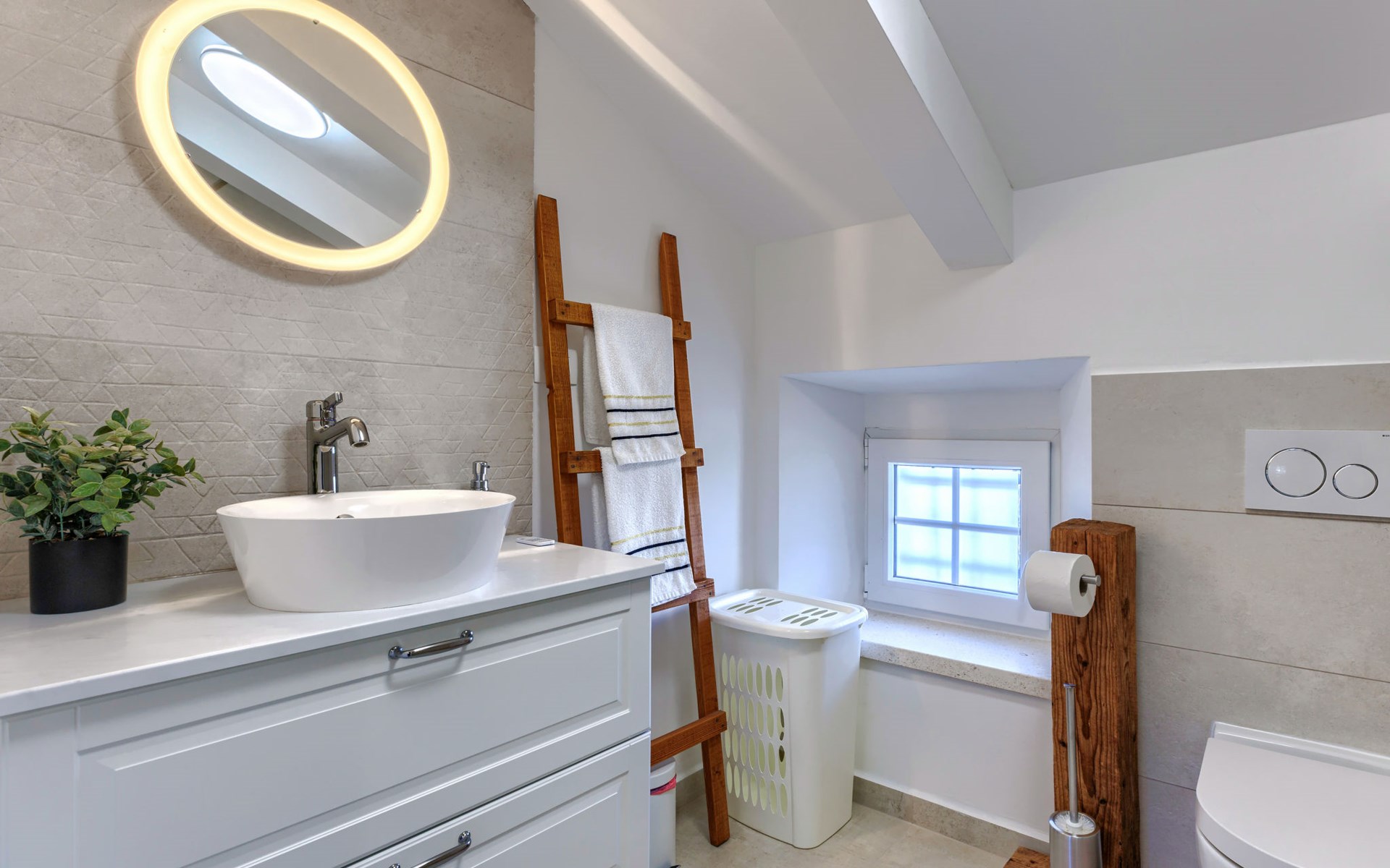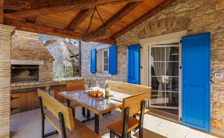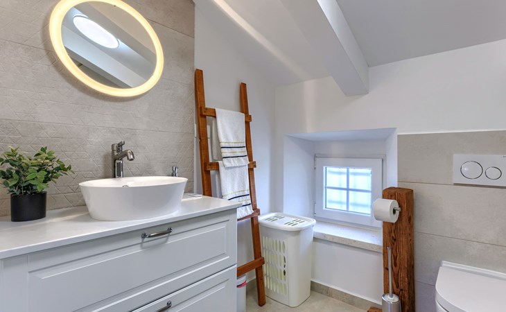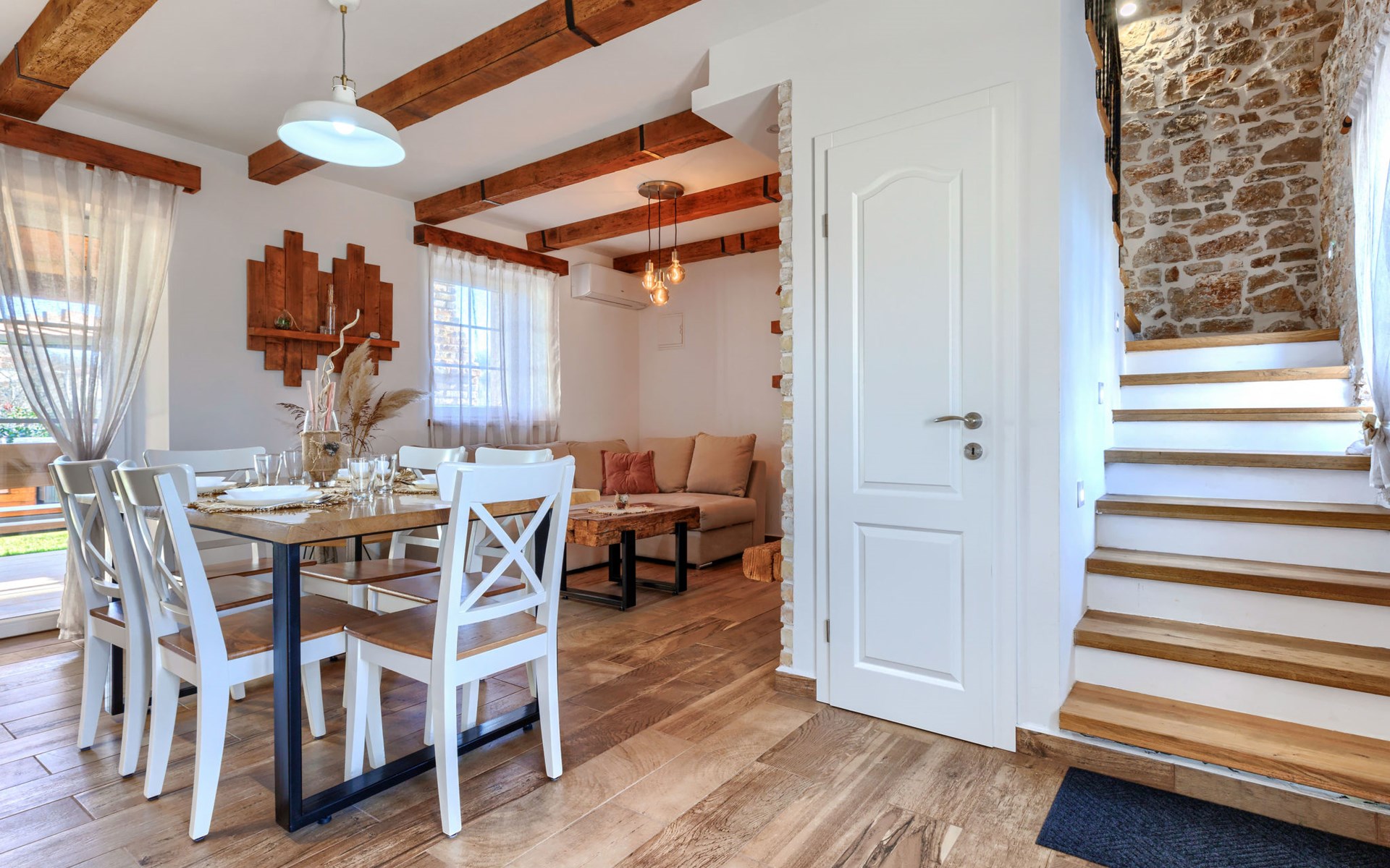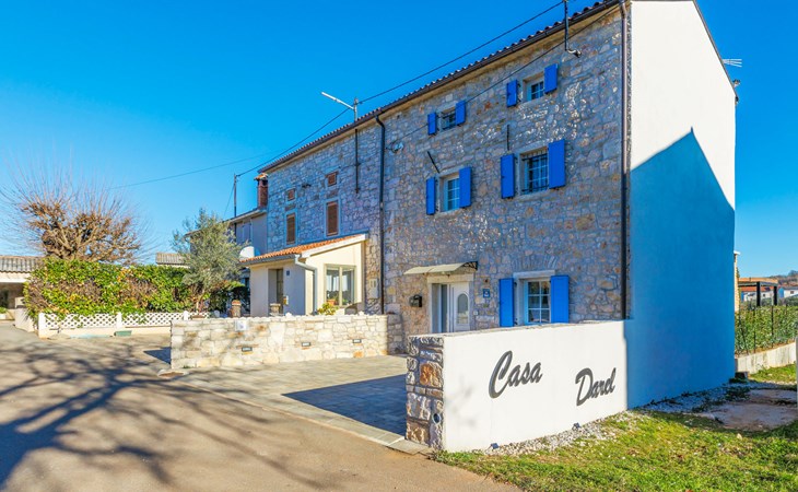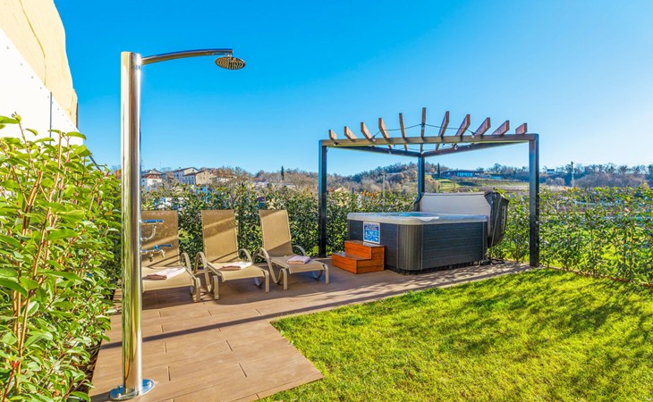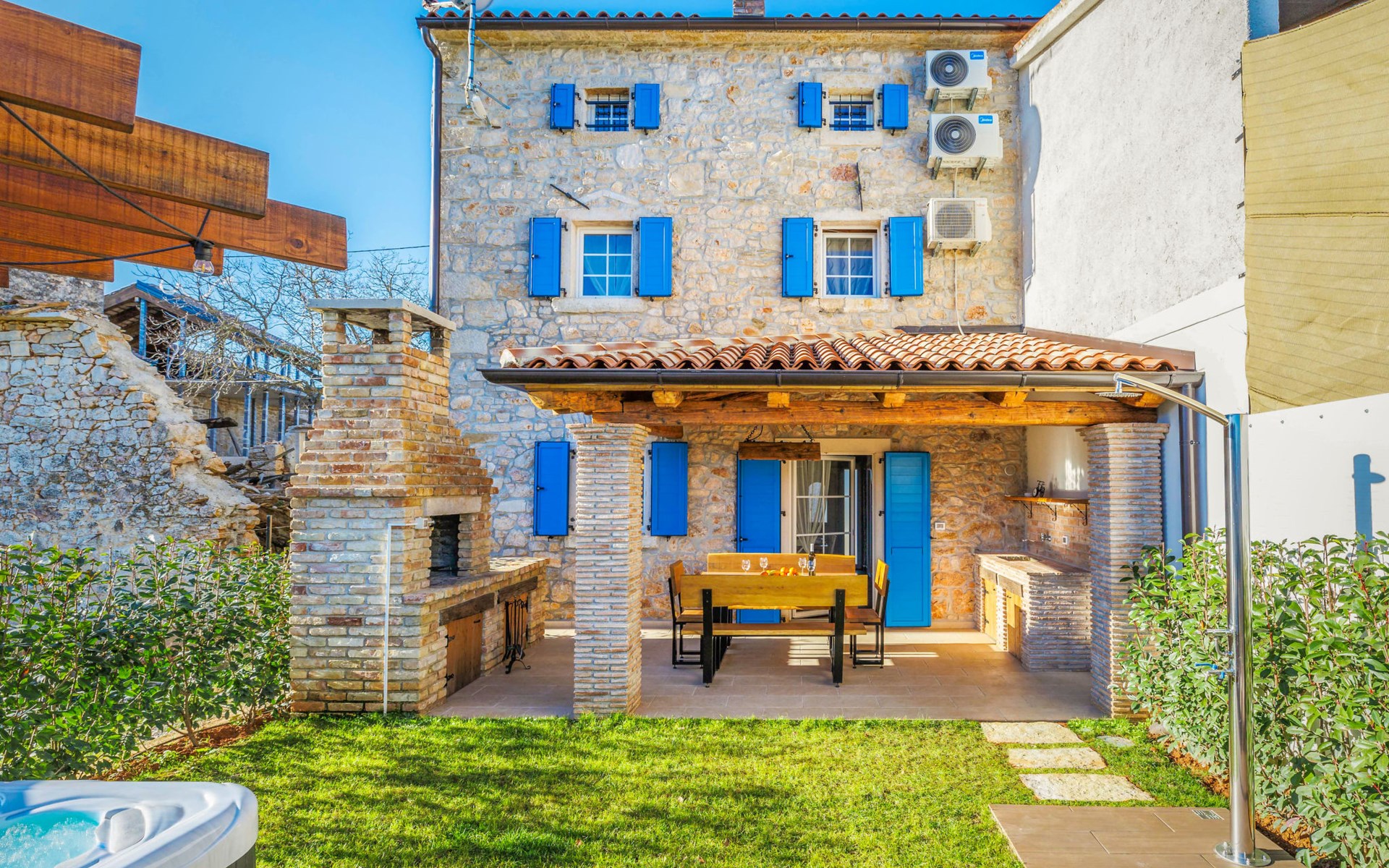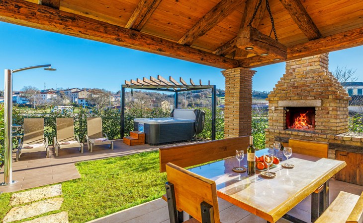 Vižinada 18 km from Poreč: Beautiful, cosy semi-detached house "Darel", 3 storeys in 2023. 2 km from the centre of Vižinada, 5 km from the centre of Višnjan, 10 km from the centre of Kaštelir, 15 km from the sea. Private: property 200 m2 (fenced) with wildlife garden. Outdoor shower, hot tub, terrace (15 m2), garden furniture, barbecue. In the house: internet access, washing machine. Parking (for 2 cars) at the house on the premises. Shop 2 km, restaurant 800 m, café 2 km, bus stop 2.3 km, pebble beach 15 km, rocky beach 15 km. Walking paths from the house, cycle lane 100 m. Nearby attractions: Winery 4 km, Aquapark 20 km. Please note: airfield 55 km from the property.