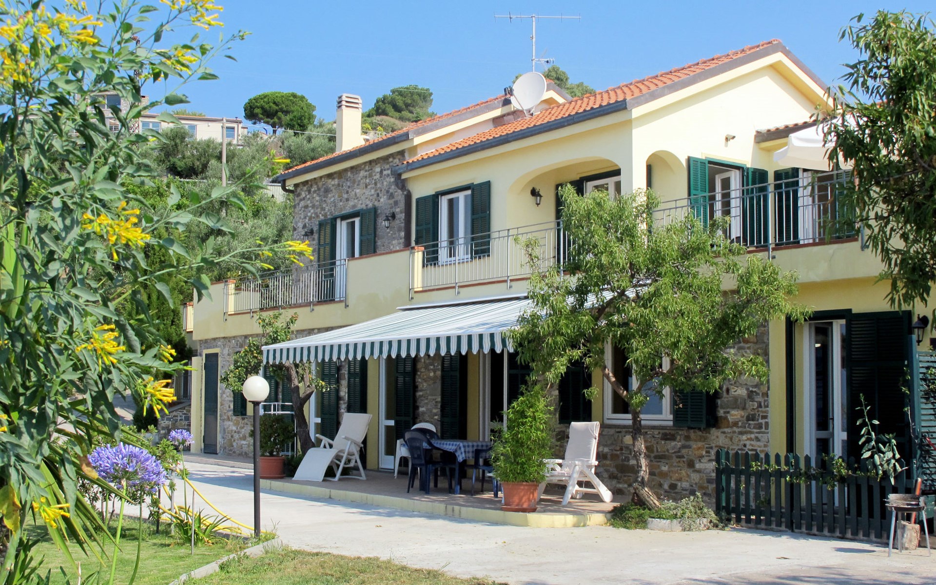 Very beautiful, comfortable house "Primavera". 3 apartments in the property. Above Poggi 1 km from the centre of Poggi, 2.5 km from the centre of Imperia, 25 km from the centre of San Remo, in a secluded, sunny, elevated position, 900 m from the sea, in a cul-de-sac. For shared use: beautiful, well-kept garden 800 m2 (fenced) with lawn and plants. 150 m long narrow motor access. Parking on the premises. Shop 1 km, supermarket 1 km, bus stop 150 m, railway station "Imperia" 7 km, sandy beach "San Lorenzo al Mare" 4 km pebble beach "Baia Salata" 1 km, indoor swimming pool 5.5 km. Residence with electric gates.