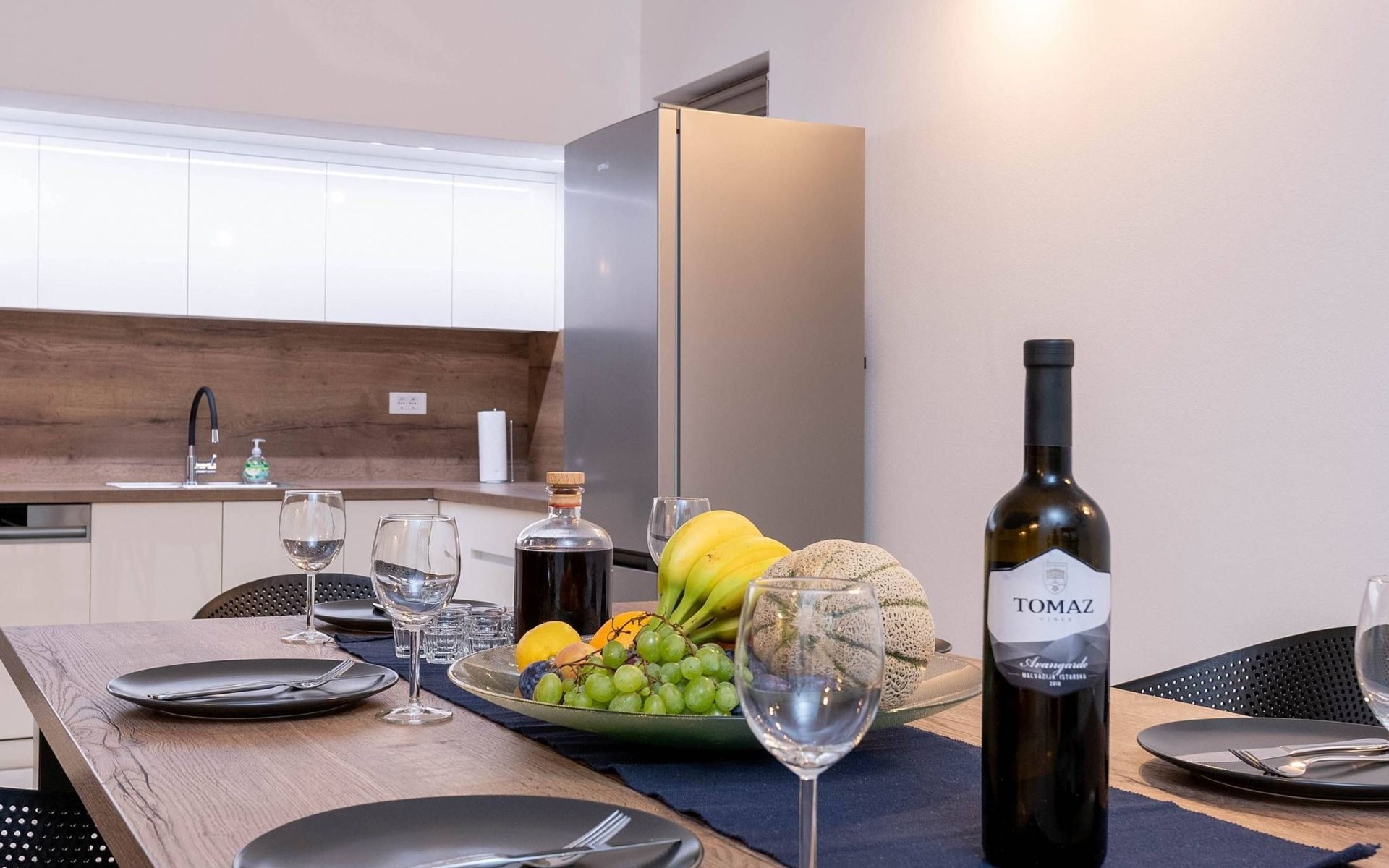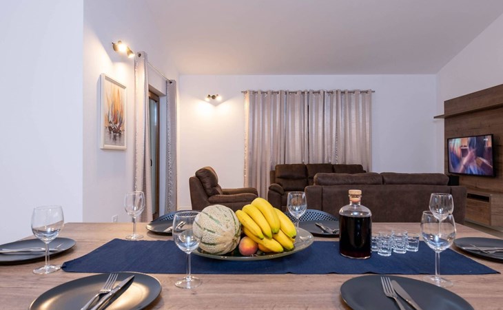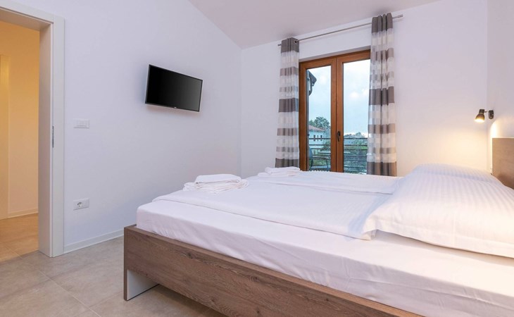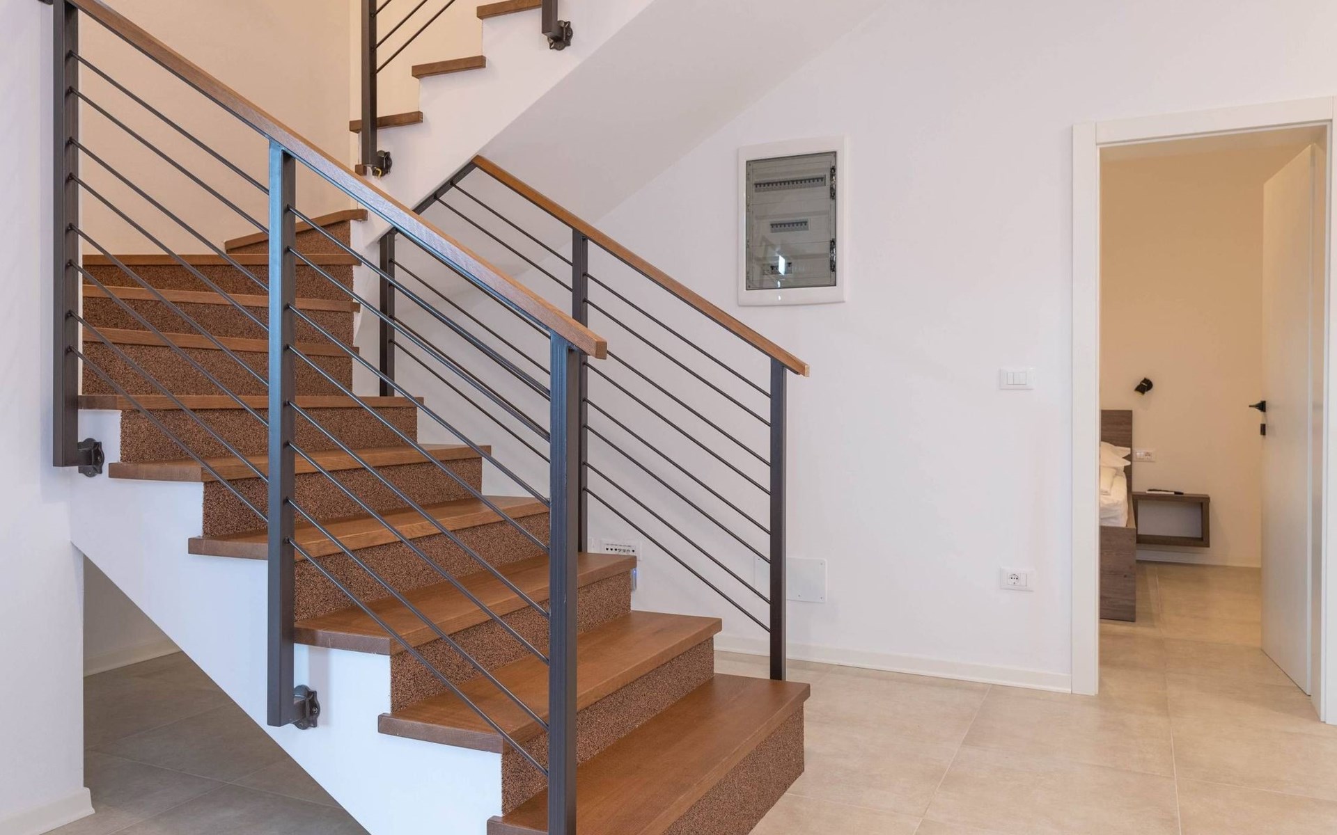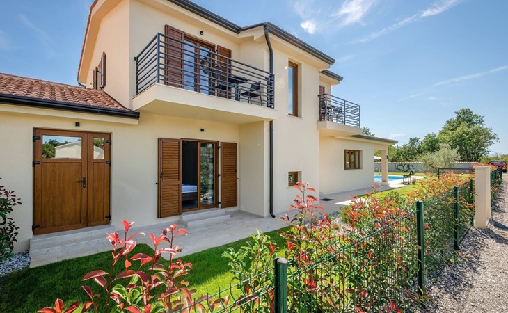 Holiday house "Luca" was newly built in 2020. It is located in Porec, a tourist place in Istria.The house has 192 m2 on two floors. It consists of 3 bedrooms, 3 private bathrooms, toilet, living room and kitchen.There is a living room with a TV and a fully equipped kitchen with 8 seats on the ground floor.One bedroom is located on the ground floor and the other two are on the first floor. Each room has a TV, air conditioning, and a private balcony with a table and chairs.