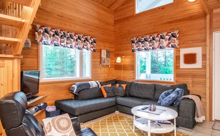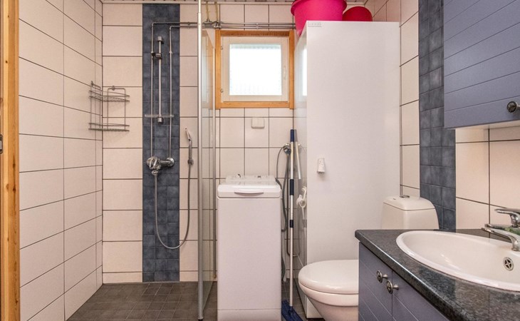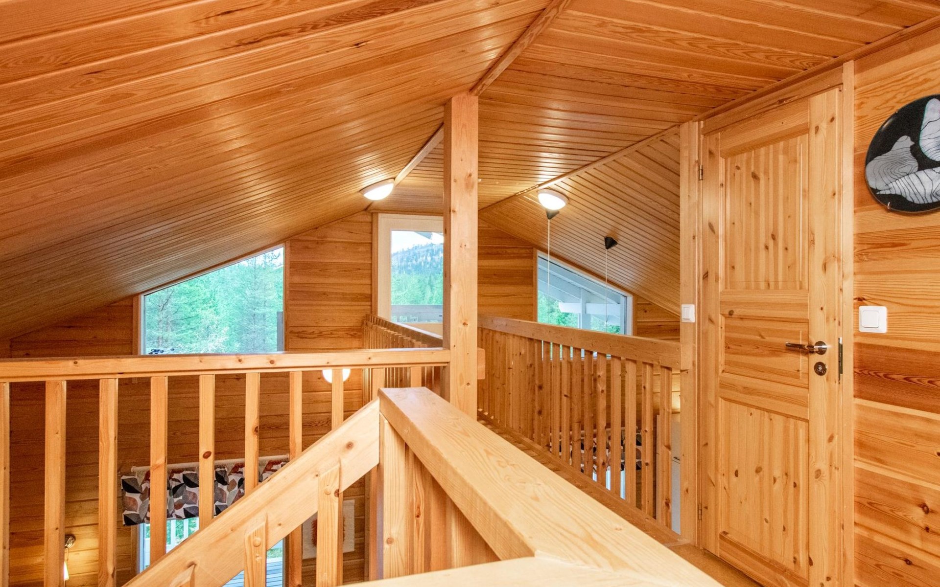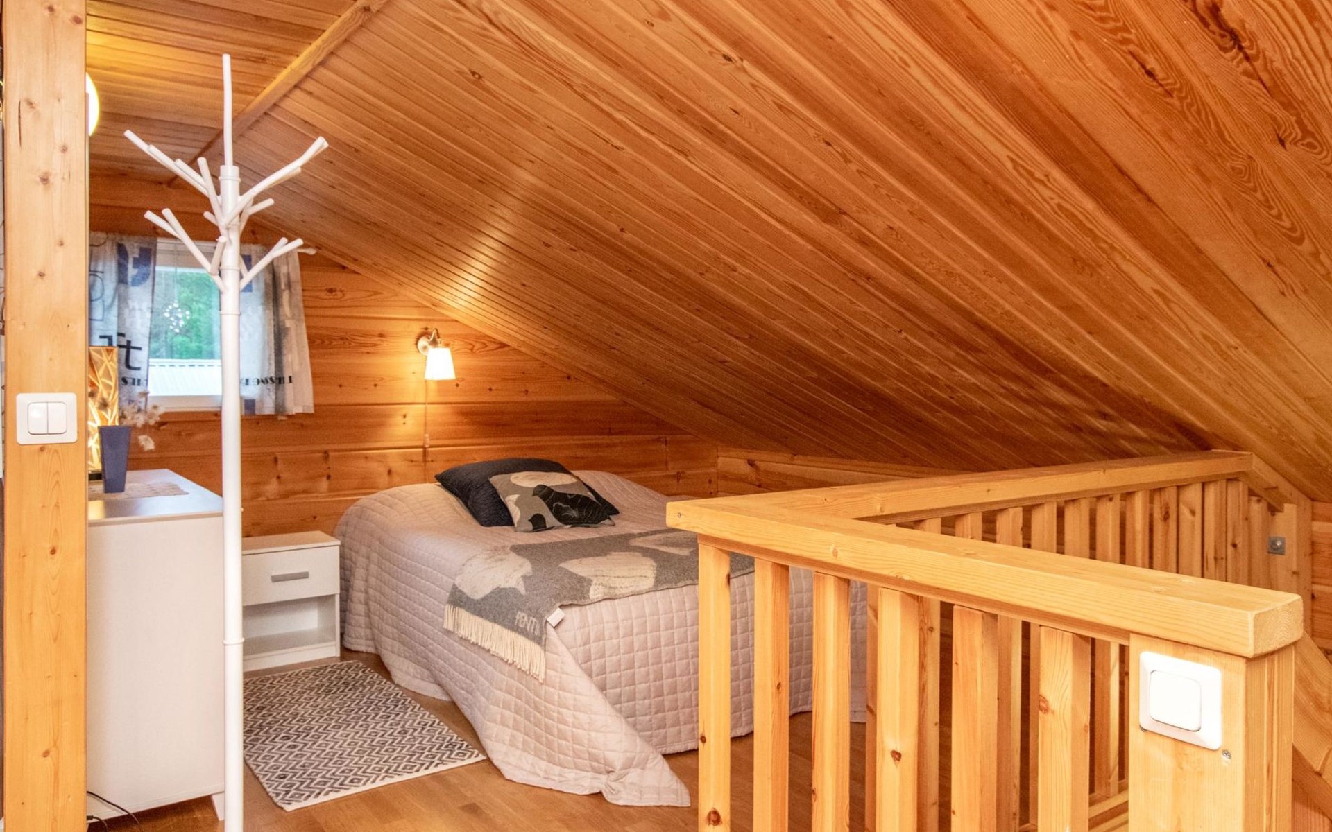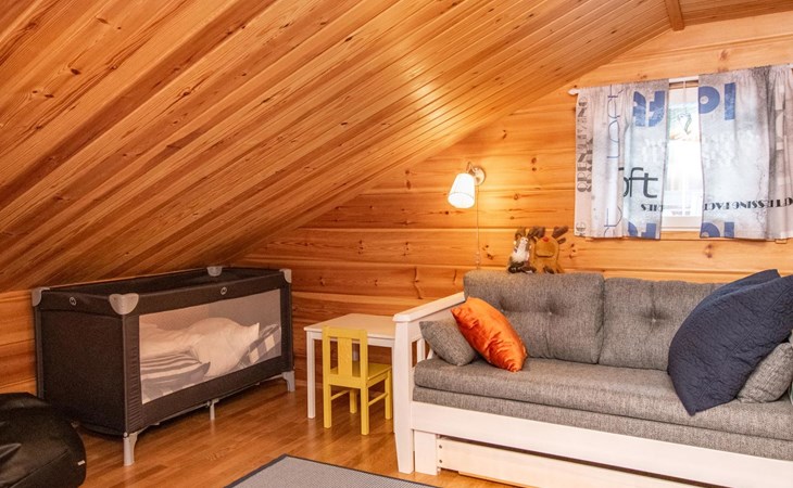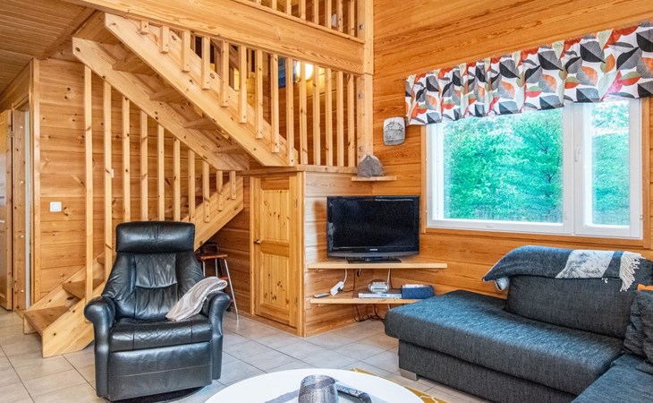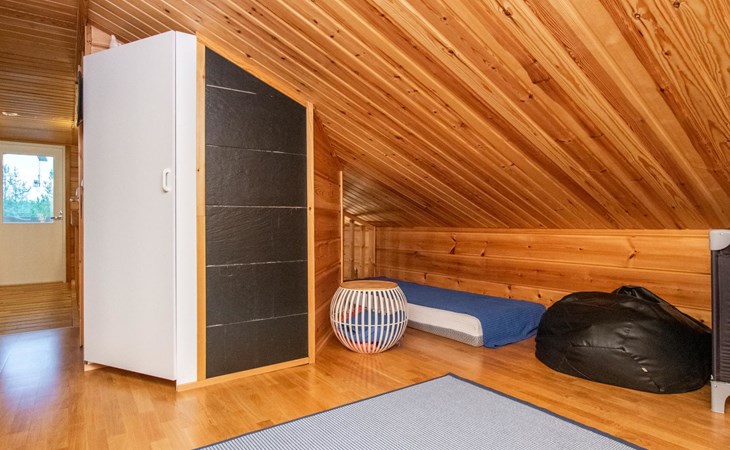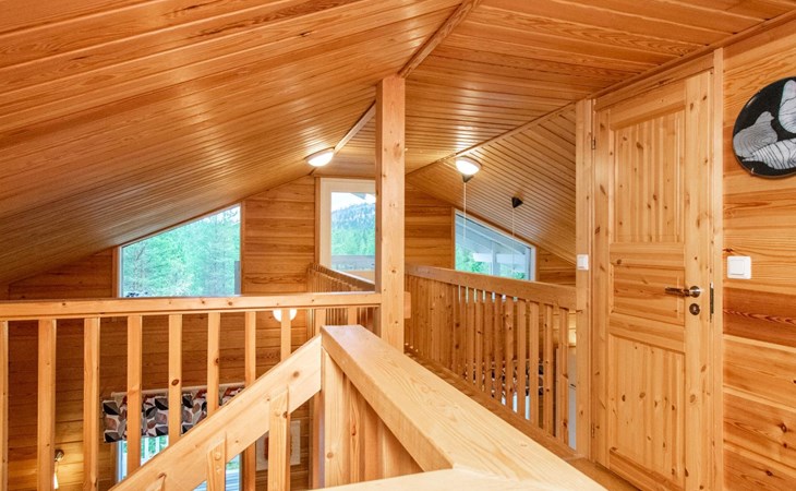 Cabin built in 2012. Downstairs kitchen, living room, bedroom with double bed (140*200cm), bedroom with bed (120*200cm), sauna (wooden stove), washroom, toilet and terrace. Upstairs bed 80*200cm, bed 140*200cm, mattress 80*200cm and toilet. Maintenance room for skies in the warehouse and carport.