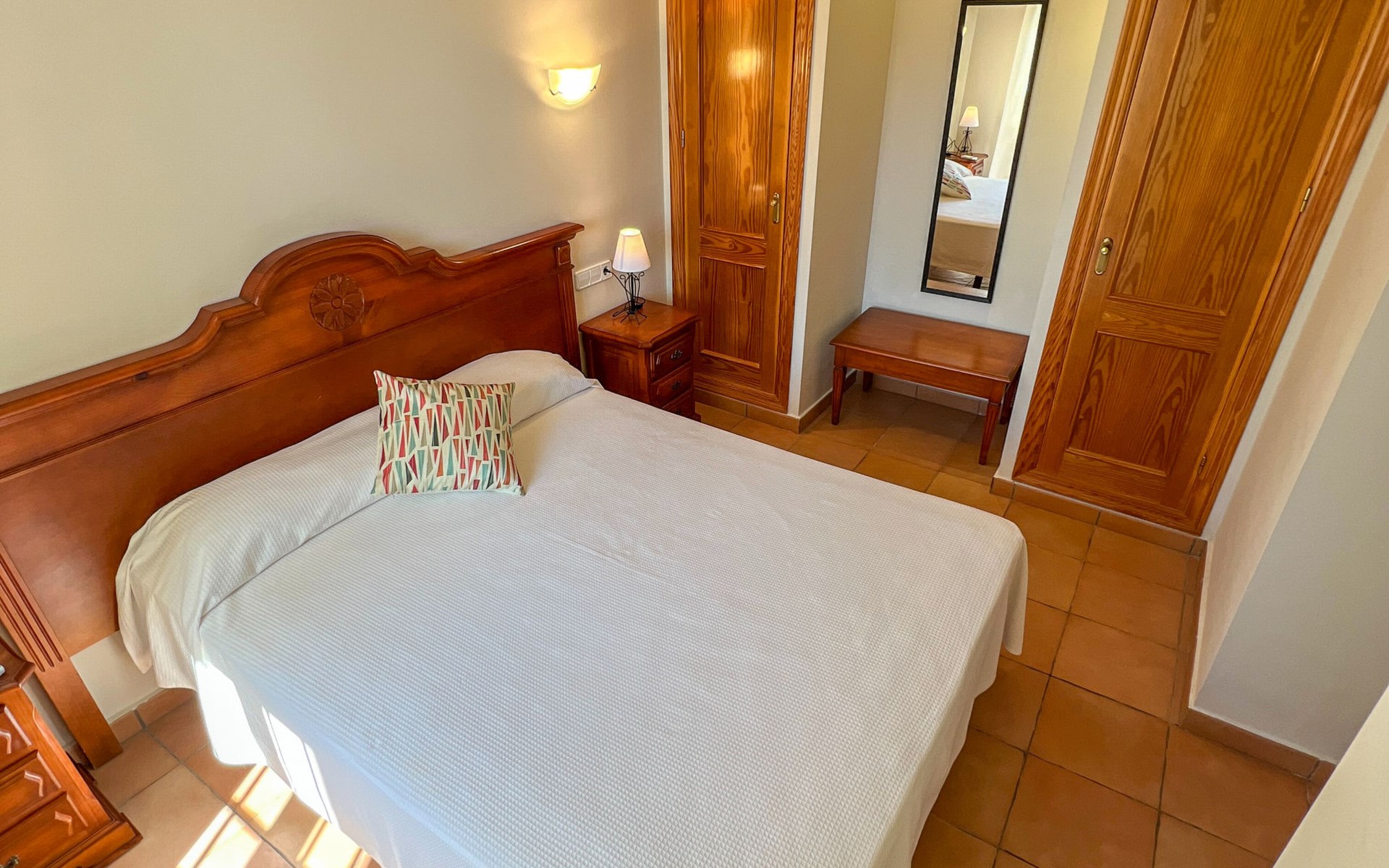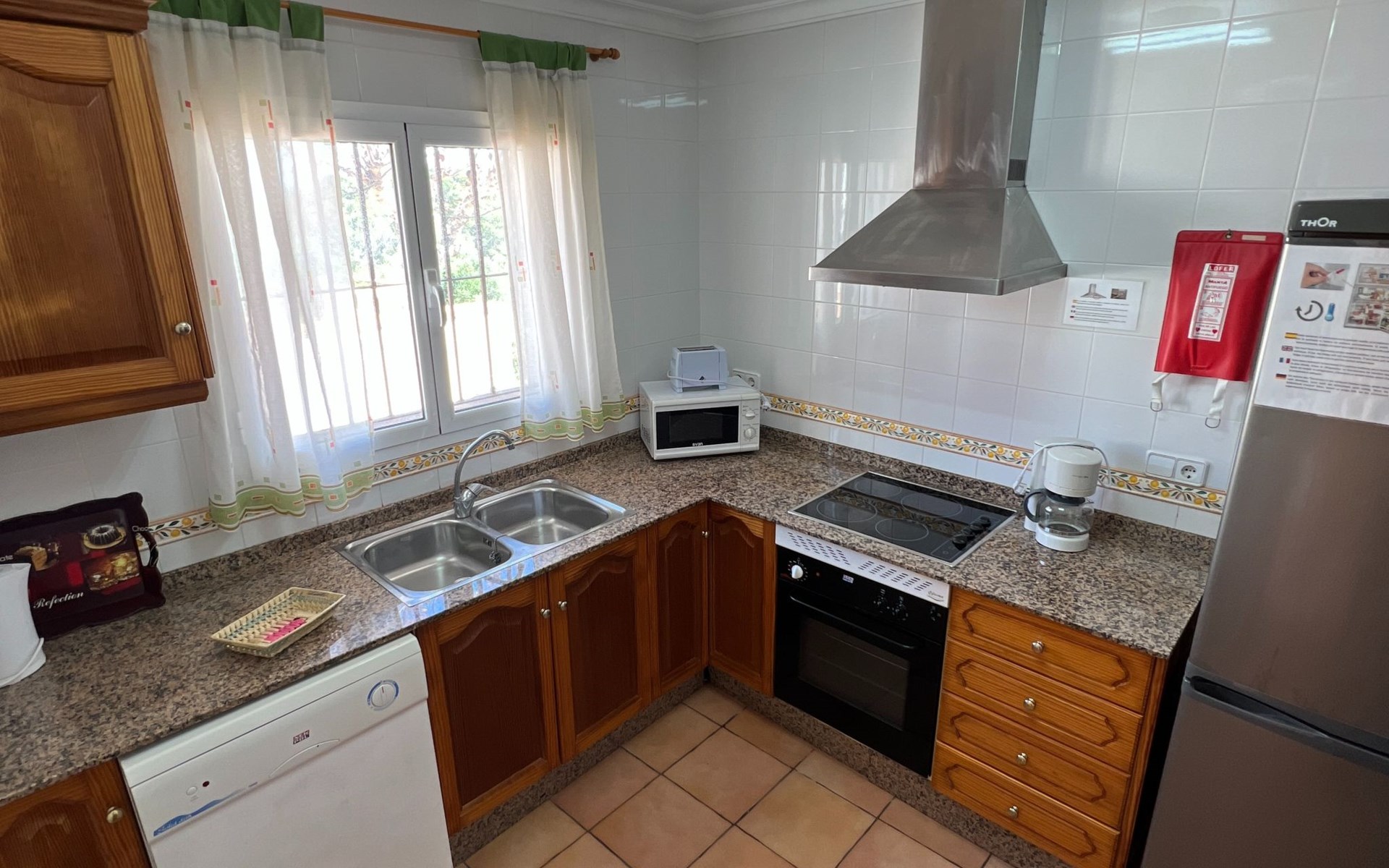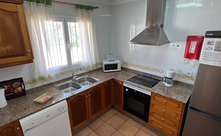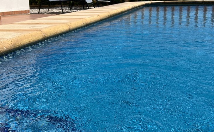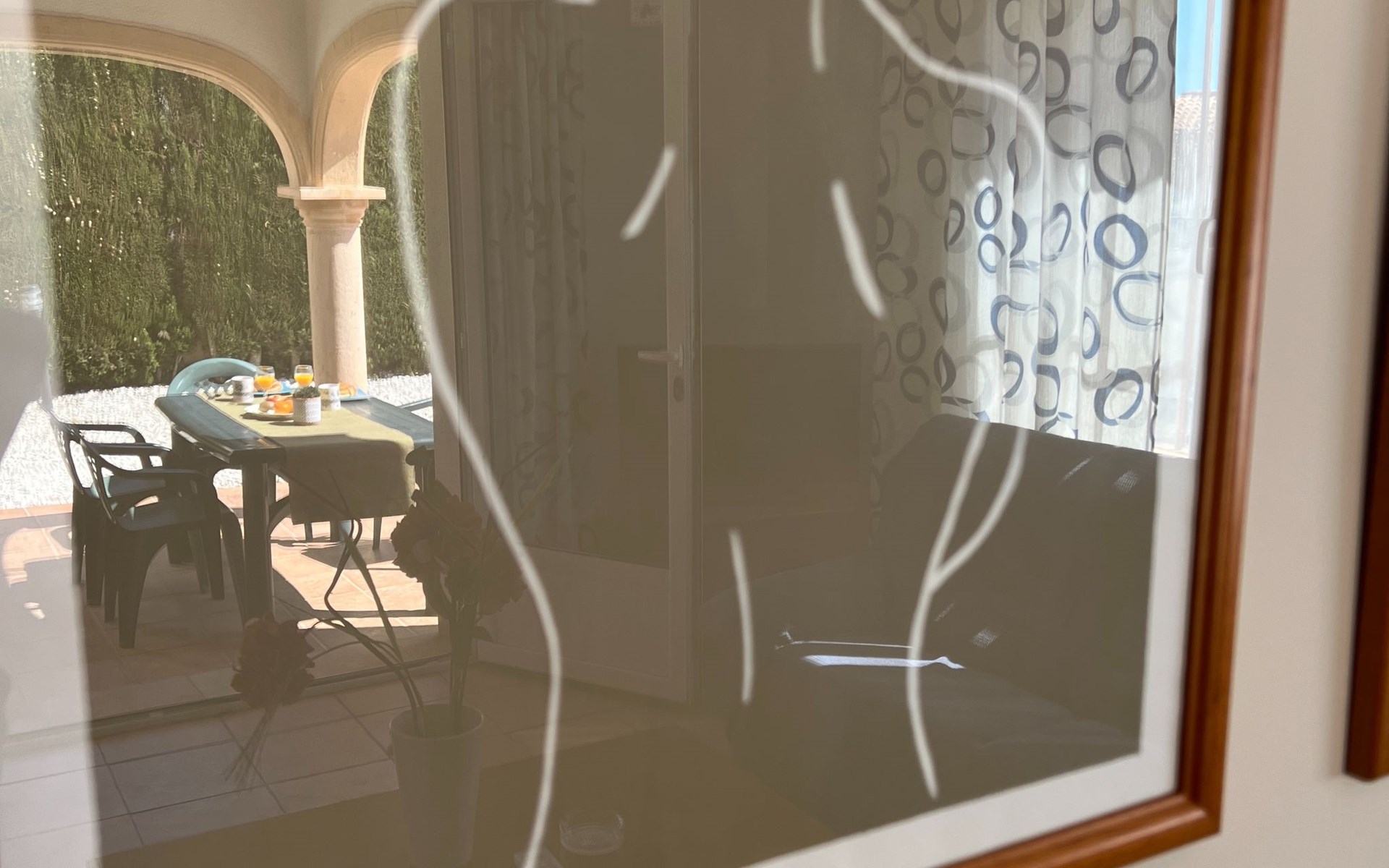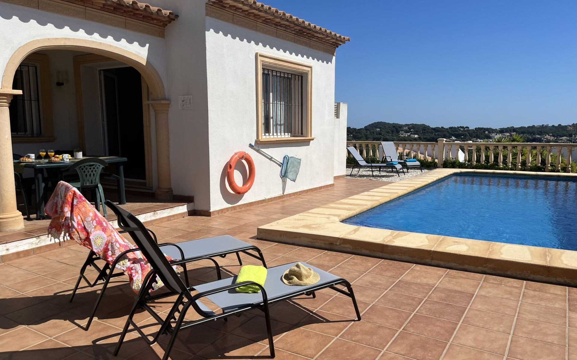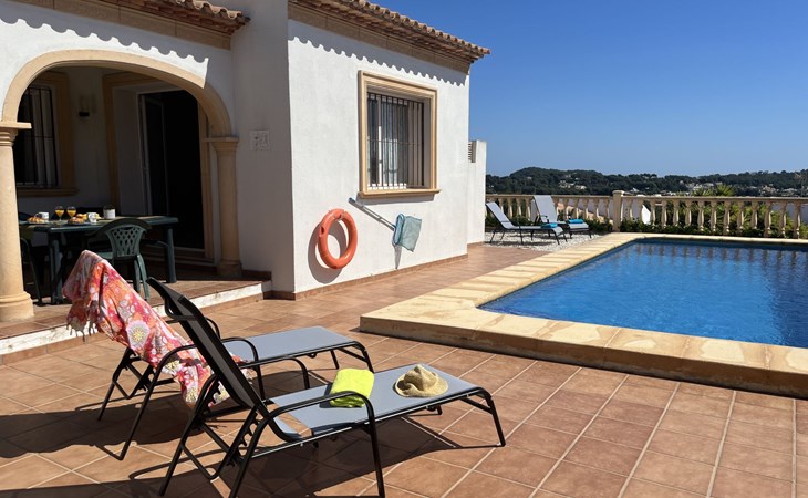 House. 24 houses in the residence. In the district of Monte Javea 5 km from the centre of Jávea-Arenal, on a slope, 3 km from the sea. Private: property (fenced) with wildlife garden and trees, swimming pool (8 x 4 m, depth 120 - 220 cm, seasonal availability: 01.Jan. - 31.Dec.). Public parking on the road. Shop 2.5 km, restaurant 1 km, bus stop "Calablanca" 3.6 km, sandy beach "Arenal" 5 km pebble beach "Granadella" 3 km. Tennis 1 km.