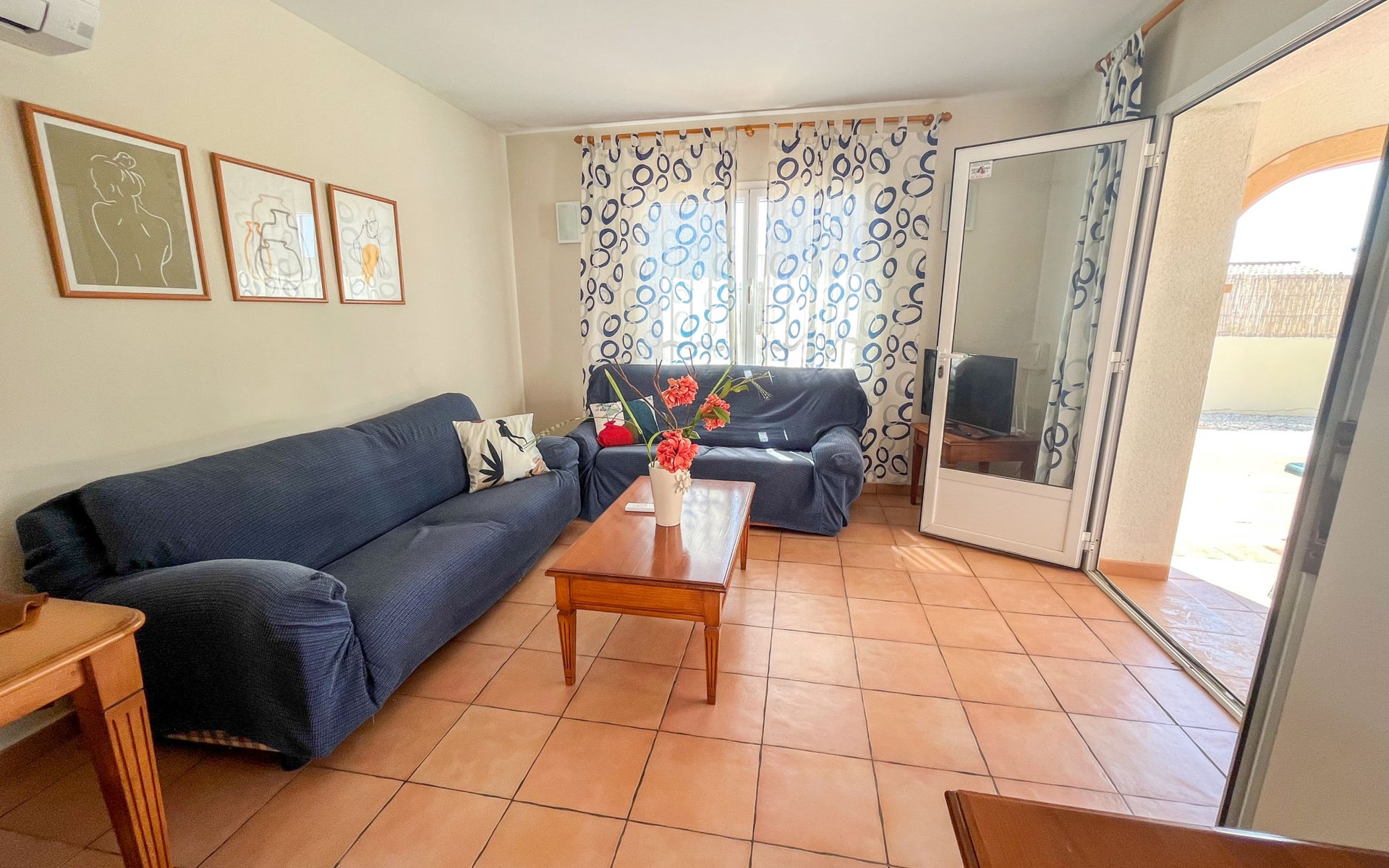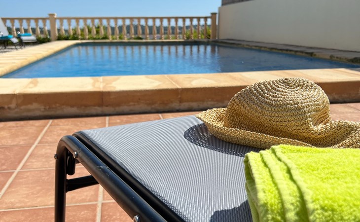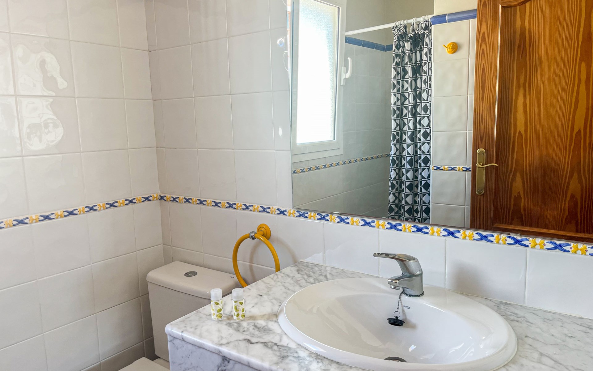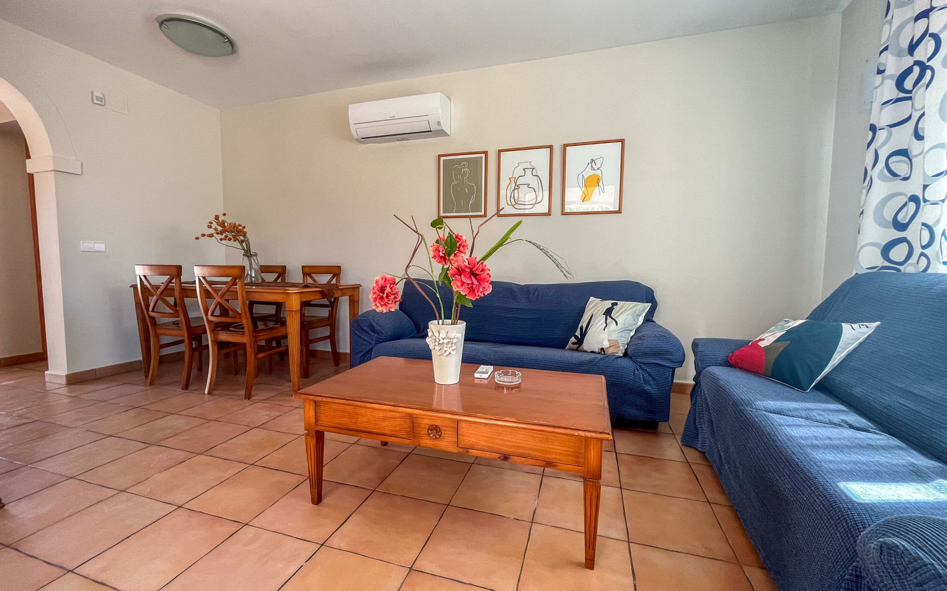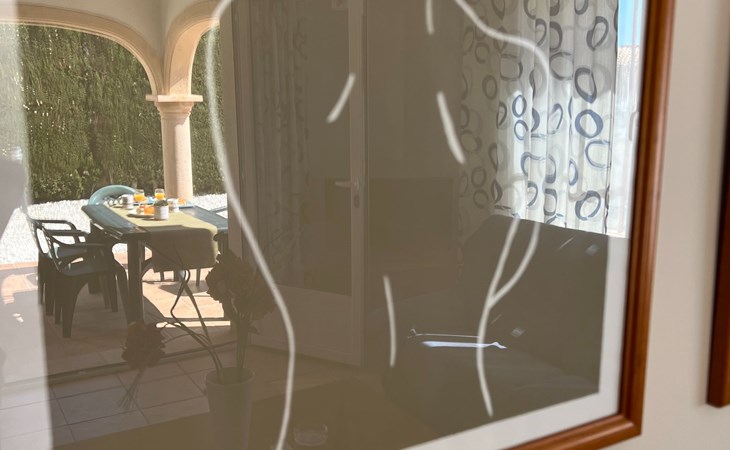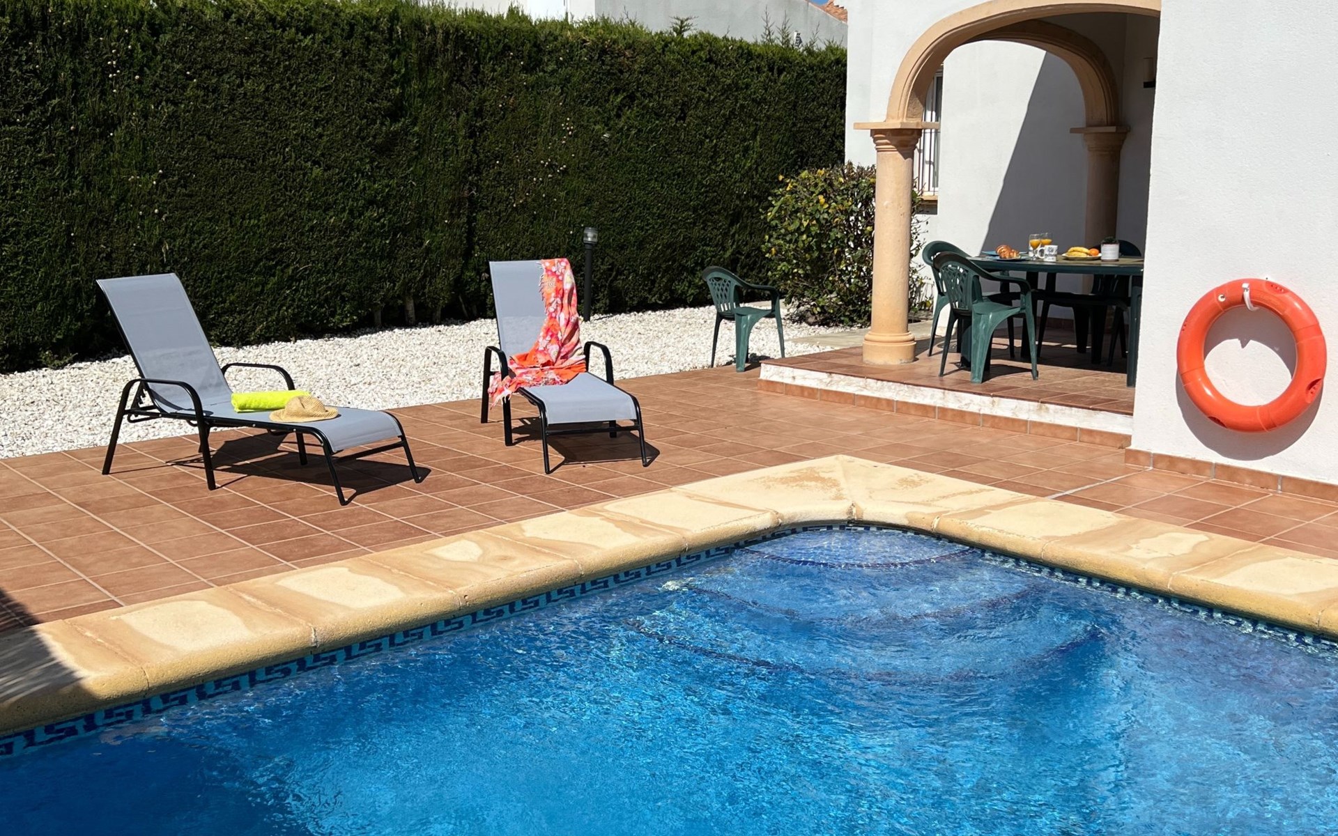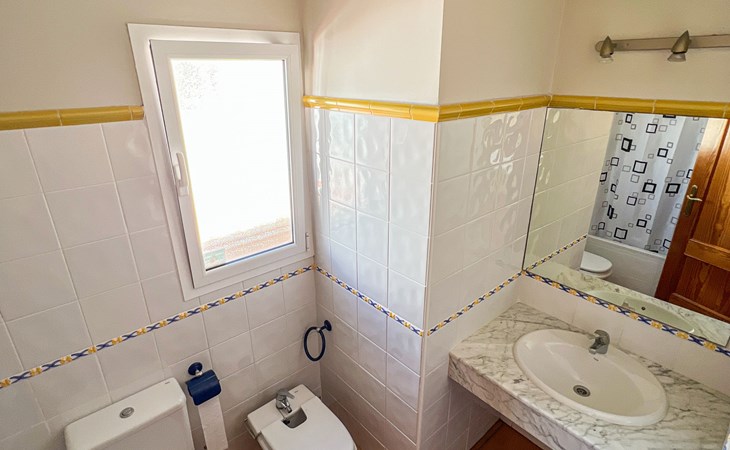 House. 24 houses in the residence. In the district of Monte Javea 5 km from the centre of Jávea-Arenal, on a slope, 3 km from the sea. Private: property (fenced) with wildlife garden and trees, swimming pool (8 x 4 m, depth 120 - 220 cm, seasonal availability: 01.Jan. - 31.Dec.). Public parking on the road. Shop 2.5 km, restaurant 1 km, bus stop "Calablanca" 3.6 km, sandy beach "Arenal" 5 km pebble beach "Granadella" 3 km. Tennis 1 km.