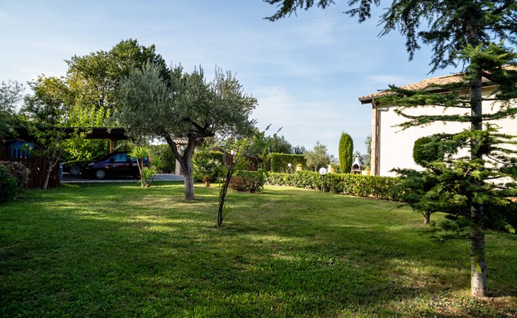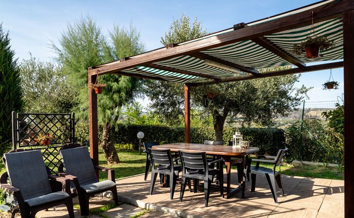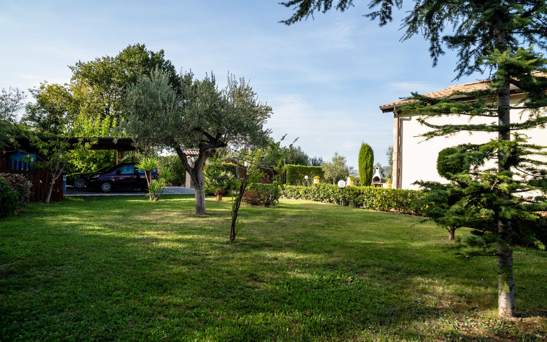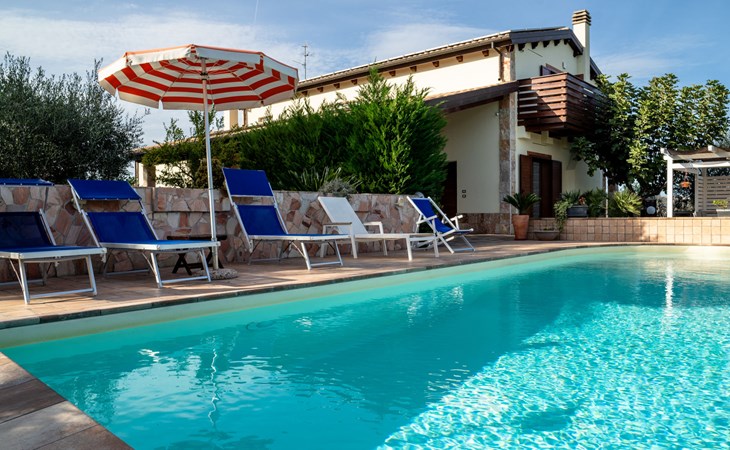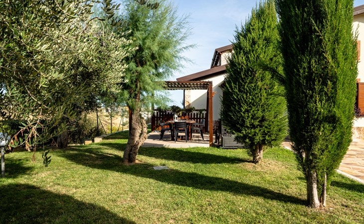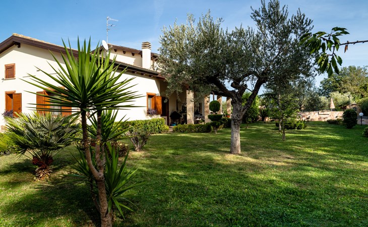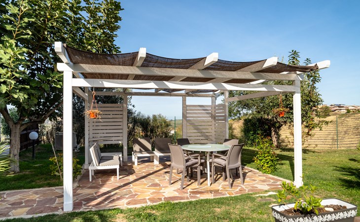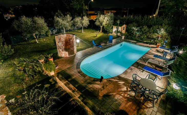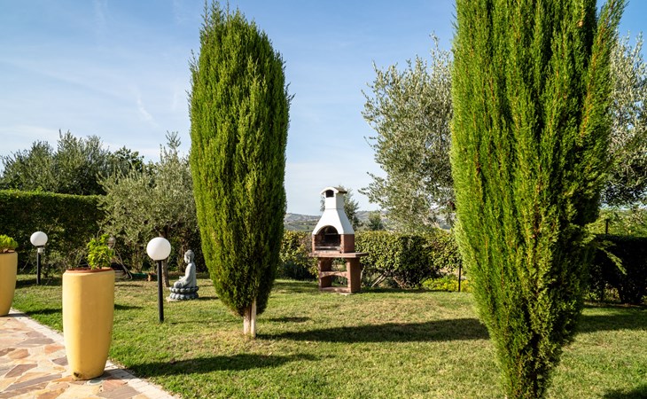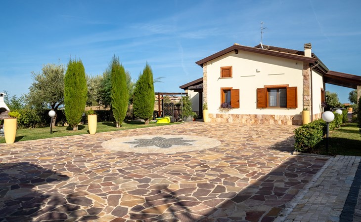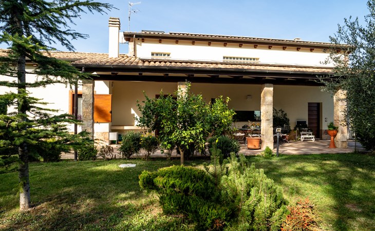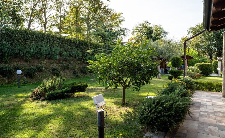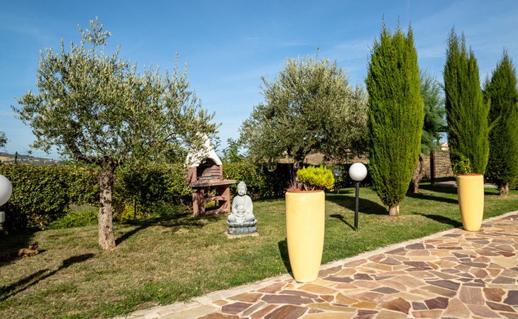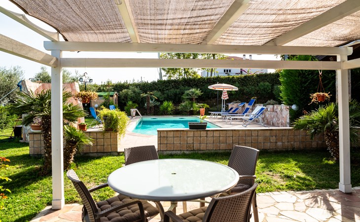 2-family house "Rêve d'Or", 300 m a.s.l.. Property composed of main house and outbuilding, in the district of Madonna della Pace 2 km from the centre of Città Sant' Angelo, 10 km from the centre of Pescara, 6 km from the centre of Montesilvano, in an elevated position on a slope, 6 km from the sea, on a main road. For shared use: property 3'000 m2 (fenced), well-kept garden lawn and plants, swimming pool (10 x 5 m, depth 120 - 220 cm, seasonal availability: 01.May. - 15.Oct.) with salt water. Outdoor shower, pergola, terrace, garden furniture, barbecue. In the house: washing machine (for shared use, extra). Roofed, parking on the premises. E-charging station. Shop 100 m, bus stop 300 m, railway station "Pescara" 12 km, sandy beach 6 km. Nearby attractions: Città Sant'Angelo Borgo tra i più belli, Collegiata di San Michele 2 km. Please note: the owner lives in the same residence. The owner has a dog. Motorway 10 km from the property. Main road 20 m from the property.