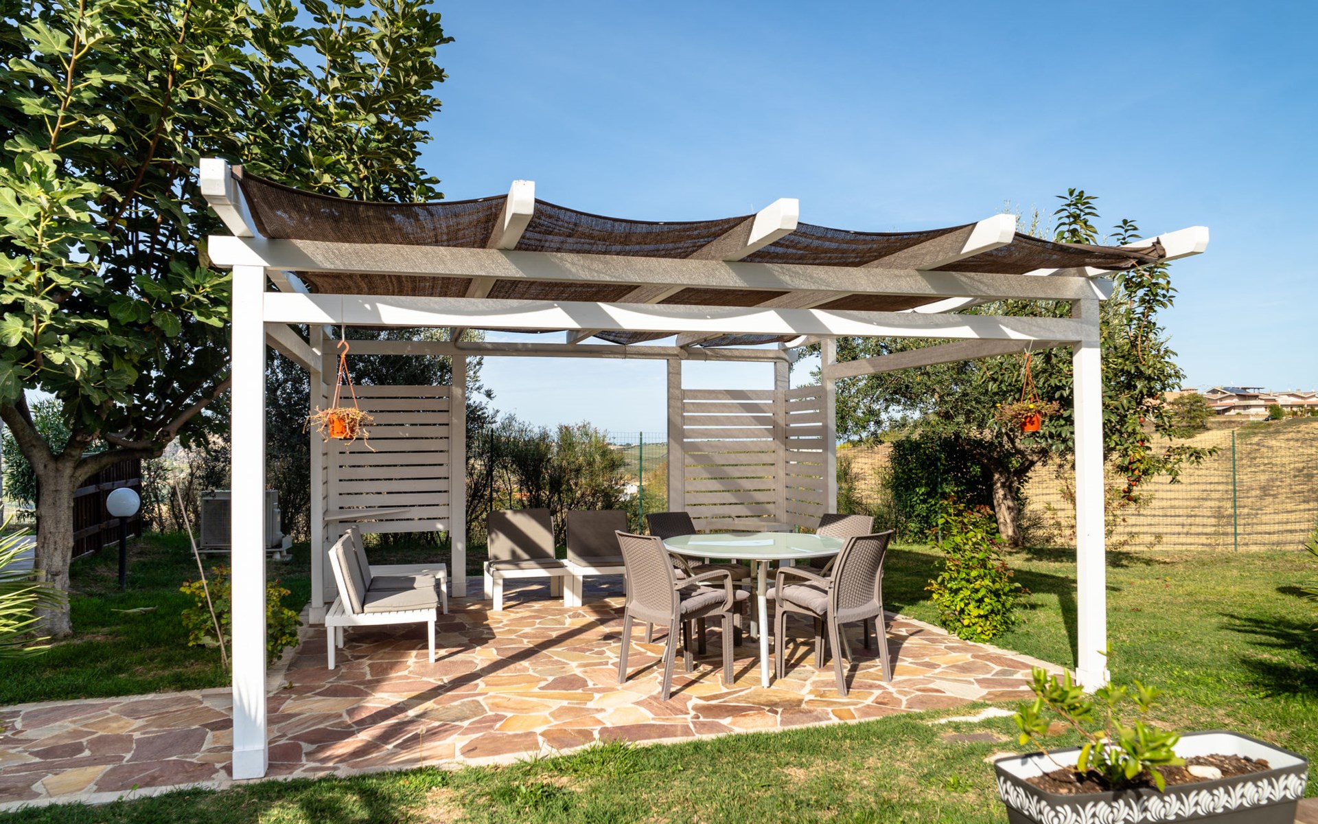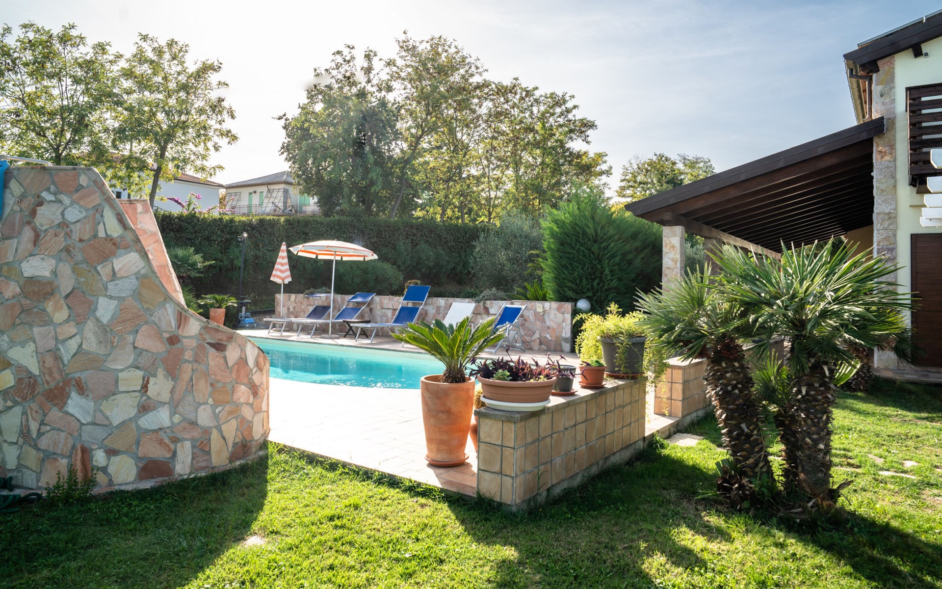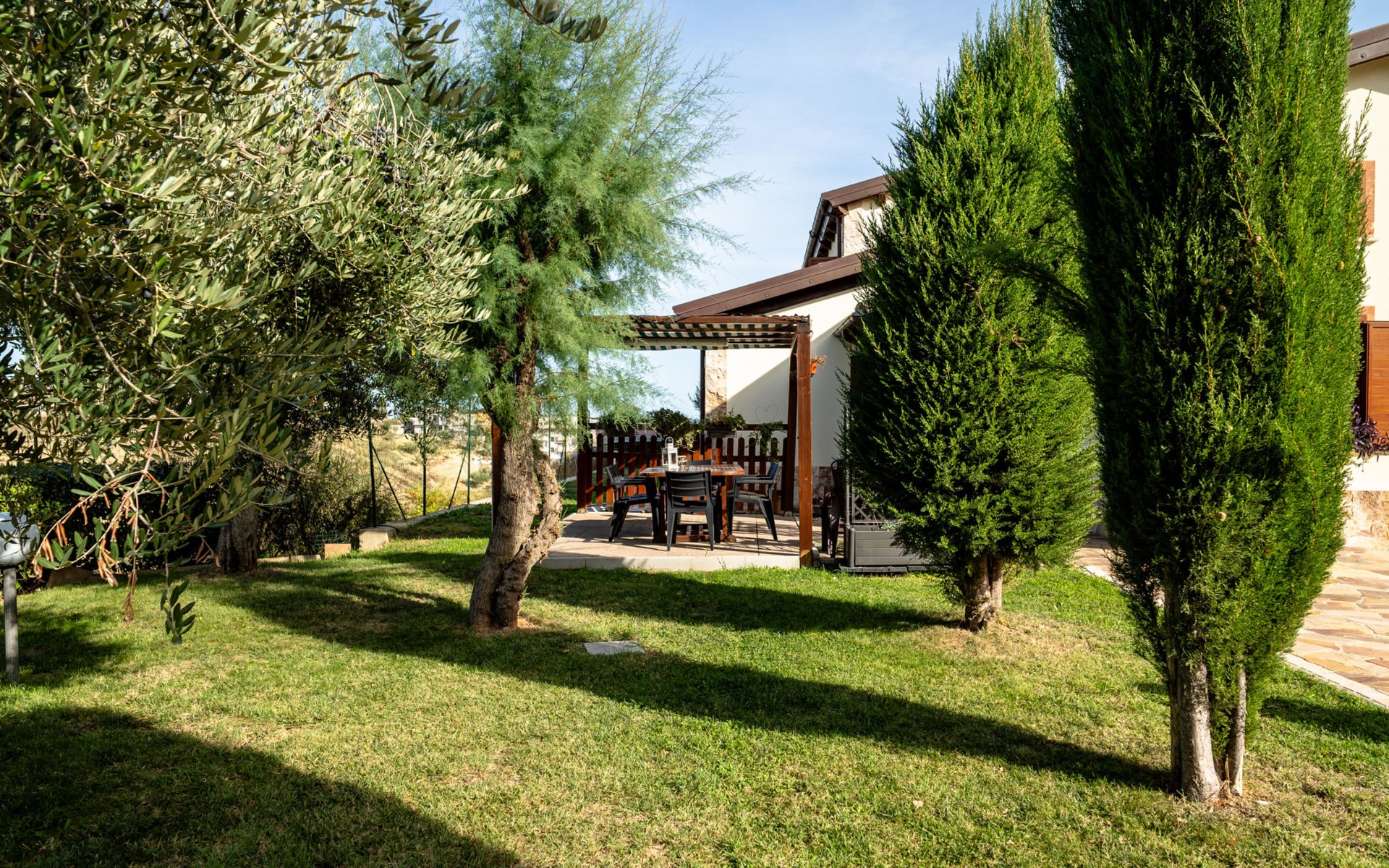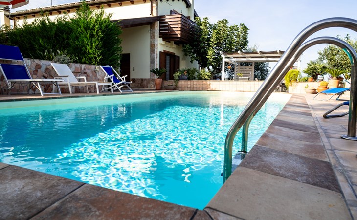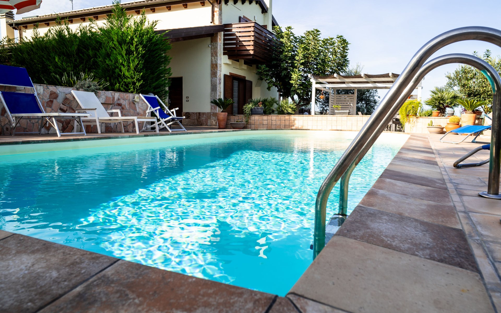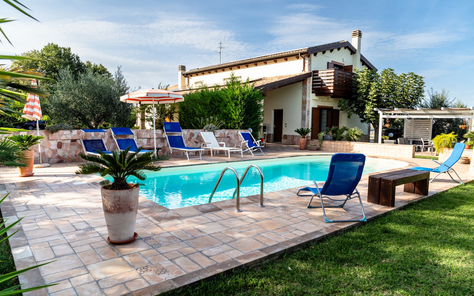 2-family house "Rêve d'Or", 300 m a.s.l.. Property composed of main house and outbuilding, in the district of Madonna della Pace 2 km from the centre of Città Sant' Angelo, 10 km from the centre of Pescara, 6 km from the centre of Montesilvano, in an elevated position on a slope, 6 km from the sea, on a main road. For shared use: property 3'000 m2 (fenced), well-kept garden lawn and plants, swimming pool (10 x 5 m, depth 120 - 220 cm, seasonal availability: 01.May. - 15.Oct.) with salt water. Outdoor shower, pergola, terrace, garden furniture, barbecue. In the house: washing machine (for shared use, extra). Roofed, parking on the premises. E-charging station. Shop 100 m, bus stop 300 m, railway station "Pescara" 12 km, sandy beach 6 km. Nearby attractions: Città Sant'Angelo Borgo tra i più belli, Collegiata di San Michele 2 km. Please note: the owner lives in the same residence. The owner has a dog. Motorway 10 km from the property. Main road 20 m from the property.