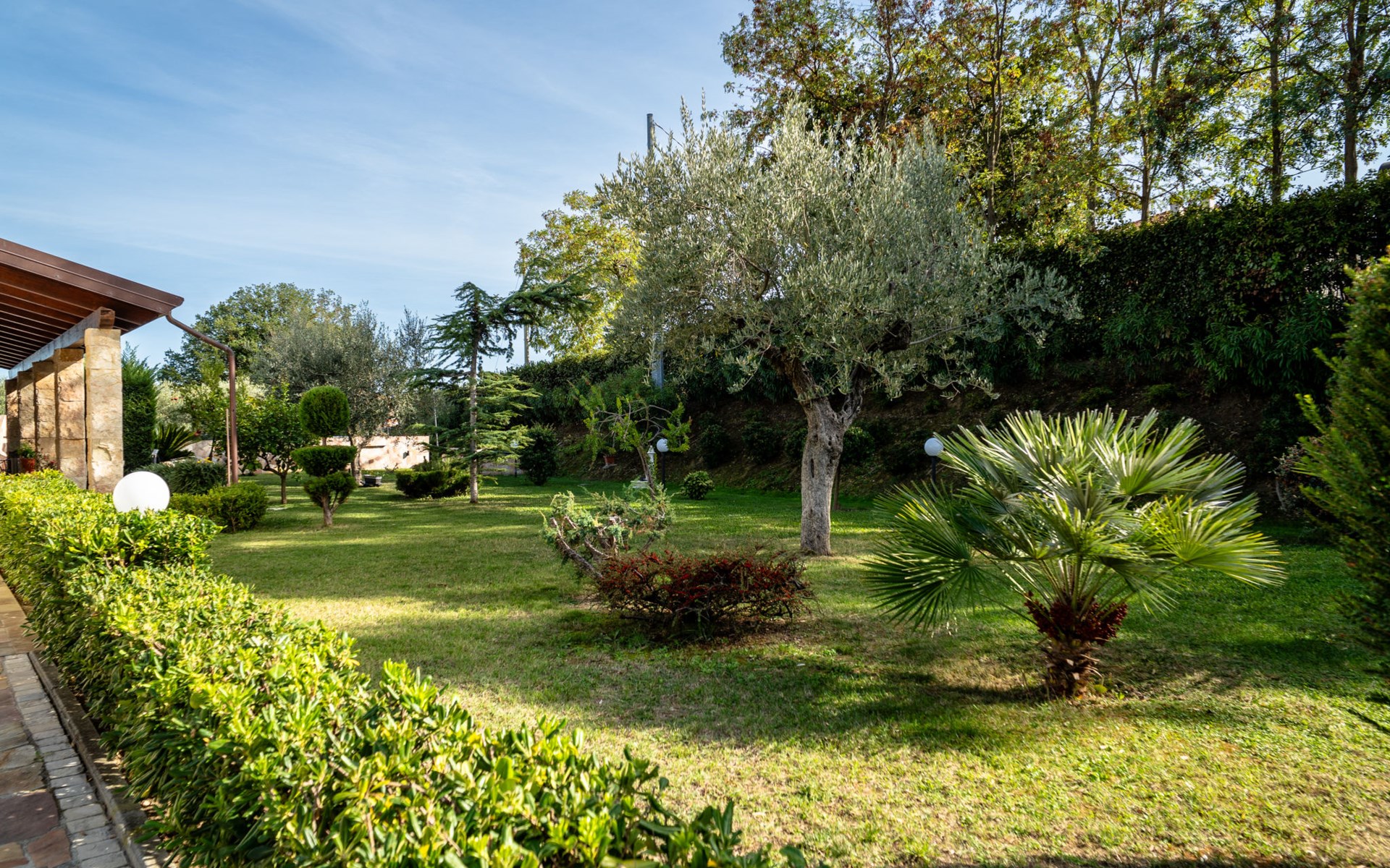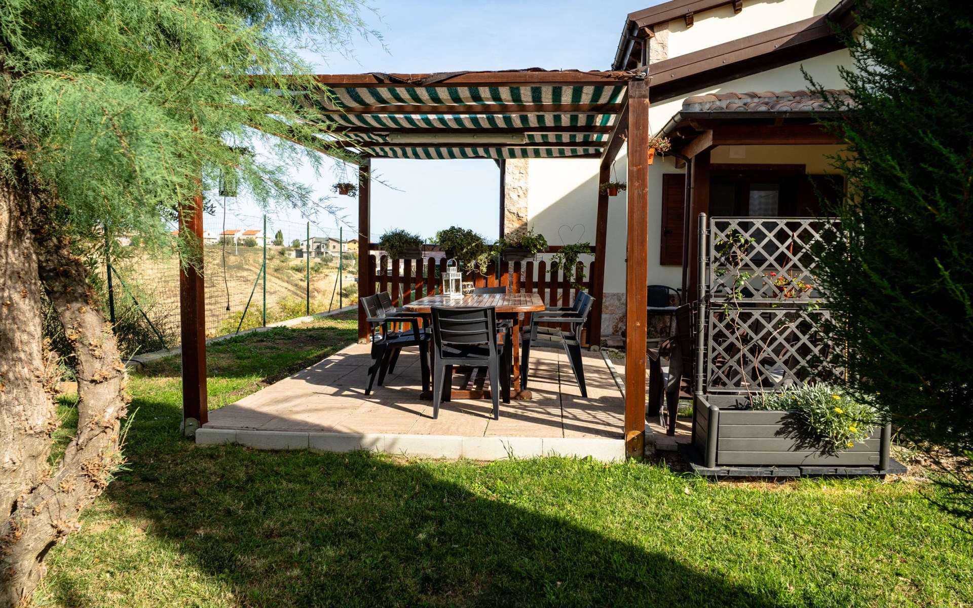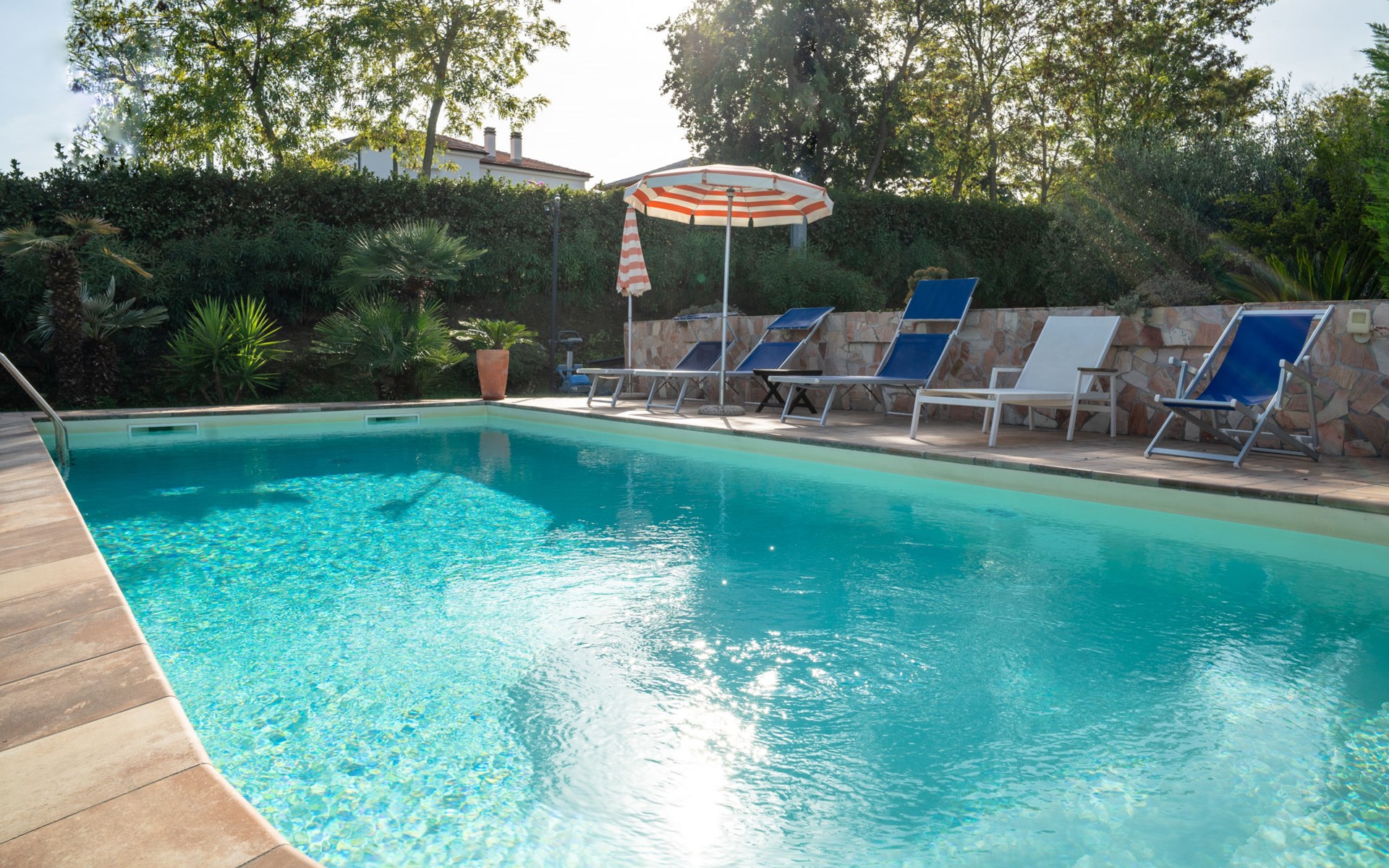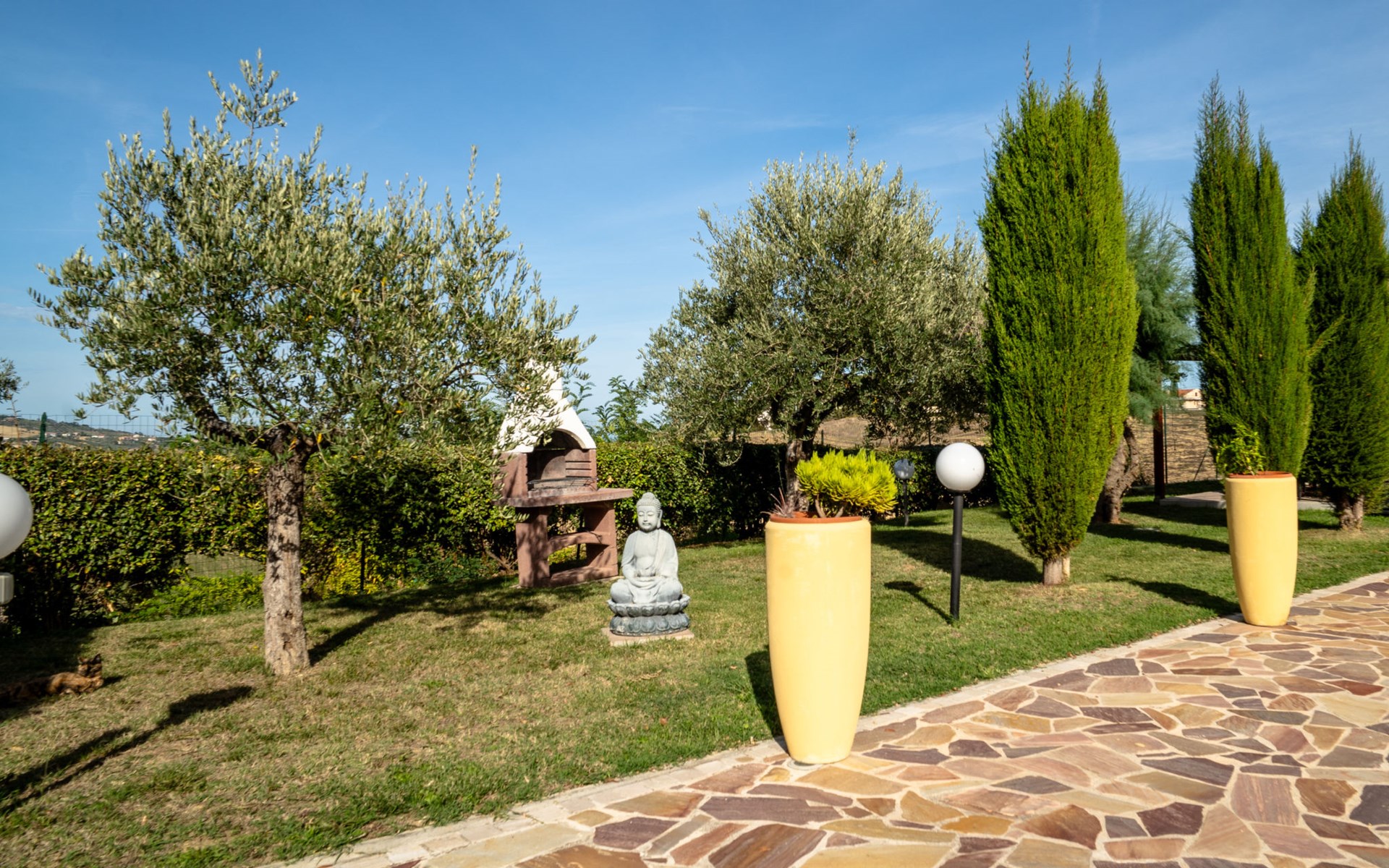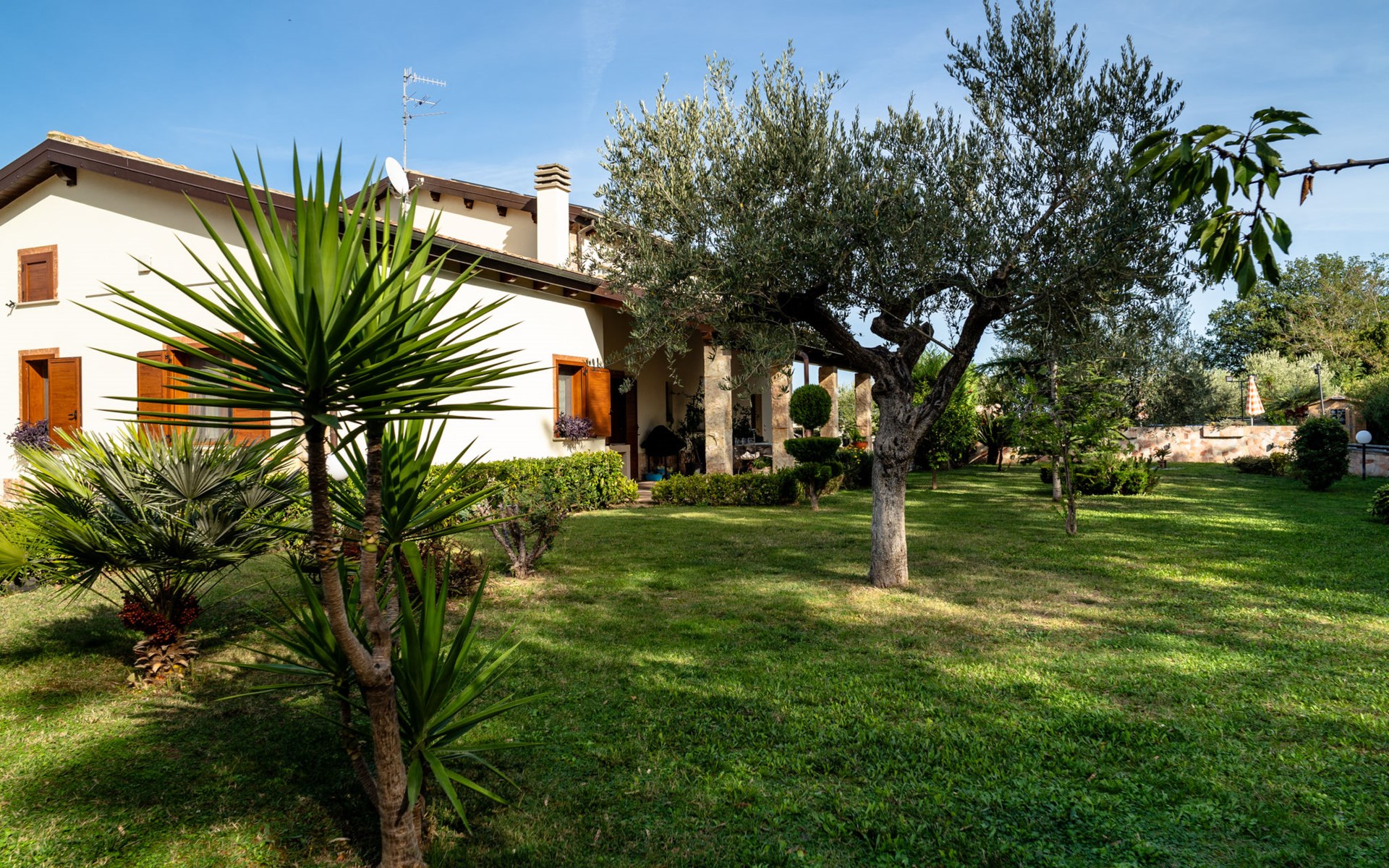 2-family house "Rêve d'Or", 300 m a.s.l.. Property composed of main house and outbuilding, in the district of Madonna della Pace 2 km from the centre of Città Sant' Angelo, 10 km from the centre of Pescara, 6 km from the centre of Montesilvano, in an elevated position on a slope, 6 km from the sea, on a main road. For shared use: property 3'000 m2 (fenced), well-kept garden lawn and plants, swimming pool (10 x 5 m, depth 120 - 220 cm, seasonal availability: 01.May. - 15.Oct.) with salt water. Outdoor shower, pergola, terrace, garden furniture, barbecue. In the house: washing machine (for shared use, extra). Roofed, parking on the premises. E-charging station. Shop 100 m, bus stop 300 m, railway station "Pescara" 12 km, sandy beach 6 km. Nearby attractions: Città Sant'Angelo Borgo tra i più belli, Collegiata di San Michele 2 km. Please note: the owner lives in the same residence. The owner has a dog. Motorway 10 km from the property. Main road 20 m from the property.