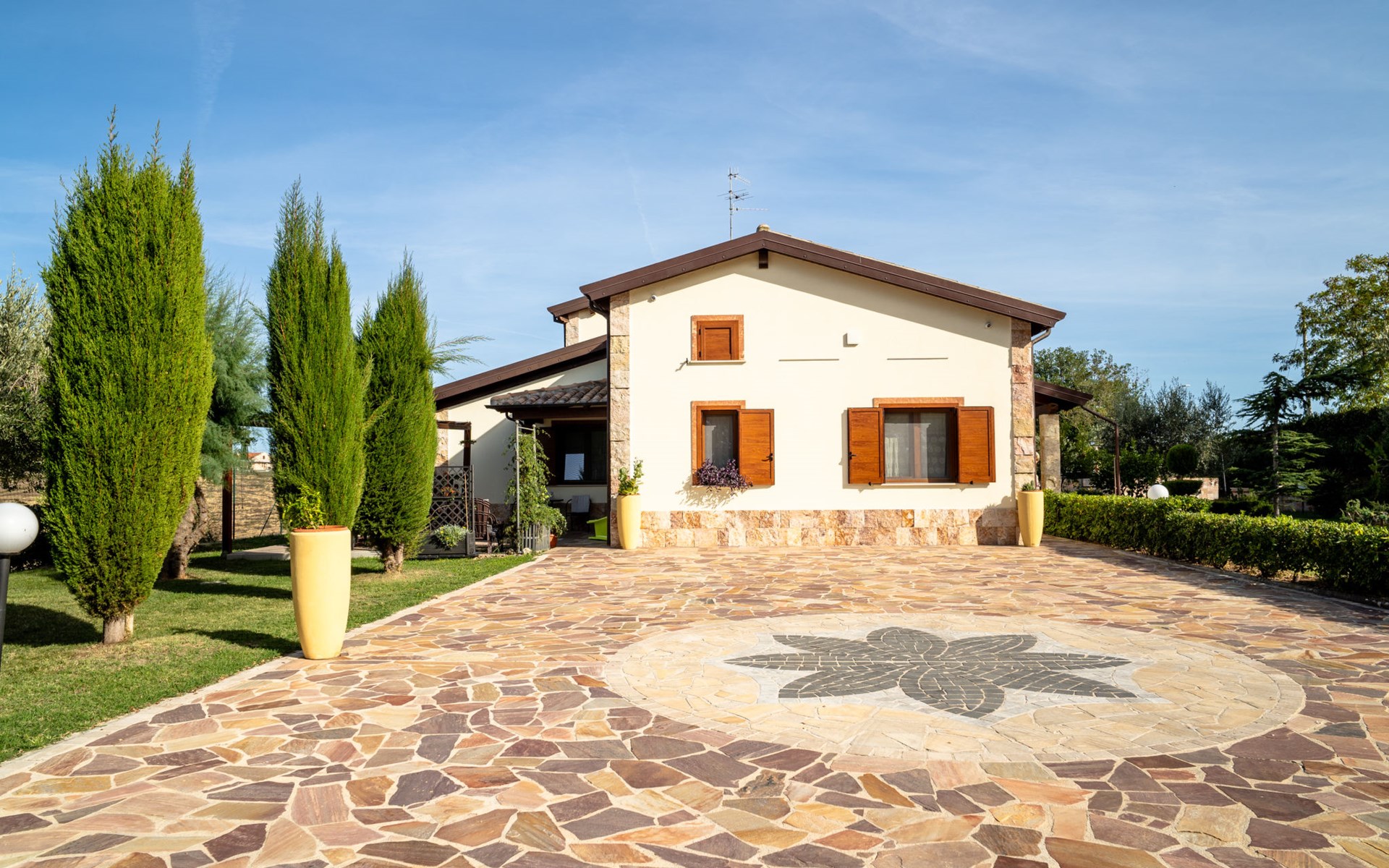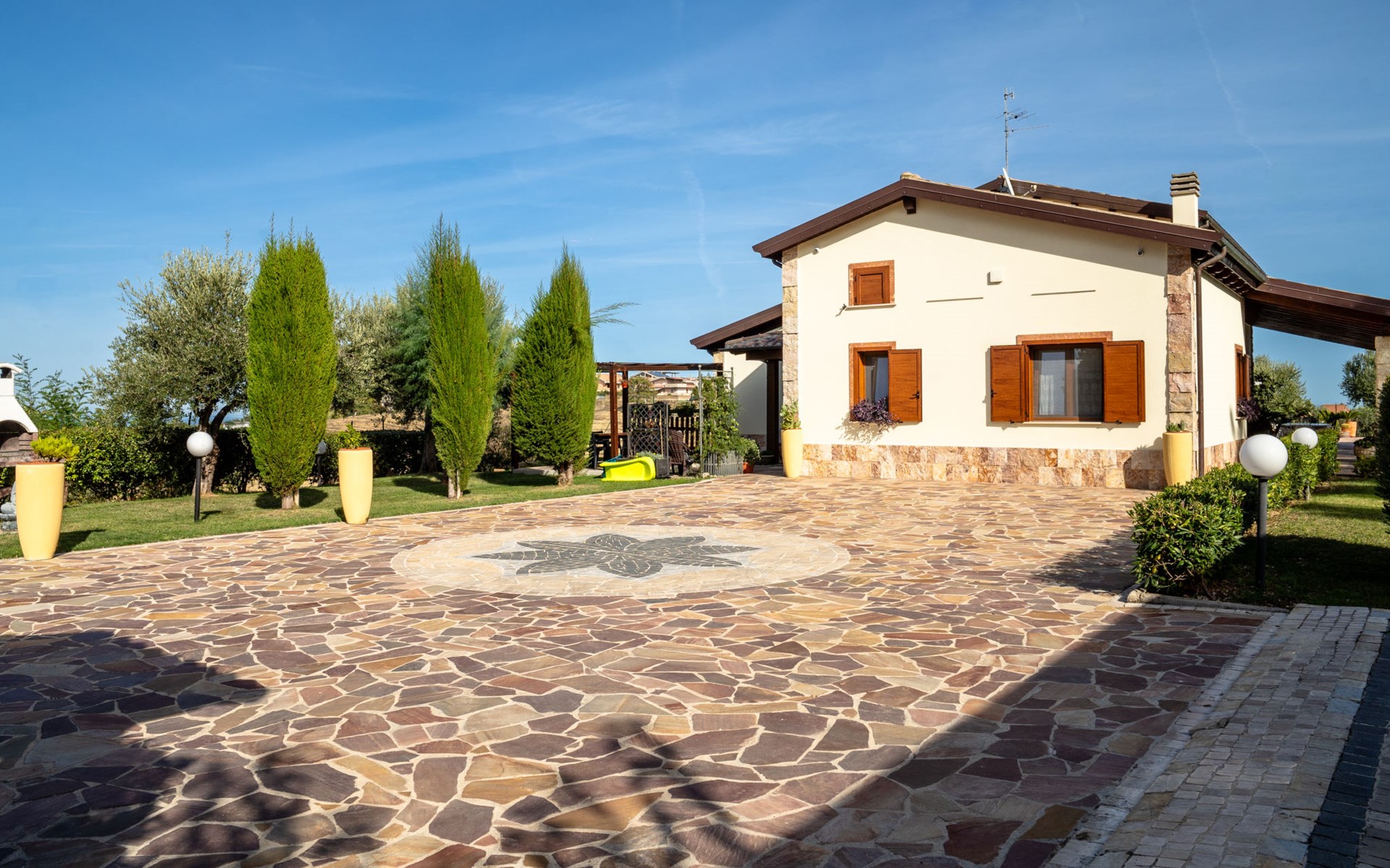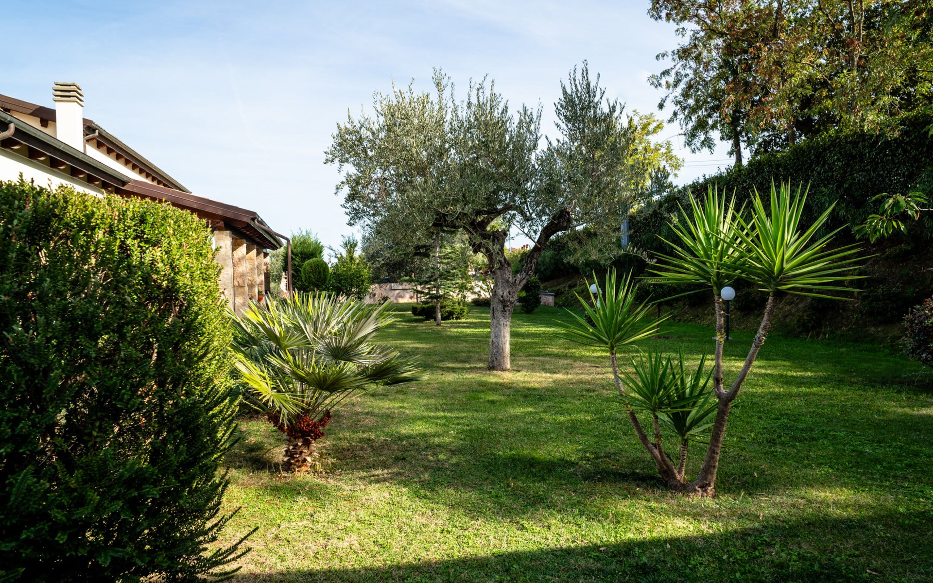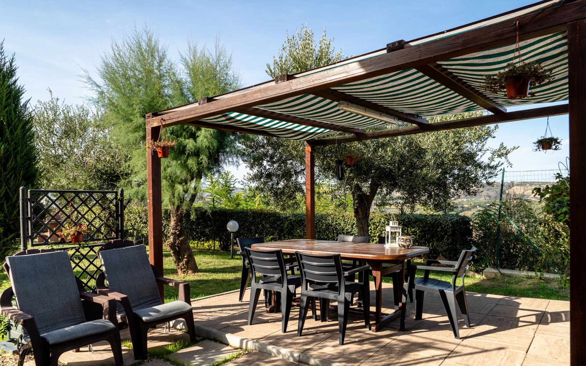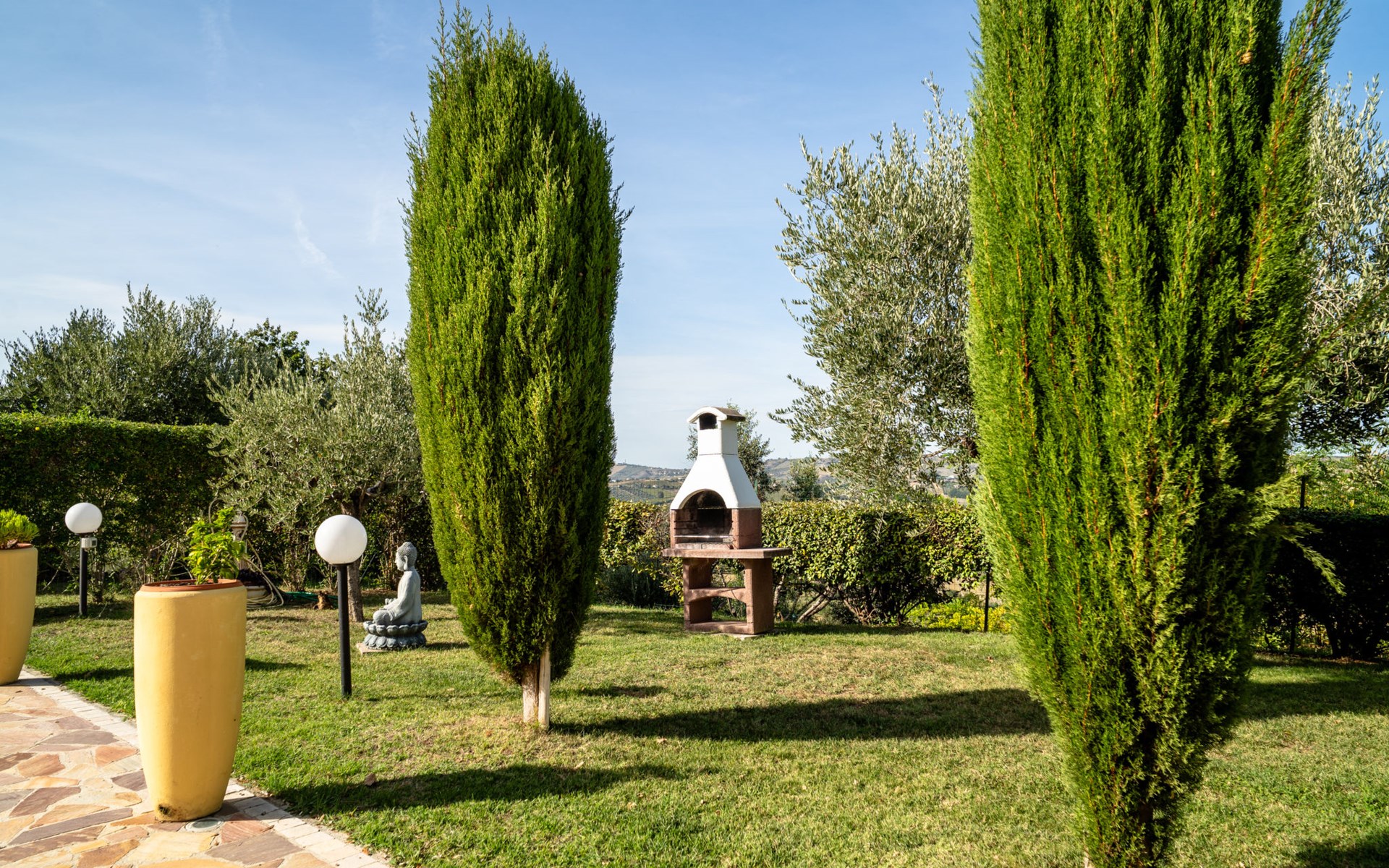 2-family house "Rêve d'Or", 300 m a.s.l.. Property composed of main house and outbuilding, in the district of Madonna della Pace 2 km from the centre of Città Sant' Angelo, 10 km from the centre of Pescara, 6 km from the centre of Montesilvano, in an elevated position on a slope, 6 km from the sea, on a main road. For shared use: property 3'000 m2 (fenced), well-kept garden lawn and plants, swimming pool (10 x 5 m, depth 120 - 220 cm, seasonal availability: 01.May. - 15.Oct.) with salt water. Outdoor shower, pergola, terrace, garden furniture, barbecue. In the house: washing machine (for shared use, extra). Roofed, parking on the premises. E-charging station. Shop 100 m, bus stop 300 m, railway station "Pescara" 12 km, sandy beach 6 km. Nearby attractions: Città Sant'Angelo Borgo tra i più belli, Collegiata di San Michele 2 km. Please note: the owner lives in the same residence. The owner has a dog. Motorway 10 km from the property. Main road 20 m from the property.