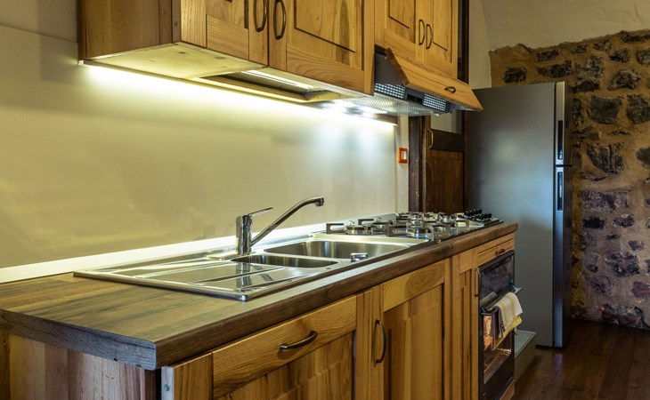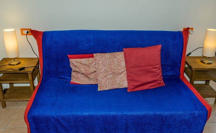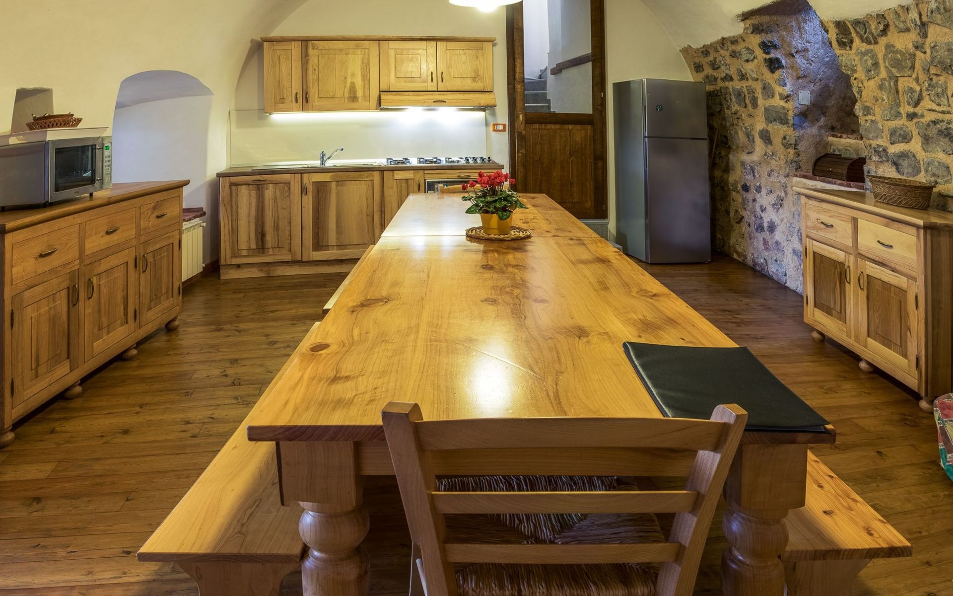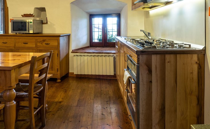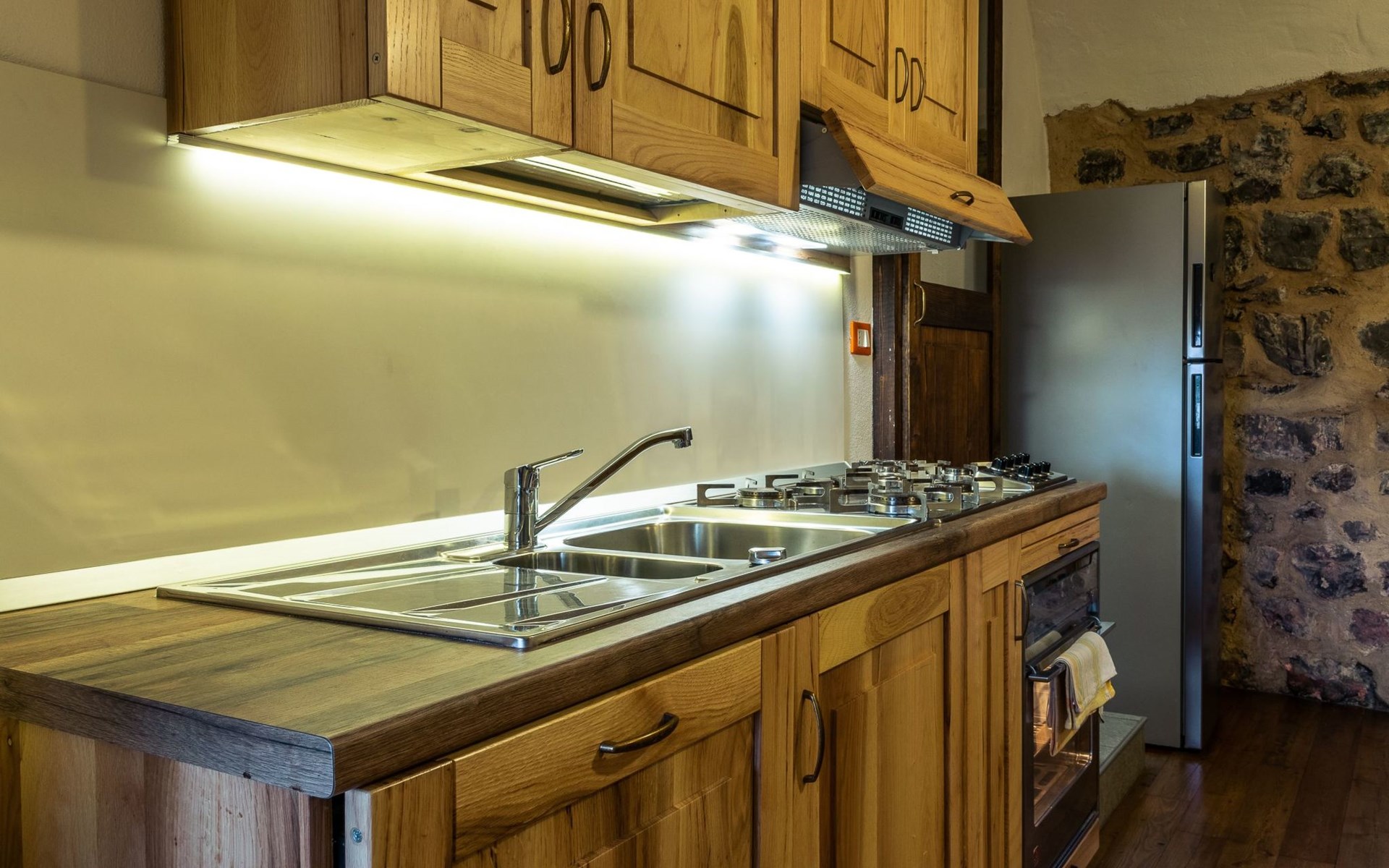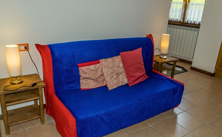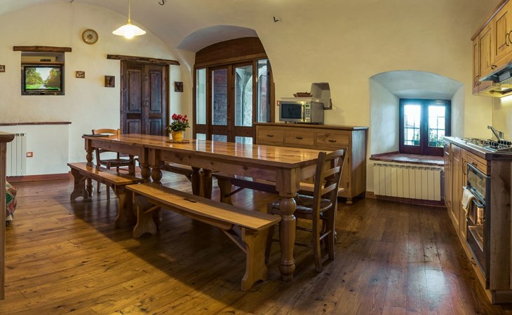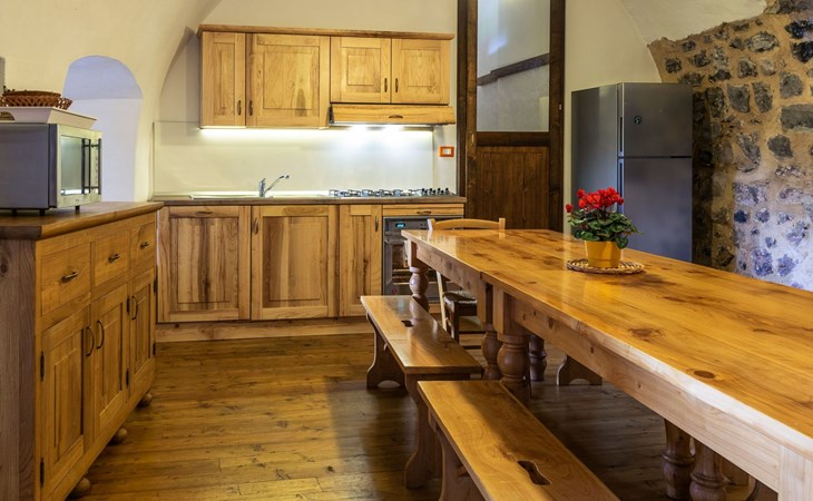 The large living room-kitchen with wooden floor and vaulted ceiling has two large dining tables with chairs, a sofa bed for two people and satellite smart-TV. It is equipped with a dishwasher, microwave, six-burner gas stove, oven and fridge with freezer.
