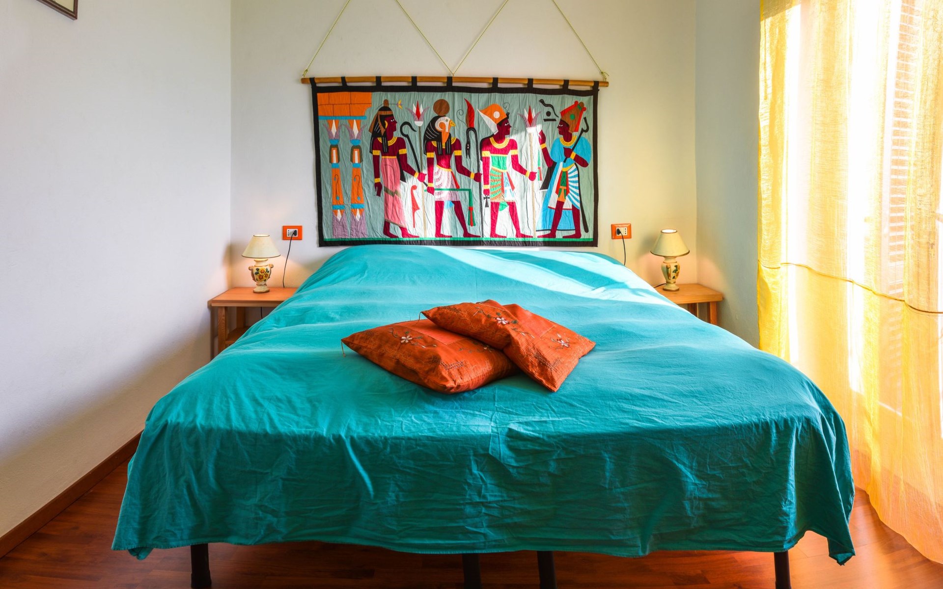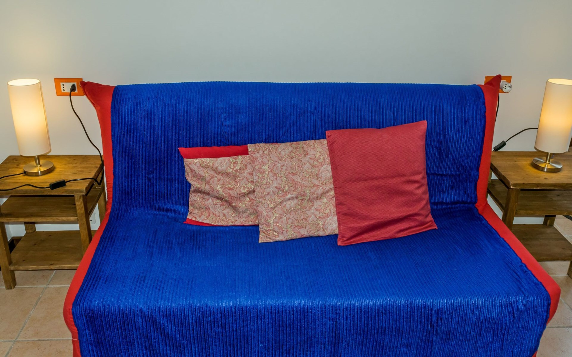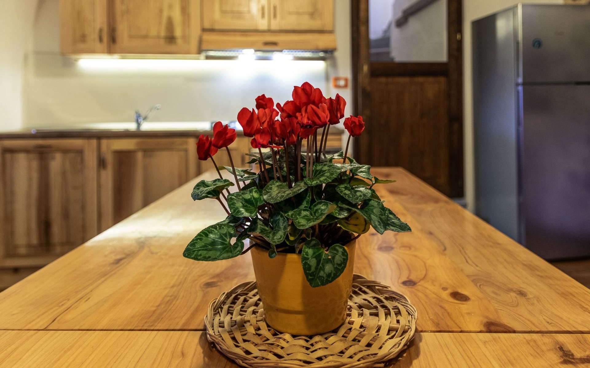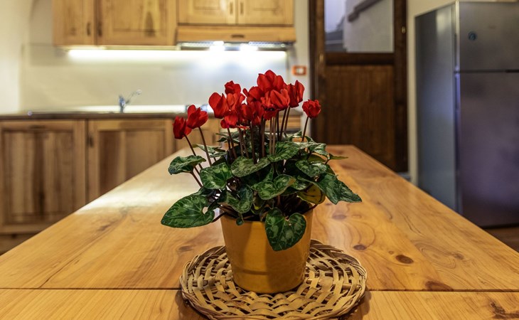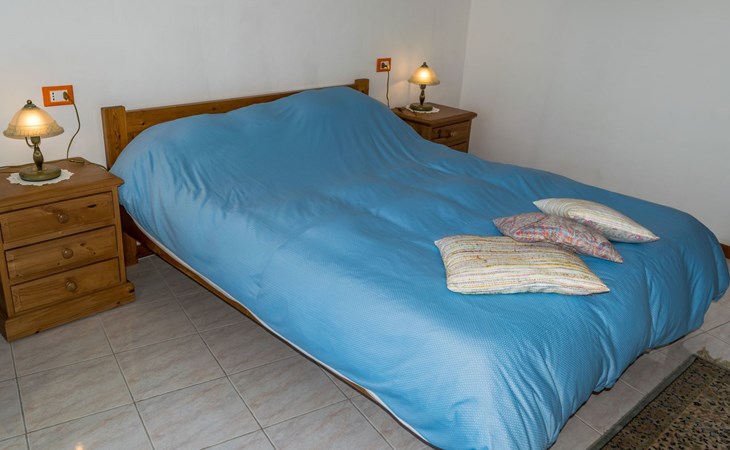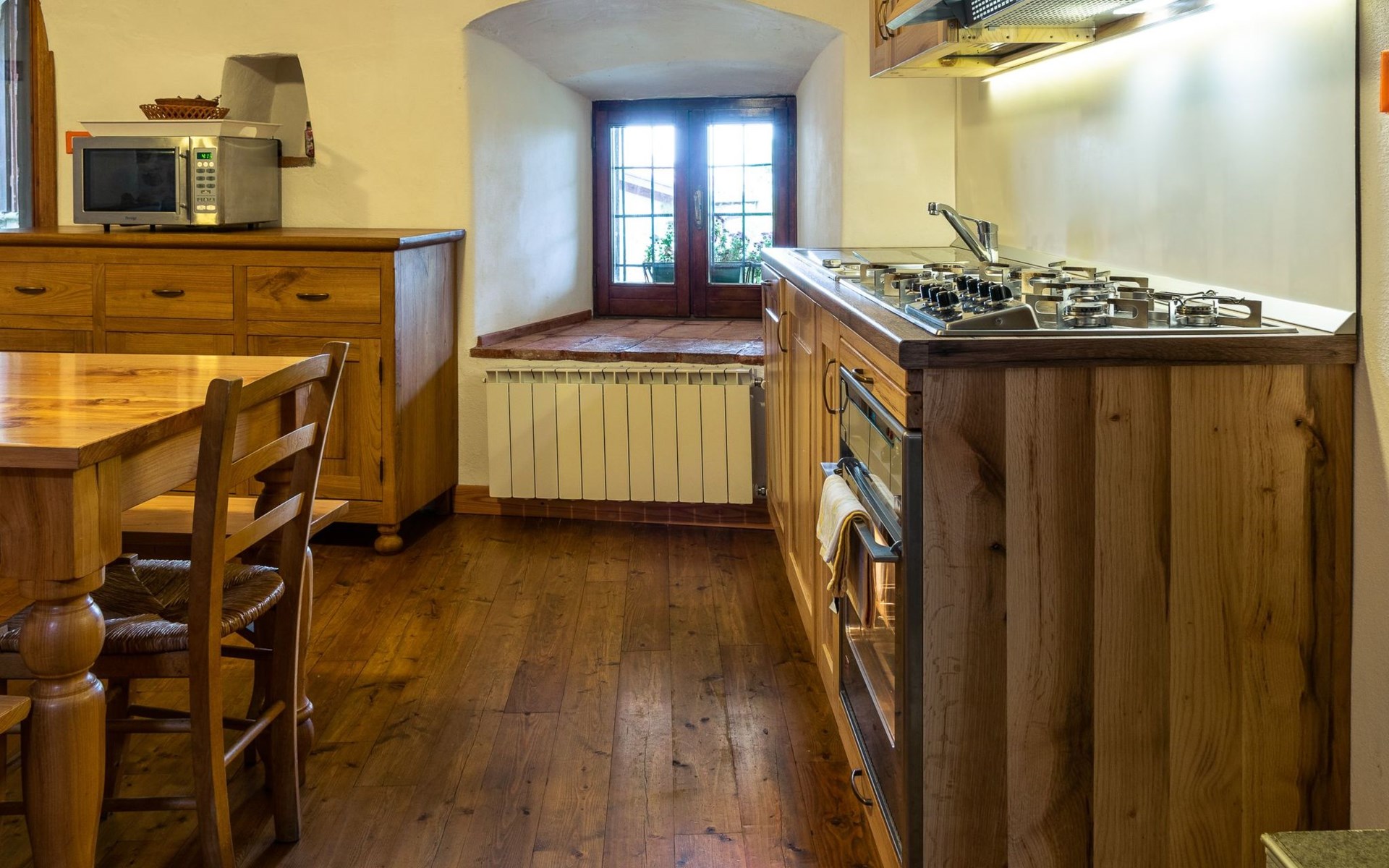 The large living room-kitchen with wooden floor and vaulted ceiling has two large dining tables with chairs, a sofa bed for two people and satellite smart-TV. It is equipped with a dishwasher, microwave, six-burner gas stove, oven and fridge with freezer.