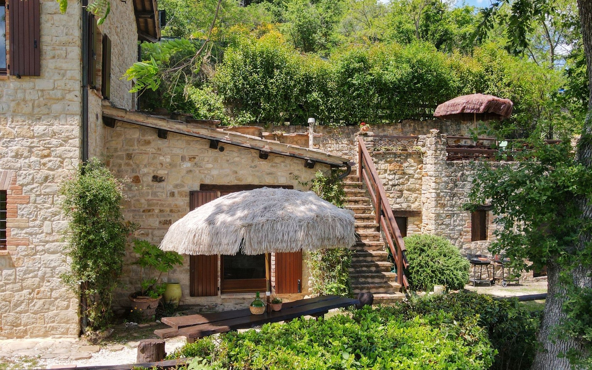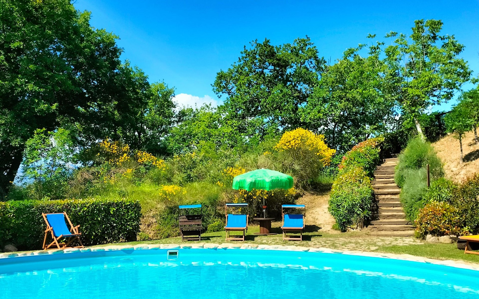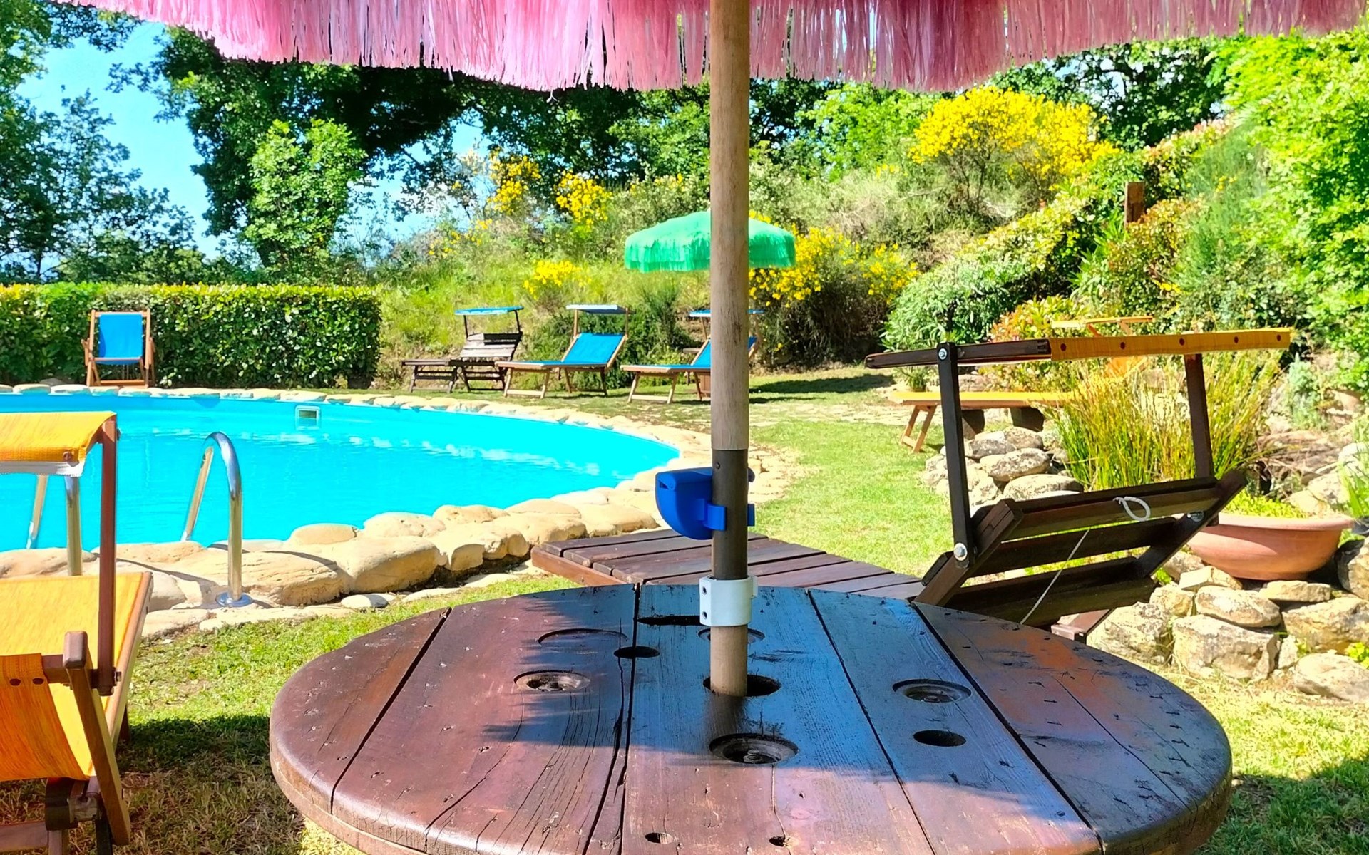 Outside, to be shared with the tenants of the other flat: park with fully furnished swimming pool, garden, park, parking. Circular pool, diameter 10 metres, height 120 cm. Opening mid-May, closing end September.