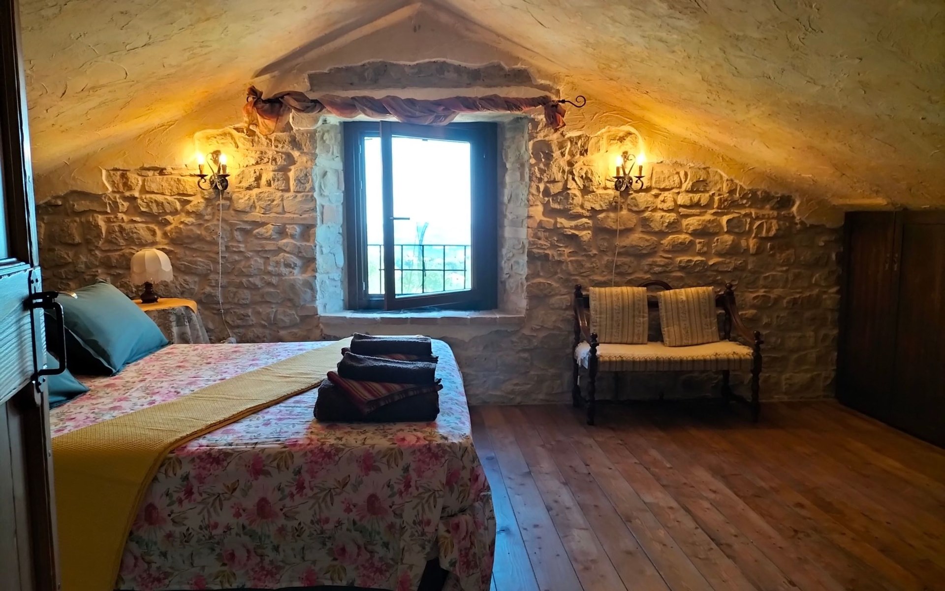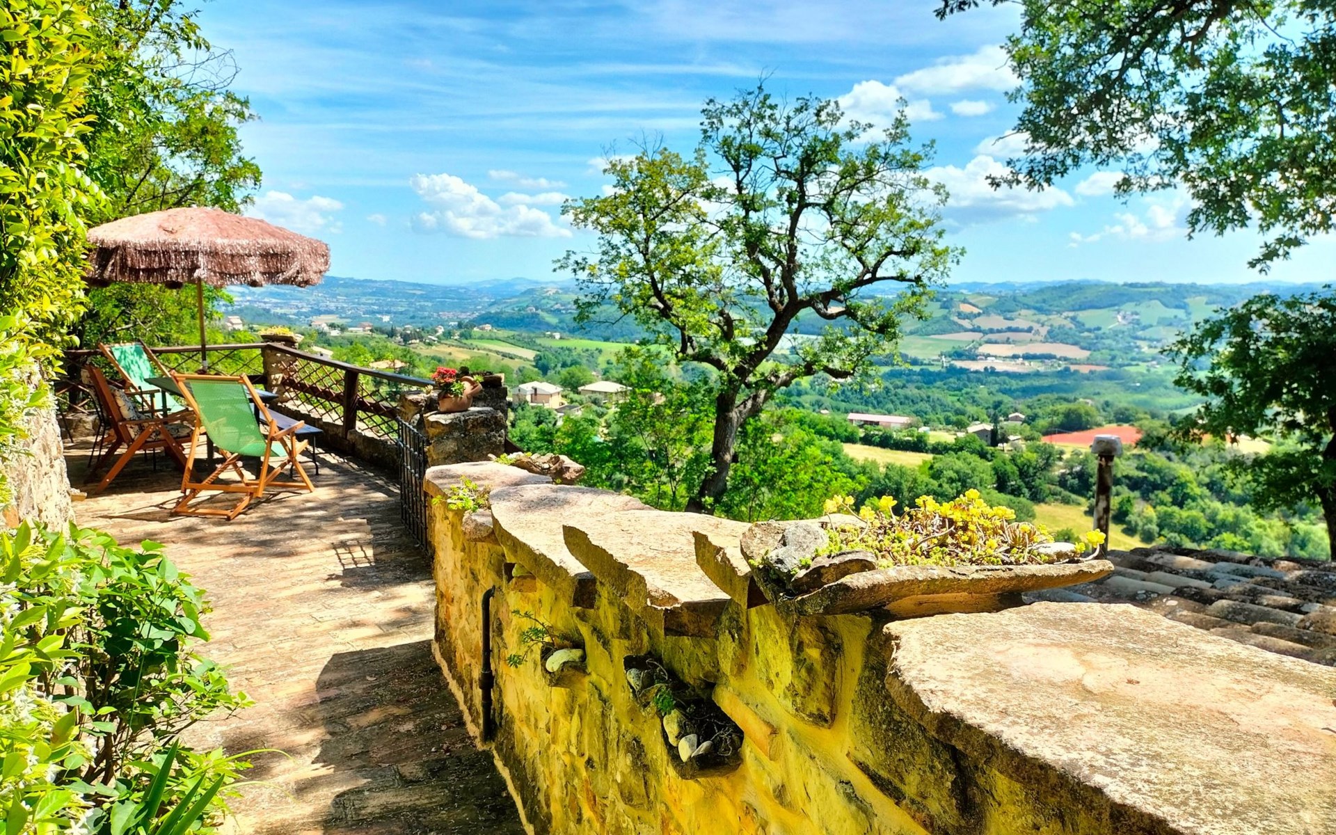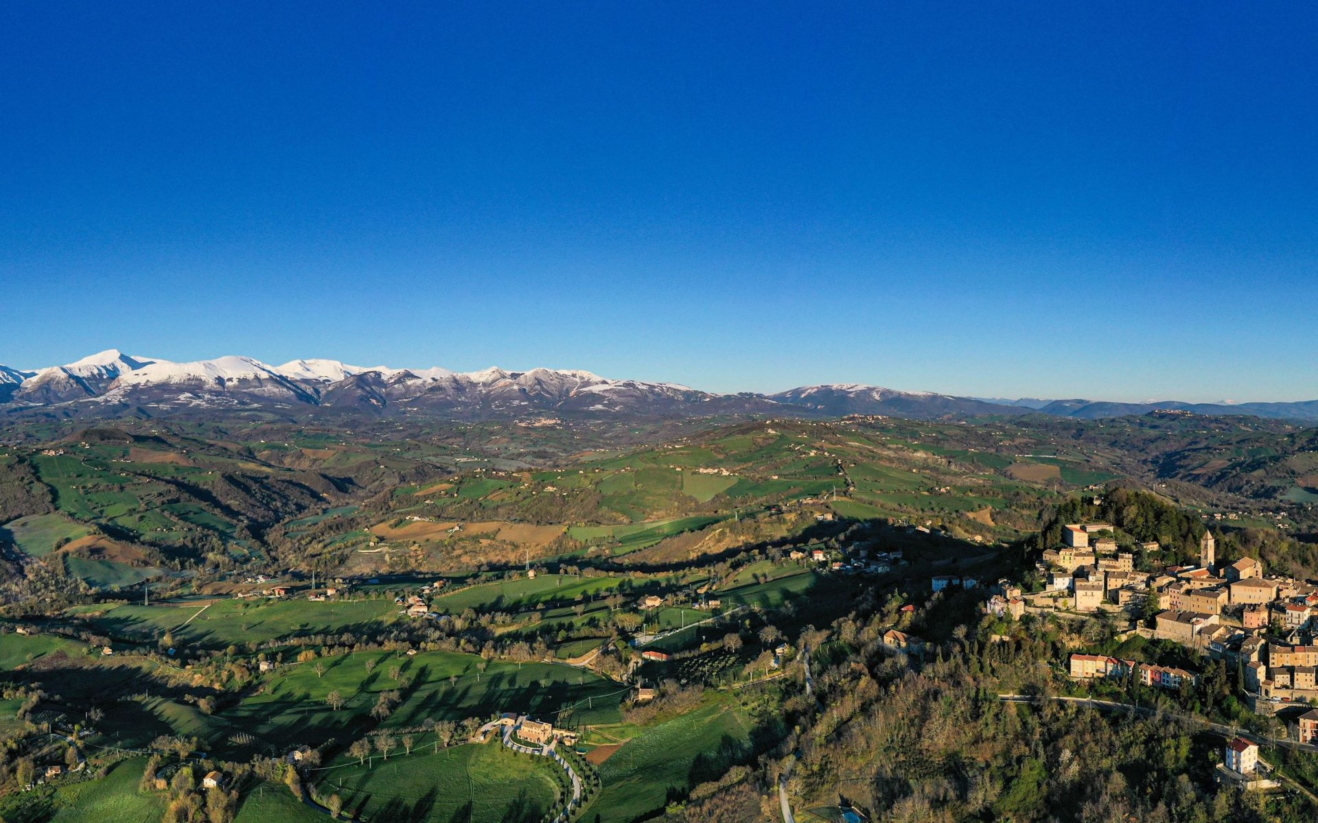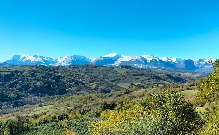 Situated on private land, in an absolutely dominant position, it overlooks a truly breathtaking panorama that sweeps from the nearby imposing Sibillini Mountains to the Adriatic coast, crossing the gentle undulation of the Marche hills.