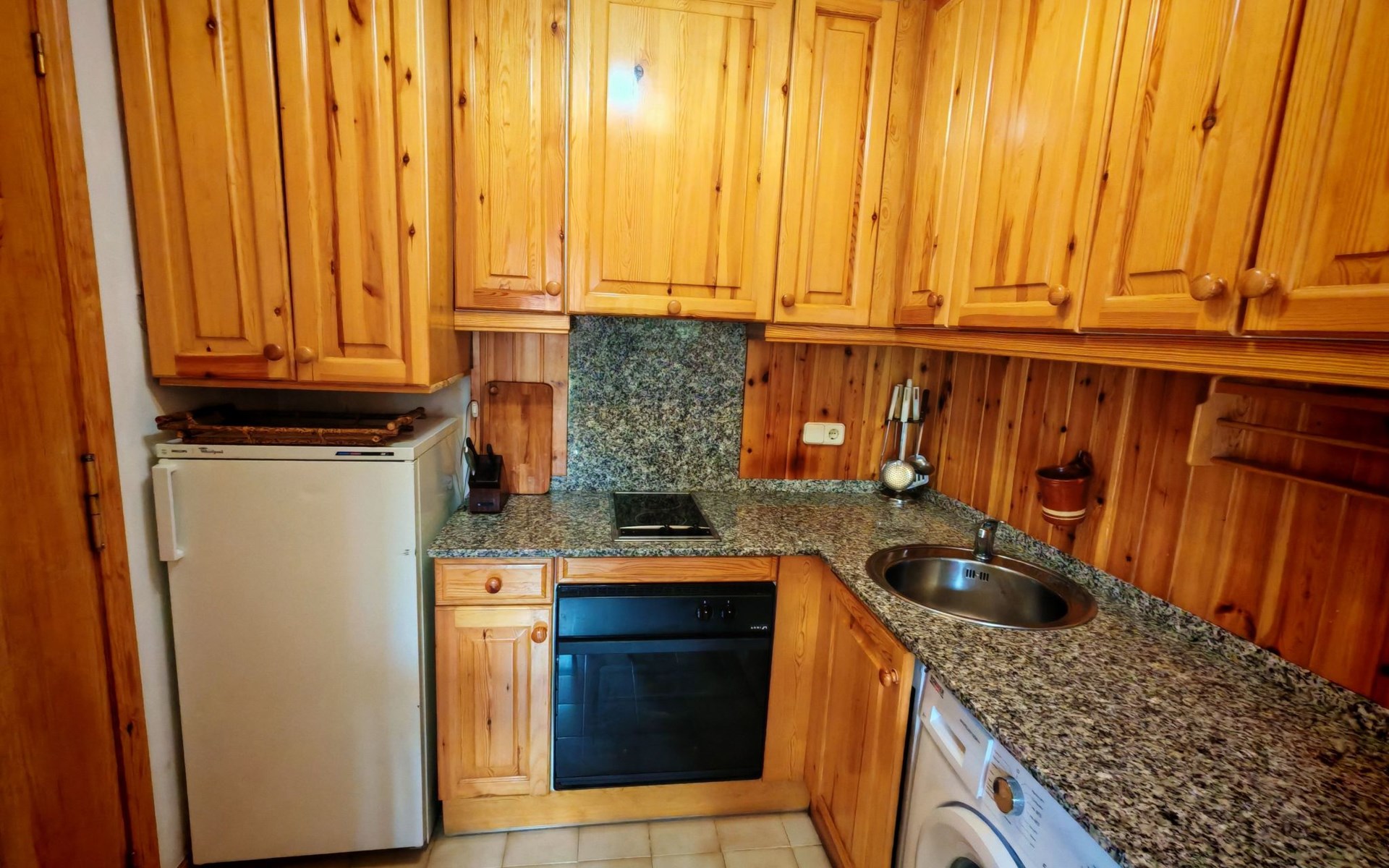Inside, this flat reveals a comfortable bedroom with a double bed, ensuring a refreshing rest after a day of adventures. For moments of relaxation, a cosy living room awaits you with a 150cm sofa bed, perfect for accommodating two more people. Function and comfort merge in the kitchen, equipped with ceramic hob and all the necessary utensils, as well as a courtesy cleaning kit, guaranteeing a practical and hassle-free stay. The dedicated washing machine adds an extra touch of convenience, making long stays or outdoor adventures as easy to manage as possible.