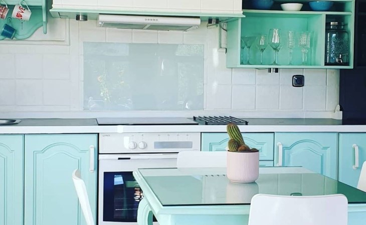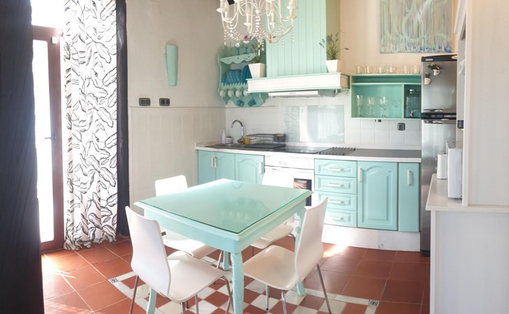 The house has a comfortable living and dining room with a large sofa and a fully equipped kitchen. Between the kitchen with refrigerator, microwave, oven, cooker and coffee machine and the living room is the dining table with four chairs. The house has two bedrooms, each with a double bed and a bathroom with shower. There is air-conditioning.