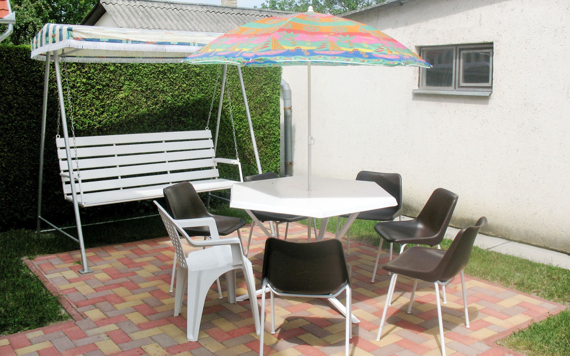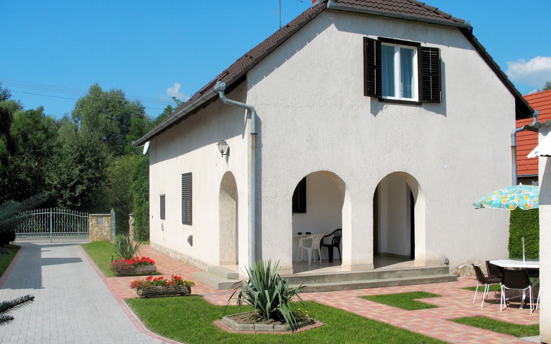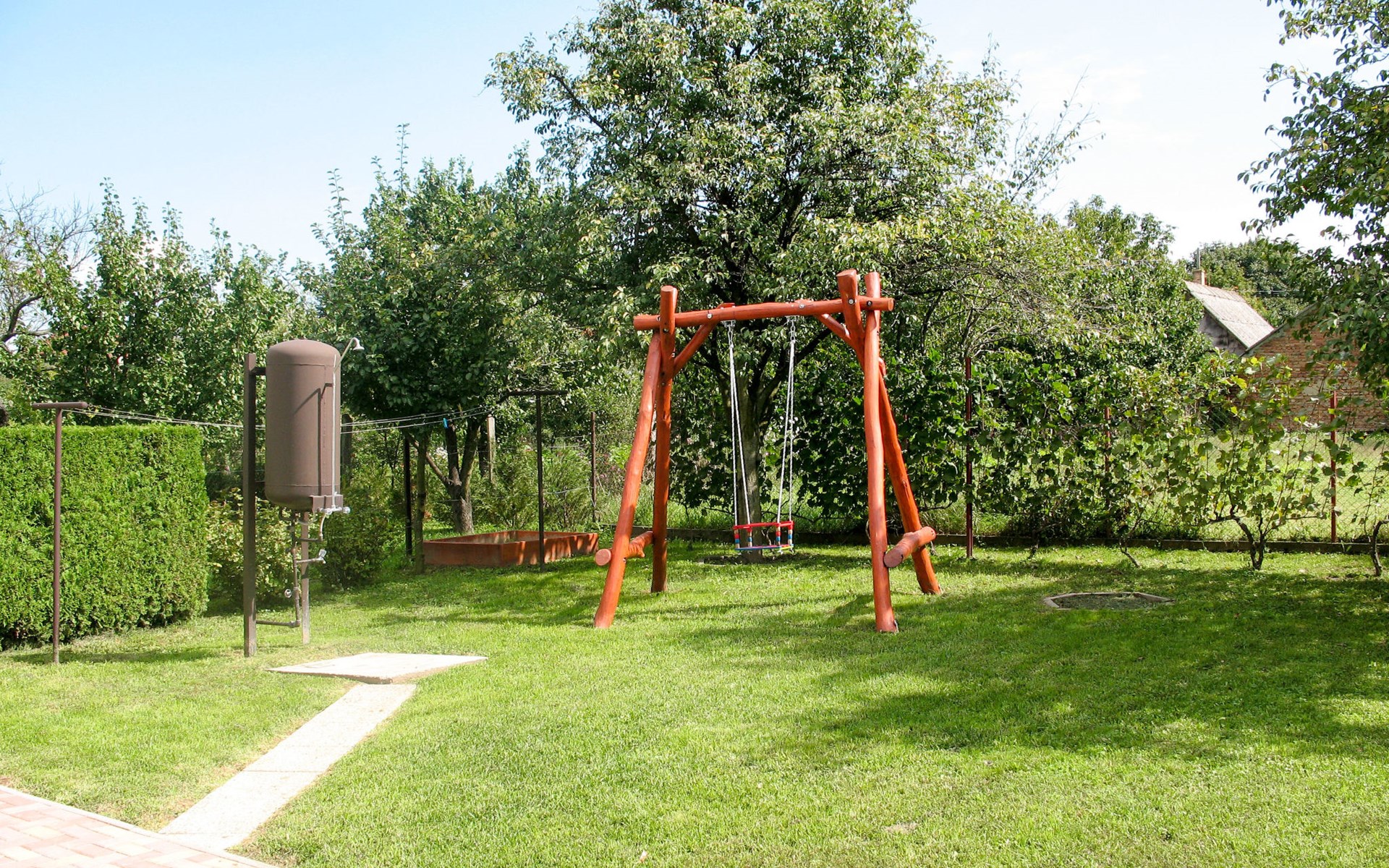 Single-family house "Sport". 700 m from the centre of Mariafürdö, on the outskirts, 15 km from the centre of Keszthely, 58 km from the centre of Siofok, in the residential district, 900 m from the lake. Private: property 800 m2 (fenced), well-kept garden with lawn and wildlife garden, swimming pool (above ground) (3 m2, depth 40 cm, seasonal availability: 15.May. - 15.Sep.). Outdoor shower, children's playground (swing, sandbox), parking (for 3 cars), single garage. Shop 400 m, supermarket 8 km, grass beach 900 m.