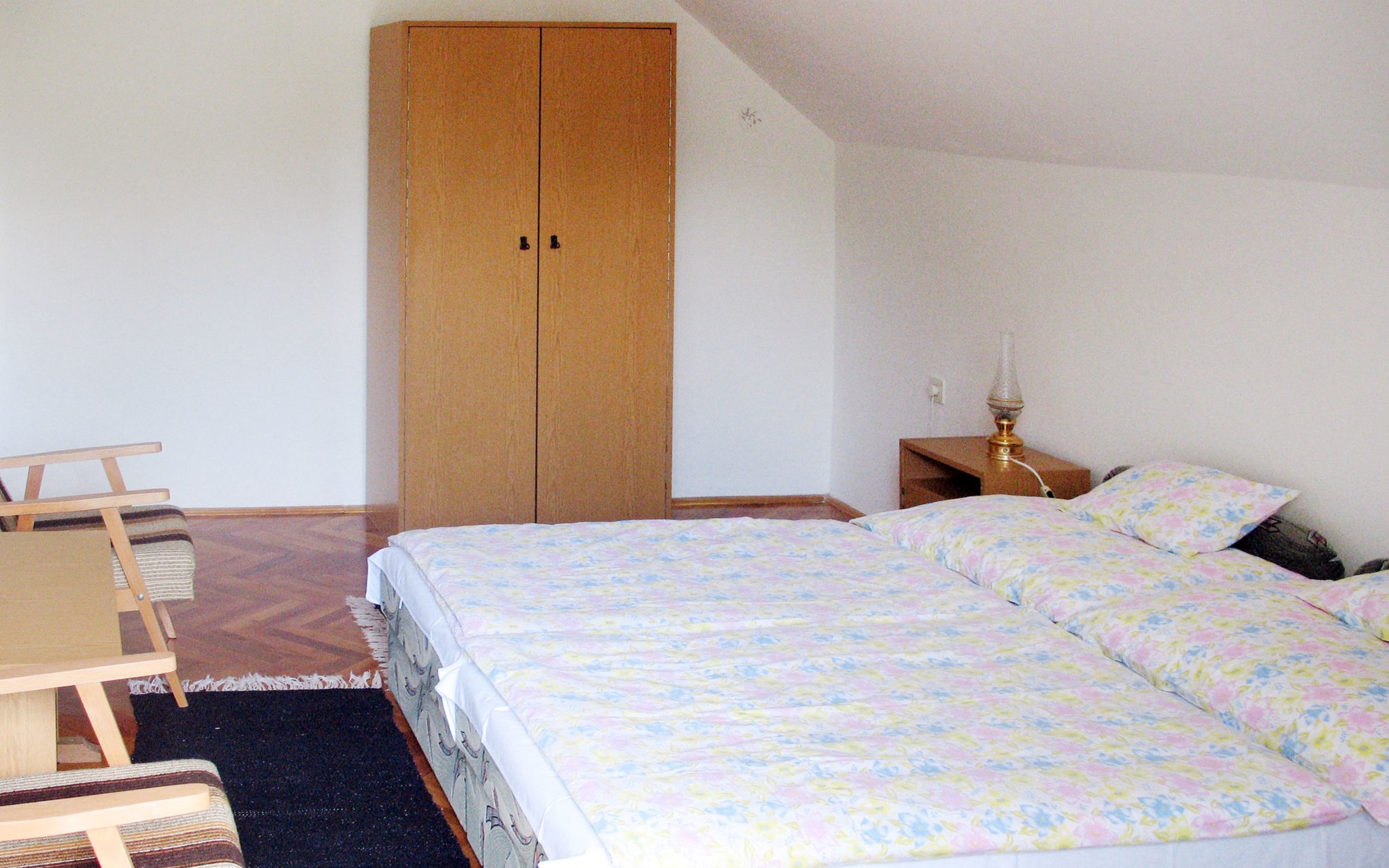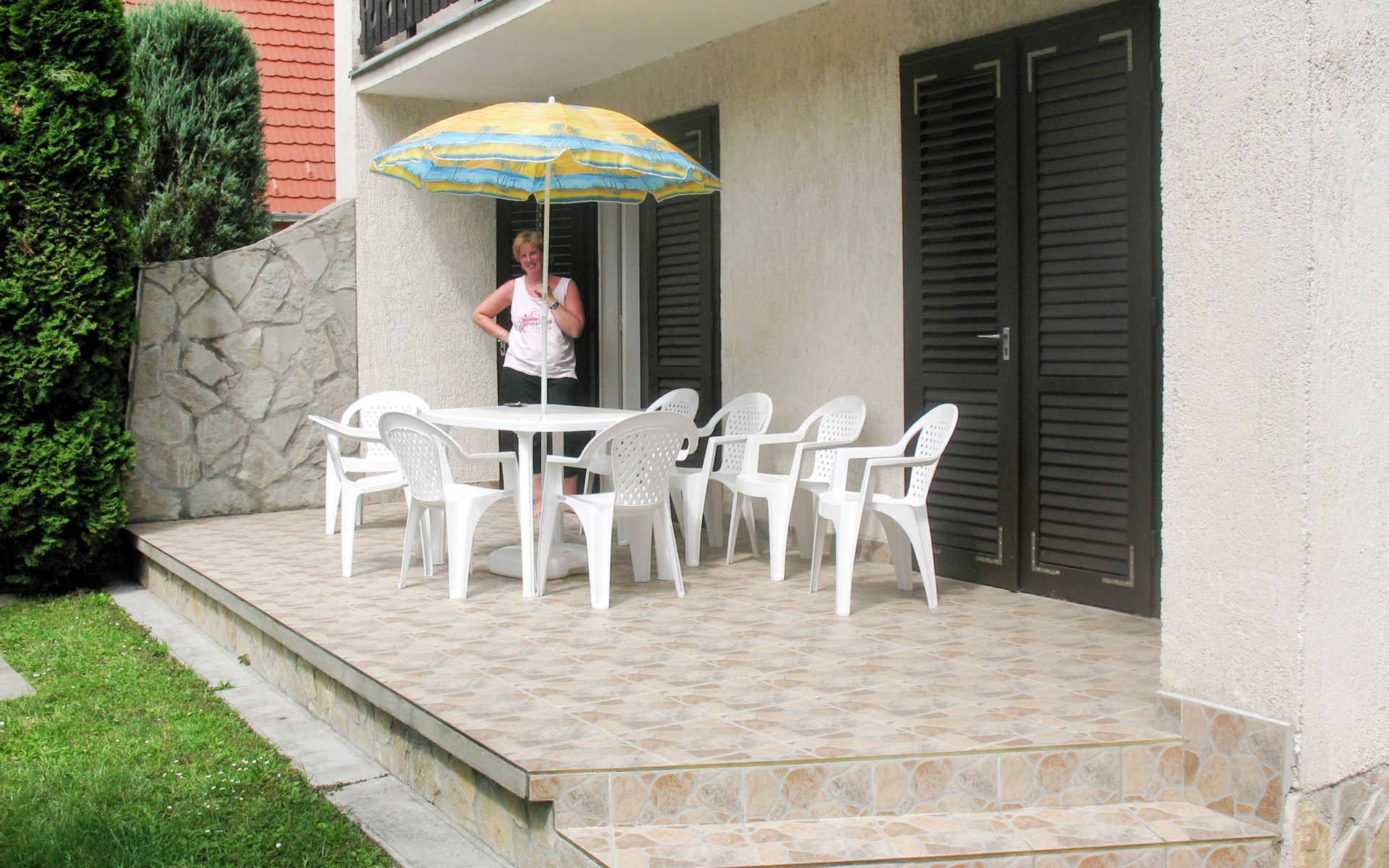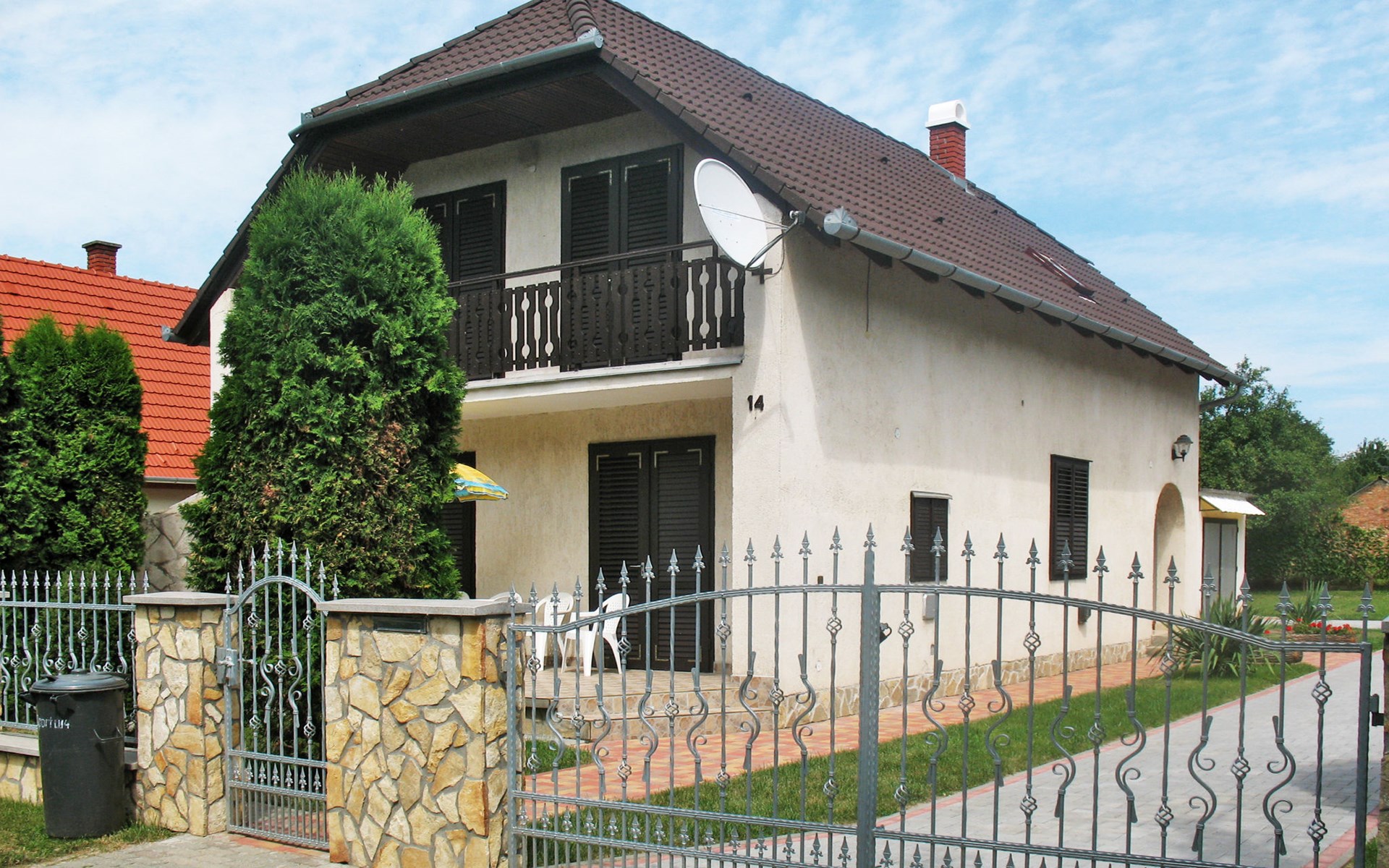 Single-family house "Sport". 700 m from the centre of Mariafürdö, on the outskirts, 15 km from the centre of Keszthely, 58 km from the centre of Siofok, in the residential district, 900 m from the lake. Private: property 800 m2 (fenced), well-kept garden with lawn and wildlife garden, swimming pool (above ground) (3 m2, depth 40 cm, seasonal availability: 15.May. - 15.Sep.). Outdoor shower, children's playground (swing, sandbox), parking (for 3 cars), single garage. Shop 400 m, supermarket 8 km, grass beach 900 m.