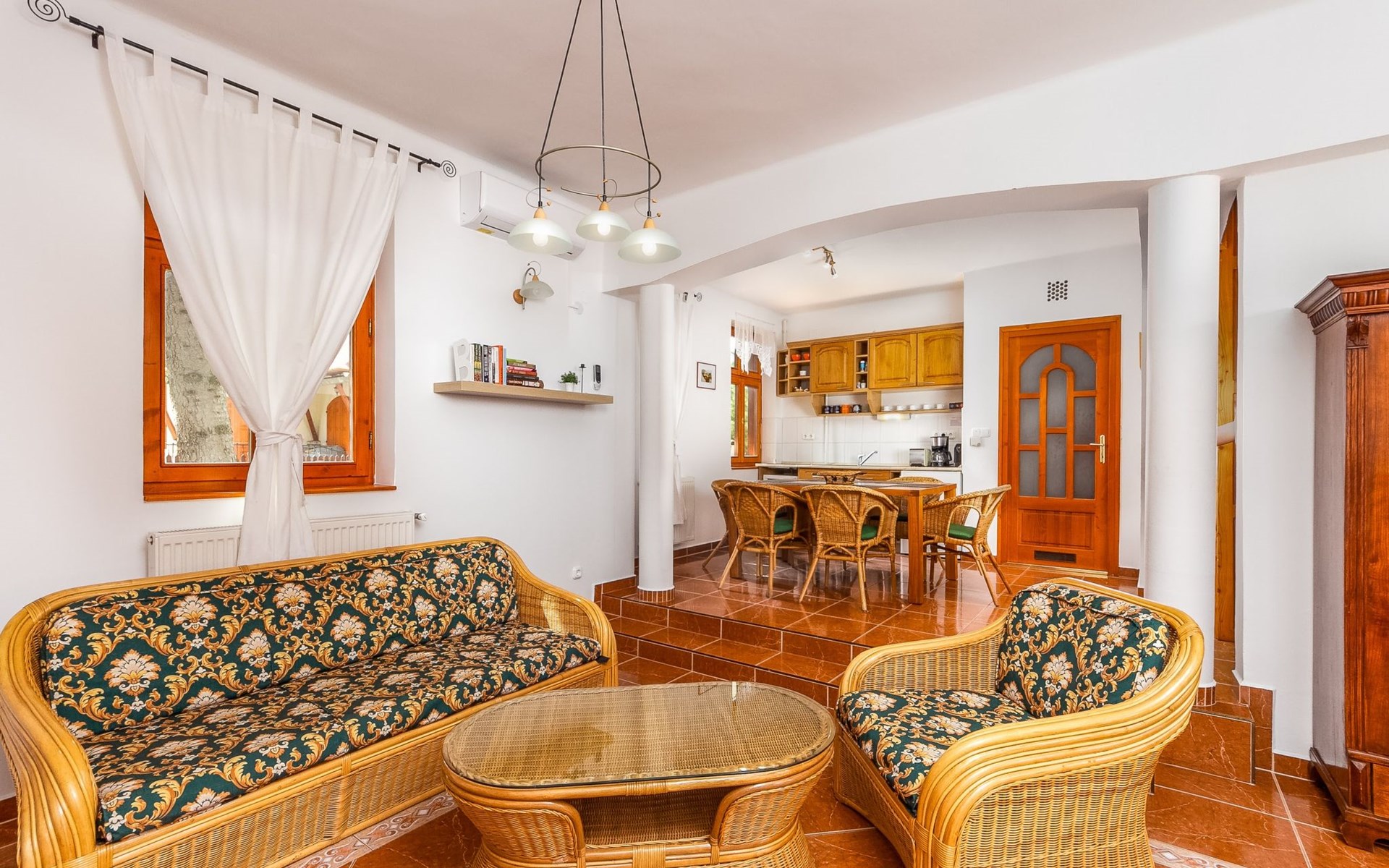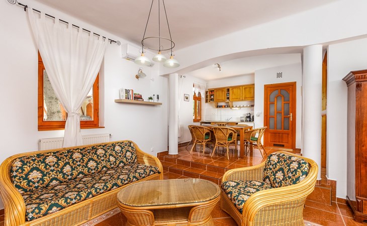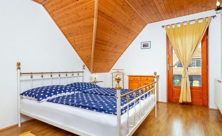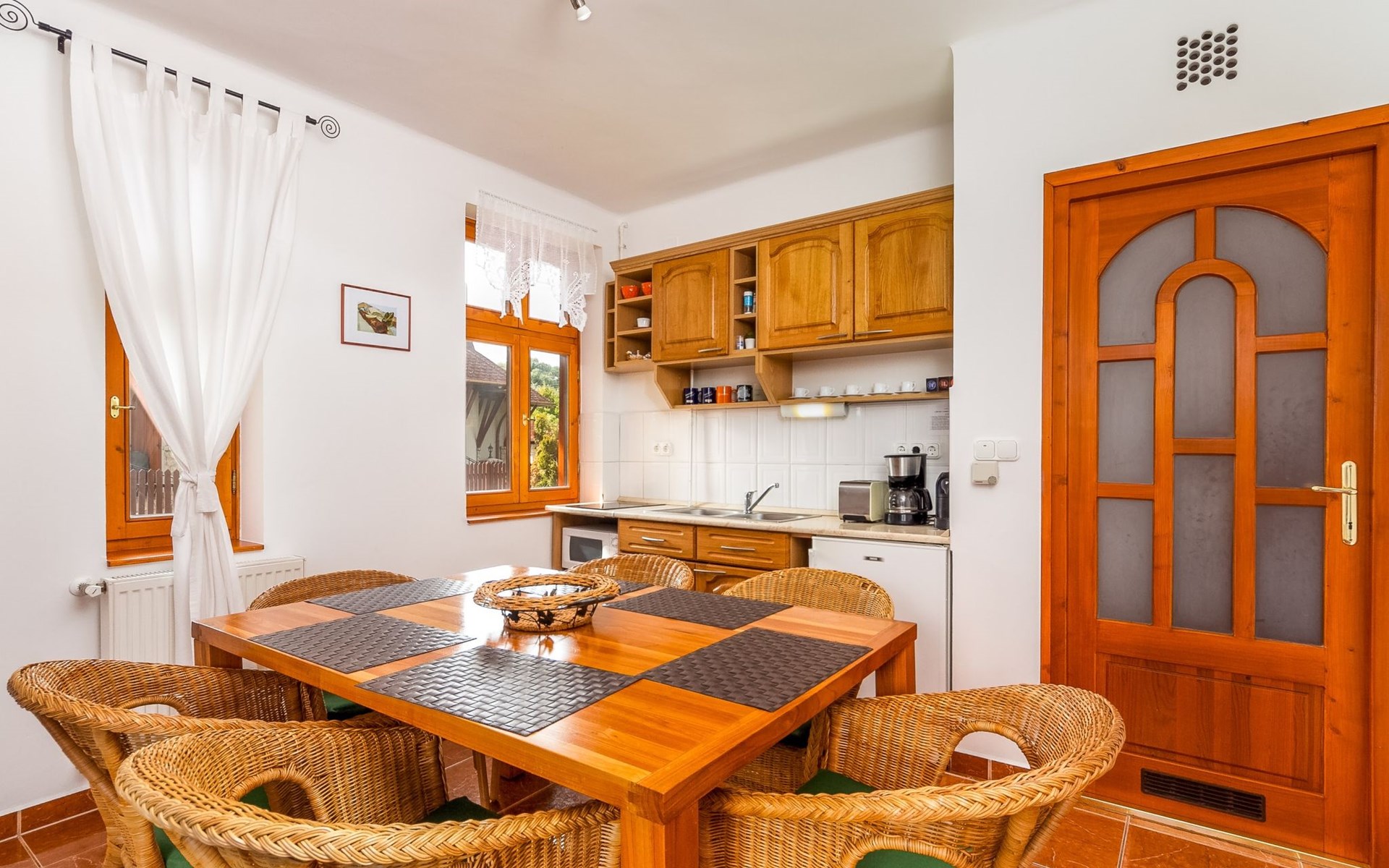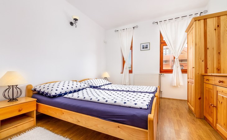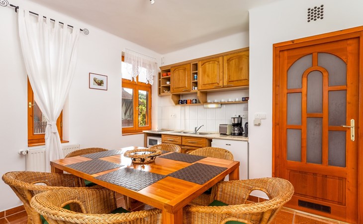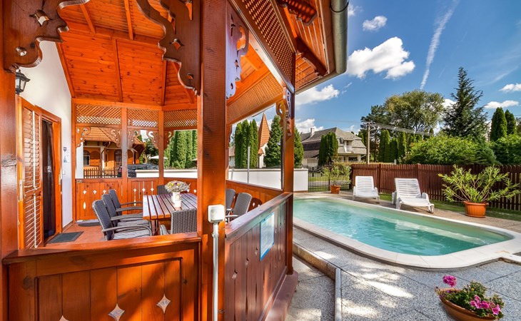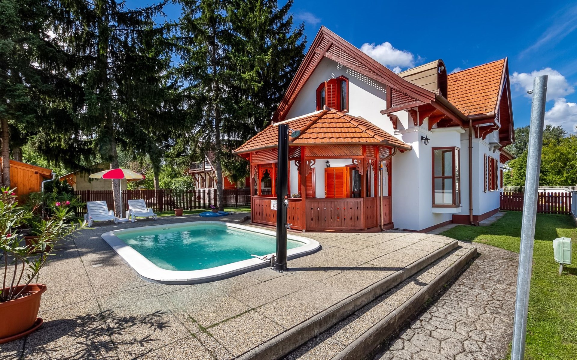 Balatonberény: Beautiful, cosy semi-detached house "Ruby 1", built in 1999, renovated in 2005. On the outskirts, 250 m from the lake. Private: well-kept garden 200 m2 (fenced), lawn for sunbathing, swimming pool angular (12 m2, depth 90 cm, seasonal availability: 15.May. and 15.Sep.) with internal staircase. Outdoor shower. In the house: WiFi, air conditioning. Available: bicycles (2). Grocery, restaurant 300 m, outdoor swimming pool 250 m, public bathing area 1.2 km. Please note: fishing [permit required].
