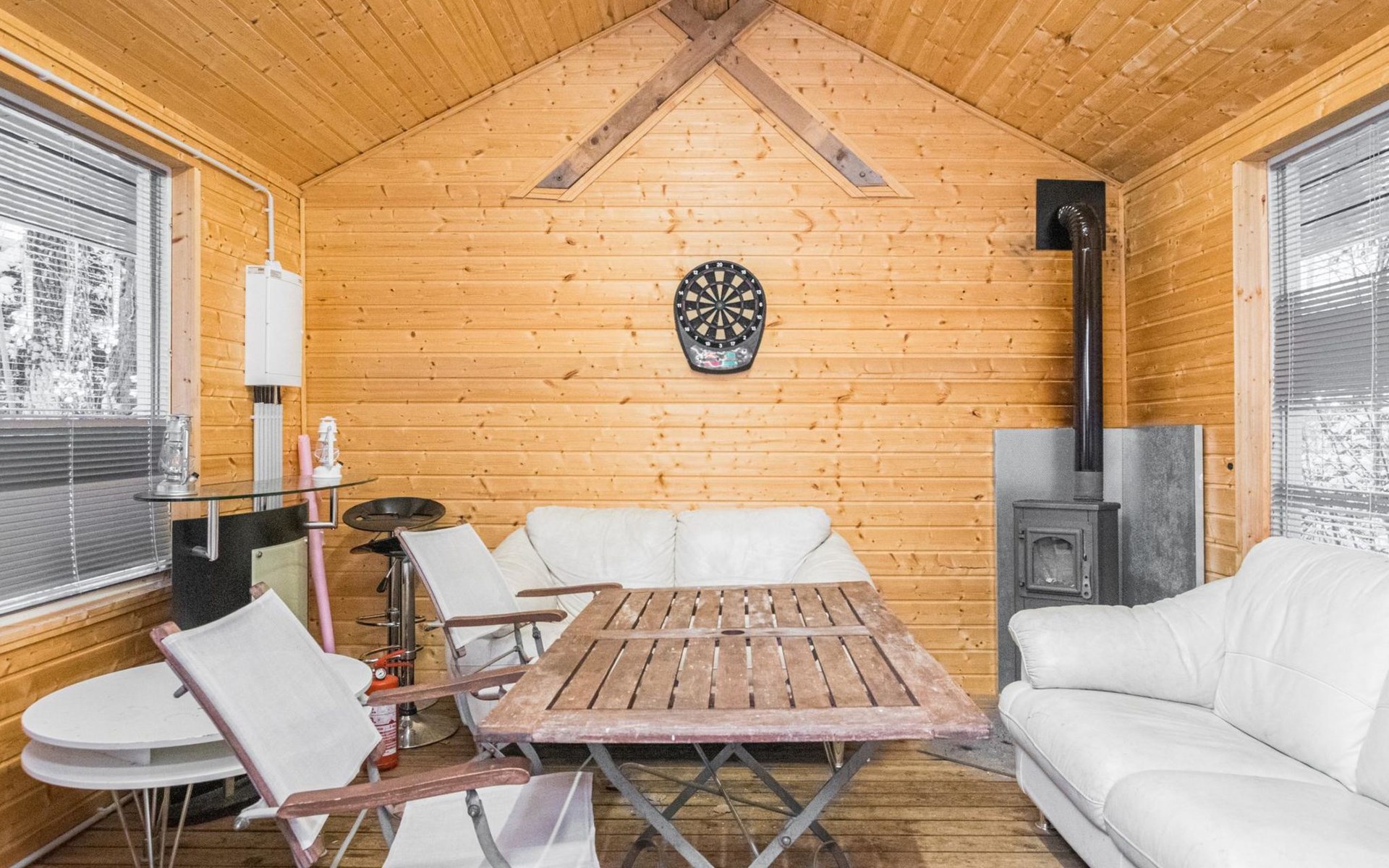 In the yard, there is a wood-burning sauna next to the grill area, and a covered seating area.
