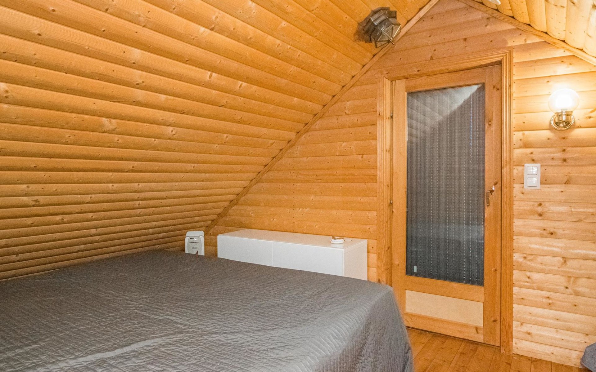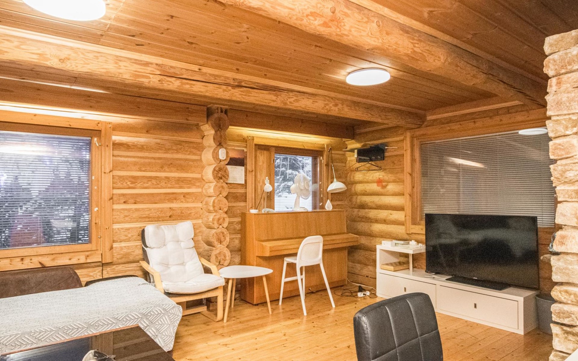 Round log cabin 1991, bathroom facilities renovated in 2014. The cabin features an open-plan kitchen-living room on the ground floor, a glazed terrace, a bathroom with a WC and a shower, hydro massage bath (freely available), as well as an electric sauna.