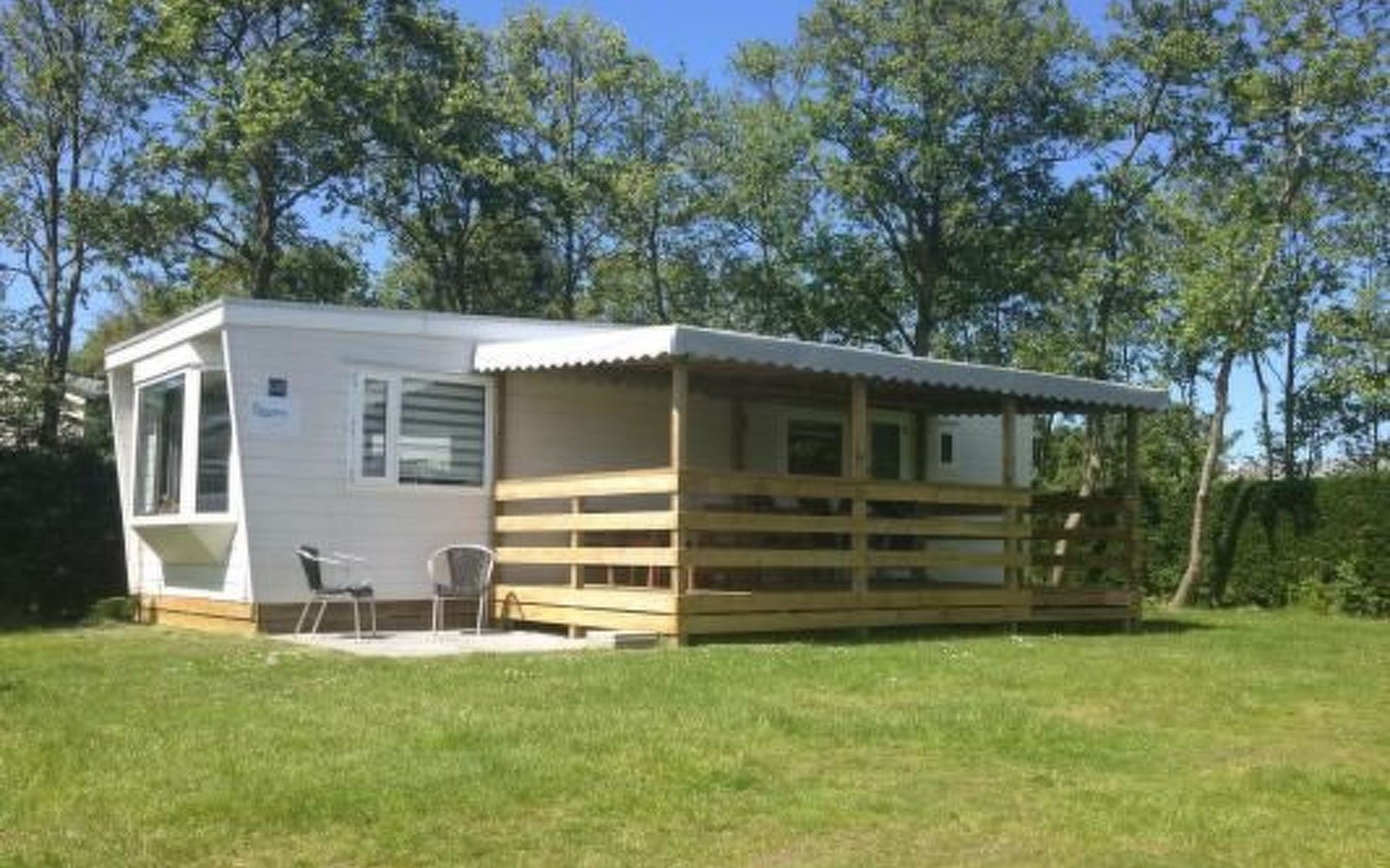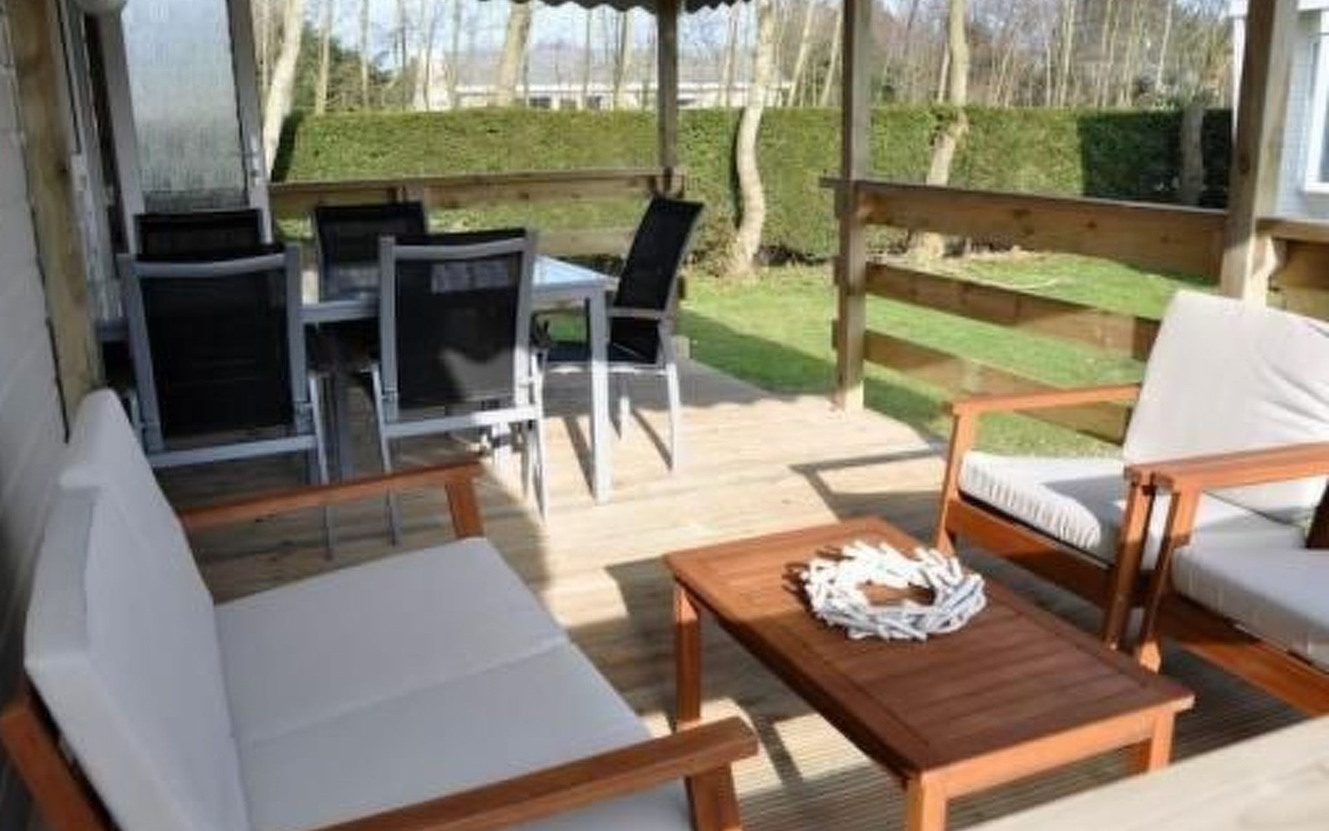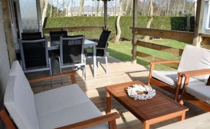 The large roofed veranda has a cosy sitting corner and a dining table. You can park right by the chalet on the plot.