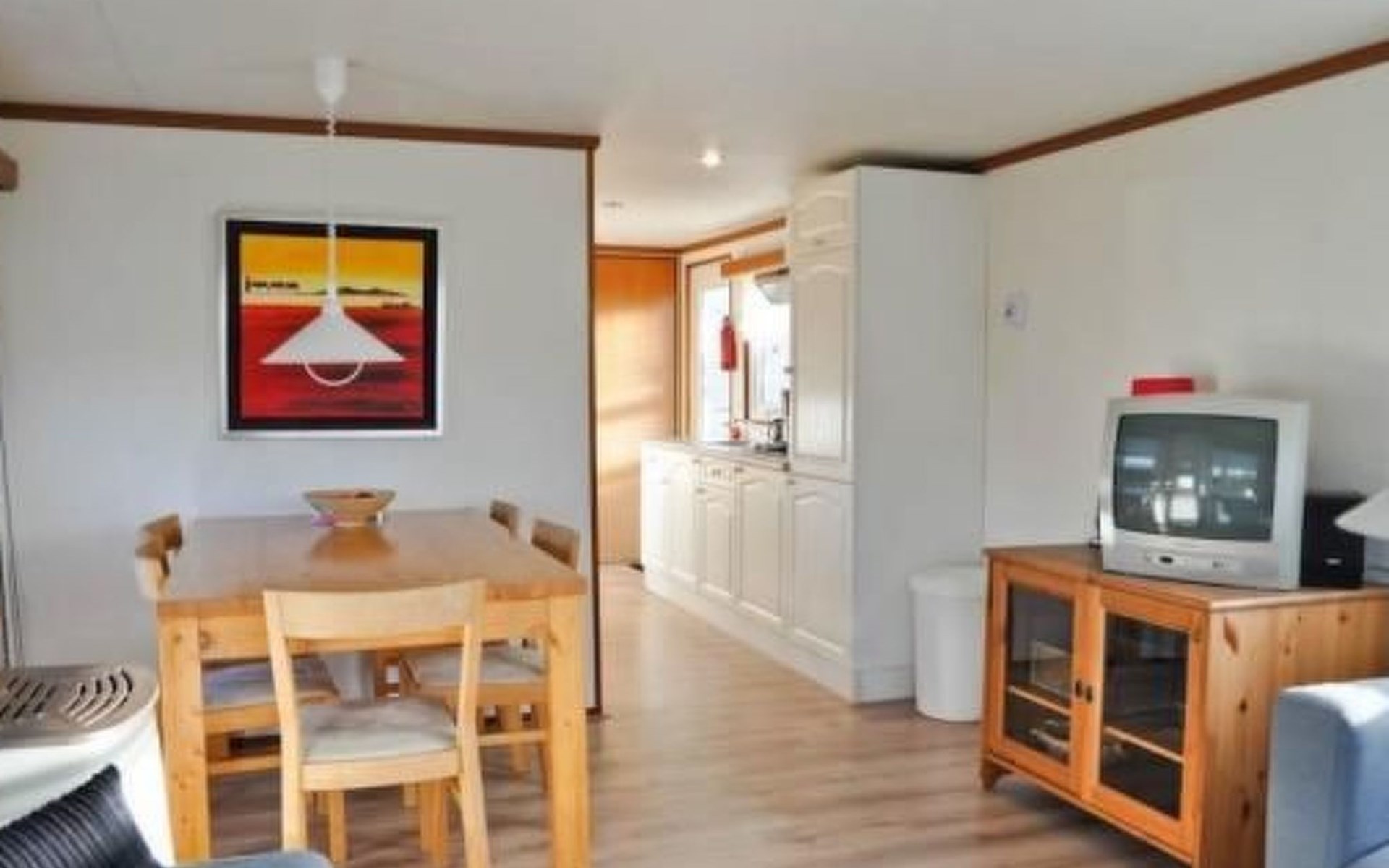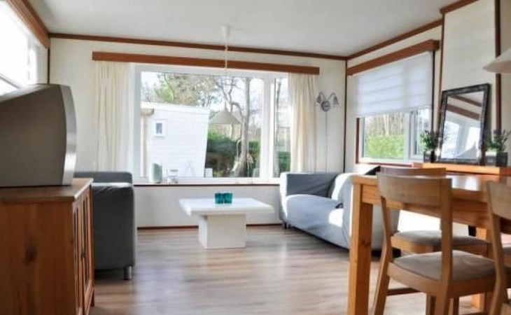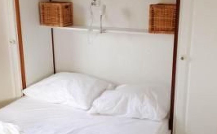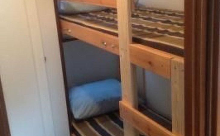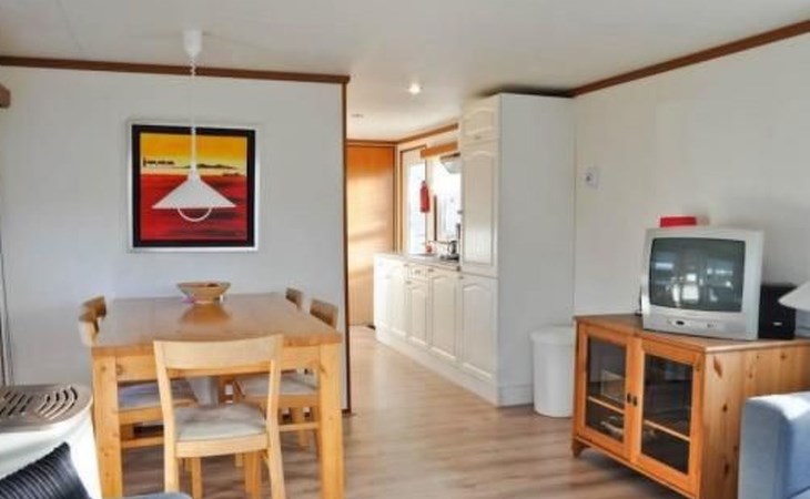 The chalet has two bedrooms, a living and dining room with an open kitchen and a bathroom. The cosy living room includes a sitting corner, cable TV and a dining table with five chairs. The kitchen is equipped with a fridge, kettle, gas stove and coffee machine. The bathroom has a shower, toilet and washbasin. One bedroom is furnished with a double bed (140 x 200cm), the second with a bunk bed (each 70 x 200cm).