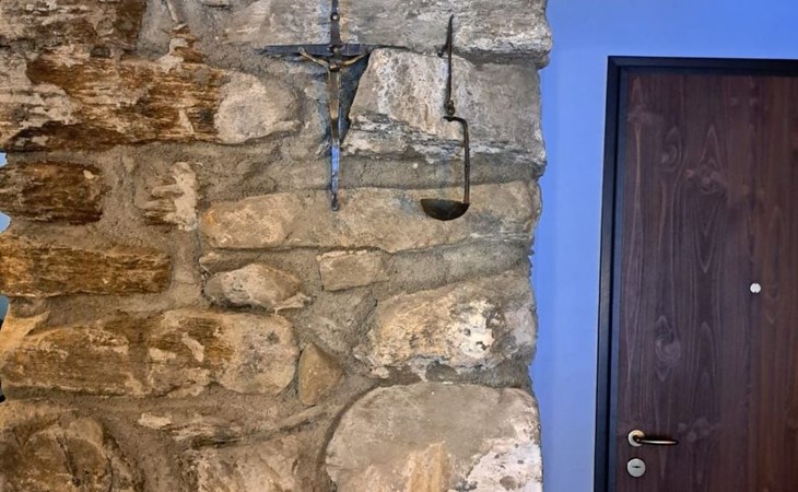 The interior of the accommodation, situated on two levels, connected by a spiral staircase, is furnished with care, using antique furniture and pieces in the Valdostan style