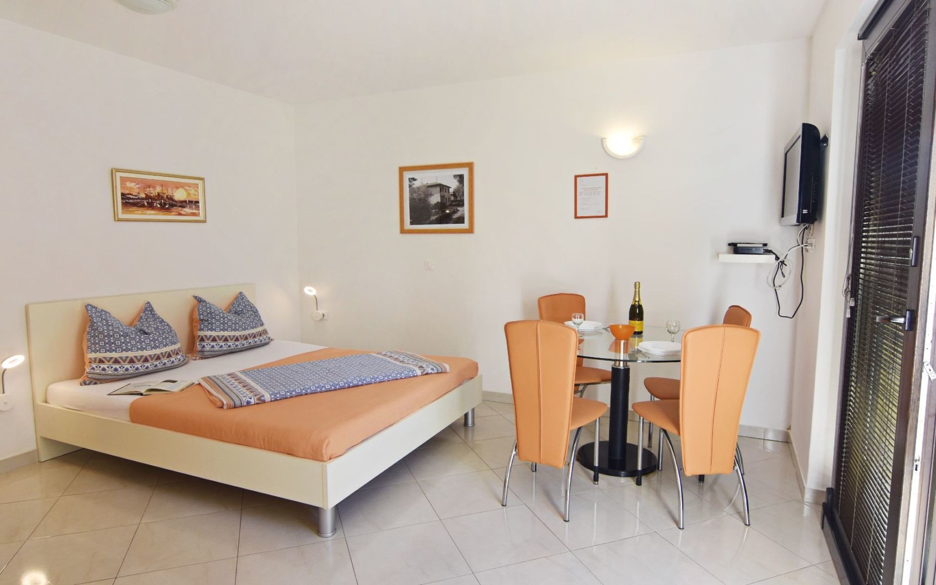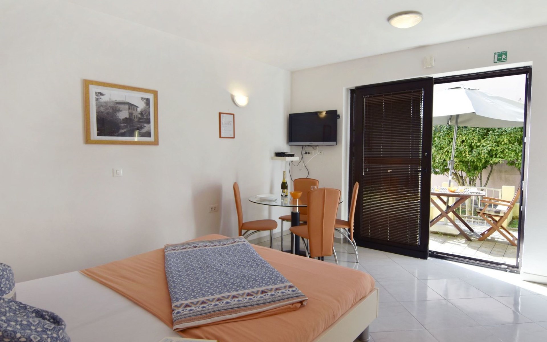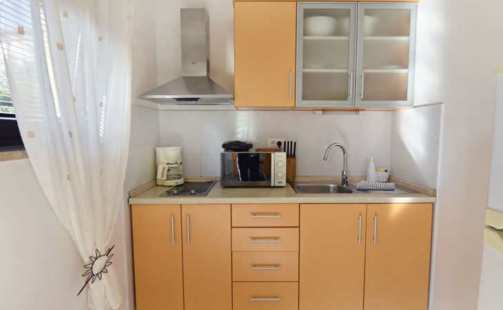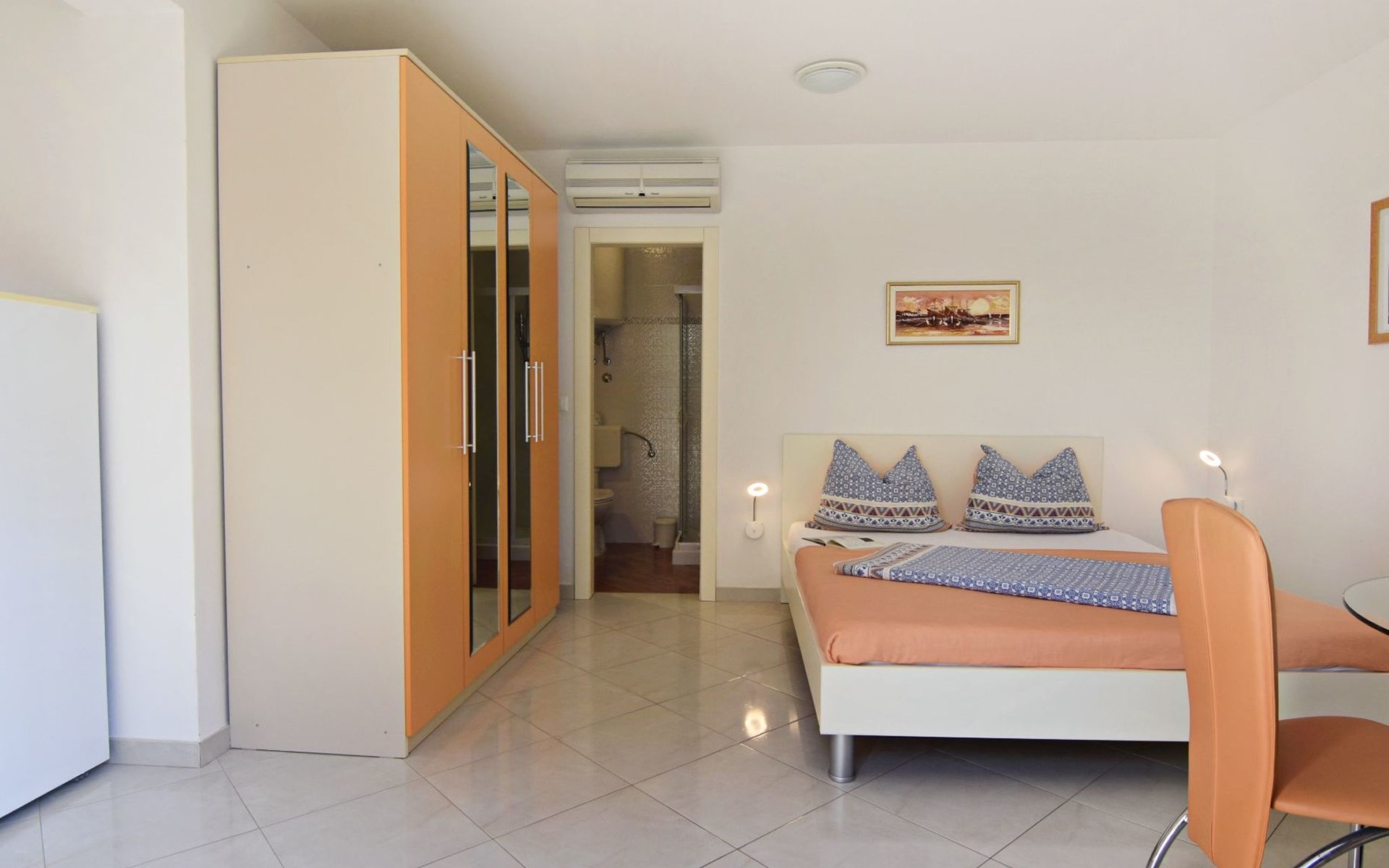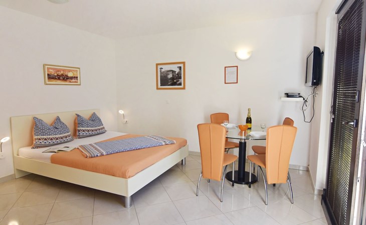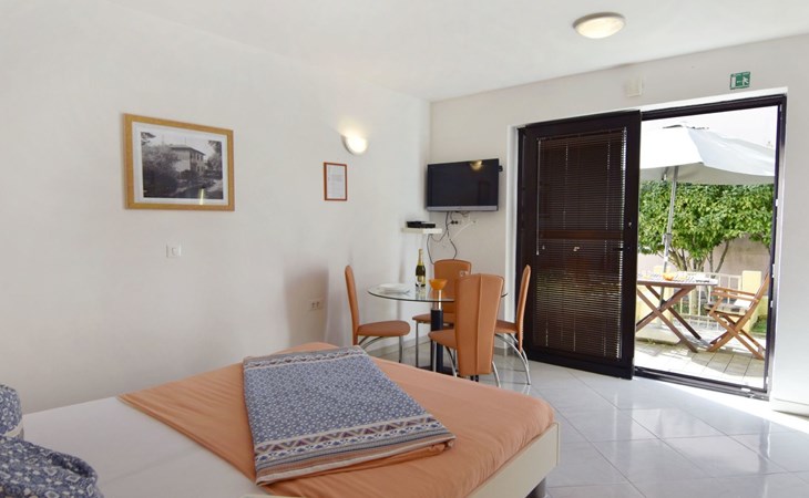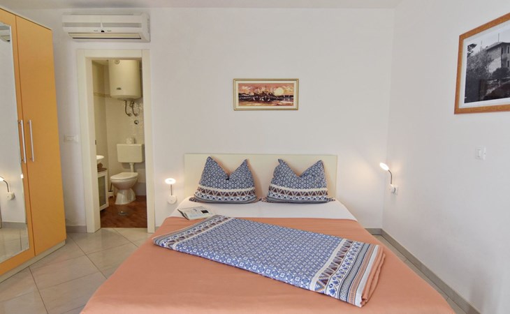 In Villa Alpa you will find the modern and lovingly designed interior of our studio flat Alpa 3 on the ground floor. Equipped with a comfortable double bed, a fully functional kitchenette with microwave, fridge and electric cooker as well as a stylish bathroom, the flat is an oasis of peace. For your comfort, the bed linen is changed weekly and the living area offers amenities such as a flat-screen satellite TV, air conditioning and free Wi-Fi. A door leads from the living area to the private terrace overlooking the green garden.