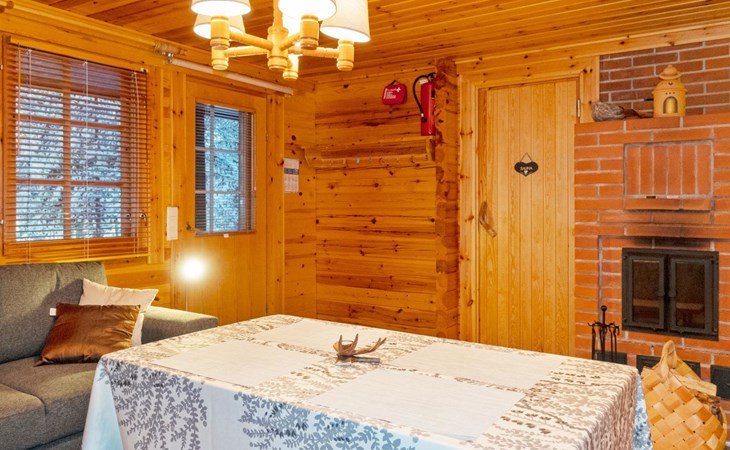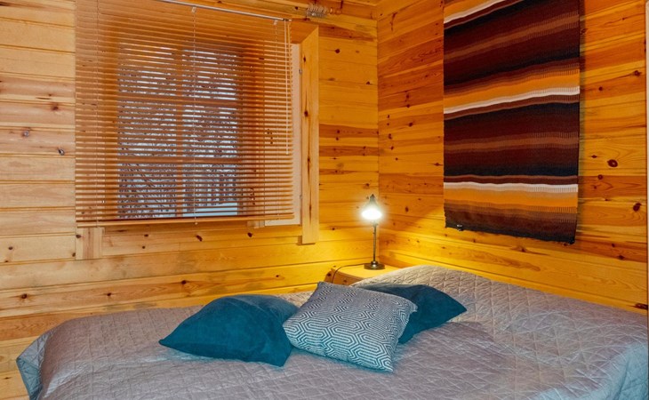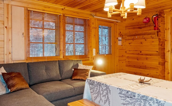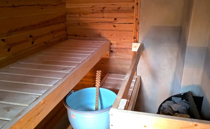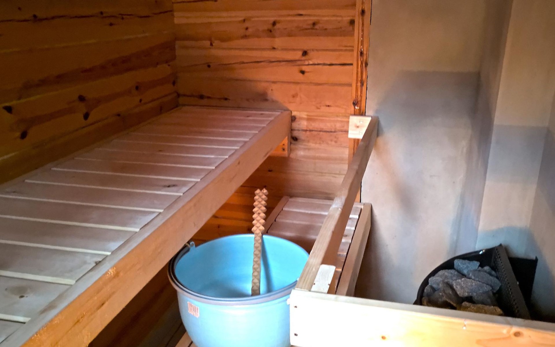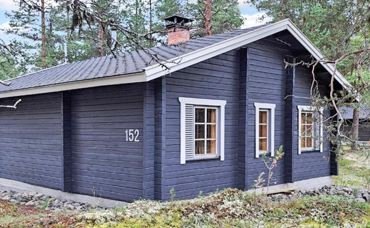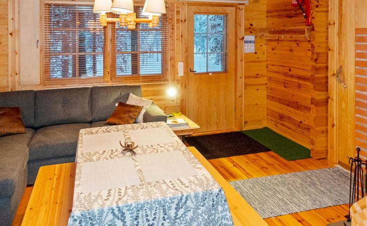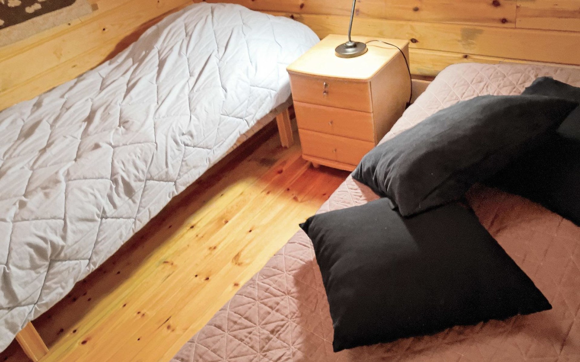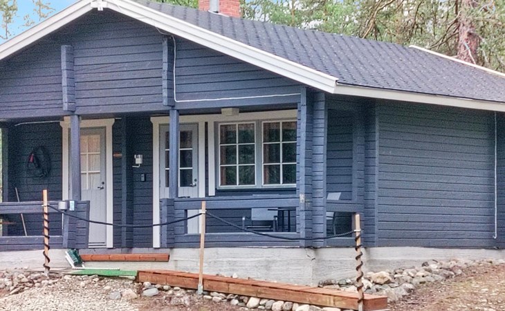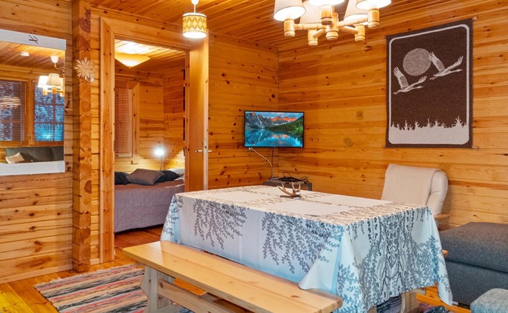 Planed log cabin, built in 1993. Living room with sofa bed, kitchenette, two bedrooms, each with two beds. The beds can be placed side by side or separately. When placed separately, there is space for bedside table (distance between the beds is 80 cm). Sauna, washroom/WC, covered terrace and small storage.