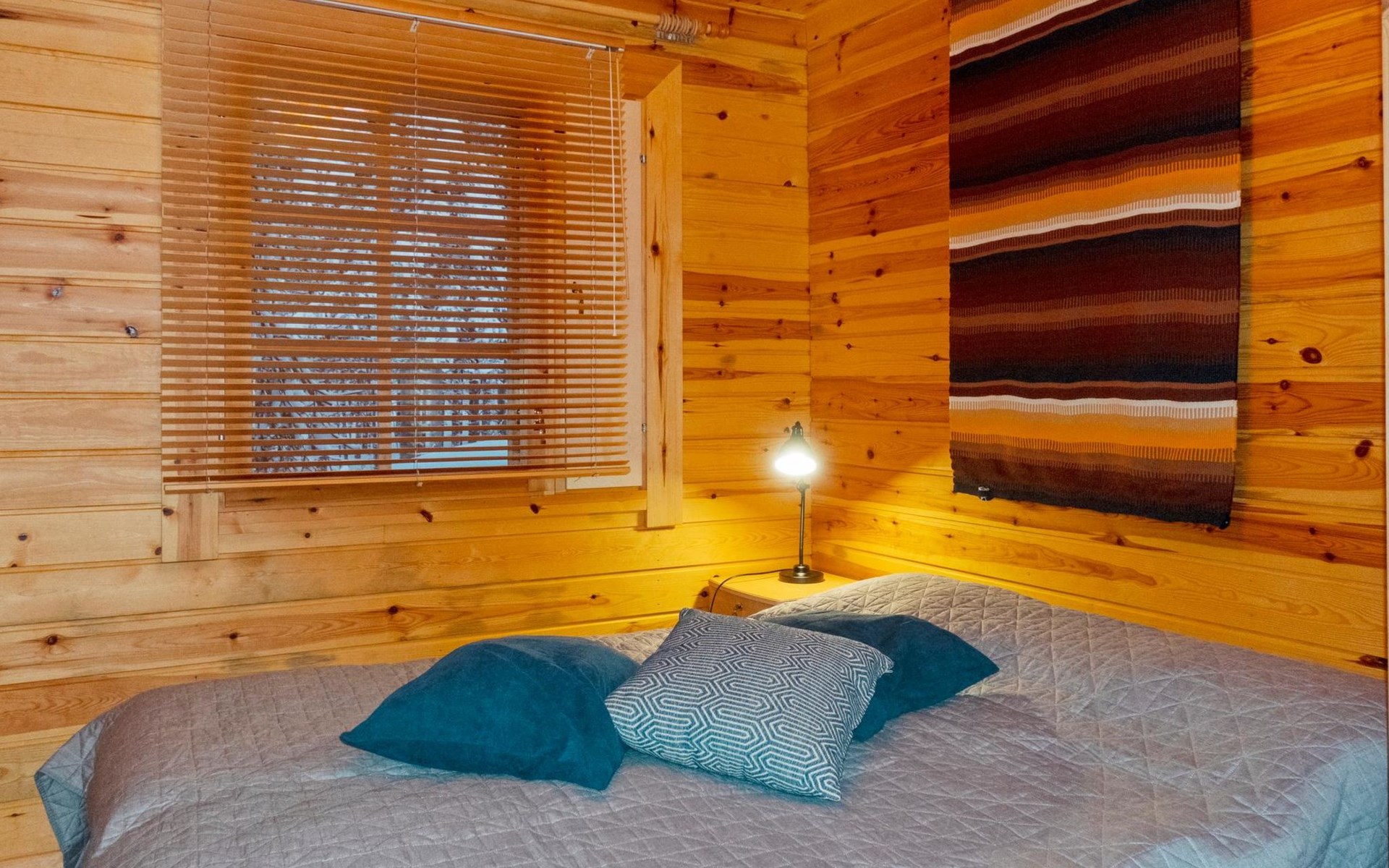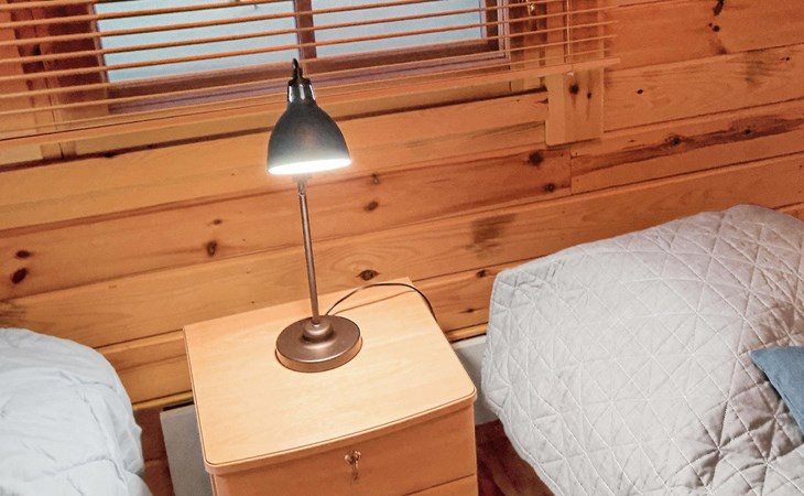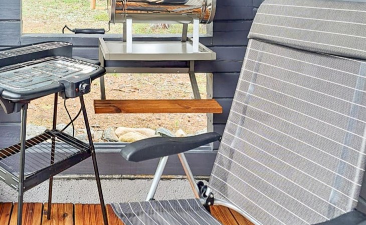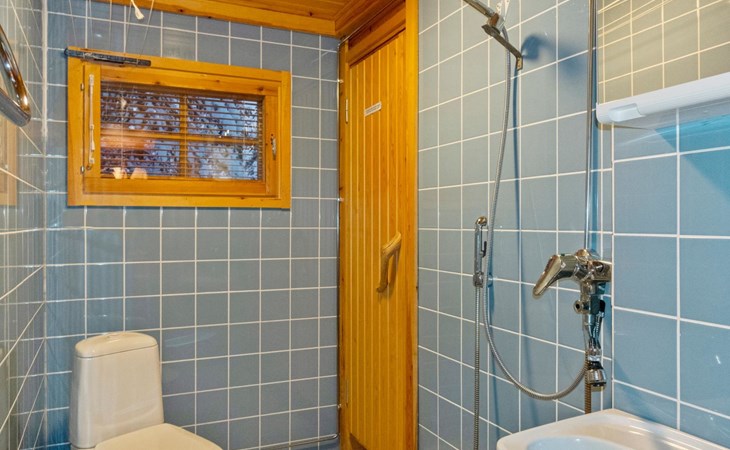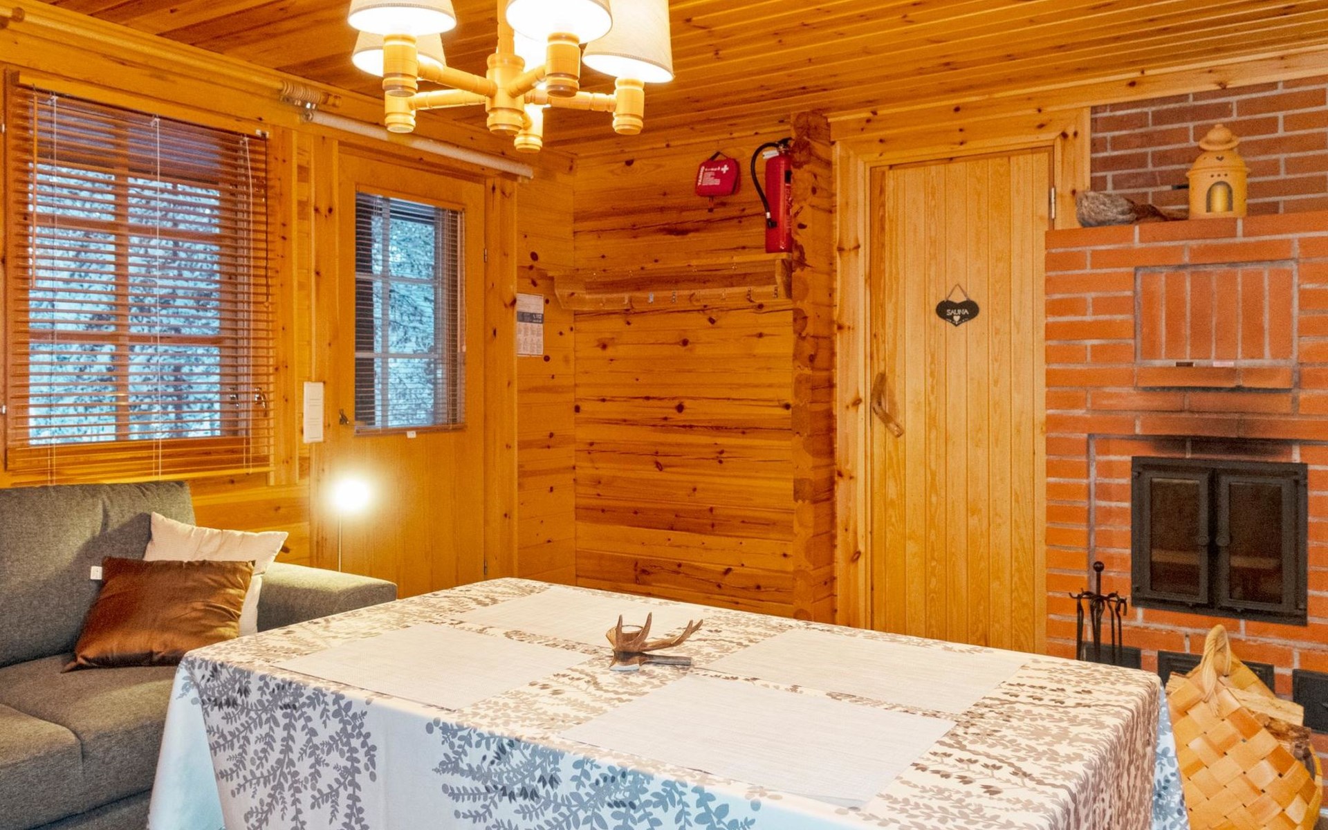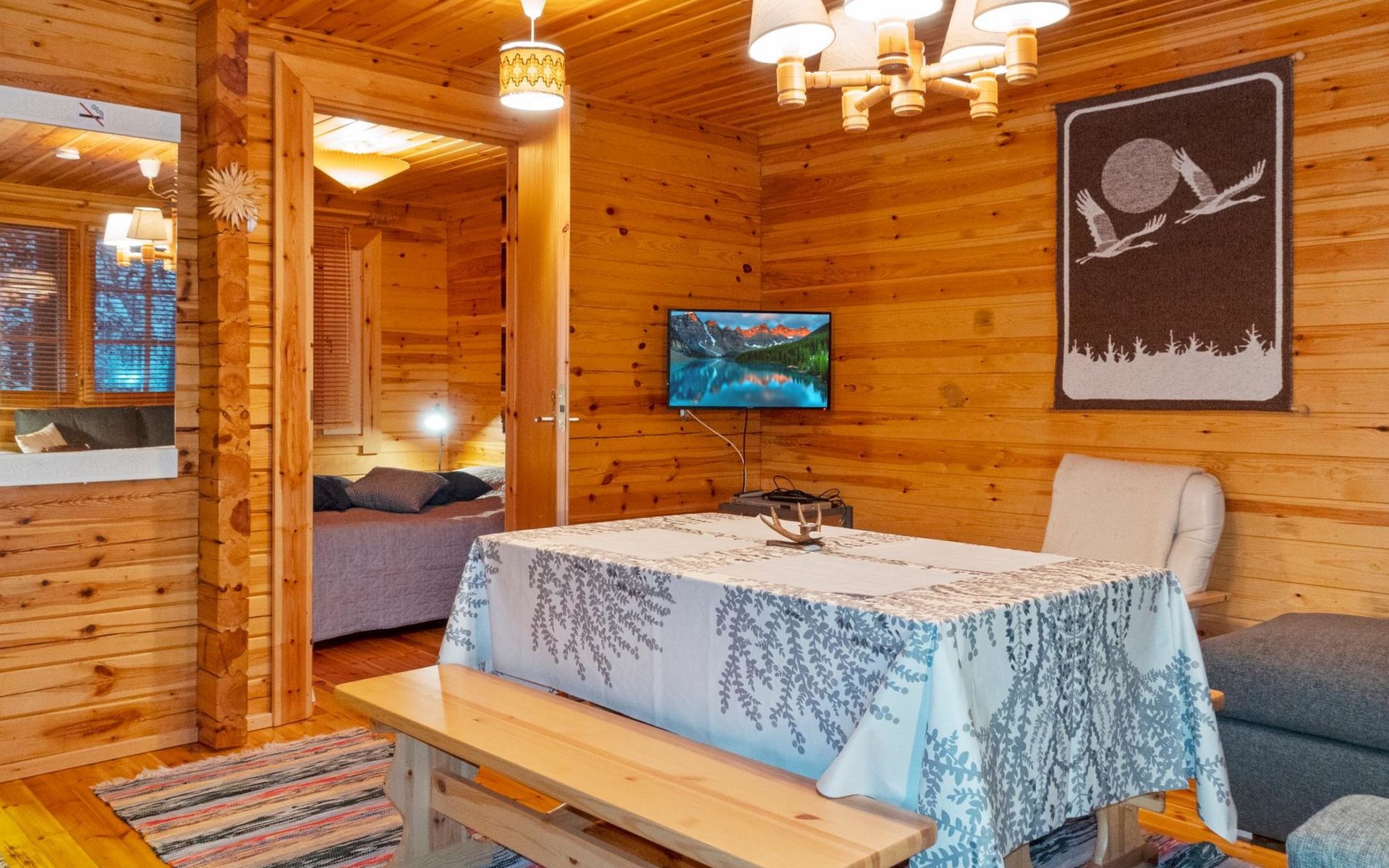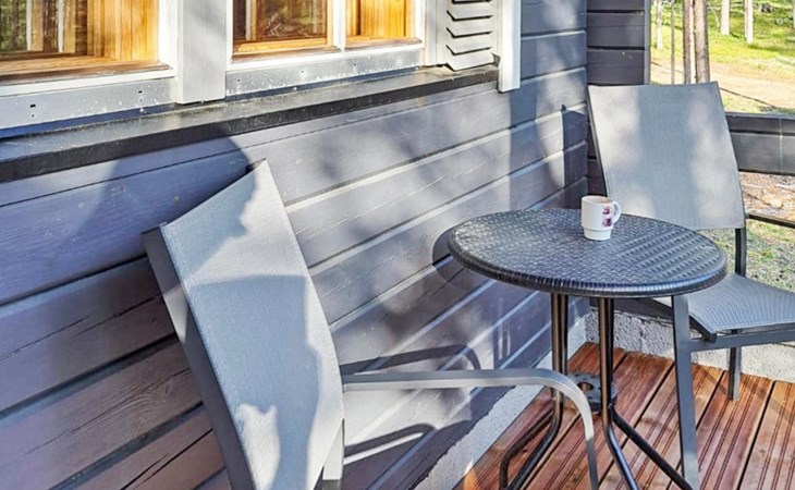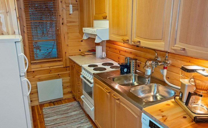 Planed log cabin, built in 1993. Living room with sofa bed, kitchenette, two bedrooms, each with two beds. The beds can be placed side by side or separately. When placed separately, there is space for bedside table (distance between the beds is 80 cm). Sauna, washroom/WC, covered terrace and small storage.