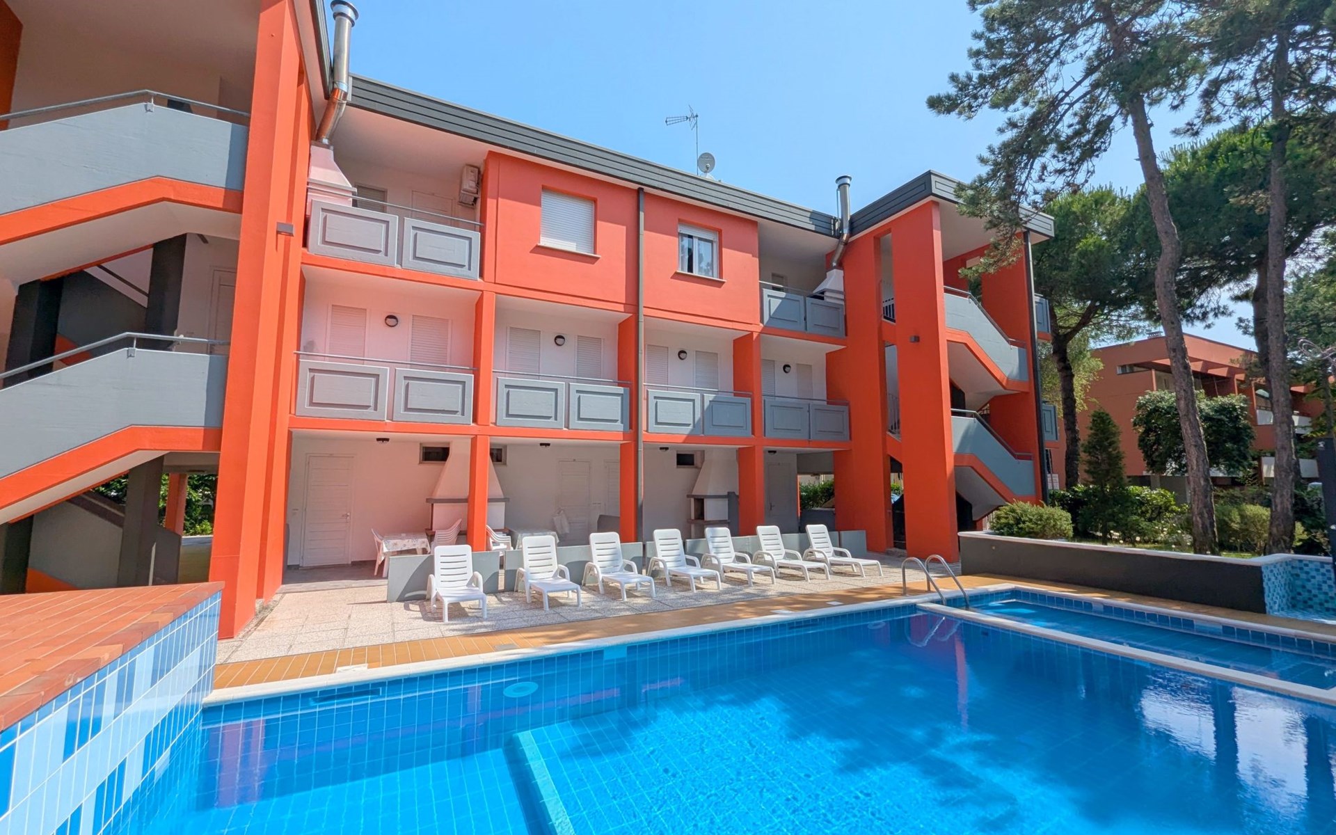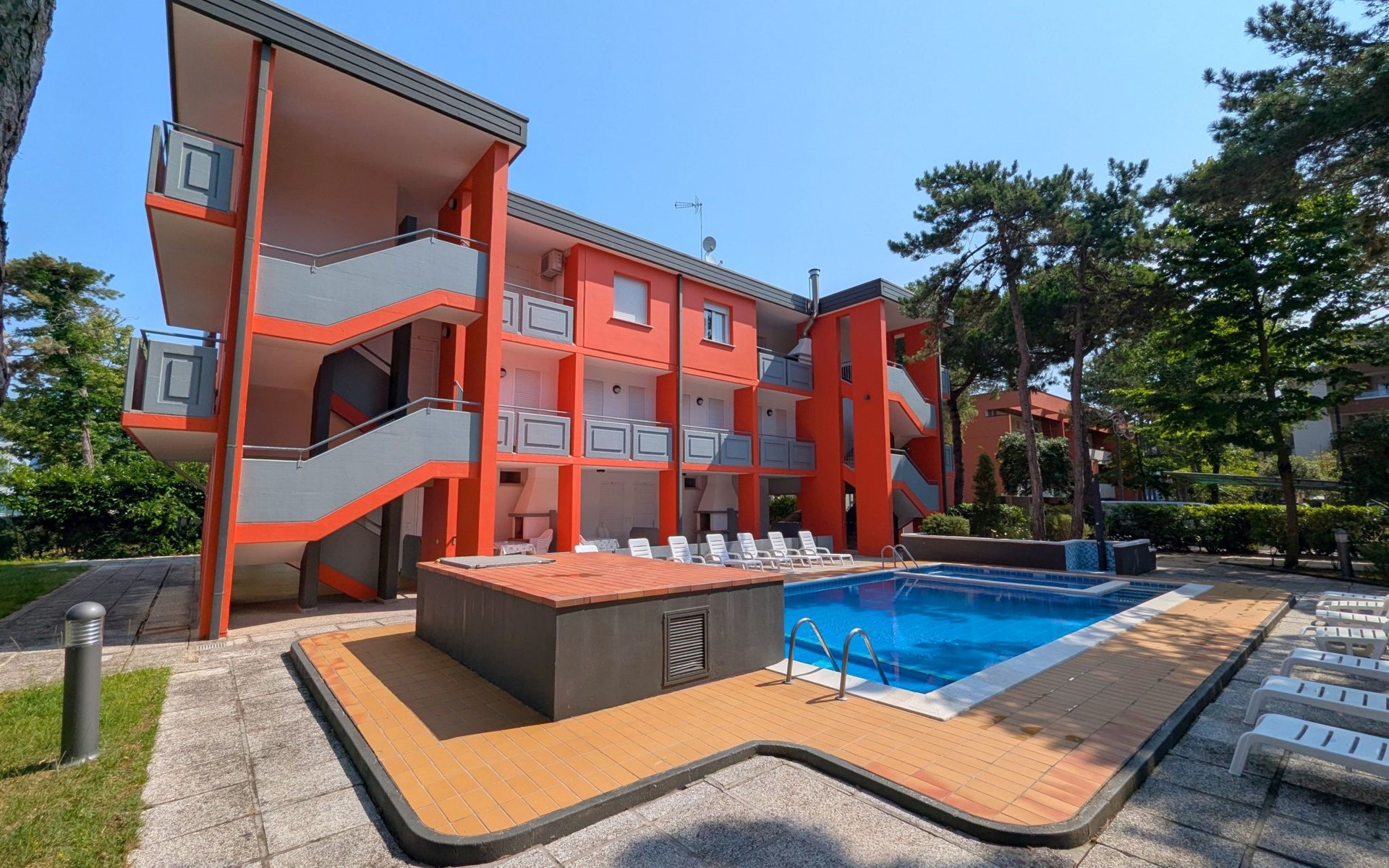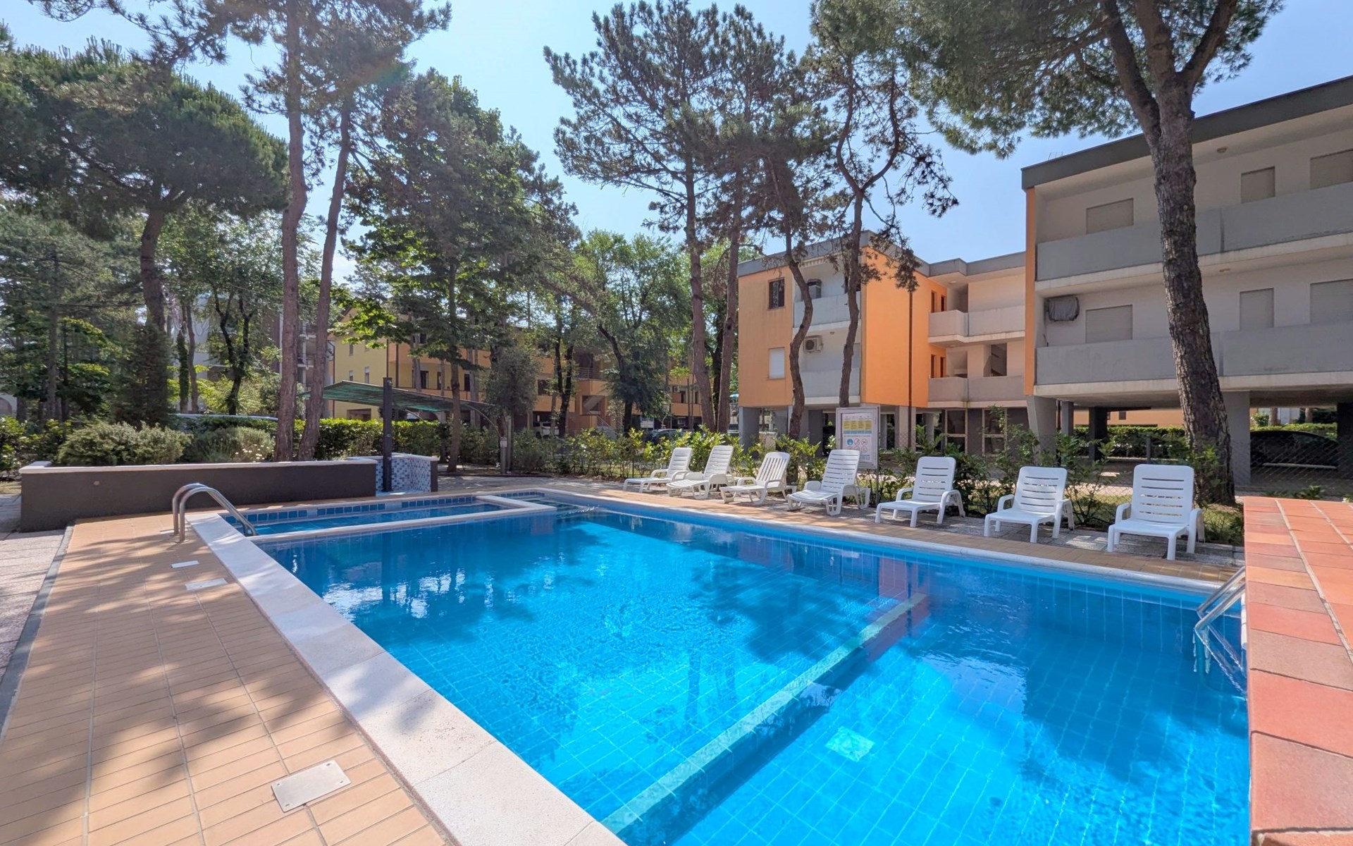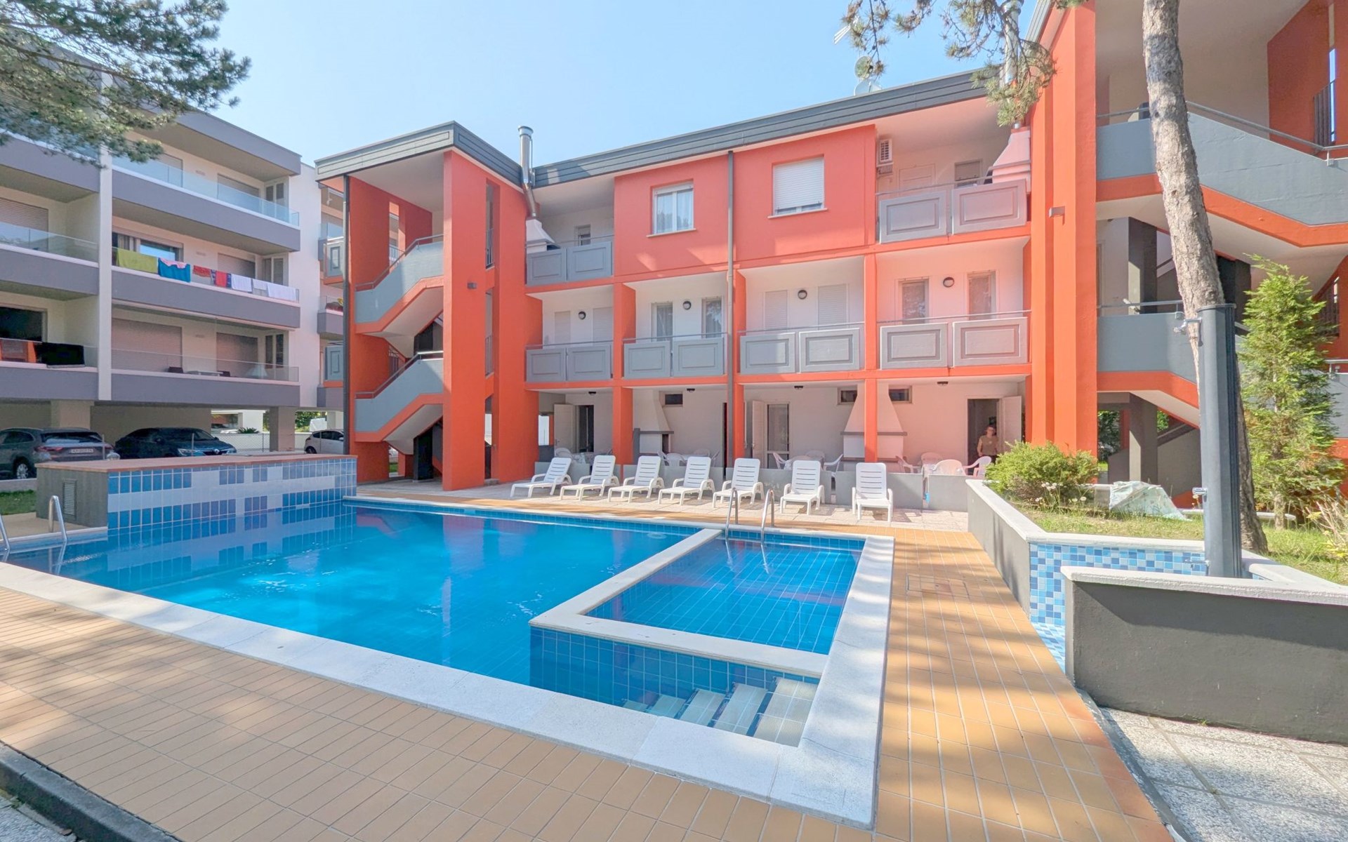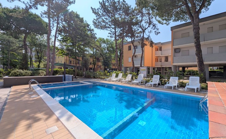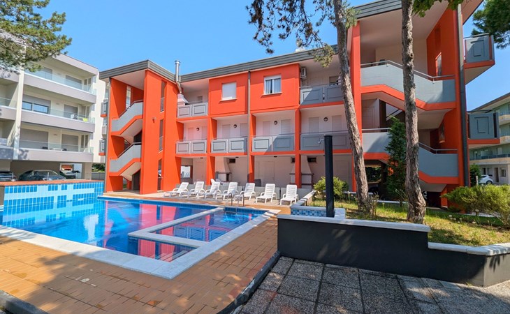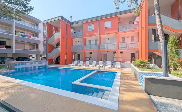 Bibione: Modern apartment block "Villa Luca", 3 storeys. 8 apartments in the residence. In the district of Bibione-Spiaggia, in the resort 150 m from the centre of Bibione, 13 km from the centre of Lignano, 100 km from the centre of Venezia, 500 m from the sea, 500 m from the beach. For shared use: natural state property (fenced) with trees, swimming pool (50 m2, seasonal availability: 15.May. - 27.Sep.). Children's pool. Shop 200 m, grocery 350 m, supermarket 550 m, restaurant 350 m, pedestrian zone 300 m, bus stop 150 m, railway station "Latisana (Venezia-Trieste)" 21 km, sandy beach 450 m, thermal baths "Bibione Thermae" 1.2 km. Golf course (18 hole) 8 km. Nearby attractions: Oasi Naturalistica Val Grande - Bibione, Trieste 100 km. The owner does not accept any groups. The photo is just an example. Beach service: During summer season 1 parasol and 2 deck-chairs per apartment included in the price.