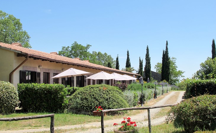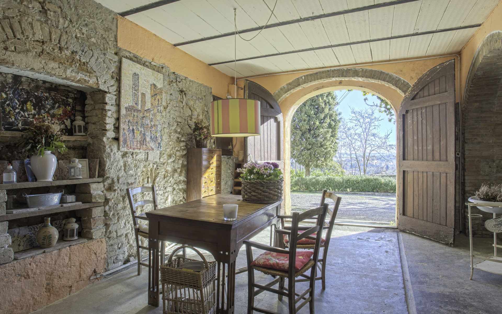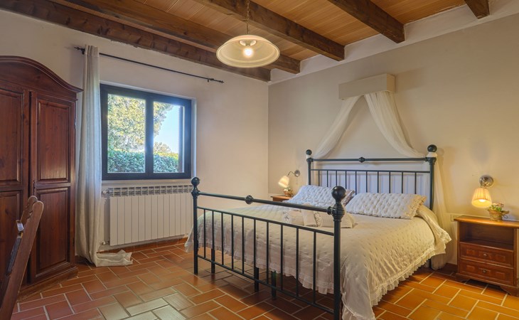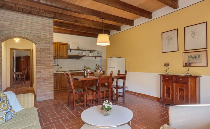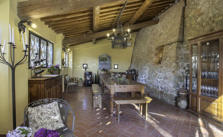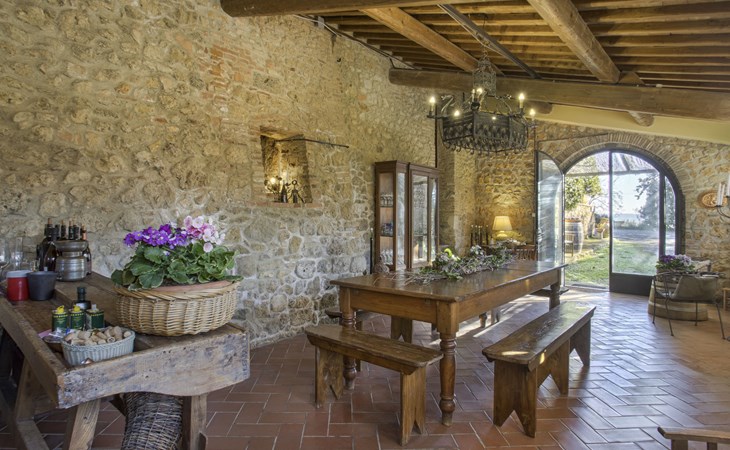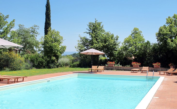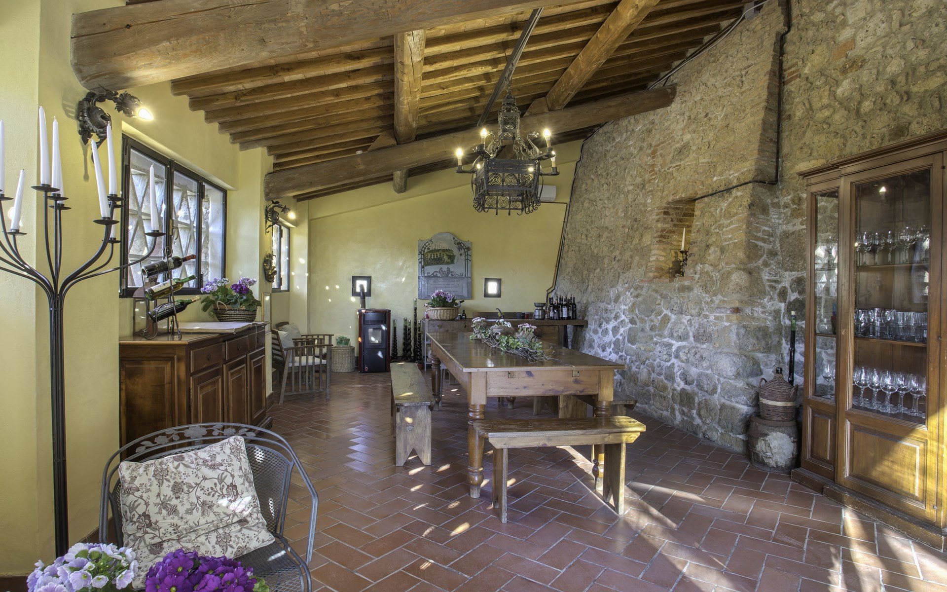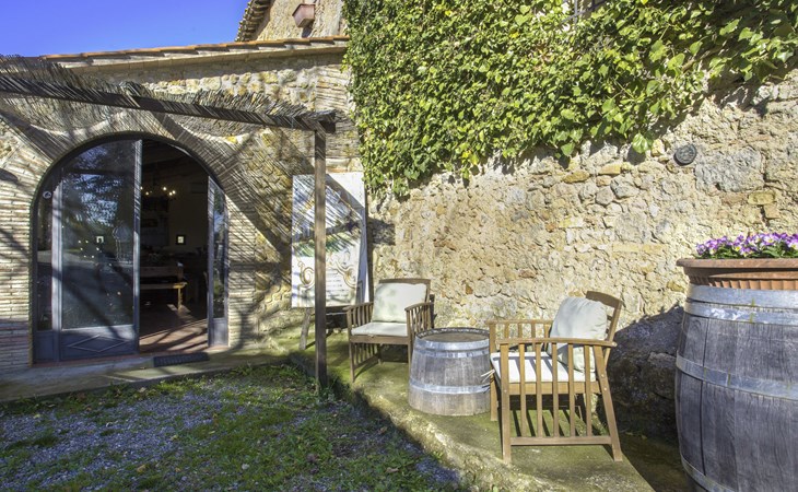 Large agricultural estate "Fattoria di Fugnano", surrounded by trees and vineyards. 5 houses in the residence. 12 apartments in the residence. 4 km from the centre of San Gimignano, 14 km from the centre of Colle di Val d'Elsa, 35 km from the centre of Siena, in a secluded, sunny, elevated position on top of a hill, in the countryside. For shared use: property 200 ha, garden (not fenced) with trees, natural garden, meadow, swimming pool fenced (15 x 7 m, depth 140 cm, seasonal availability: 01.May. - 10.Oct. pool opening hours: 08:00-19:30). Outdoor shower, terrace, garden furniture, barbecue, pool maintenance by the owner/gardener. In the house: reception, breakfast room, lounge with TV. Bread roll service and breakfast possible on request (extra). 1.8 km long motor access (via unmade road). Parking on the premises. Grocery 2.5 km, supermarket 2.5 km, restaurant 2.5 km, bus stop 2 km, railway station "Certaldo" 12 km, indoor swimming pool 12 km, thermal baths "Gambassi Terme" 18 km. Golf course (27 hole) 25 km. Nearby attractions: Certaldo 12 km, Volterra 29 km, Firenze 60 km, Pisa 77 km. Please note: suitable for families, baby equipment (included). Local sale of farm products. The owner lives on the same property. All houses/apartments are individually designed/furnished. The complex has another 9 houses for rent.