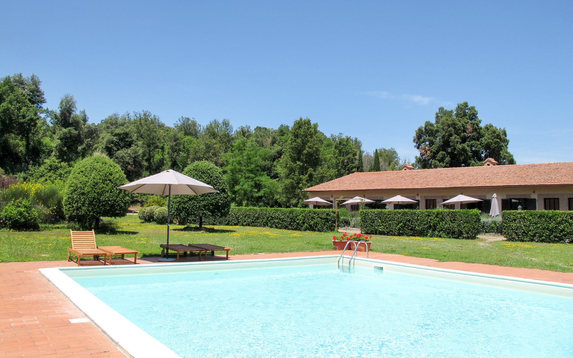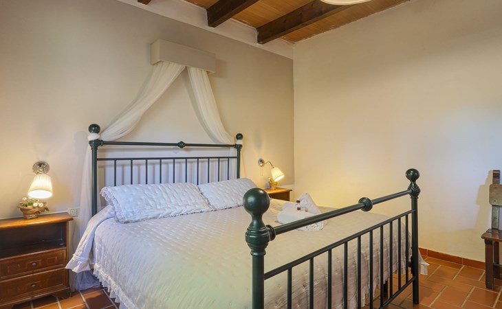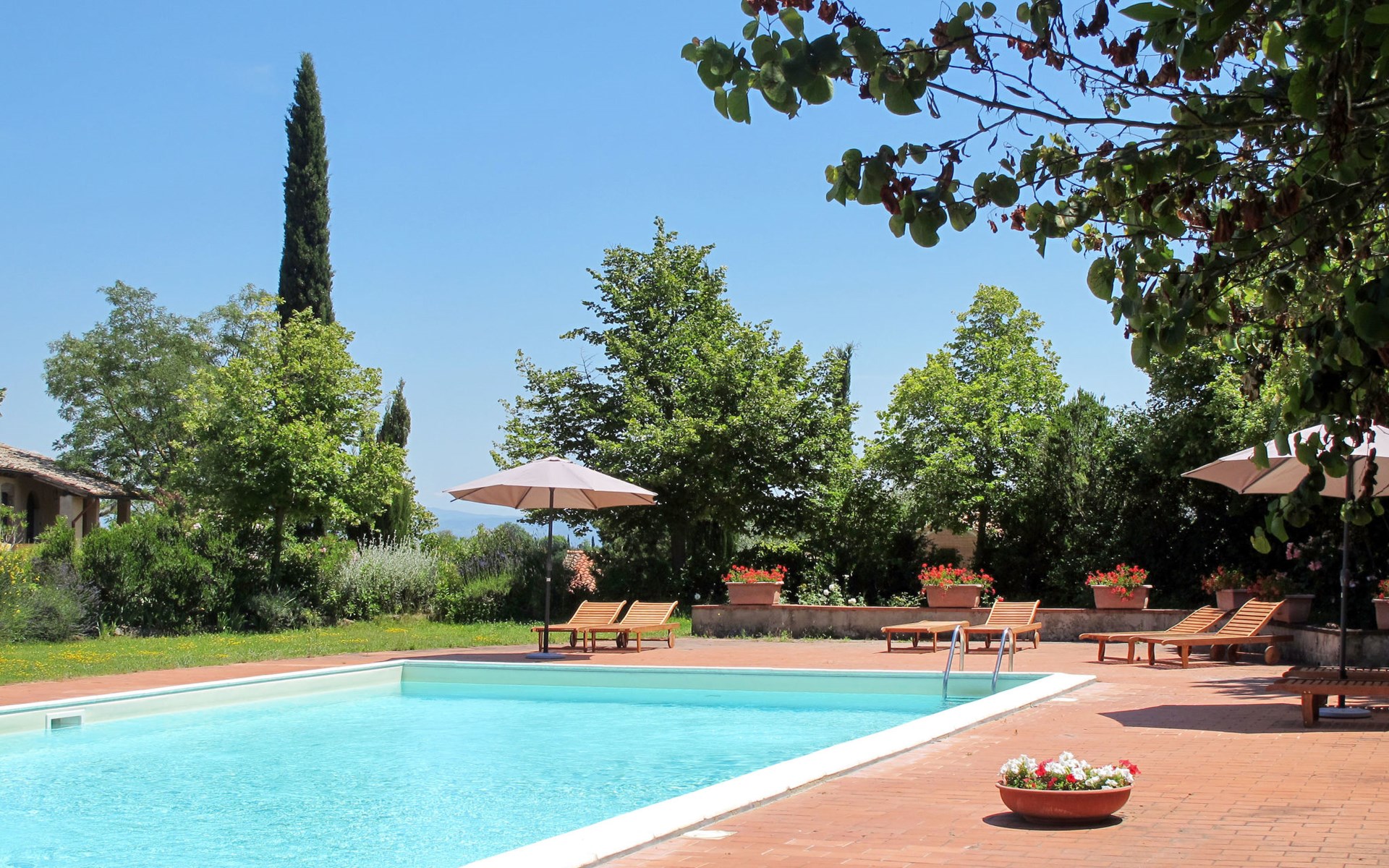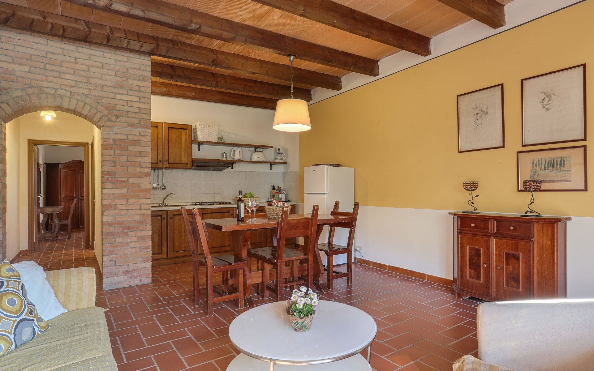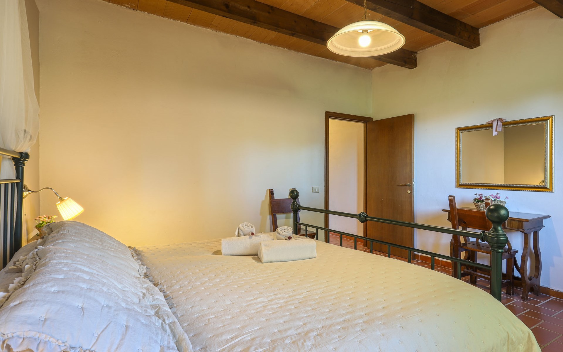 Large agricultural estate "Fattoria di Fugnano", surrounded by trees and vineyards. 5 houses in the residence. 12 apartments in the residence. 4 km from the centre of San Gimignano, 14 km from the centre of Colle di Val d'Elsa, 35 km from the centre of Siena, in a secluded, sunny, elevated position on top of a hill, in the countryside. For shared use: property 200 ha, garden (not fenced) with trees, natural garden, meadow, swimming pool fenced (15 x 7 m, depth 140 cm, seasonal availability: 01.May. - 10.Oct. pool opening hours: 08:00-19:30). Outdoor shower, terrace, garden furniture, barbecue, pool maintenance by the owner/gardener. In the house: reception, breakfast room, lounge with TV. Bread roll service and breakfast possible on request (extra). 1.8 km long motor access (via unmade road). Parking on the premises. Grocery 2.5 km, supermarket 2.5 km, restaurant 2.5 km, bus stop 2 km, railway station "Certaldo" 12 km, indoor swimming pool 12 km, thermal baths "Gambassi Terme" 18 km. Golf course (27 hole) 25 km. Nearby attractions: Certaldo 12 km, Volterra 29 km, Firenze 60 km, Pisa 77 km. Please note: suitable for families, baby equipment (included). Local sale of farm products. The owner lives on the same property. All houses/apartments are individually designed/furnished. The complex has another 9 houses for rent.