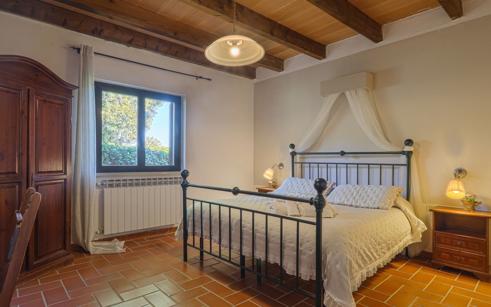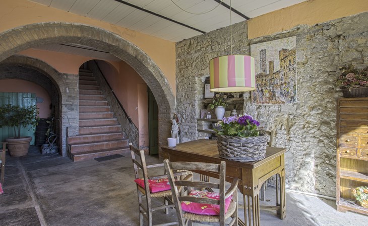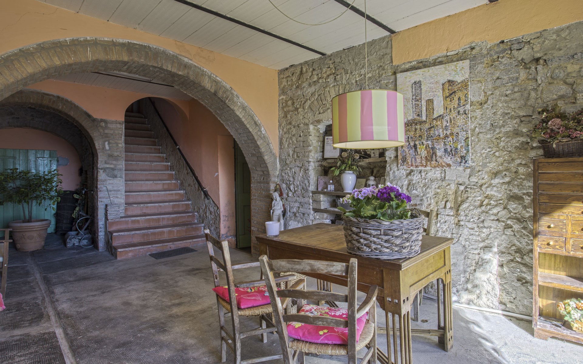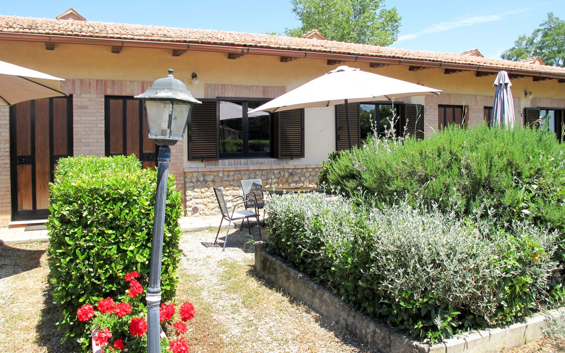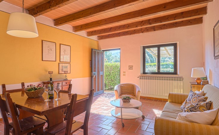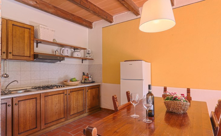 Large agricultural estate "Fattoria di Fugnano", surrounded by trees and vineyards. 5 houses in the residence. 12 apartments in the residence. 4 km from the centre of San Gimignano, 14 km from the centre of Colle di Val d'Elsa, 35 km from the centre of Siena, in a secluded, sunny, elevated position on top of a hill, in the countryside. For shared use: property 200 ha, garden (not fenced) with trees, natural garden, meadow, swimming pool fenced (15 x 7 m, depth 140 cm, seasonal availability: 01.May. - 10.Oct. pool opening hours: 08:00-19:30). Outdoor shower, terrace, garden furniture, barbecue, pool maintenance by the owner/gardener. In the house: reception, breakfast room, lounge with TV. Bread roll service and breakfast possible on request (extra). 1.8 km long motor access (via unmade road). Parking on the premises. Grocery 2.5 km, supermarket 2.5 km, restaurant 2.5 km, bus stop 2 km, railway station "Certaldo" 12 km, indoor swimming pool 12 km, thermal baths "Gambassi Terme" 18 km. Golf course (27 hole) 25 km. Nearby attractions: Certaldo 12 km, Volterra 29 km, Firenze 60 km, Pisa 77 km. Please note: suitable for families, baby equipment (included). Local sale of farm products. The owner lives on the same property. All houses/apartments are individually designed/furnished. The complex has another 9 houses for rent.