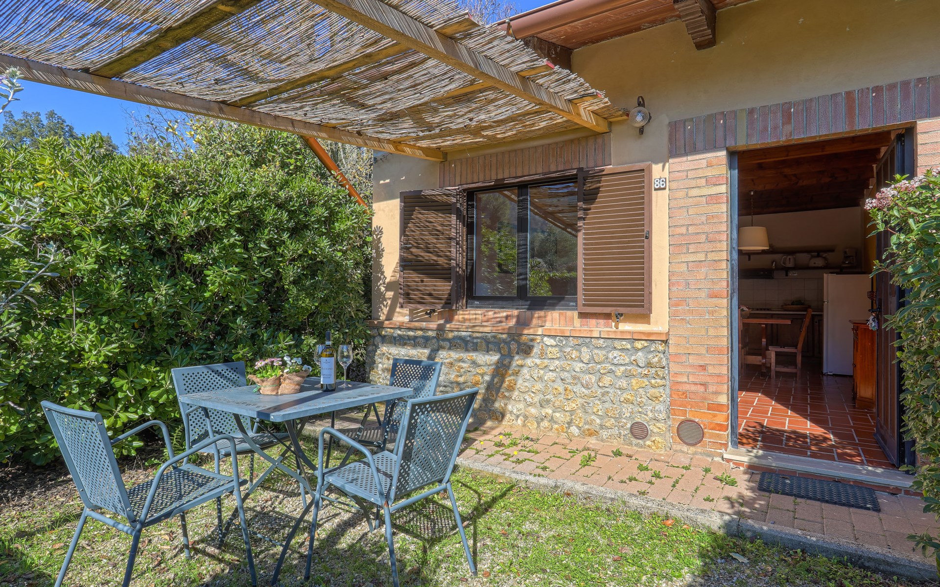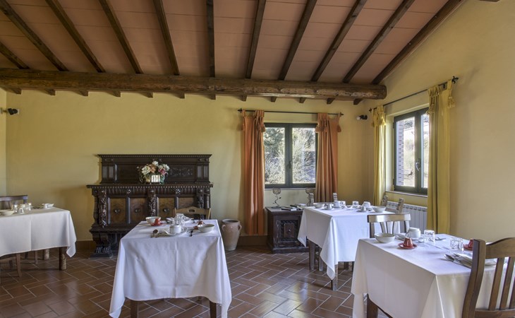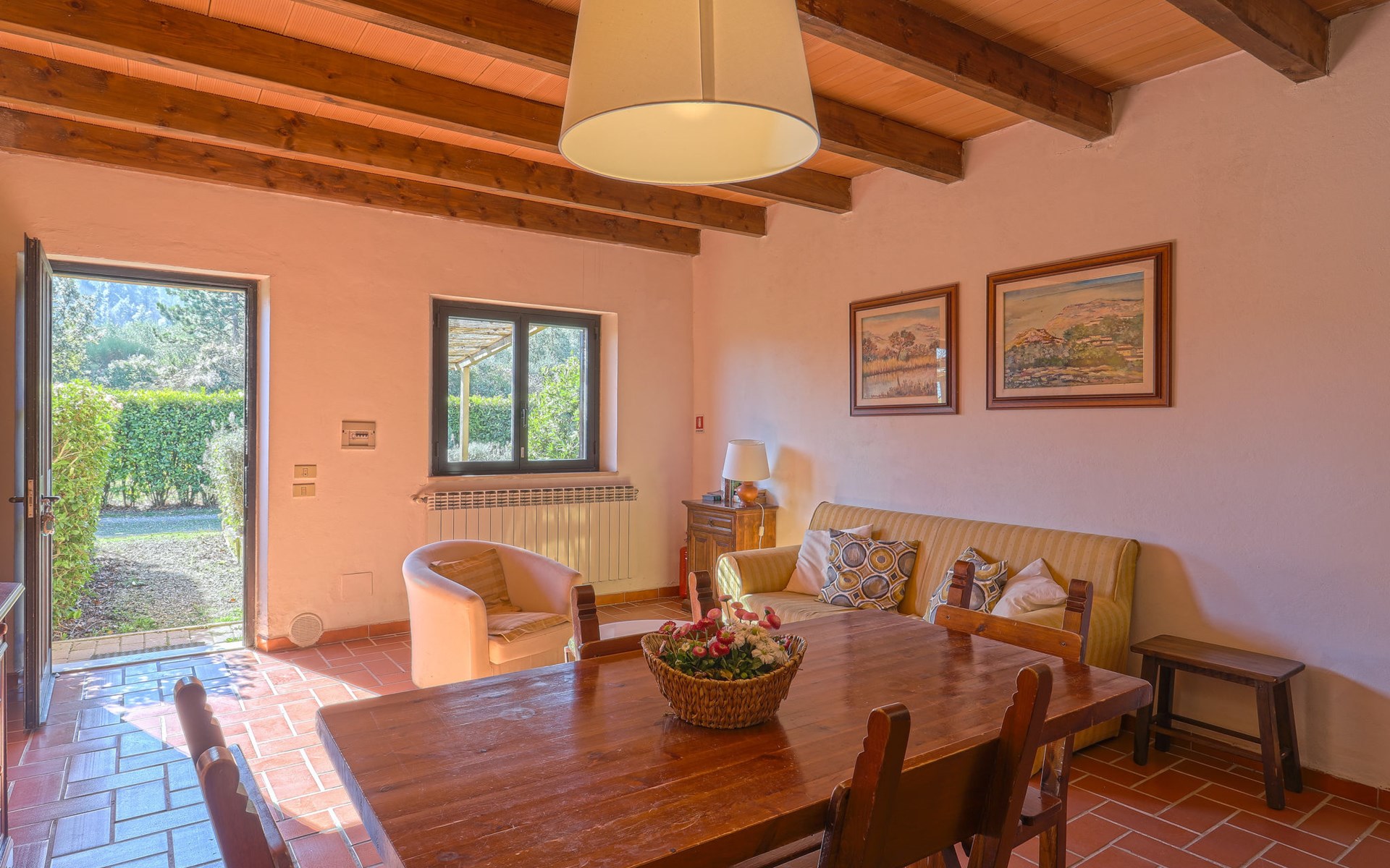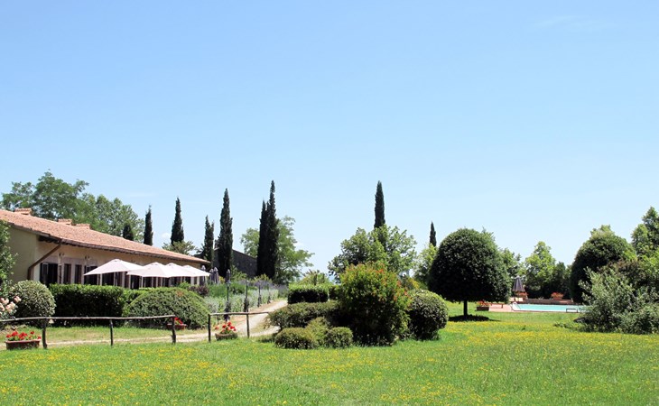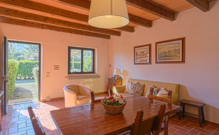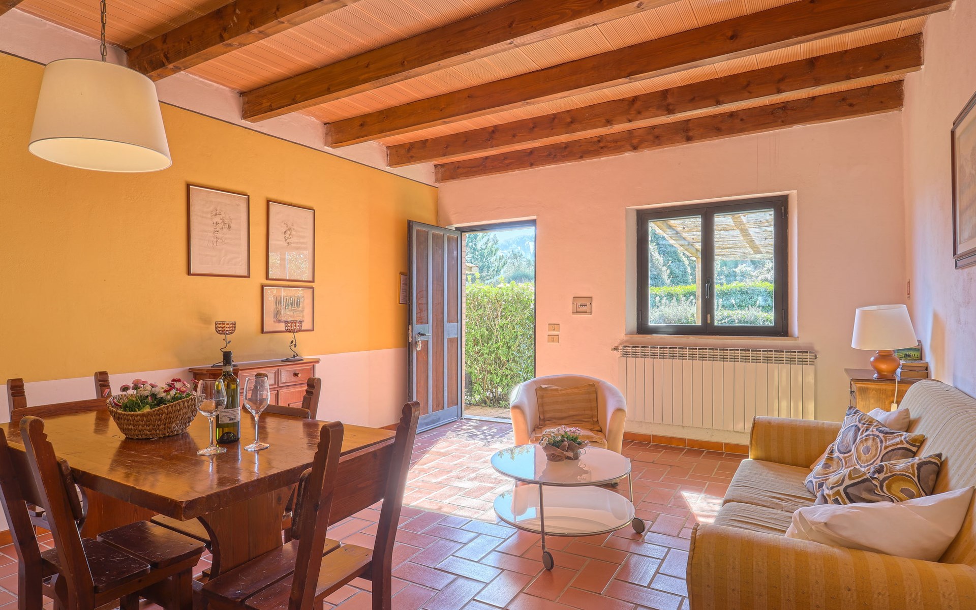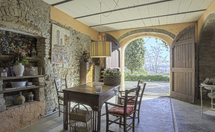 Large agricultural estate "Fattoria di Fugnano", surrounded by trees and vineyards. 5 houses in the residence. 12 apartments in the residence. 4 km from the centre of San Gimignano, 14 km from the centre of Colle di Val d'Elsa, 35 km from the centre of Siena, in a secluded, sunny, elevated position on top of a hill, in the countryside. For shared use: property 200 ha, garden (not fenced) with trees, natural garden, meadow, swimming pool fenced (15 x 7 m, depth 140 cm, seasonal availability: 01.May. - 10.Oct. pool opening hours: 08:00-19:30). Outdoor shower, terrace, garden furniture, barbecue, pool maintenance by the owner/gardener. In the house: reception, breakfast room, lounge with TV. Bread roll service and breakfast possible on request (extra). 1.8 km long motor access (via unmade road). Parking on the premises. Grocery 2.5 km, supermarket 2.5 km, restaurant 2.5 km, bus stop 2 km, railway station "Certaldo" 12 km, indoor swimming pool 12 km, thermal baths "Gambassi Terme" 18 km. Golf course (27 hole) 25 km. Nearby attractions: Certaldo 12 km, Volterra 29 km, Firenze 60 km, Pisa 77 km. Please note: suitable for families, baby equipment (included). Local sale of farm products. The owner lives on the same property. All houses/apartments are individually designed/furnished. The complex has another 9 houses for rent.