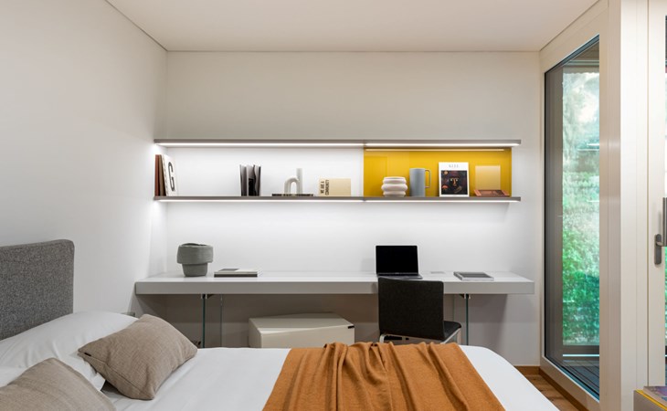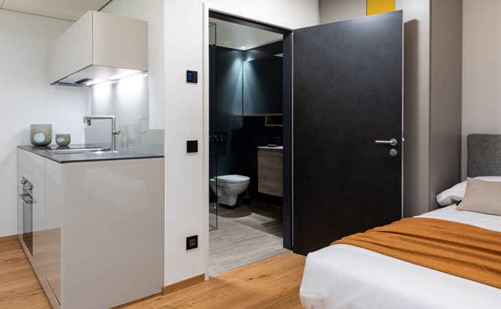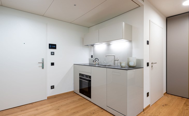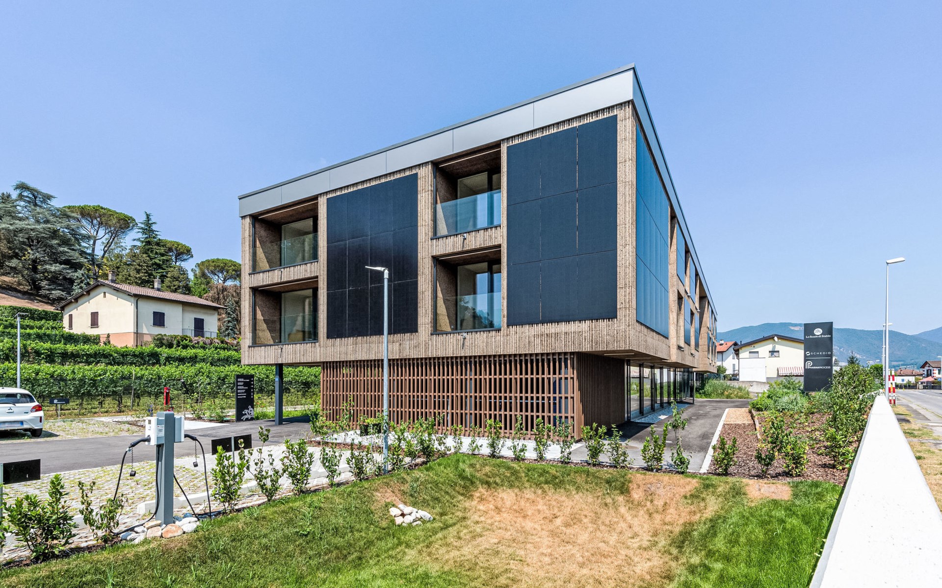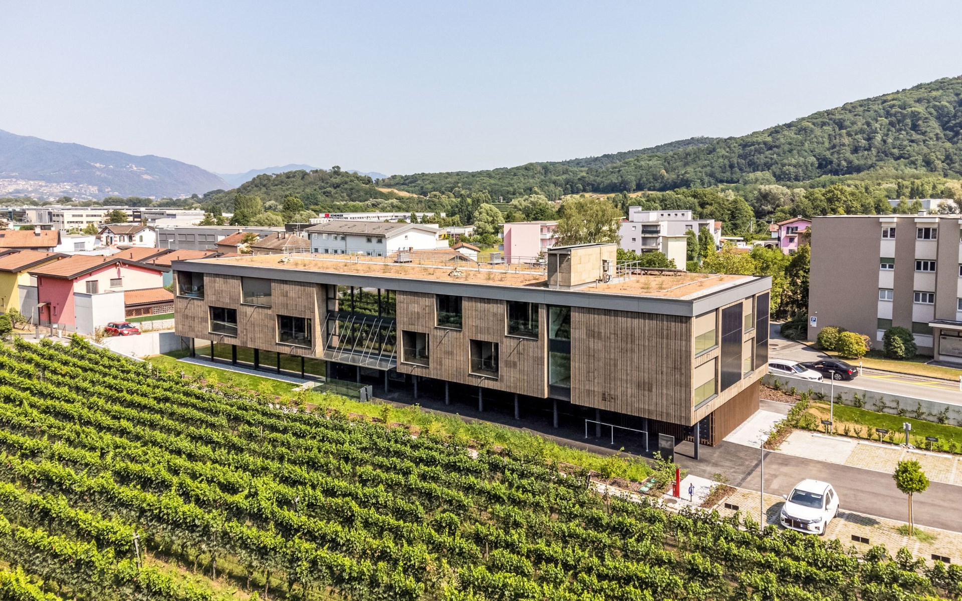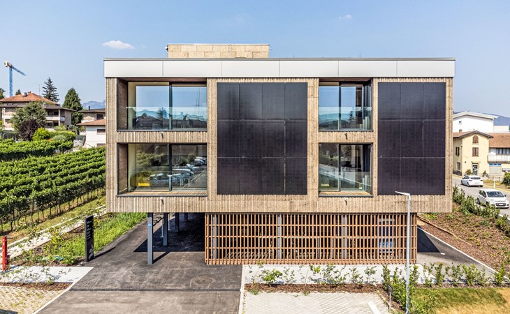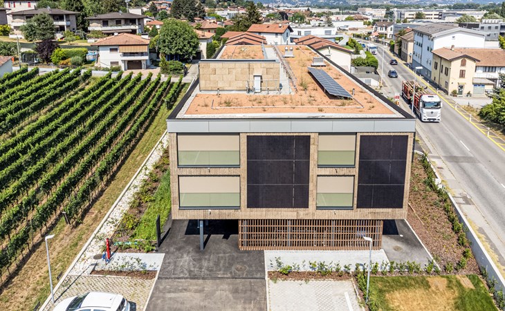 Stabio 20 km from Lugano Centro: Modern, comfortable aparthotel "Lo Scudo di Stabio", 350 m a.s.l., 2 storeys, detached, built in 2022, surrounded by meadows and vineyards. 15 apartments in the residence. In the resort 1 km from the centre of Stabio, on a main road, north-east facing position. For shared use: property 1'000 m2, large, beautiful garden lawn and plants. In the house: reception, lounge with TV, WiFi, lift, storage room for bicycles, central heating system, air conditioning. Linen change daily (suppl. charge extra). Towel change daily (suppl. charge extra). Room cleaning daily on request (extra). Motor access to the house. Parking on the premises. E-charging station. Supermarket 1 km, bar 550 m, bus stop 1 m, railway station "Stabio" 1.2 km. Nearby attractions: Fossilienmuseum Arzo 4.8 km, Chicco d'Oro Kaffee Museum 5 km, Villa Braghenti 8 km, La Vecchia Stazione 8 km, Torre Pezza 9 km, Madonna di San Bernardino 9 km. Well-known lakes can easily be reached: Lago di Lugano 5 km. Hiking paths: Monte San Giorgio 9 km, Monte Generoso, Valle di Muggio. Outdoors: Picnic area, outdoor furniture, garden. Common area with shared lounge/TV area, snack vending machines, vending machines, coffee and tea making facilities. Business services: Conference and event rooms. Scudo di Stabio combines flexible hospitality with ongoing sustainability: 22 furnished apartments (35–50 m²), complemented by common areas such as a 130 m² common room and a 26 m² meeting room. The approach is holistically sustainable: load-bearing structures primarily made of wood with a prefabricated frame, natural insulation materials, a green roof and highly efficient systems to reduce energy consumption and emissions throughout the entire life cycle. The exposed cork facades integrate photovoltaic modules on the south and west sides, combining energy production with the architectural identity. Soft mobility is supported by electric car charging stations, a bicycle service station and secure bike storage on the ground floor. The complex is the first building in Ticino to be SNBS certified and has obtained the Minergie-P-ECO certification (no. TI-011-P-ECO) and the Swisstainable - Level II label, demonstrating its ecological, social and economic quality. It was also selected/recognized at the 2022 Active House Awards, highlighting its focus on user comfort (light, air, well-being) and energy efficiency.