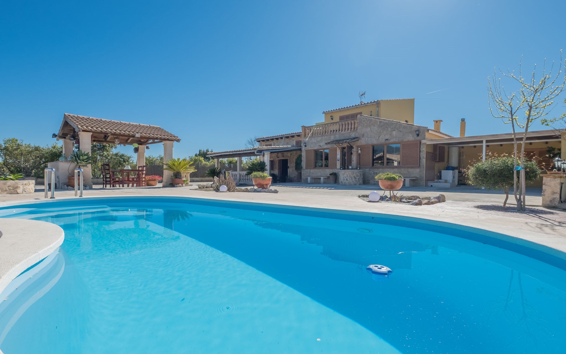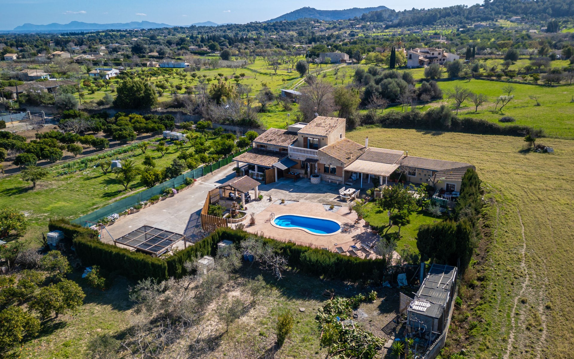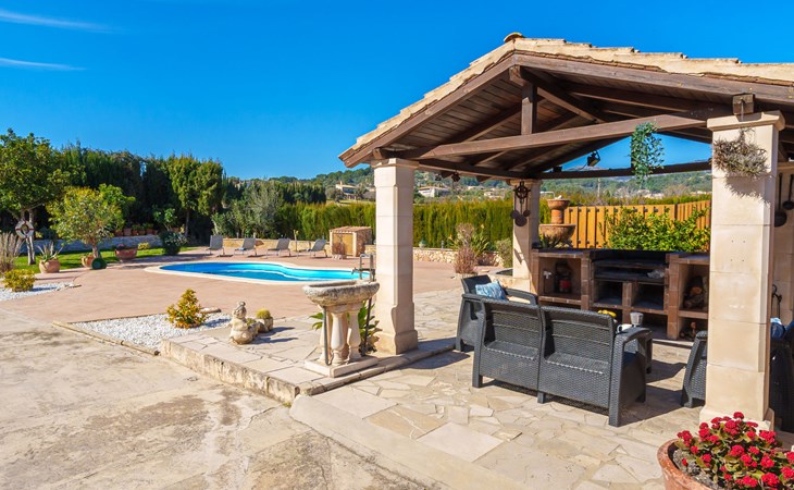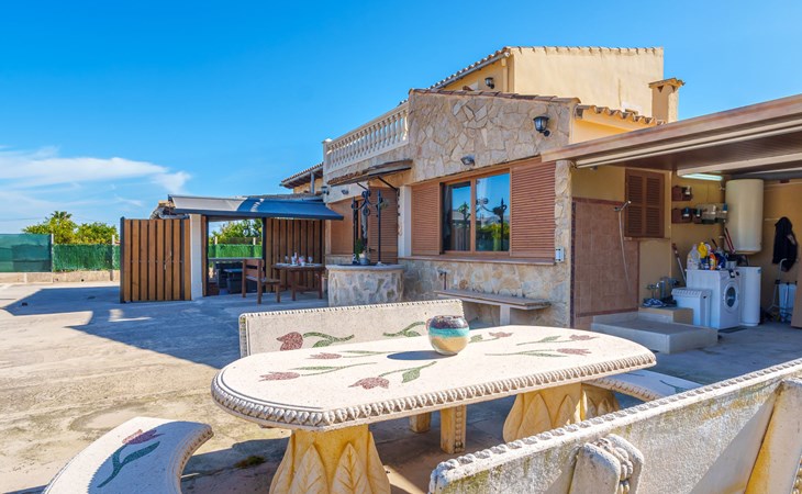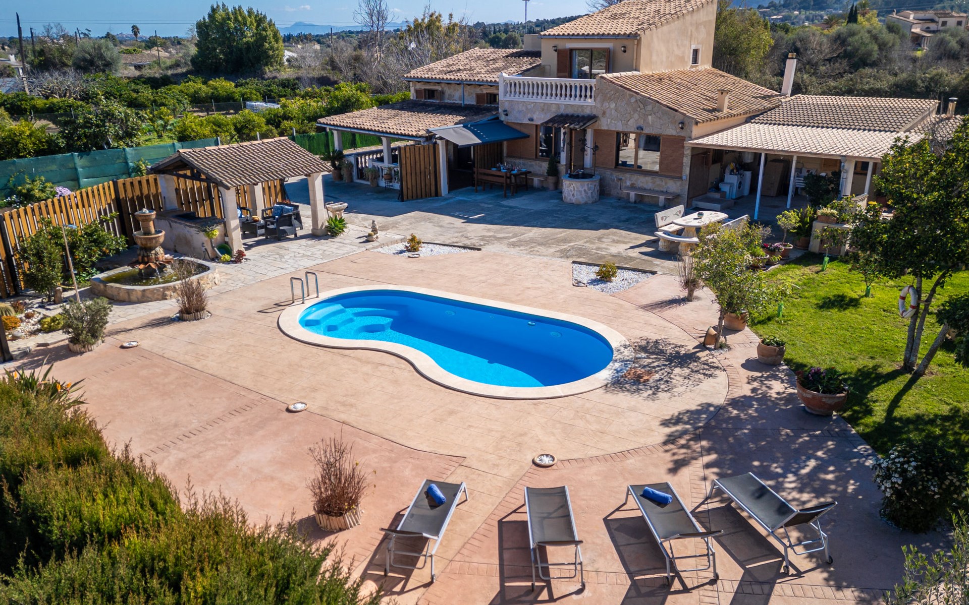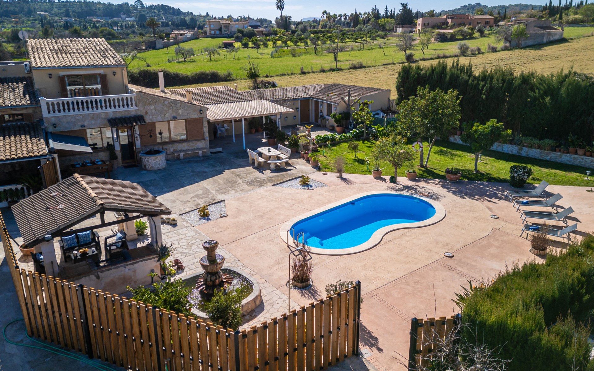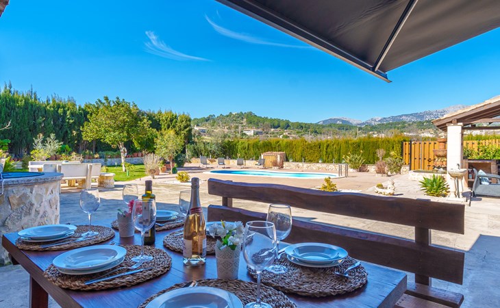 Very large, beautiful, cosy farm estate "Cas Pec", 2 storeys, surrounded by fields. Outside the resort, 1.5 km from the centre of Selva, in a quiet, sunny position, 30 km from the sea, 30 km from the beach, in the countryside. Private: large, beautiful garden, orchard, swimming pool kidney shaped (8 x 4 m, seasonal availability: 01.Mar. - 31.Oct.). Outdoor shower, patio, garden furniture, barbecue house, children's playground. In the house: internet access, WiFi, central heating system, air conditioning, burglar alarm system, washing machine. Parking at the house. Shop 1.5 km, grocery 1.5 km, shopping centre 3.5 km, restaurant 1.5 km, bus stop 1 km, railway station "Inca" 5.5 km, sandy beach "Alcudia" 25 km. Nearby attractions: Sierra tramuntana, Rutas ciclistas, Senderismo. Please note: car recommended. Object suitable for 6 adults. The owner lives on the same property.