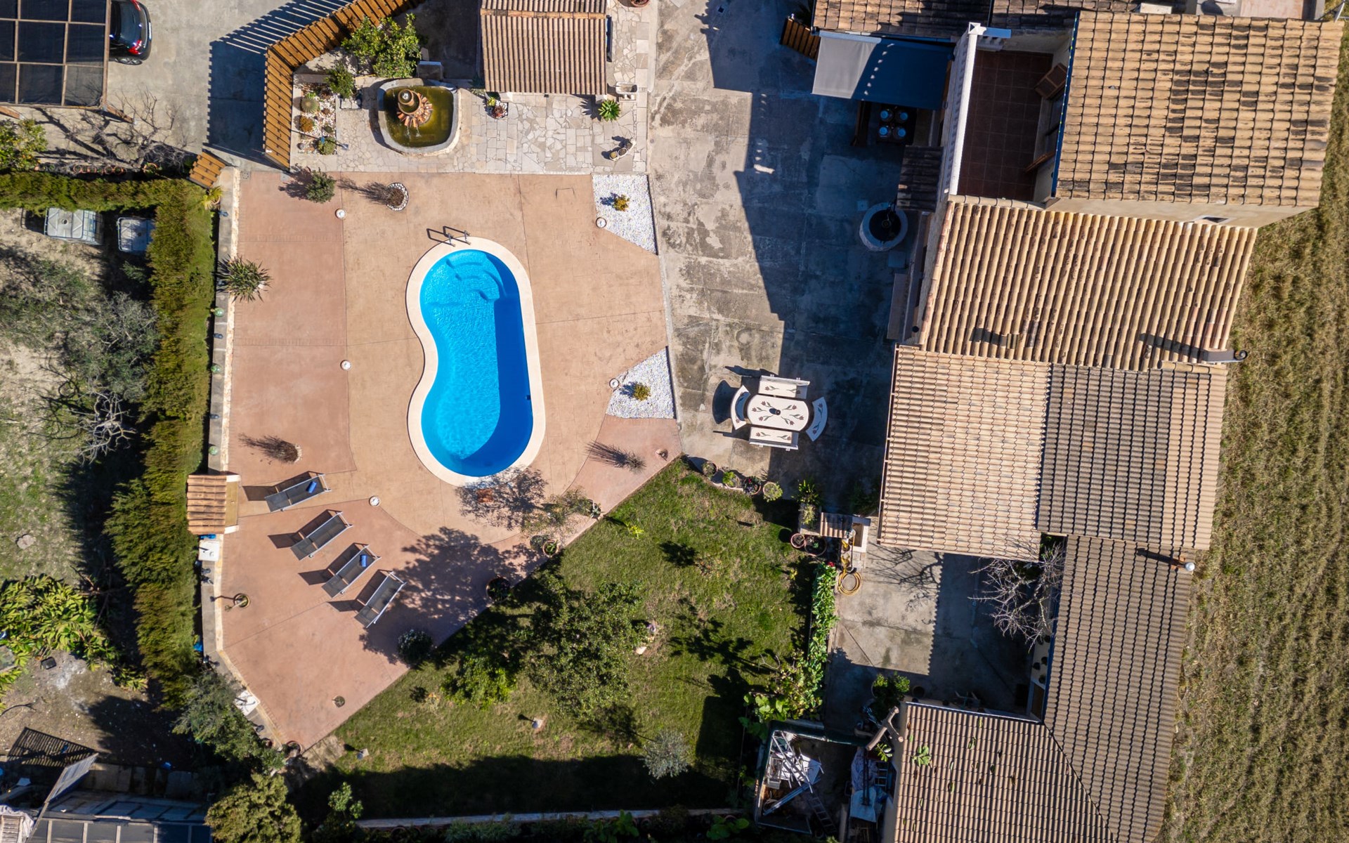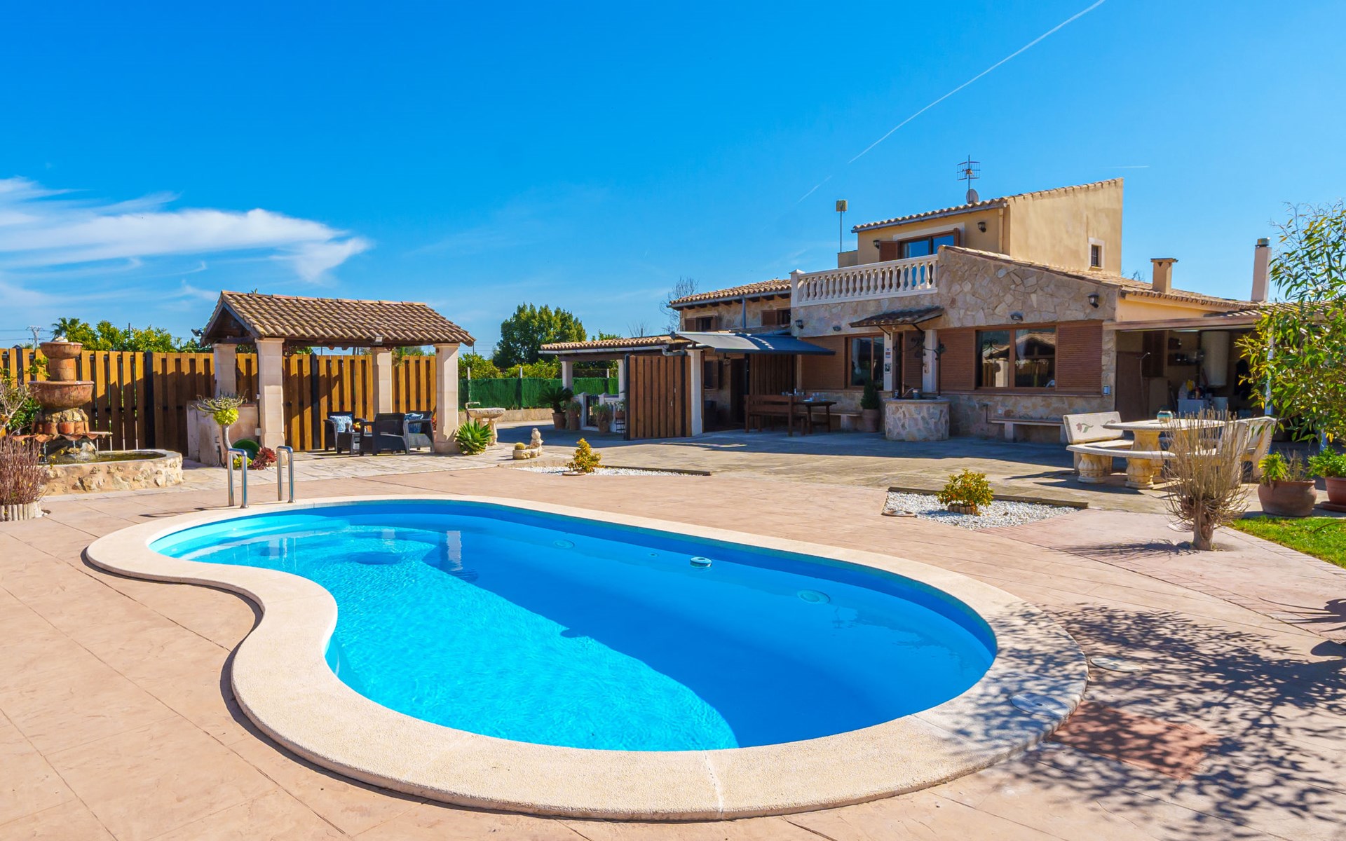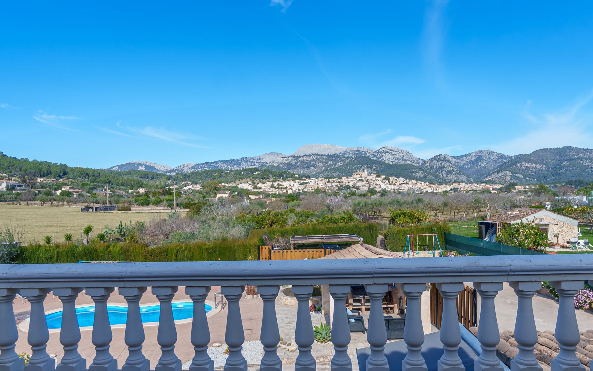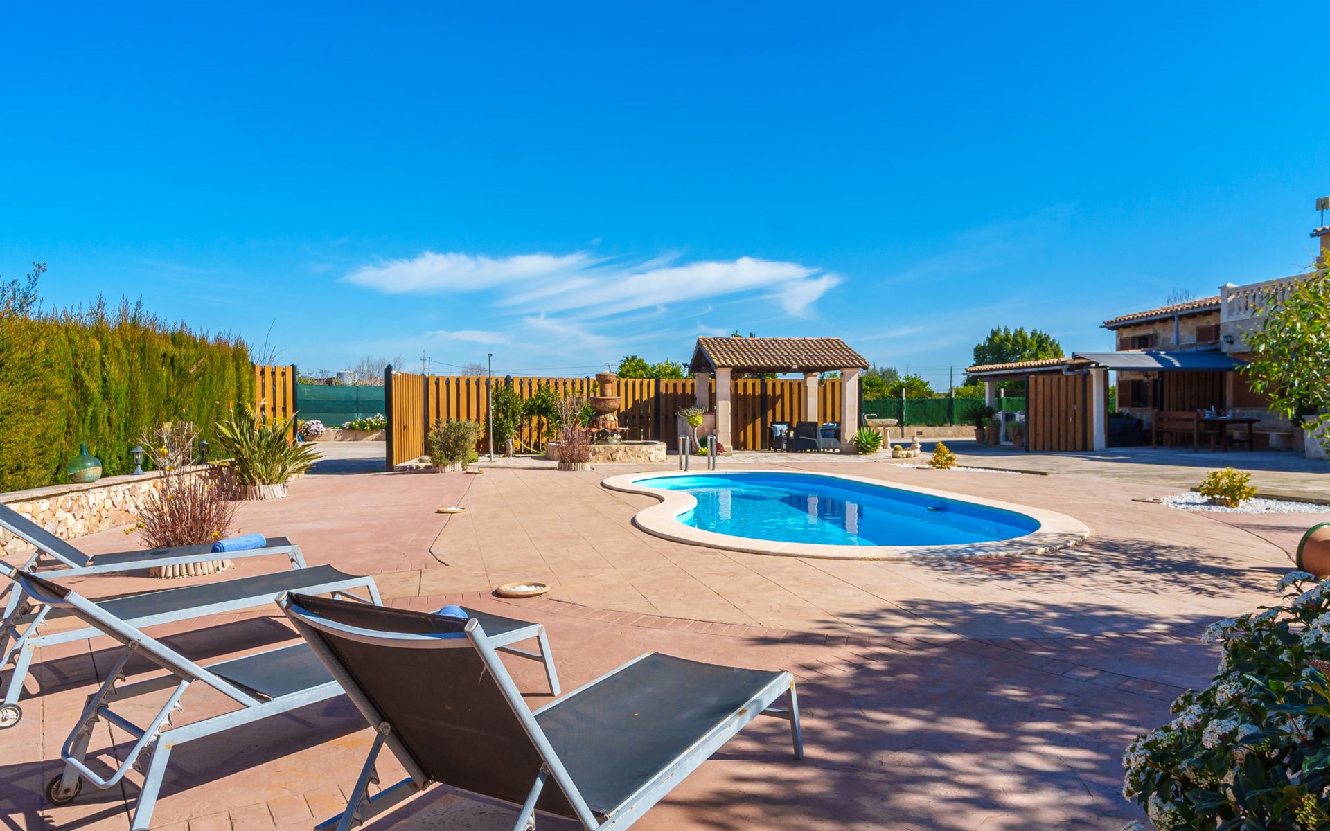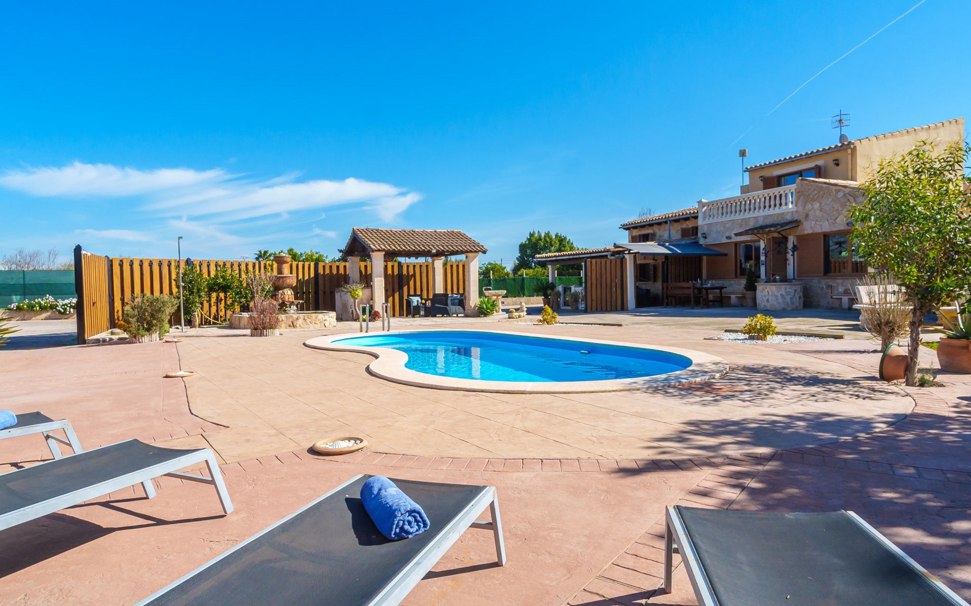 Very large, beautiful, cosy farm estate "Cas Pec", 2 storeys, surrounded by fields. Outside the resort, 1.5 km from the centre of Selva, in a quiet, sunny position, 30 km from the sea, 30 km from the beach, in the countryside. Private: large, beautiful garden, orchard, swimming pool kidney shaped (8 x 4 m, seasonal availability: 01.Mar. - 31.Oct.). Outdoor shower, patio, garden furniture, barbecue house, children's playground. In the house: internet access, WiFi, central heating system, air conditioning, burglar alarm system, washing machine. Parking at the house. Shop 1.5 km, grocery 1.5 km, shopping centre 3.5 km, restaurant 1.5 km, bus stop 1 km, railway station "Inca" 5.5 km, sandy beach "Alcudia" 25 km. Nearby attractions: Sierra tramuntana, Rutas ciclistas, Senderismo. Please note: car recommended. Object suitable for 6 adults. The owner lives on the same property.