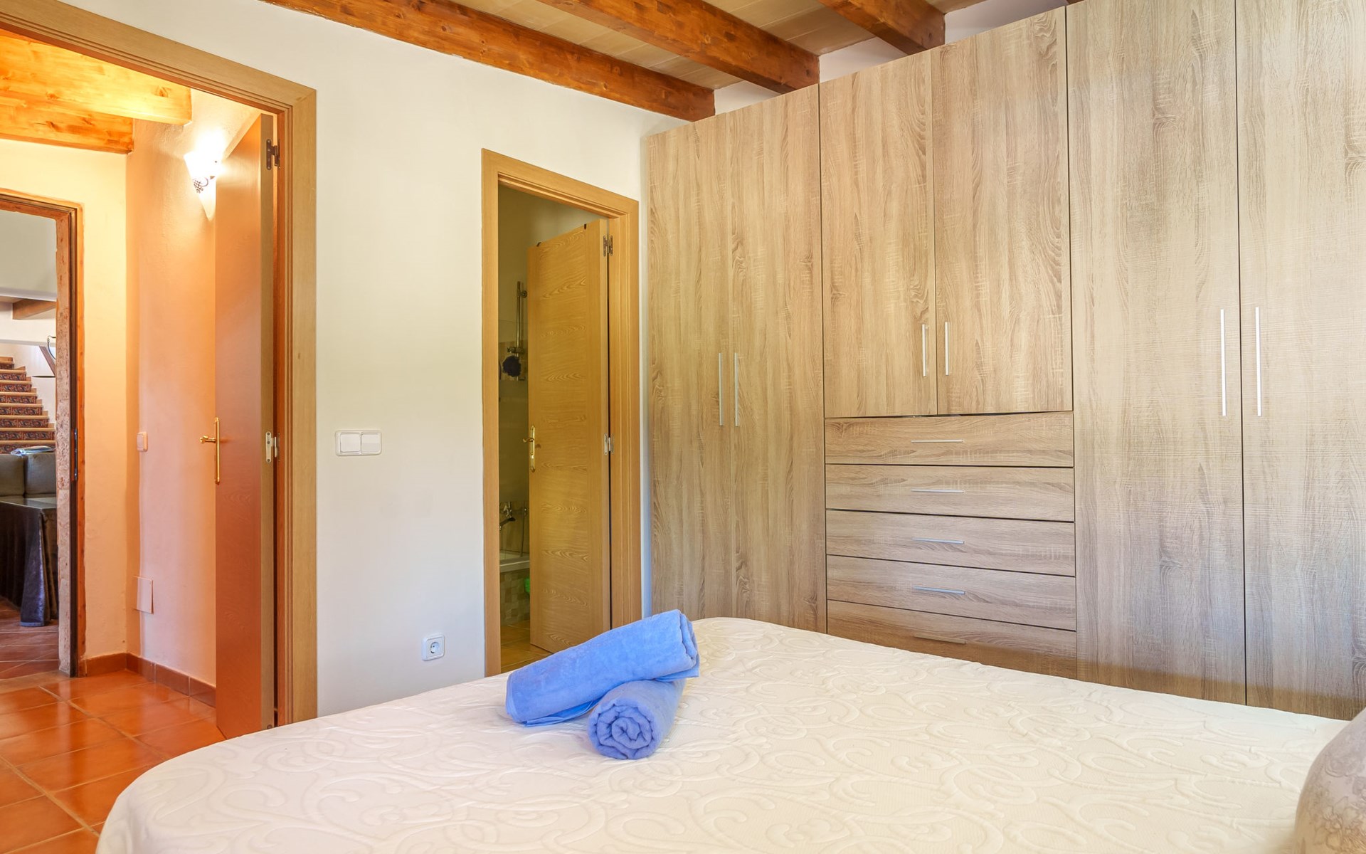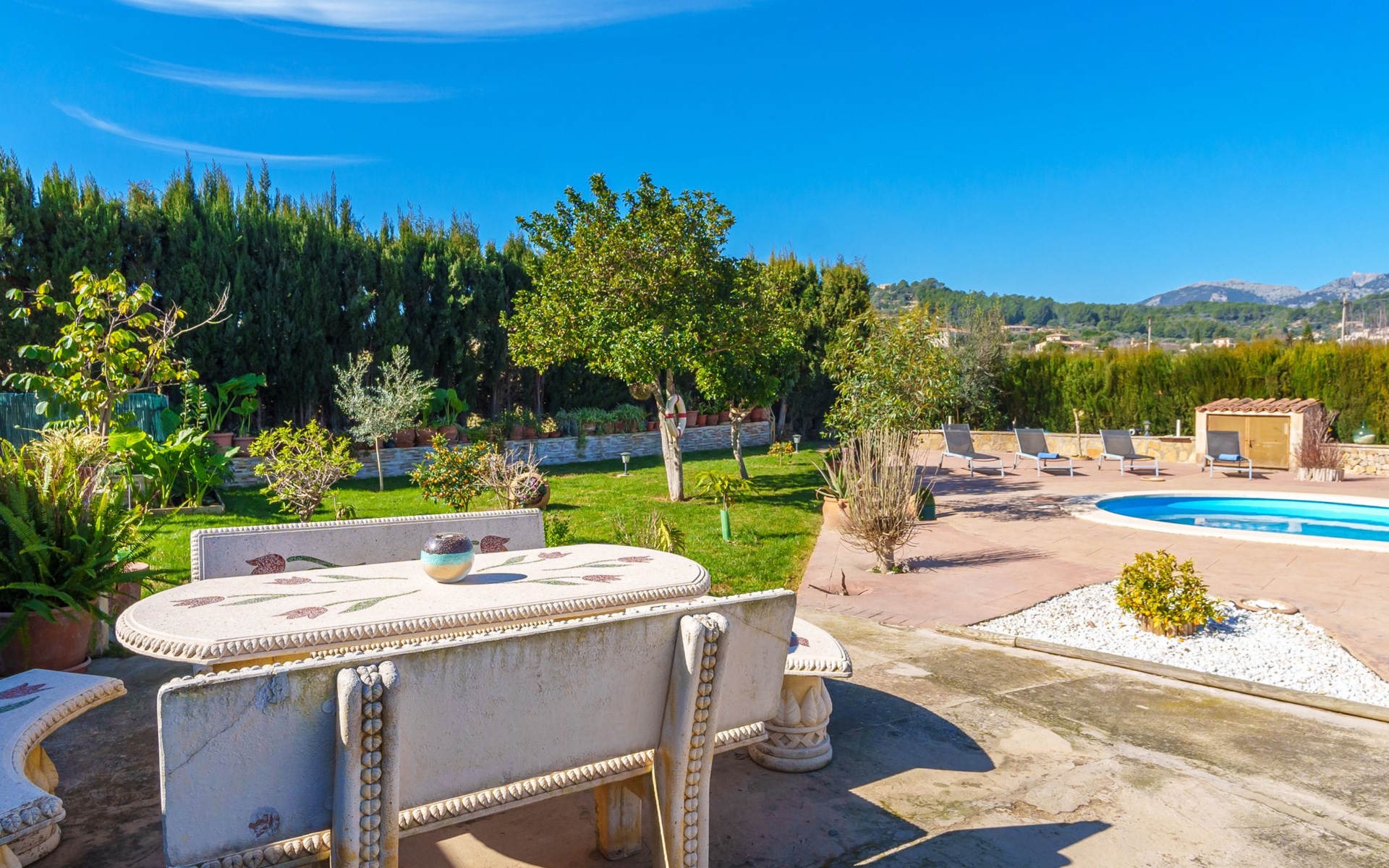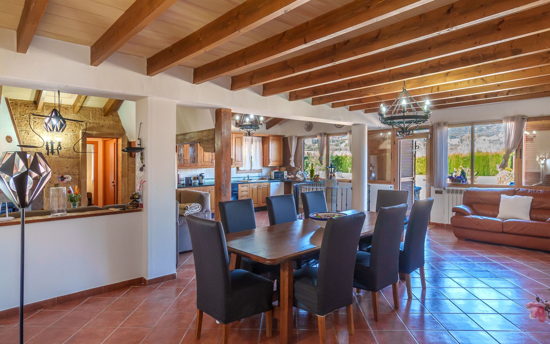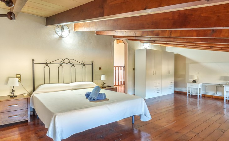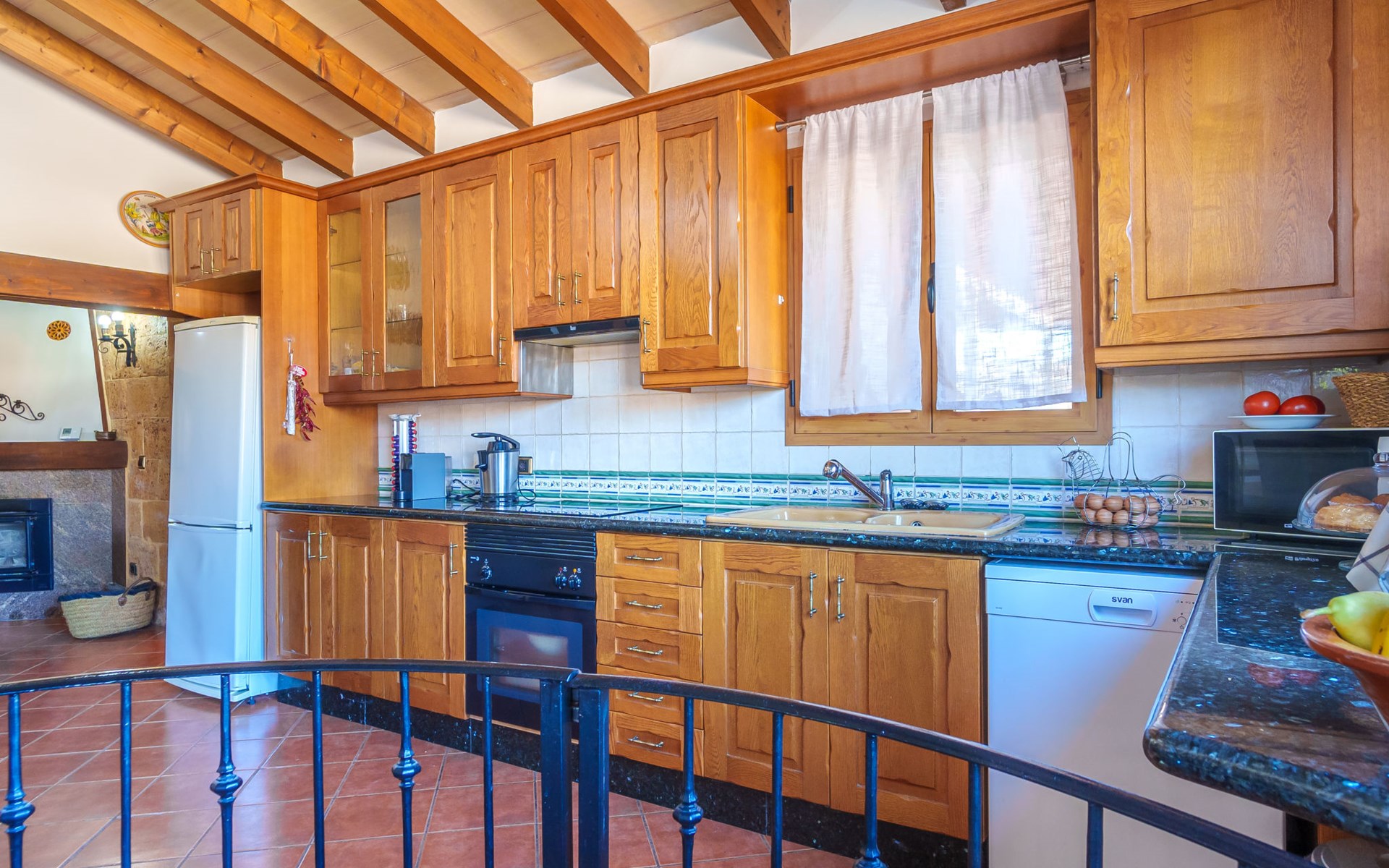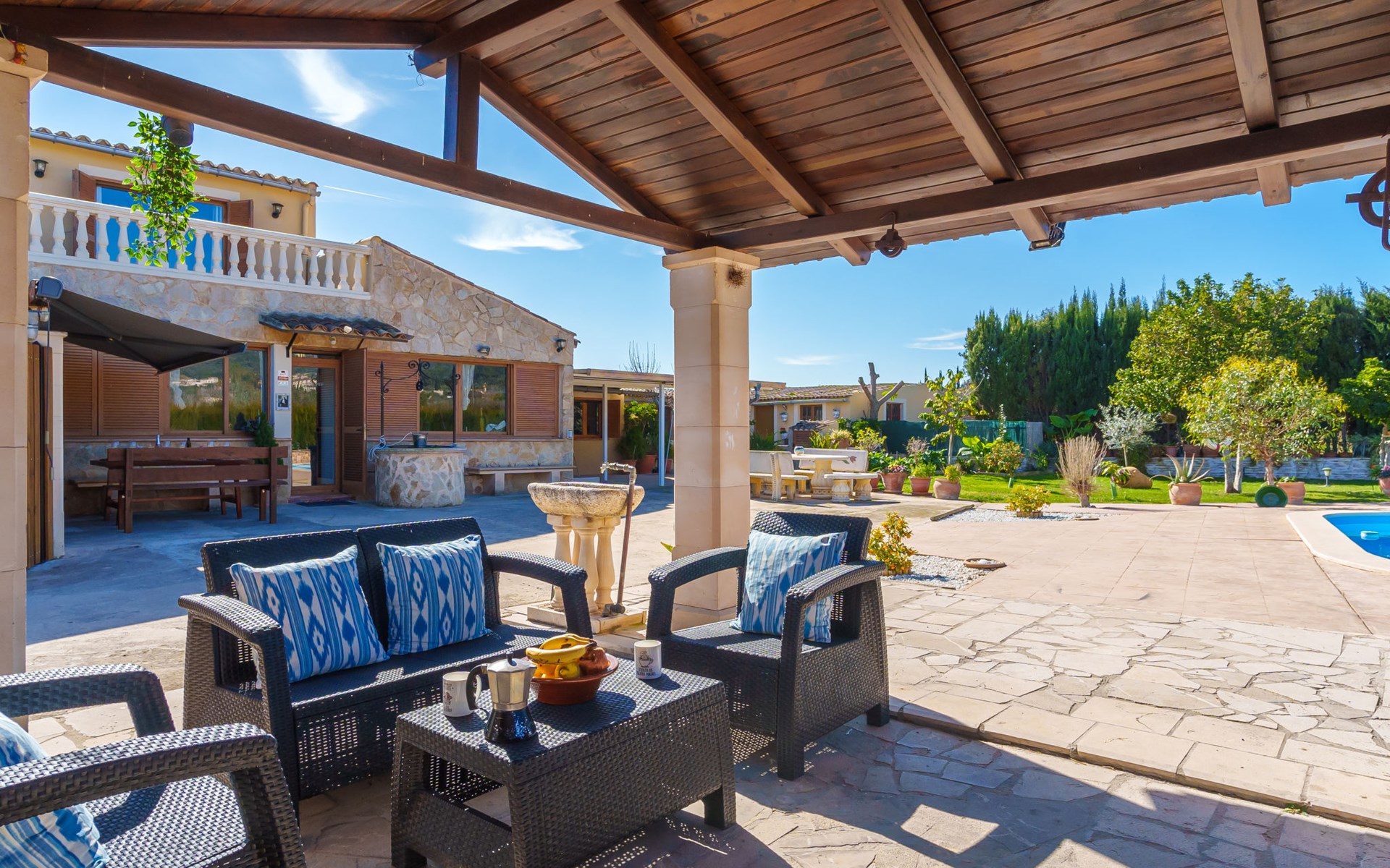 Very large, beautiful, cosy farm estate "Cas Pec", 2 storeys, surrounded by fields. Outside the resort, 1.5 km from the centre of Selva, in a quiet, sunny position, 30 km from the sea, 30 km from the beach, in the countryside. Private: large, beautiful garden, orchard, swimming pool kidney shaped (8 x 4 m, seasonal availability: 01.Mar. - 31.Oct.). Outdoor shower, patio, garden furniture, barbecue house, children's playground. In the house: internet access, WiFi, central heating system, air conditioning, burglar alarm system, washing machine. Parking at the house. Shop 1.5 km, grocery 1.5 km, shopping centre 3.5 km, restaurant 1.5 km, bus stop 1 km, railway station "Inca" 5.5 km, sandy beach "Alcudia" 25 km. Nearby attractions: Sierra tramuntana, Rutas ciclistas, Senderismo. Please note: car recommended. Object suitable for 6 adults. The owner lives on the same property.