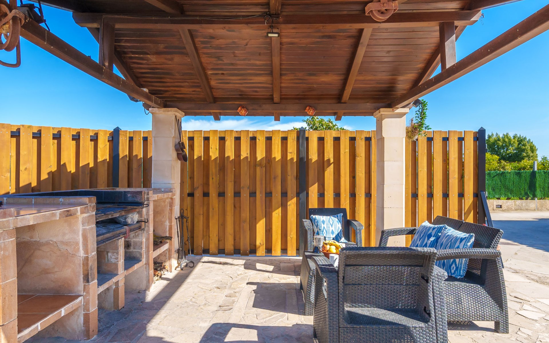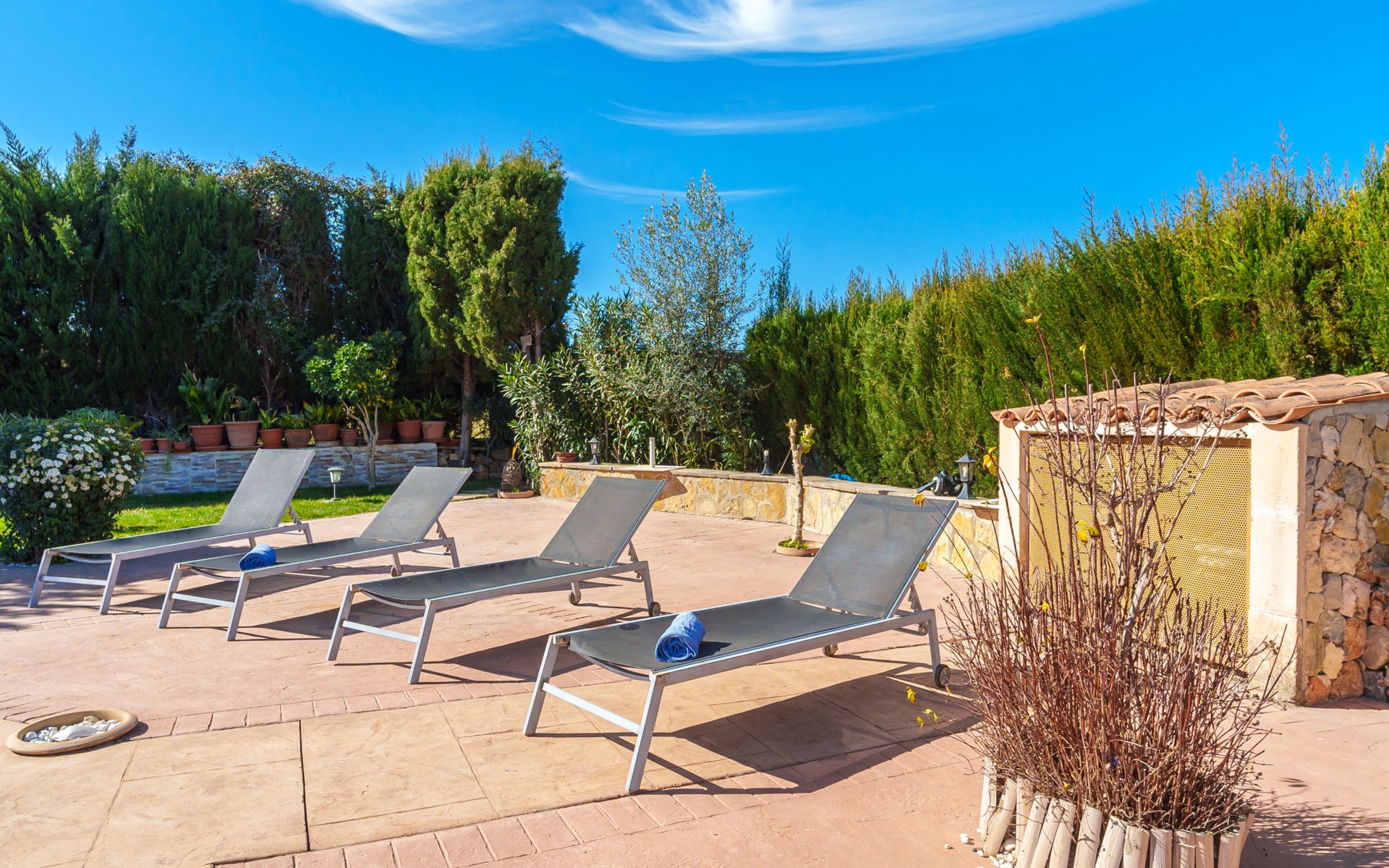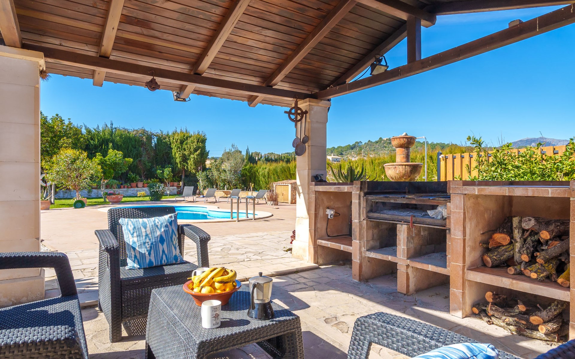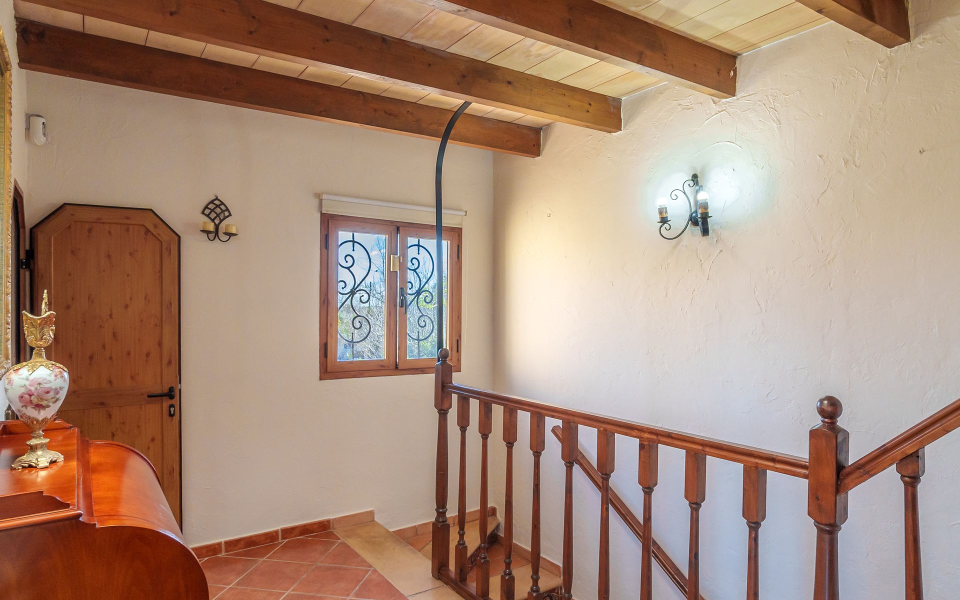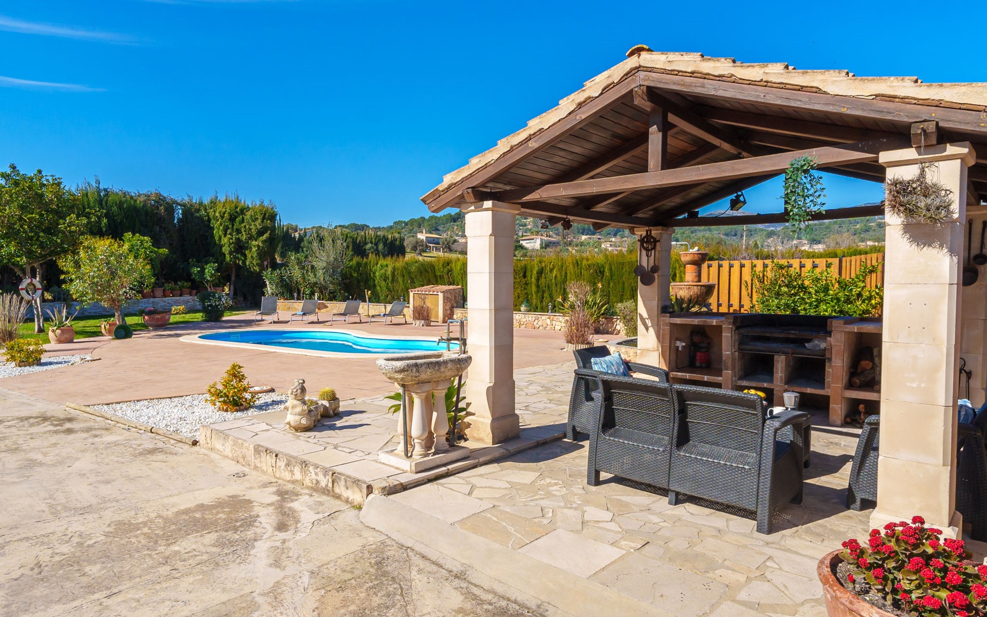 Very large, beautiful, cosy farm estate "Cas Pec", 2 storeys, surrounded by fields. Outside the resort, 1.5 km from the centre of Selva, in a quiet, sunny position, 30 km from the sea, 30 km from the beach, in the countryside. Private: large, beautiful garden, orchard, swimming pool kidney shaped (8 x 4 m, seasonal availability: 01.Mar. - 31.Oct.). Outdoor shower, patio, garden furniture, barbecue house, children's playground. In the house: internet access, WiFi, central heating system, air conditioning, burglar alarm system, washing machine. Parking at the house. Shop 1.5 km, grocery 1.5 km, shopping centre 3.5 km, restaurant 1.5 km, bus stop 1 km, railway station "Inca" 5.5 km, sandy beach "Alcudia" 25 km. Nearby attractions: Sierra tramuntana, Rutas ciclistas, Senderismo. Please note: car recommended. Object suitable for 6 adults. The owner lives on the same property.