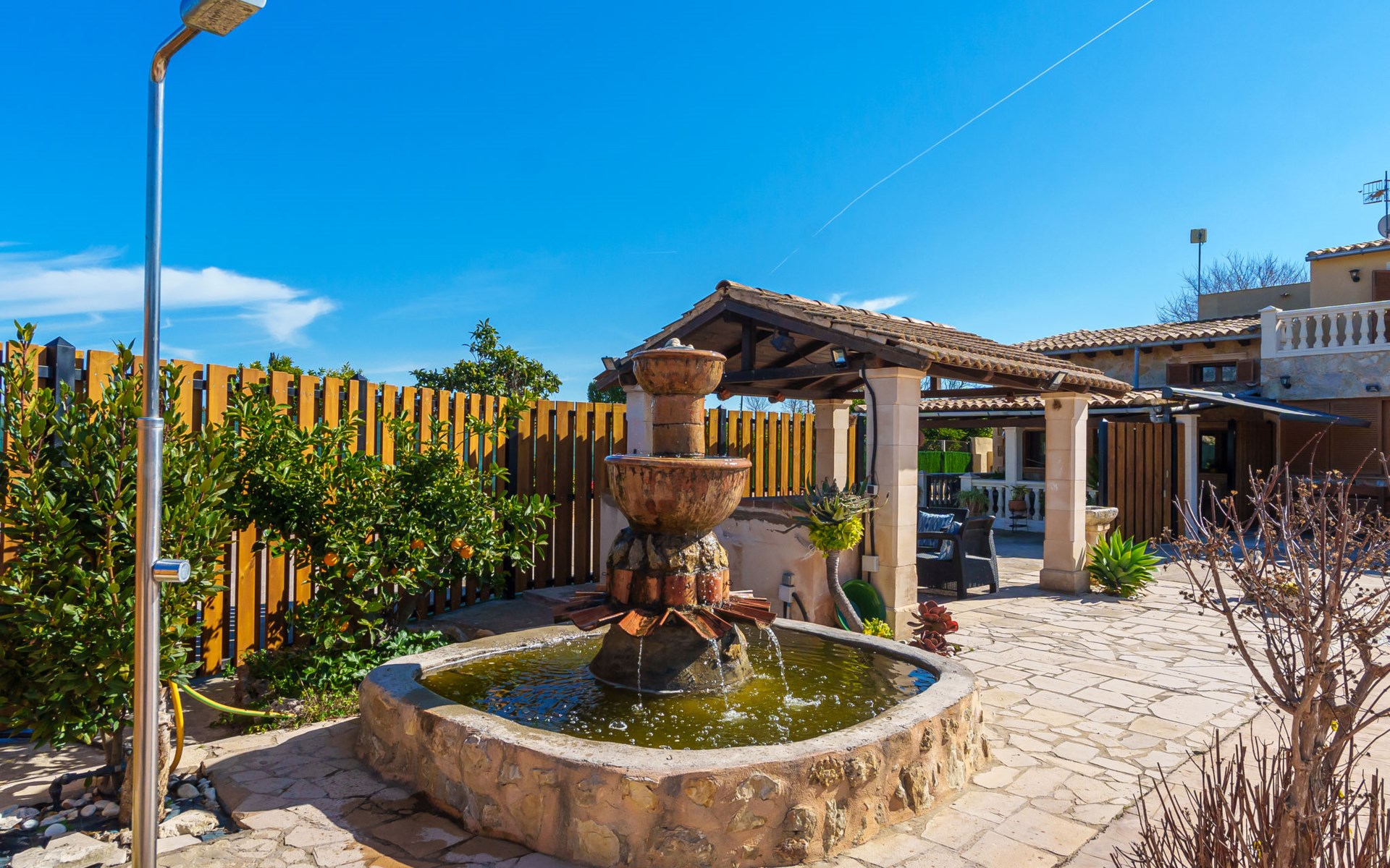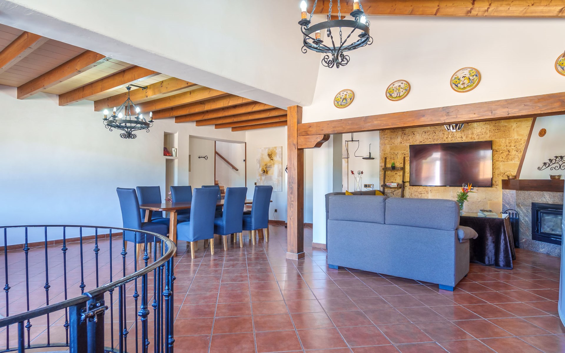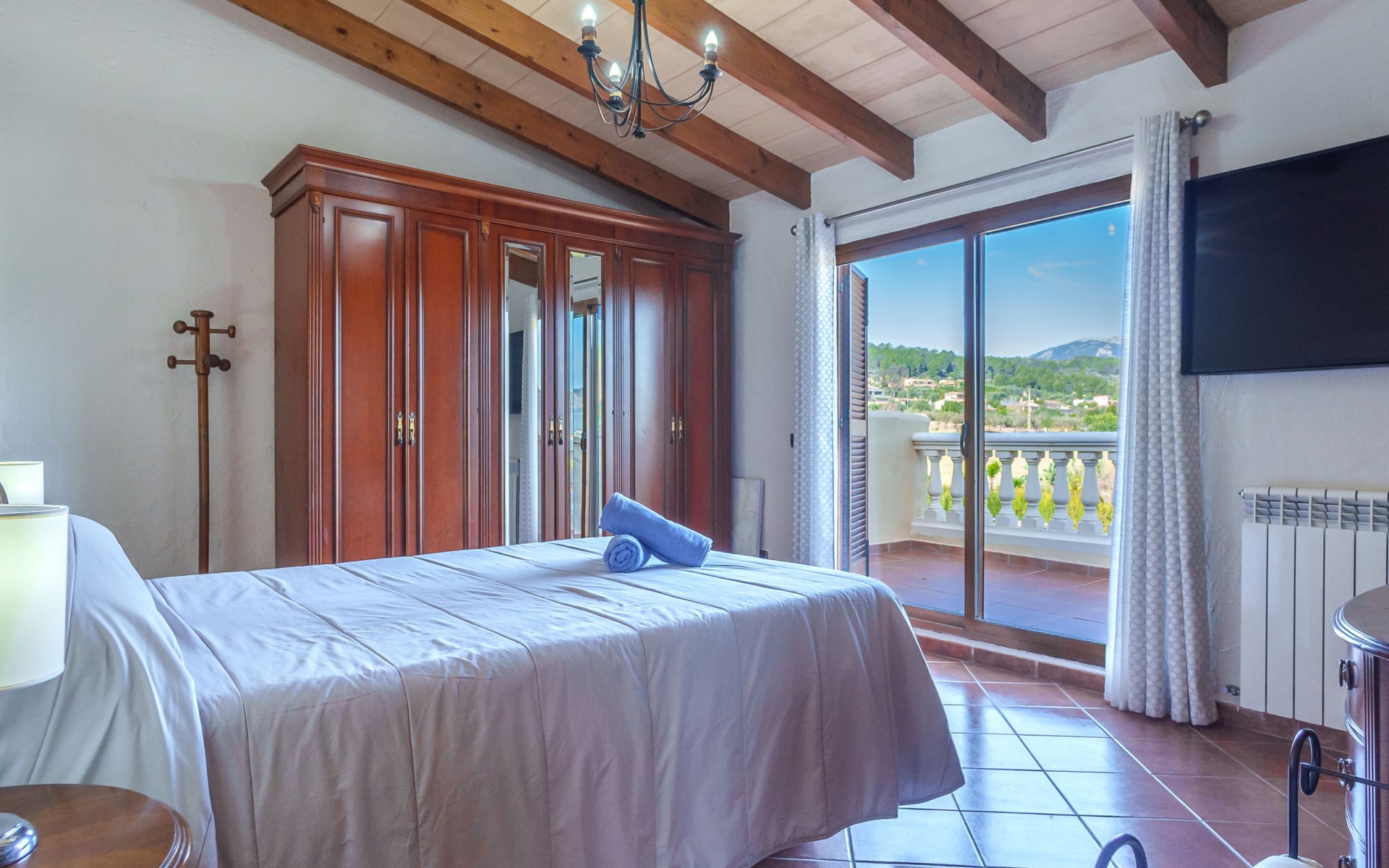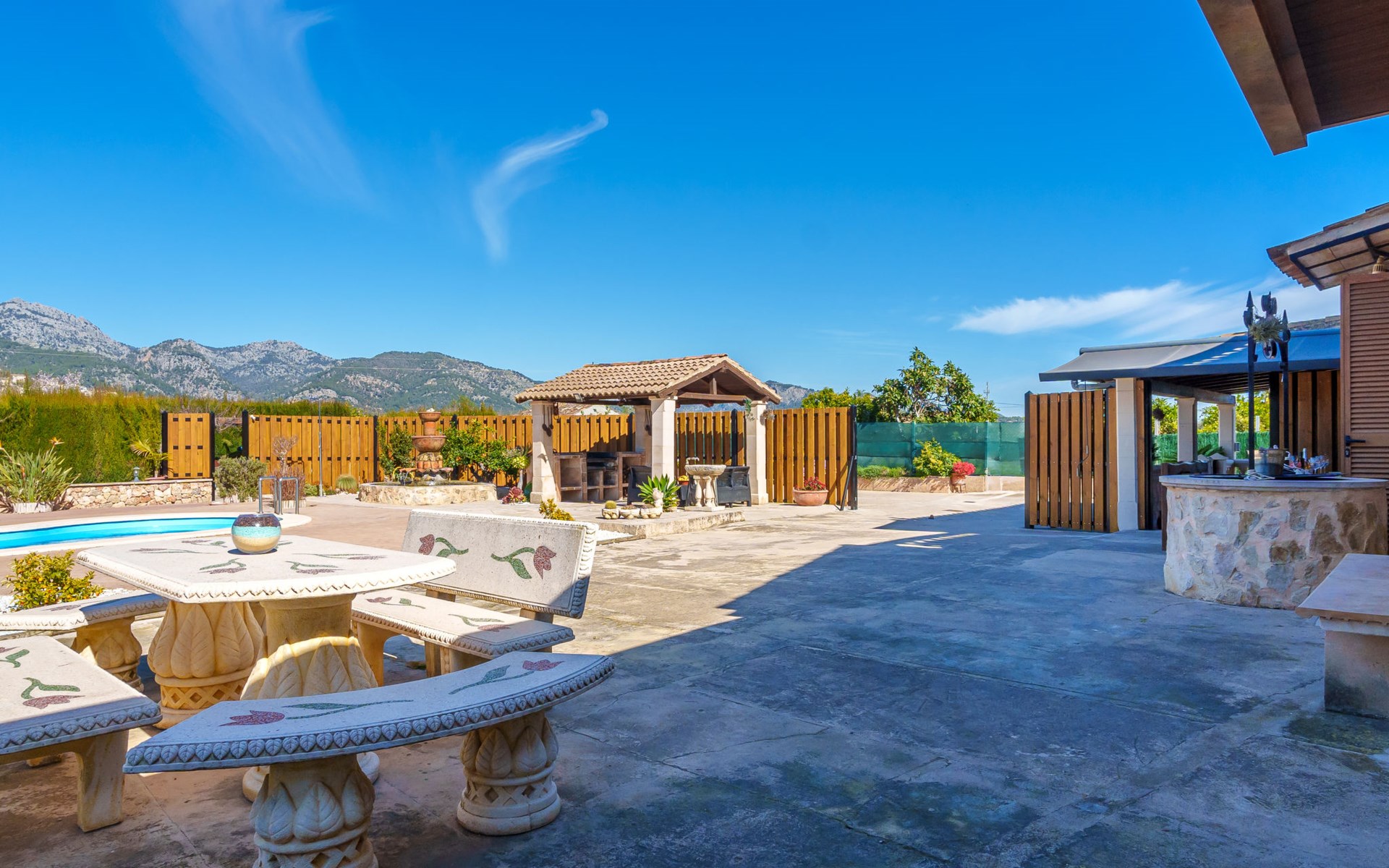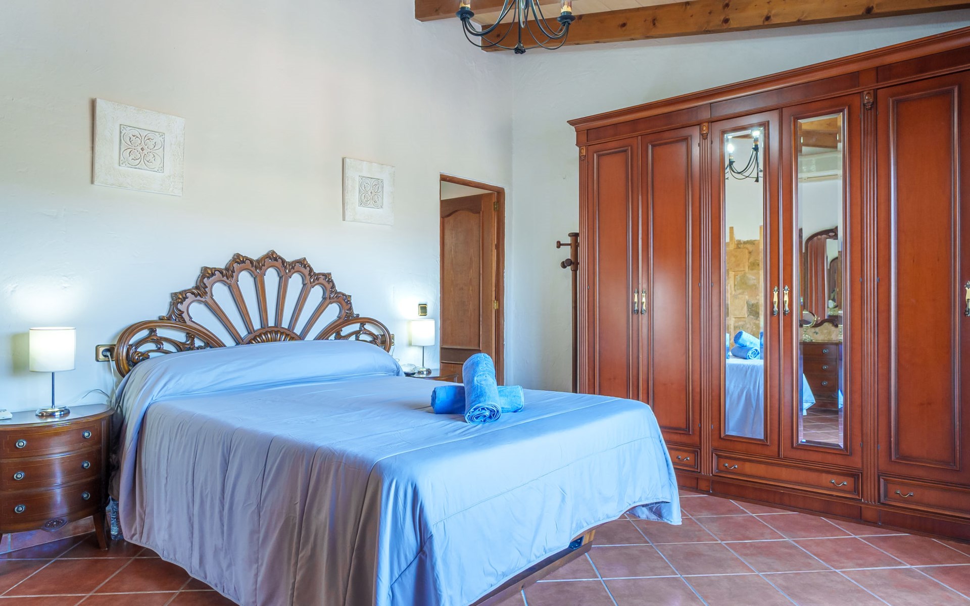 Very large, beautiful, cosy farm estate "Cas Pec", 2 storeys, surrounded by fields. Outside the resort, 1.5 km from the centre of Selva, in a quiet, sunny position, 30 km from the sea, 30 km from the beach, in the countryside. Private: large, beautiful garden, orchard, swimming pool kidney shaped (8 x 4 m, seasonal availability: 01.Mar. - 31.Oct.). Outdoor shower, patio, garden furniture, barbecue house, children's playground. In the house: internet access, WiFi, central heating system, air conditioning, burglar alarm system, washing machine. Parking at the house. Shop 1.5 km, grocery 1.5 km, shopping centre 3.5 km, restaurant 1.5 km, bus stop 1 km, railway station "Inca" 5.5 km, sandy beach "Alcudia" 25 km. Nearby attractions: Sierra tramuntana, Rutas ciclistas, Senderismo. Please note: car recommended. Object suitable for 6 adults. The owner lives on the same property.