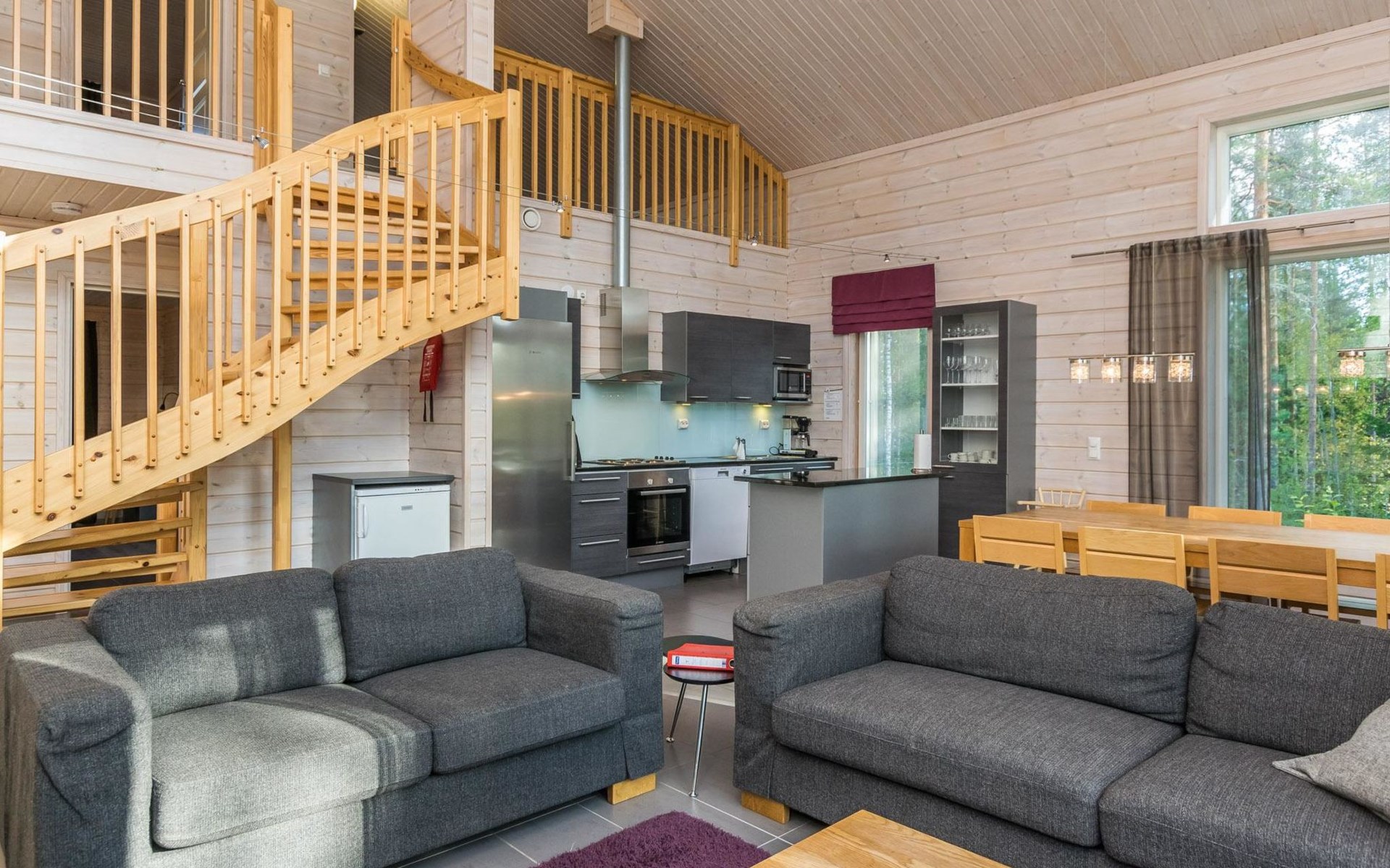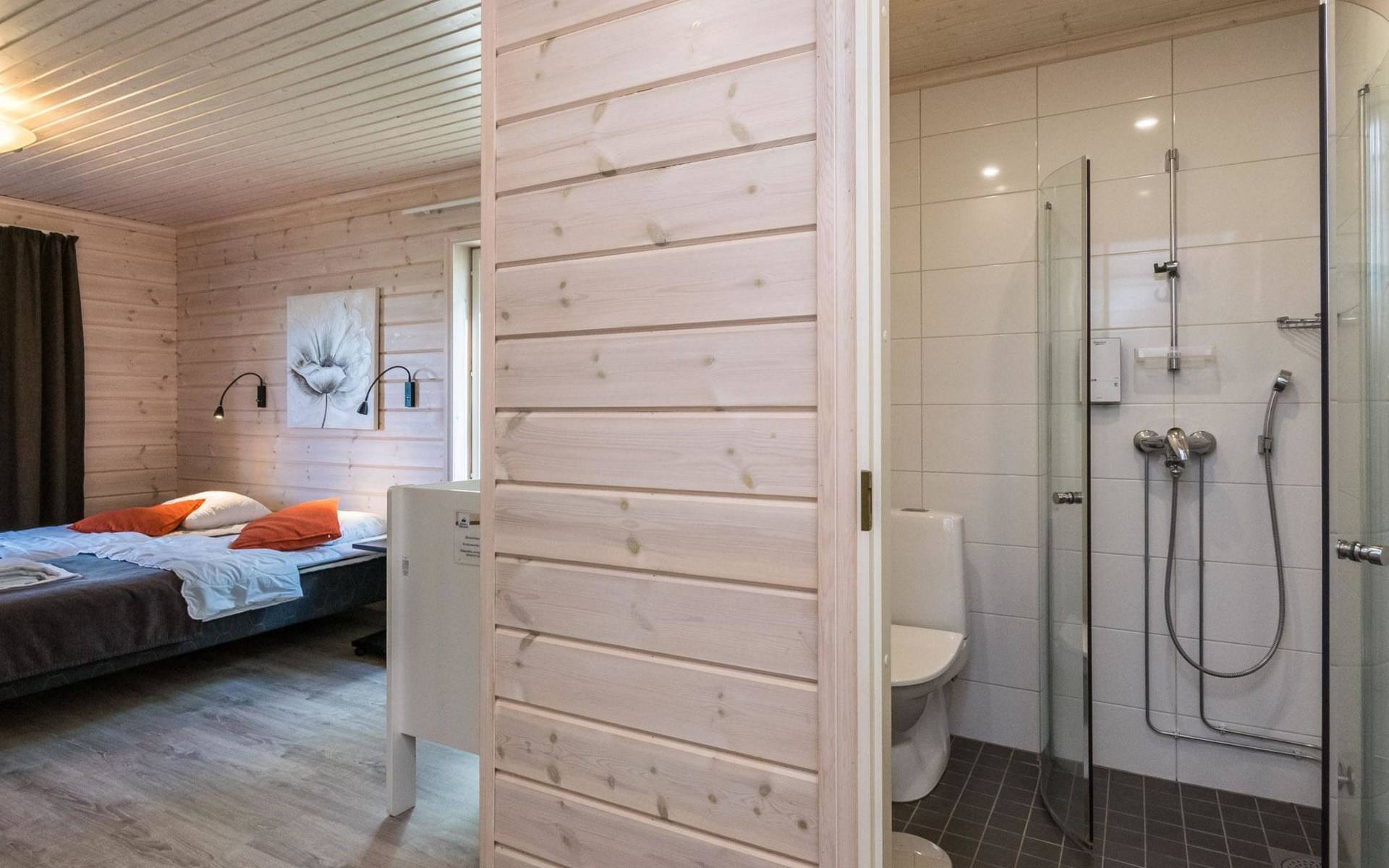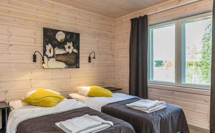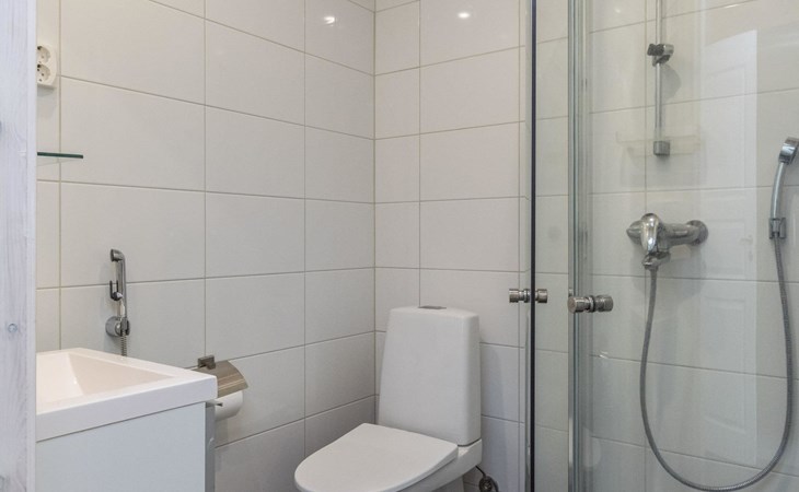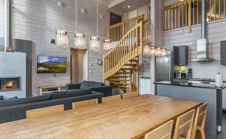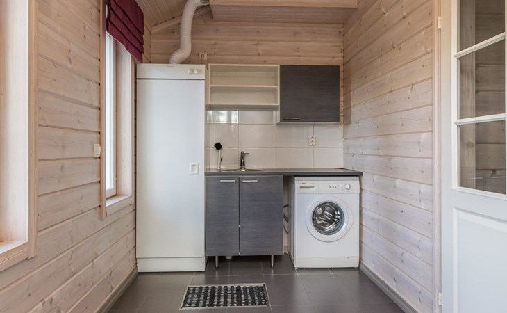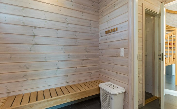 Wooden chalet 2014, large kitchen-living room, on the ground floor 3 bedrooms with 2 beds in each. All bedrooms have an own shower and toilet. Upstairs bedroom with 2 beds, sleeping loft with 2 beds, toilet. The utility room / hallway, dressing room, washroom, sauna (electric stove), toilet. Large terrace.