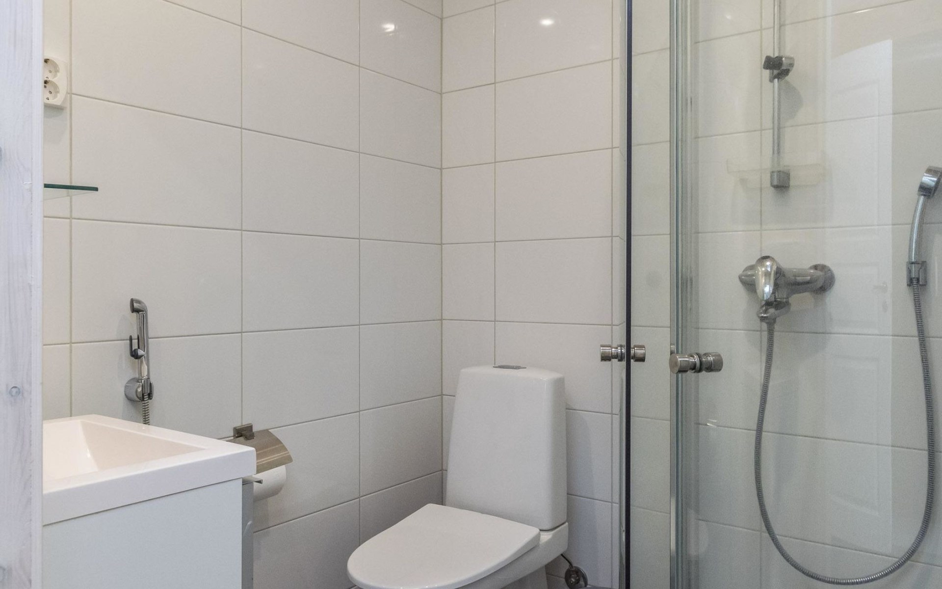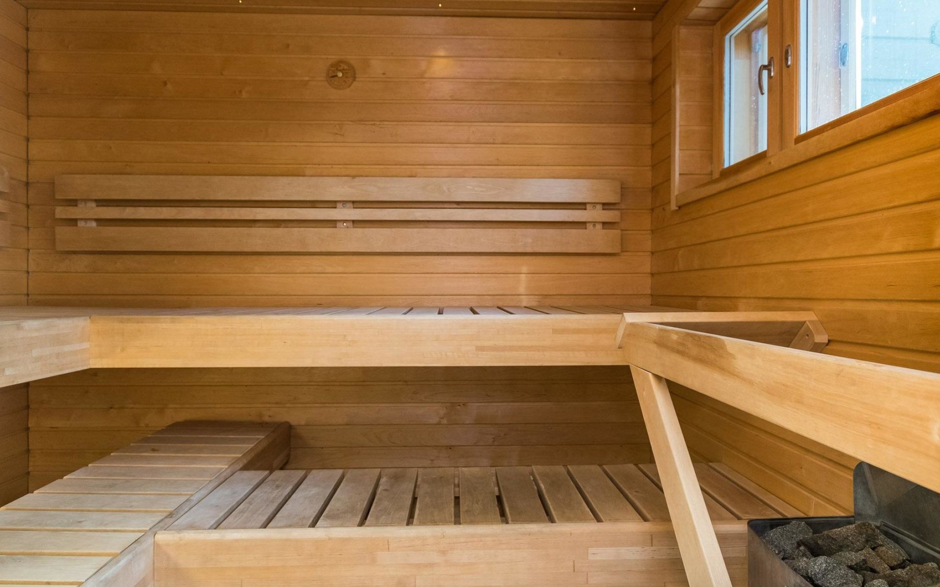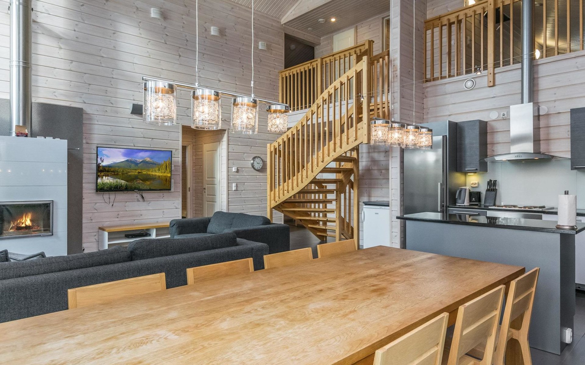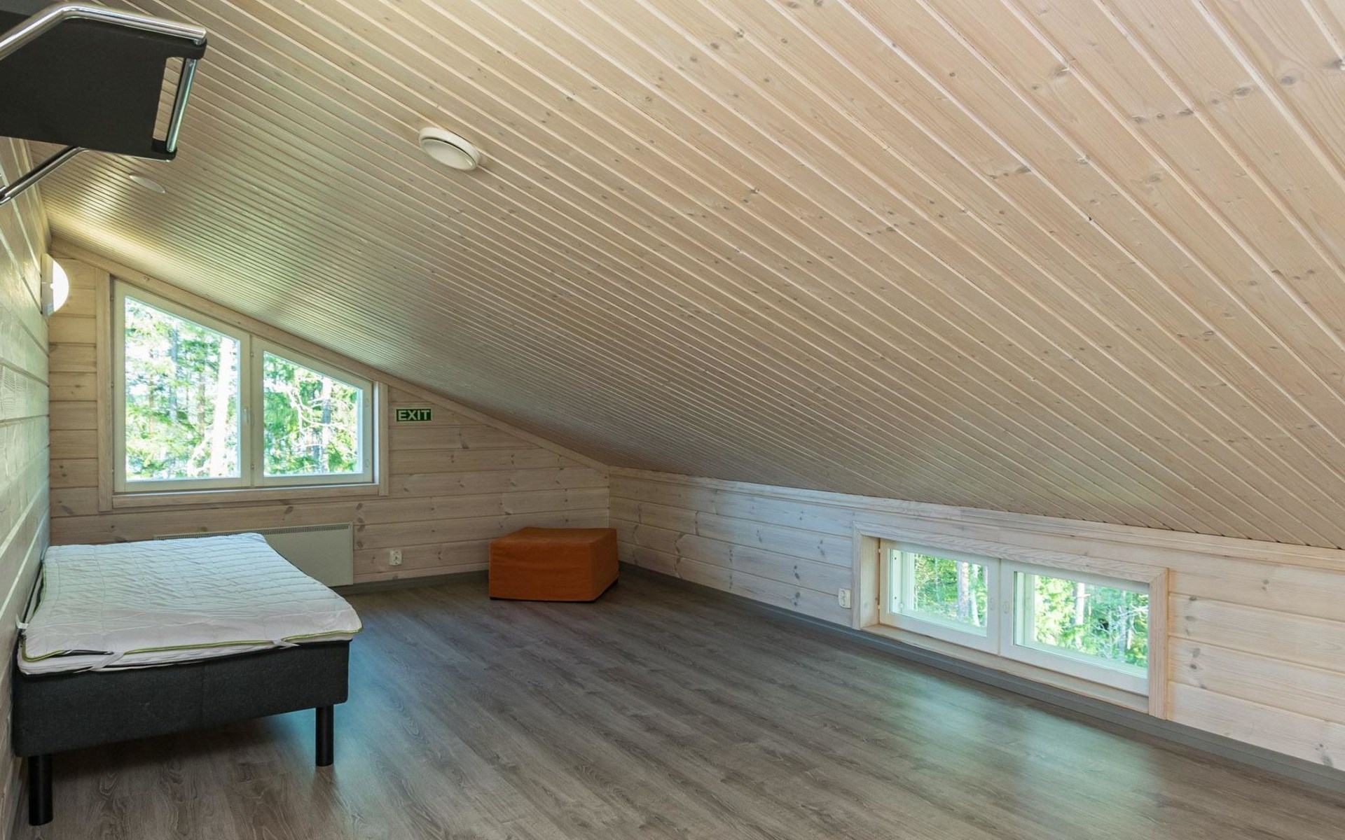 Wooden chalet 2014, large kitchen-living room, on the ground floor 3 bedrooms with 2 beds in each. All bedrooms have an own shower and toilet. Upstairs bedroom with 2 beds, sleeping loft with 2 beds, toilet. The utility room / hallway, dressing room, washroom, sauna (electric stove), toilet. Large terrace.
