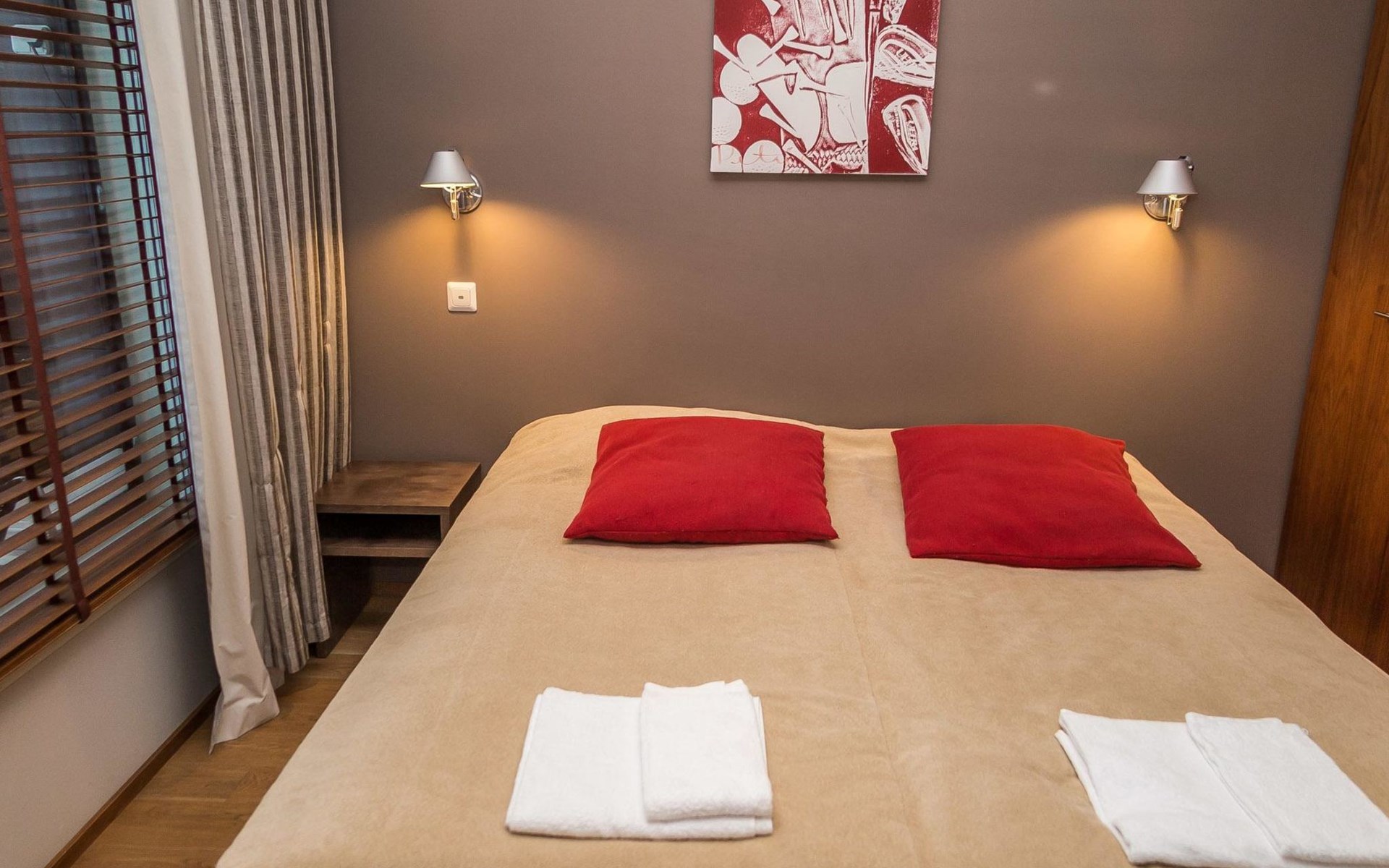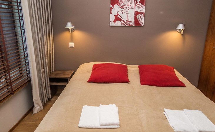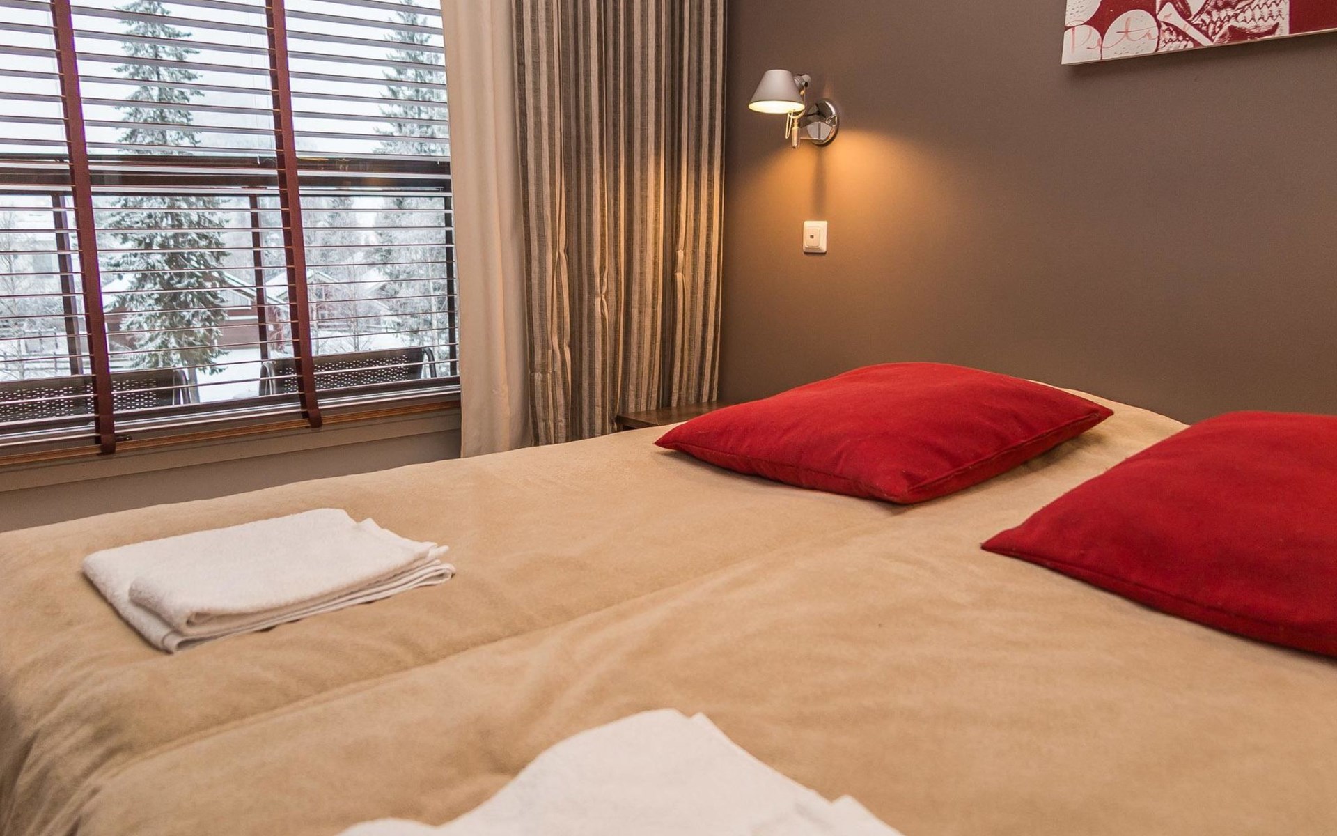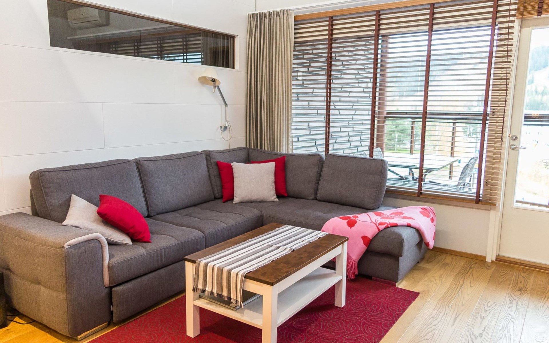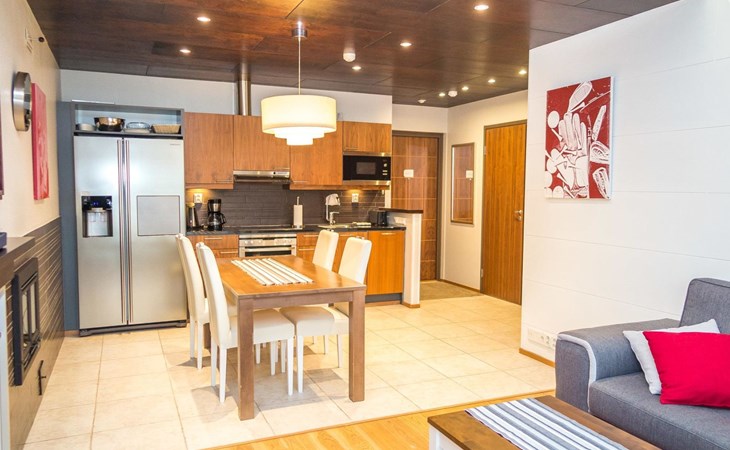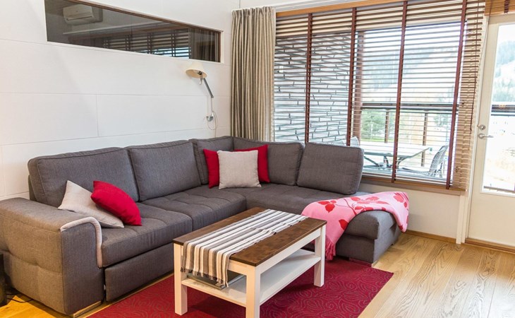 High standard Tahko Spa Junior Suite Orange A6 apartment located in heart of Tahko Ski Resort, built 2006, surface area 59 m² and 18 m² glazed terrace. Apartment has comfortable living room with open plan kitchen. In the living room sofa bed 2 extra beds. Bedroom with 2 separate beds, bedroom has a small shower and WC.