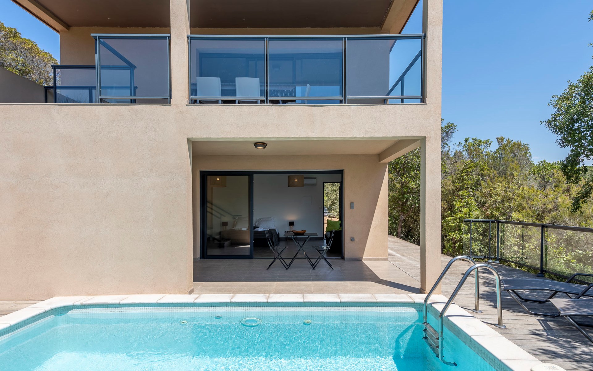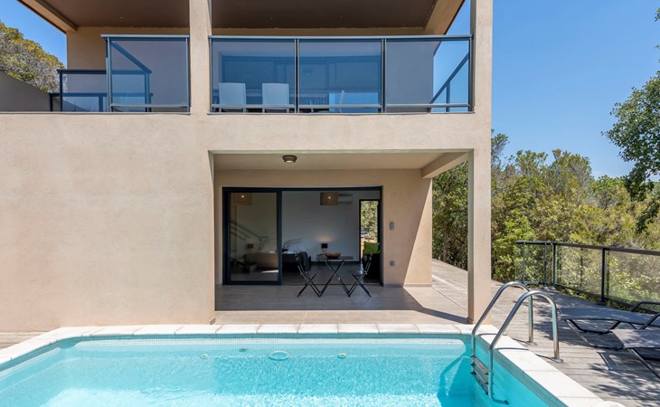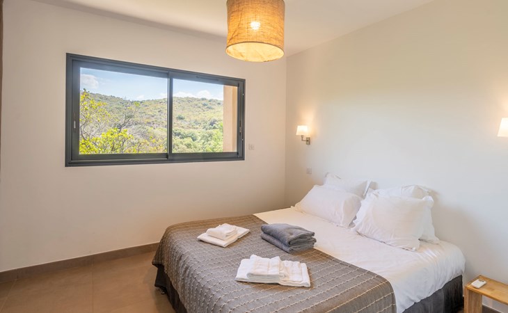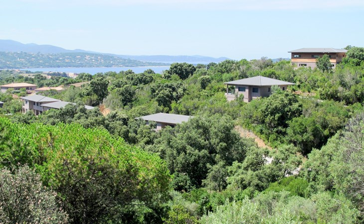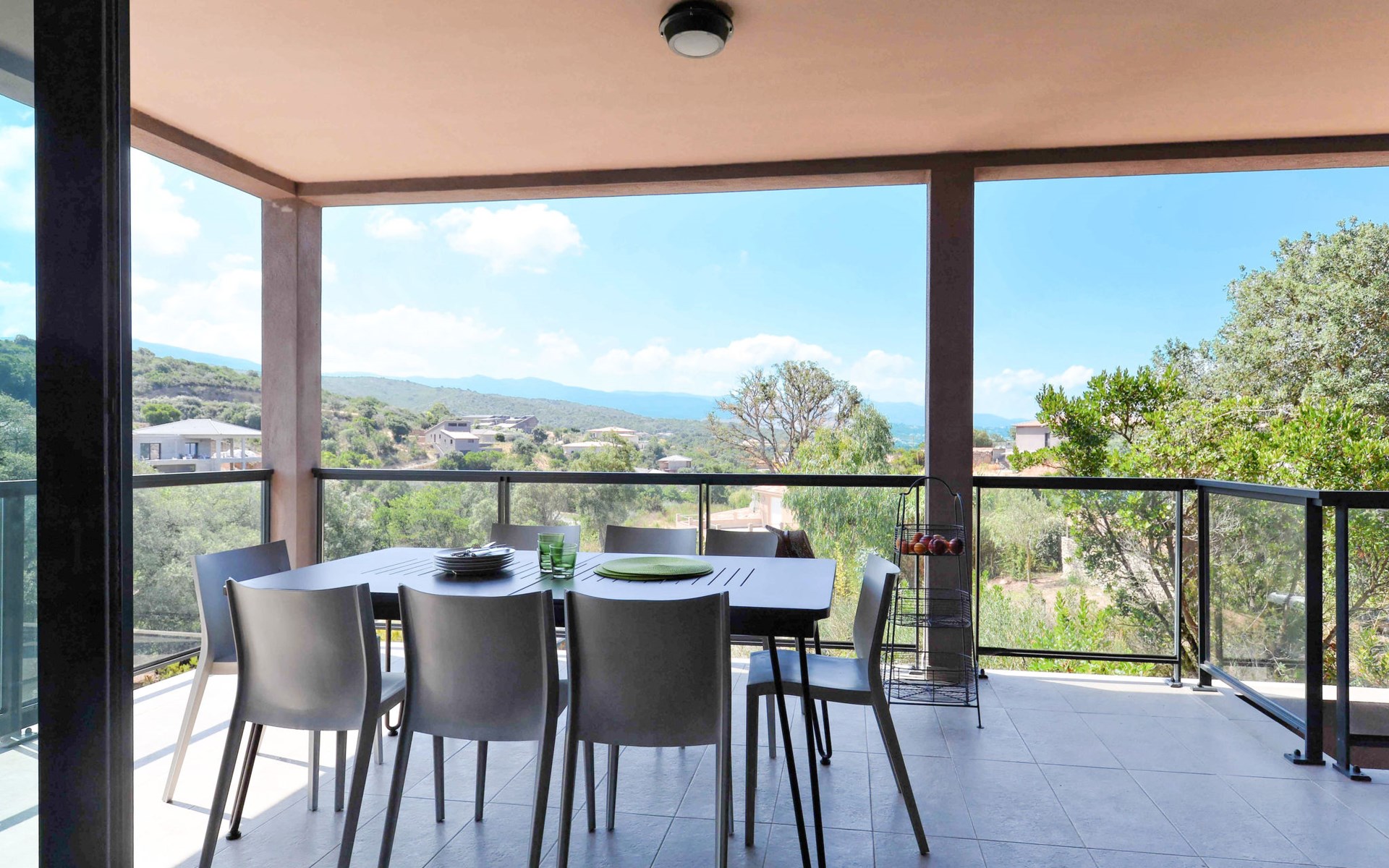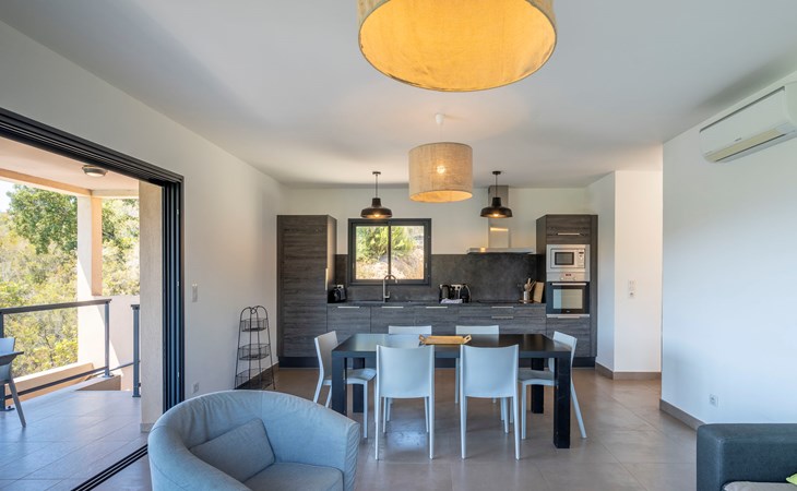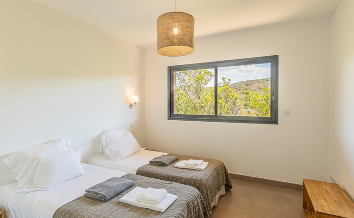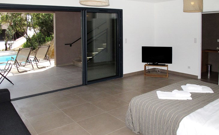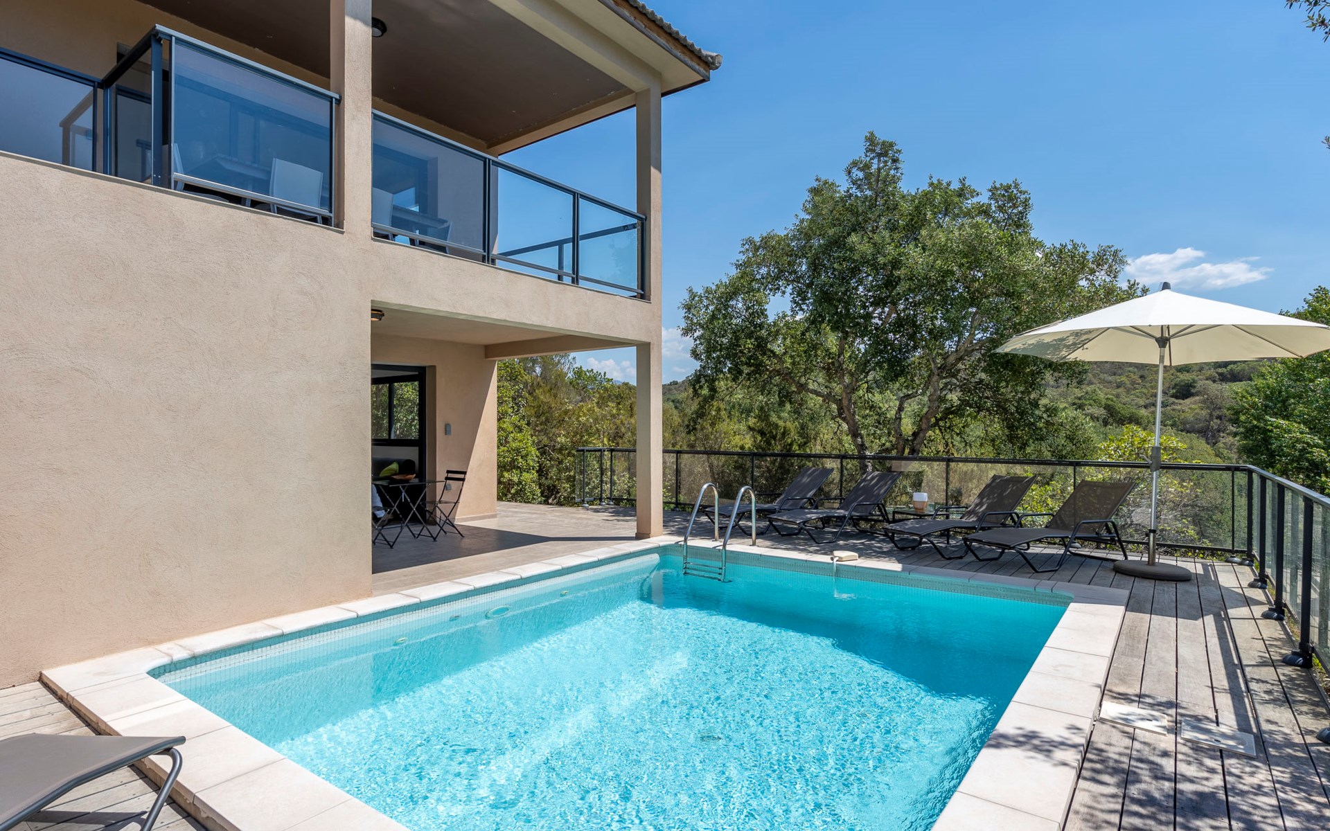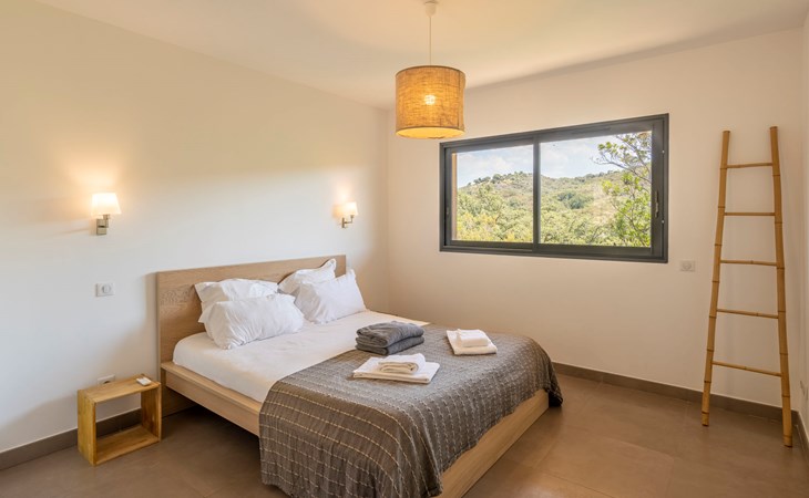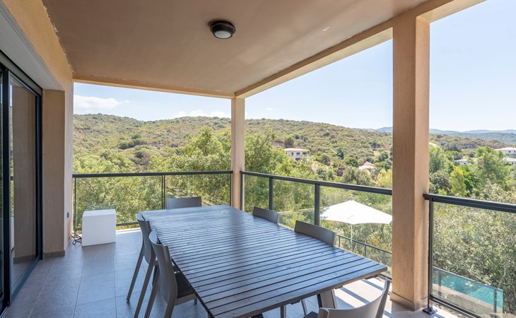 Modern, beautiful residence "Domaine de Lorello". Above Porticcio 3 km from the centre of Porticcio, 16 km from the centre of Ajaccio, 118 km from the centre of Porto-Vecchio, in an elevated position on a slope, residential area (villas), 1.6 km from the sea. For shared use: terraced garden with plants, natural garden. Private: swimming pool (5 x 4 m, seasonal availability: 01.Apr. - 15.Nov.). Outdoor shower, terrace. Steep motor access to the house. Parking (for 2 cars) at the house. Shop 3 km, bus stop "office de tourisme" 2.6 km, sandy beach "Plage d'Agosta" 1.6 km. Please note: car recommended. The owner does not accept any youth groups. Residence with electric gates. Neighbourhood highly sensitive to noise. Quietness and good behaviour expected.
