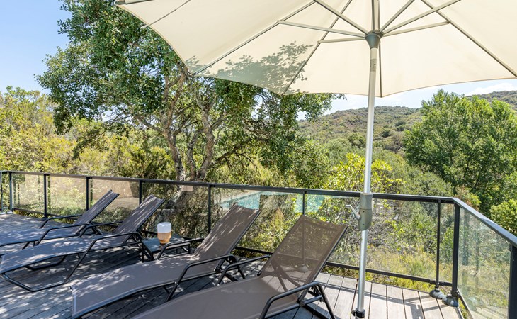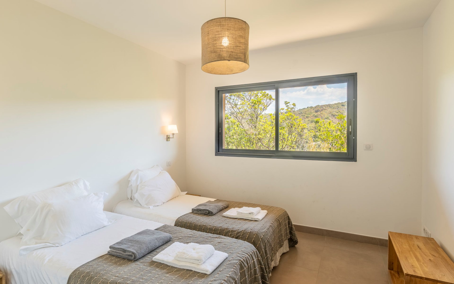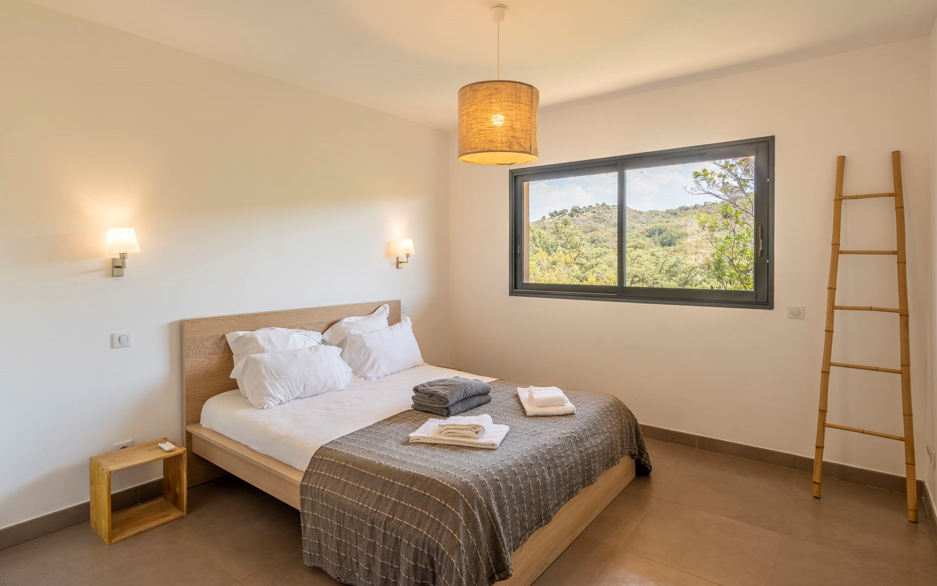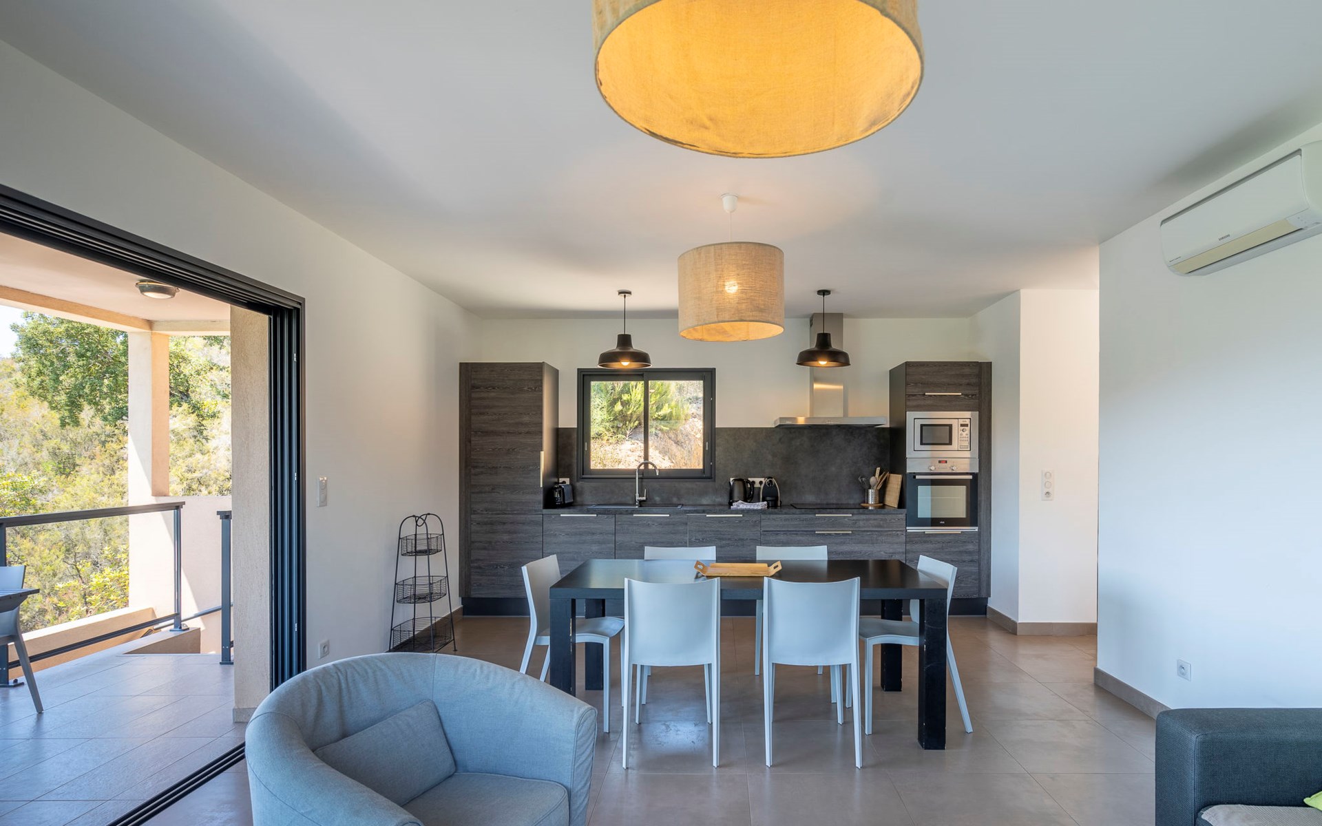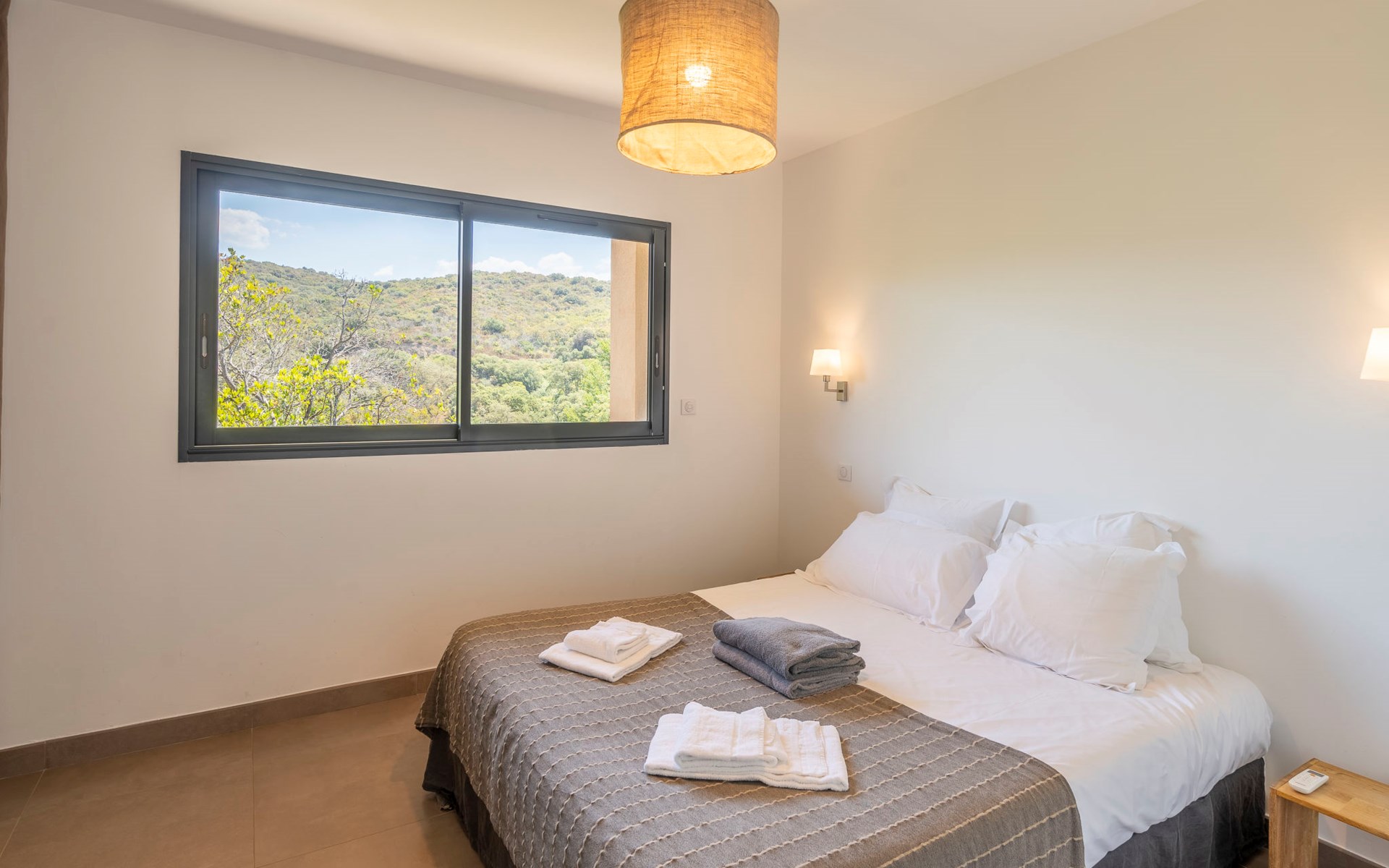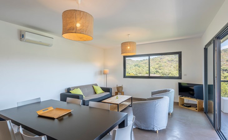 Modern, beautiful residence "Domaine de Lorello". Above Porticcio 3 km from the centre of Porticcio, 16 km from the centre of Ajaccio, 118 km from the centre of Porto-Vecchio, in an elevated position on a slope, residential area (villas), 1.6 km from the sea. For shared use: terraced garden with plants, natural garden. Private: swimming pool (5 x 4 m, seasonal availability: 01.Apr. - 15.Nov.). Outdoor shower, terrace. Steep motor access to the house. Parking (for 2 cars) at the house. Shop 3 km, bus stop "office de tourisme" 2.6 km, sandy beach "Plage d'Agosta" 1.6 km. Please note: car recommended. The owner does not accept any youth groups. Residence with electric gates. Neighbourhood highly sensitive to noise. Quietness and good behaviour expected.