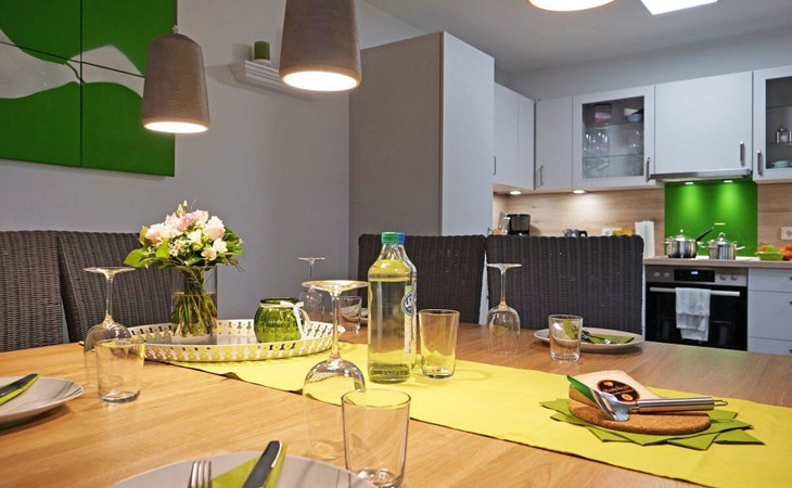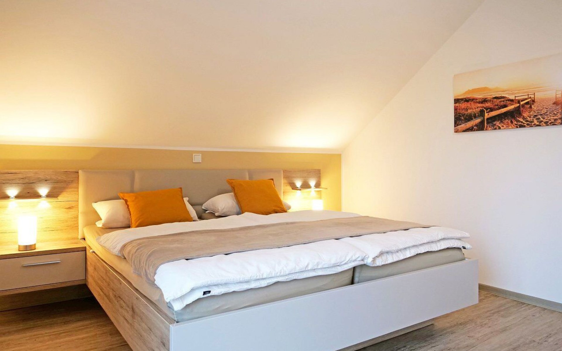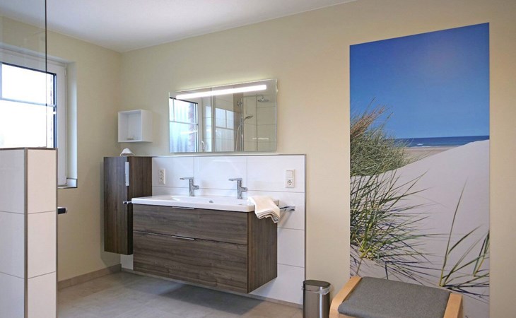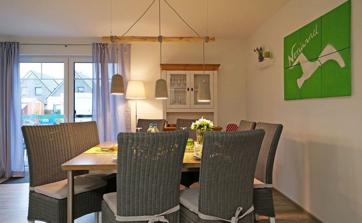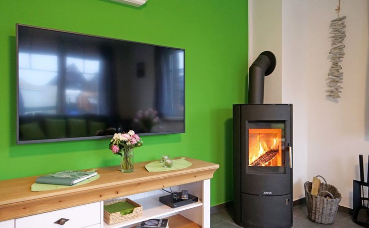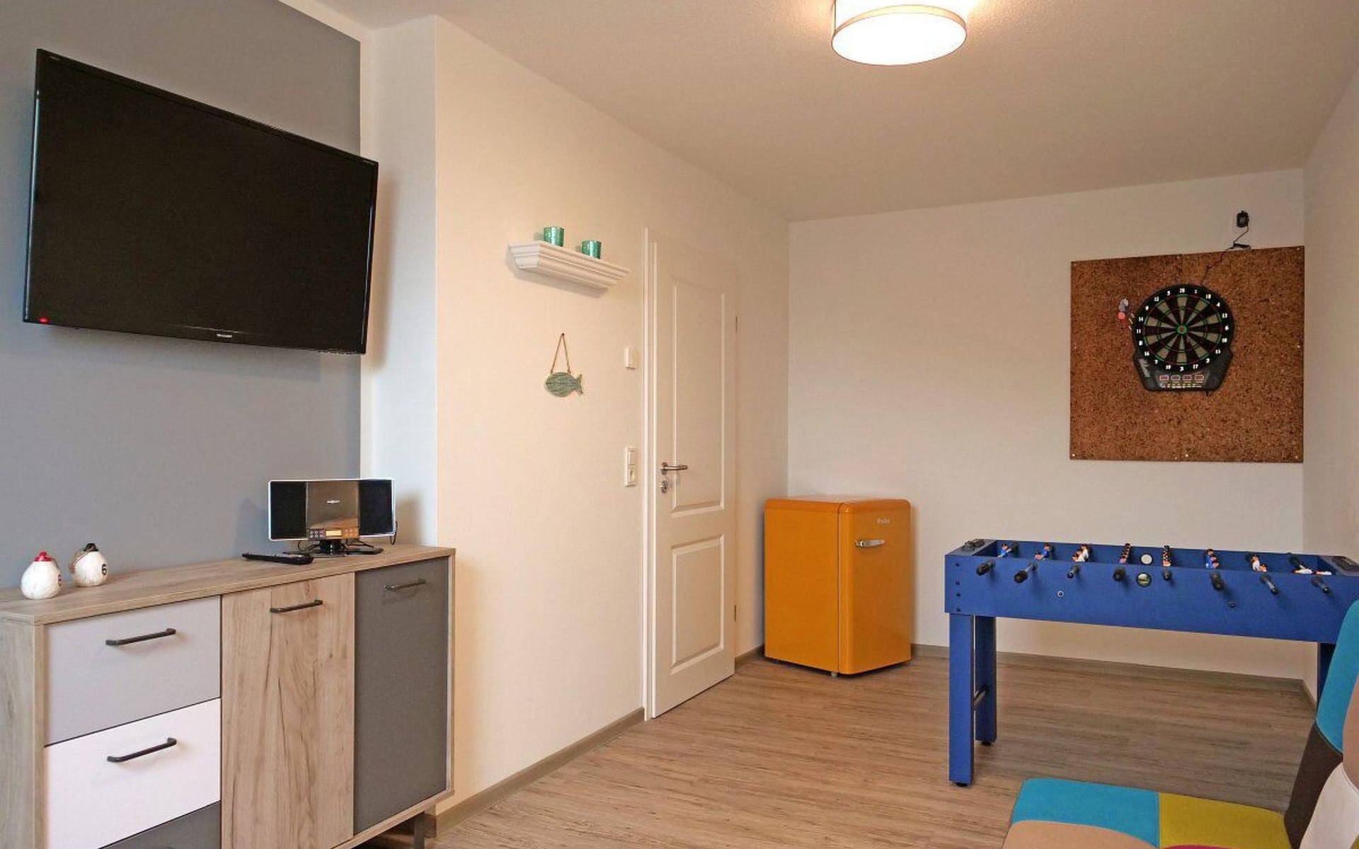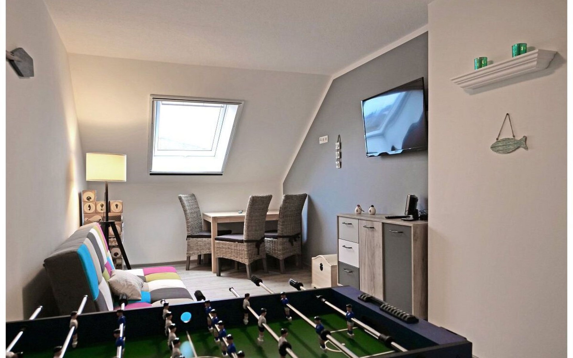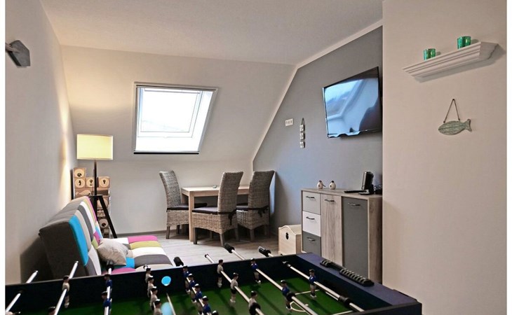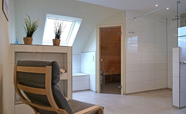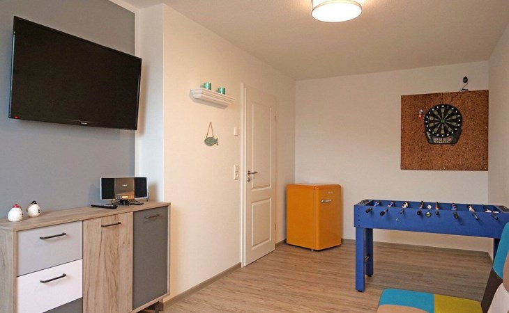The house "Seebrise" was furnished in country house style and has an exclusive equipment with a large wellness bathroom with sauna and whirlpool (approx. 17 m²), terrace, balcony on the upper floor, fireplace, underfloor heating and insect protection.4 cosy bedrooms, two of them on the ground floor, all have a flat screen TV and plenty of storage space.2 baby cots for our little guests are also available.a high-quality, country-style kitchen with extensive equipment, open to the dining area, invites you to cook, enjoy and linger. A high chair, children's crockery and blender complete the equipment for our younger guests.In the living area, a wood-burning stove provides cosy warmth, which you can enjoy from the comfortable sofa, from here you can also access the large terrace.In the games room on the upper floor there is another small fridge and a sofa bed in addition to some games and a dartboard.Also on the upper floor you will find a daylight-bright wellness bathroom with sauna, whirlpool, rain shower, WC and double washbasin as well as high-quality bathroom furniture. A second bathroom with daylight and a rain shower is located on the ground floor and all rooms are equipped with electric shutters and underfloor heating. The living room, bathroom and bedroom windows have insect screens. The staircase area is protected by a stair gate.