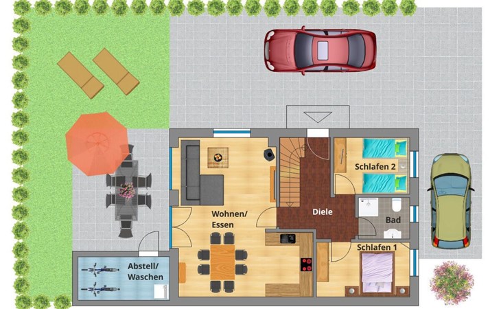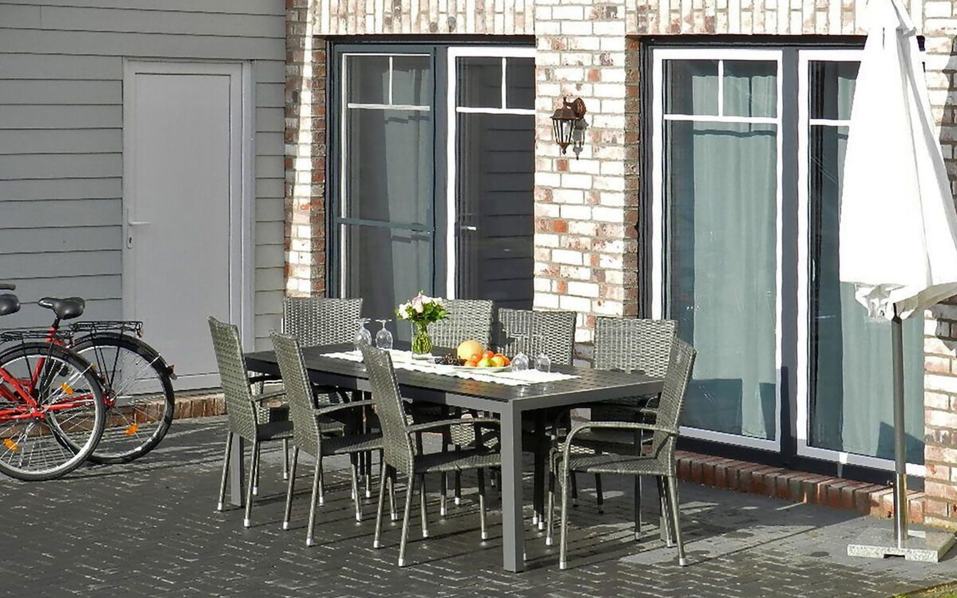 The small private garden is bordered by a hedge and offers patio furniture with cushions and parasol, two garden loungers and a charcoal barbecue. In the adjoining storage room there is a washing machine, some toys and 2 bicycles (2x 28") The car parking spaces are located on the property in front of the house. All areas are well lit.