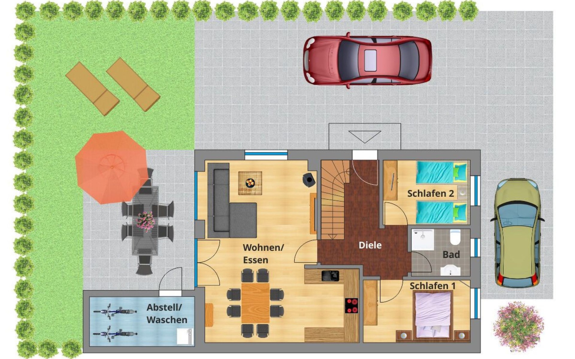 Burhave is located on the green Habinsel Butajdingen on the Jade Bay. Many meadows and primarily the coastal area characterise the surroundings. Burhave has its own stretch of beach on the green beach, where the beach chairs are also located. A small restaurant and a large playground are located there, as are the campsites. A few hundred metres further on is the North Sea lagoon, an open-air seawater pool that is independent of the tide. In the immediate vicinity of the holiday home you will also find the Spielscheune - an indoor playground with bowling alley and small restaurant - an adventure mini-golf course, a bicycle hire shop and small souvenir shops and restaurants. Children's entertainment is also offered in the summer season. Other Malere coastal towns are not far away, e.g. Fedderwardersiel, from where small boat trips are offered. Other interesting sights include the Langwarder Groden, a high ropes course and the Iggewarden farm. A car ferry departs from Nordenham to Bremerhaven every 20 minutes. Wilhelmshaven is also nearby and well worth a visit.